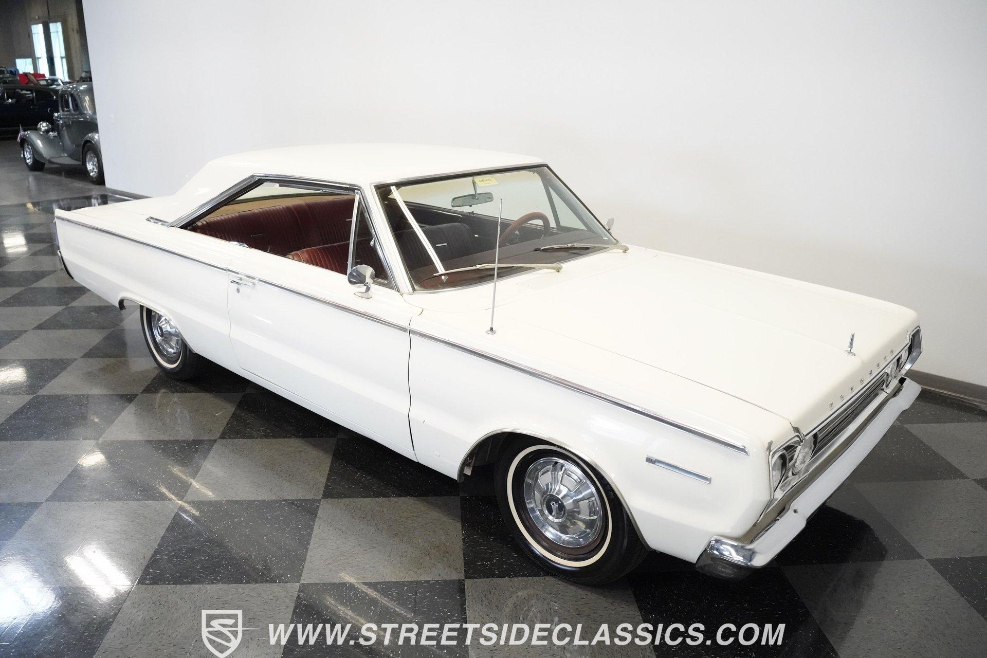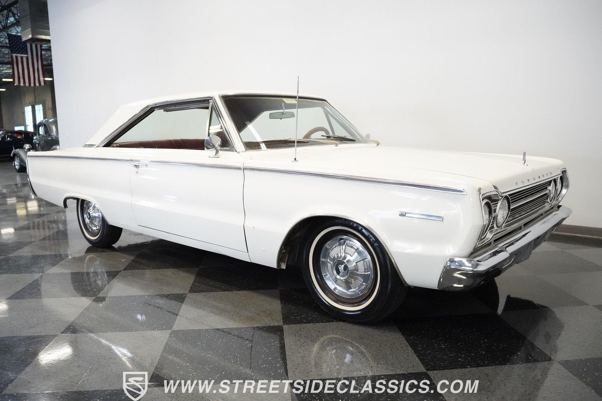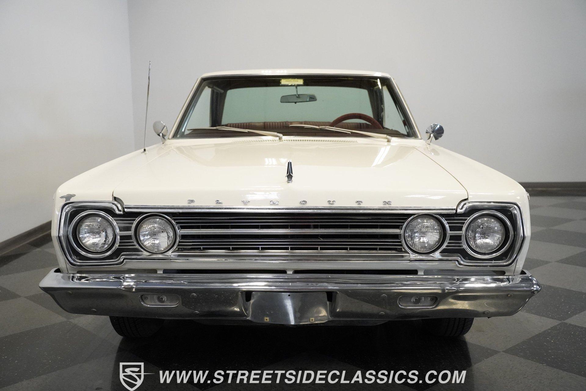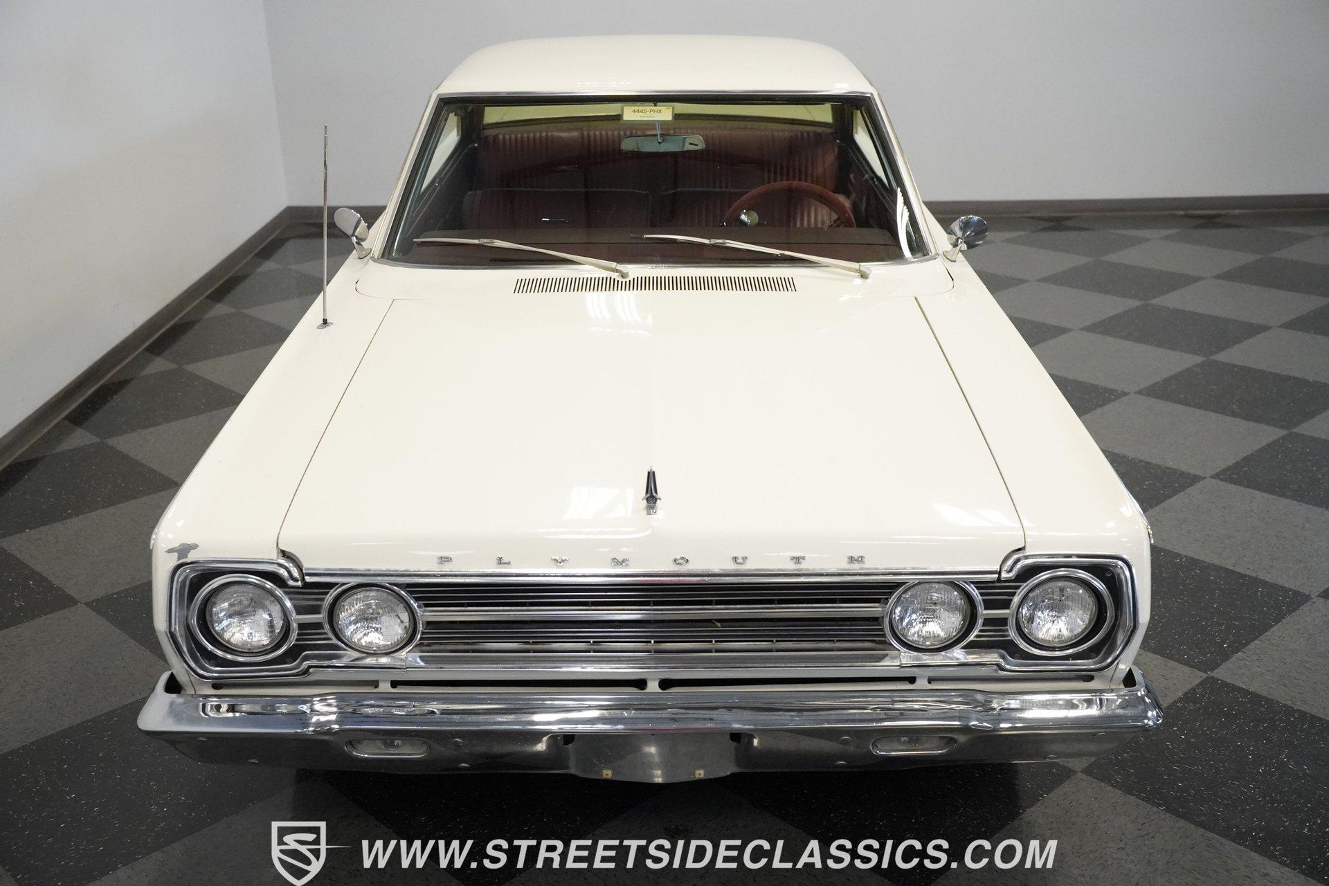 Wide-bodied and full-sized, the 1967 Plymouth Belvedere comes coated in white paint with clean overall appearance. A two-door hardtop with a proper mid-60s Mopar layout, this Belvedere sports the long hood to short deck ratio that made Plymouth famous. The factory-correct 14" steel wheels hold hubcaps that match the original look, with 205/75R14 Hankook tires making contact with the road. Chrome trim and bumpers provide contrast against the white paint, creating a complete package that shows off the straight body lines and classic design. Red vinyl upholstery fills the cabin with brightness that jumps against the white exterior. Both front and rear bench seats offer comfortable seating for passengers while staying true to the original design. The dashboard contains standard gauges that monitor the basic functions of the vehicle. An AM radio provides some entertainment during cruises. The column shifter for the automatic transmission keeps the floor space open for more legroom. Power steering allows for easier handling of this full-size Plymouth, and seatbelts add safety for all occupants. A 318 cubic inch V8 occupies the engine bay, featuring the factory-correct single Carter 2-barrel carburetor mounted on the stock manifold. Dating from February 17, 1967, according to the 21767 date code, with casting number 2536030 318-5, this motor is all Mopar. The A727 Torqueflite 3-speed automatic transmission shifts through the gears with mechanical efficiency. Suspension consists of independent front with torsion bars and solid axle rear with leaf springs, combined with an 8 3/4 rear end. Drum brakes at all corners provide stopping capability. HIGHLIGHTS: 318 V8 Engine Carter Carburetor 3-Speed A727 Torqueflite Automatic Transmission Independent Front Suspension with Torsion Bars Solid Axle Rear Suspension with Leaf Springs 8 3/4 Rear Axle Drum Brakes White Exterior Paint 2-Door Hardtop 14" Steel Wheels with Factory-Style Hubcaps 205/75R14 Hankook Tires Red Vinyl Interior with Bench Seats Column-Mounted Shifter Power Steering AM Radio Owner's Manual From the white exterior to the red interior, from the 318 V8 to the A727 transmission, the 1967 Plymouth Belvedere gives you classic American motoring. Full-sized comfort meets straight-line power in this white-on-red hardtop, offering an authentic slice of 60s Mopar muscle. Call today!