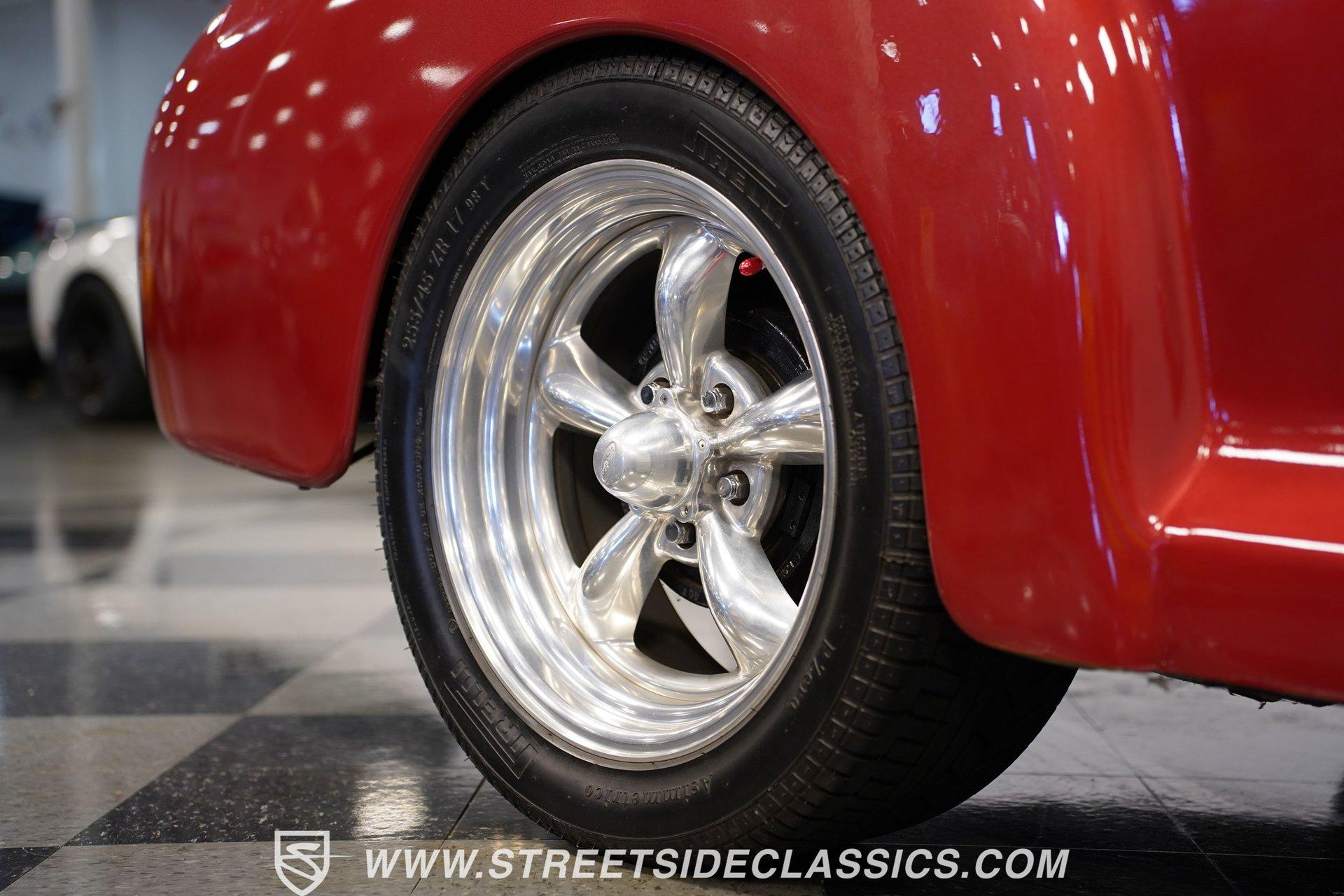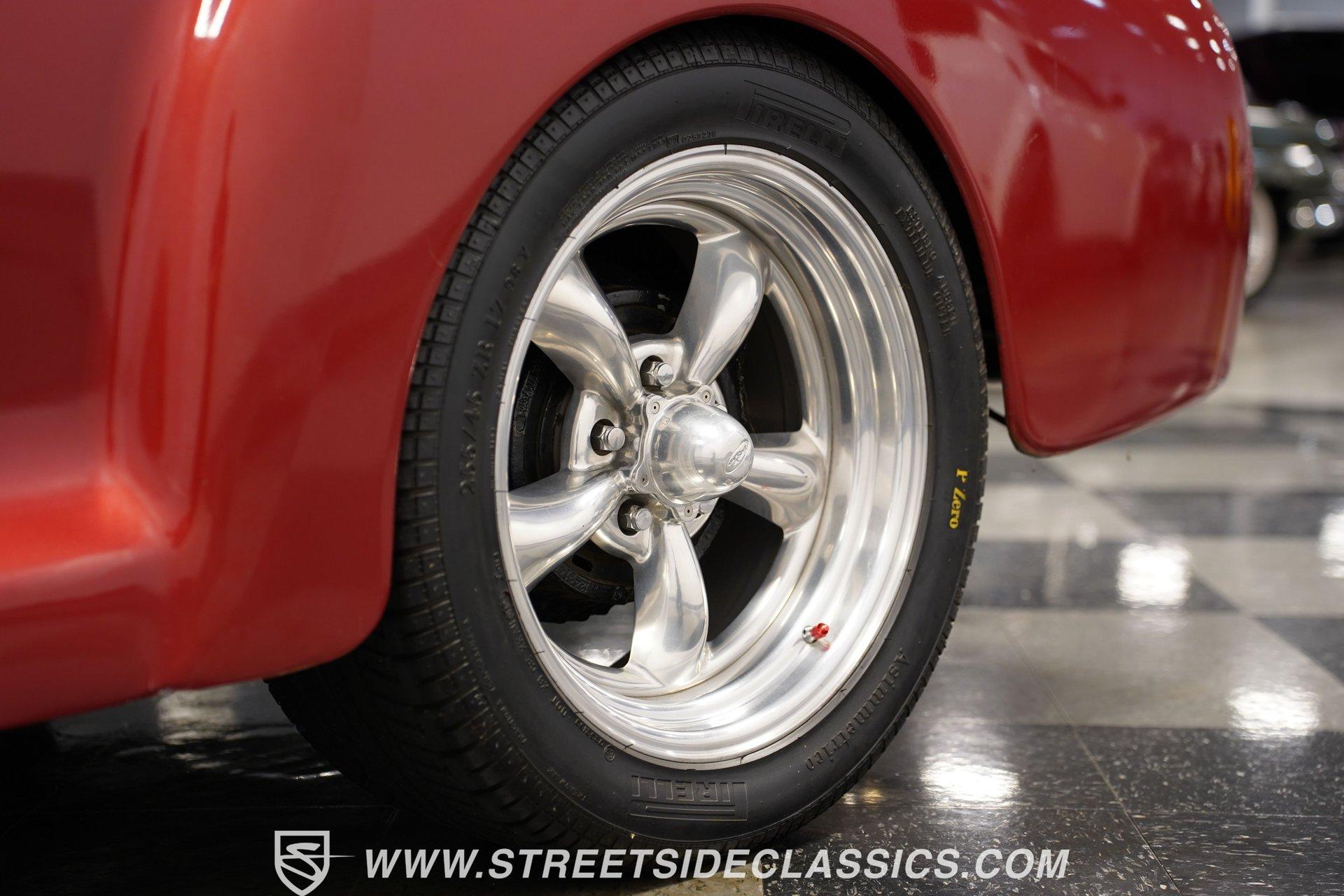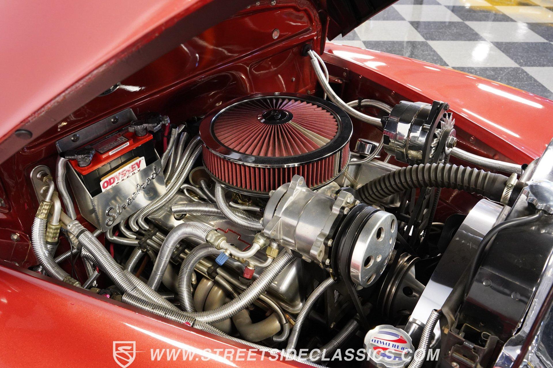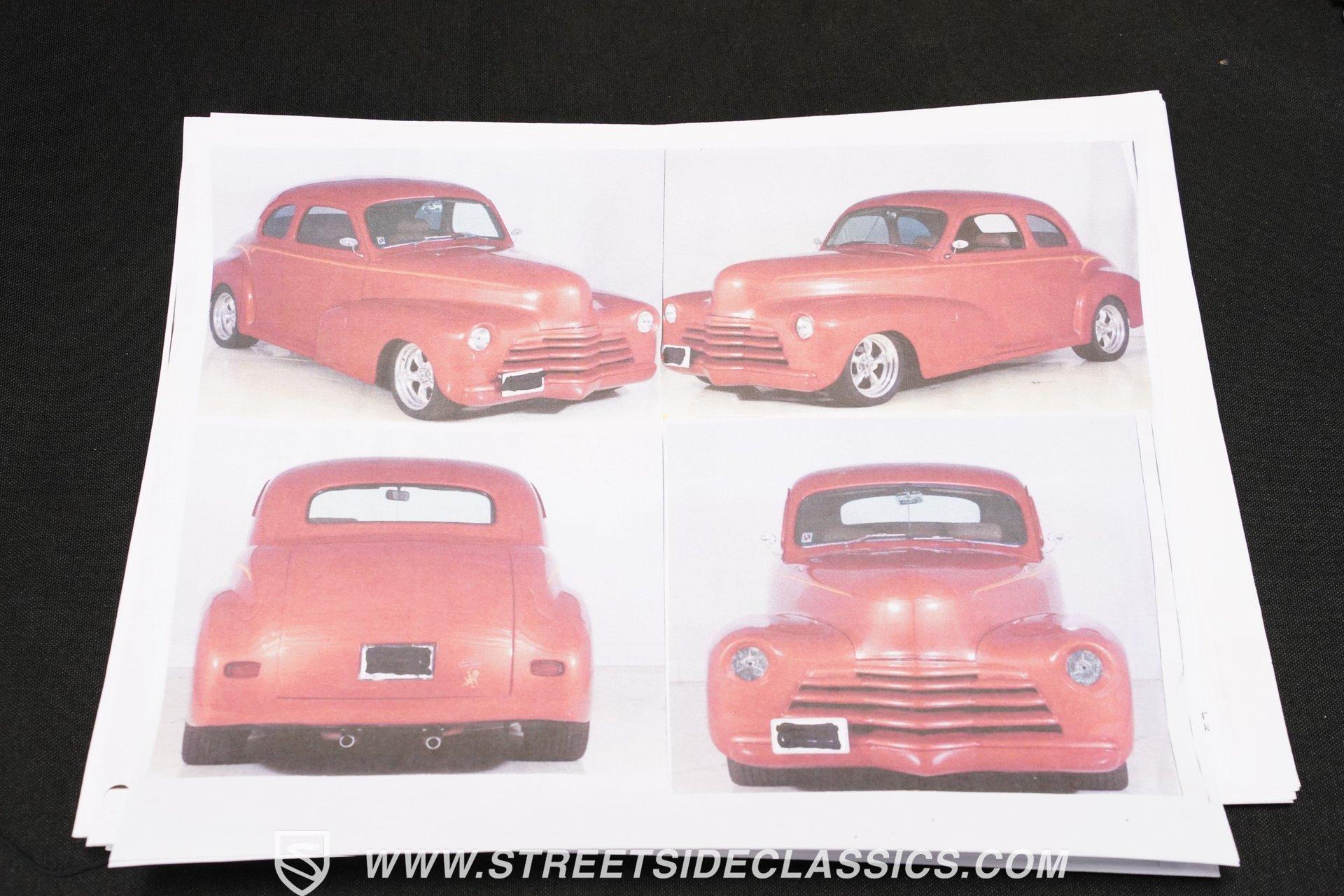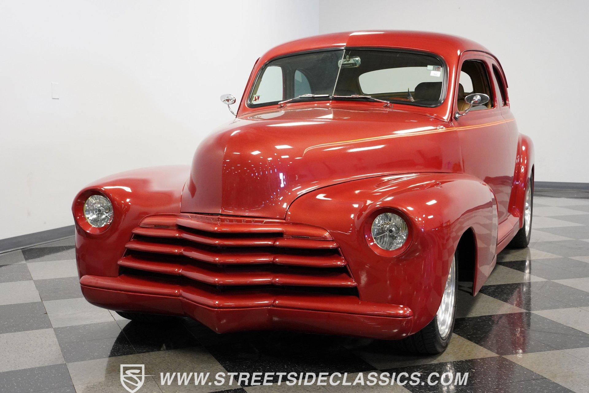 Burnt Orange Metallic paint lays the foundation for this 1948 Chevrolet Stylemaster Coupe, a street rod with custom bodywork that's all about presence. The molded front fenders flow seamlessly into a custom front bumper, while the shaved door handles and frenched headlights, taillights, and license plate give it a clean look. A V-butt windshield and deleted rear bumper complete the exterior transformation. It sits low and wide on 17" American Racing wheels wrapped in 255/40ZR17 front and 255/45ZR17 rear tires from Lionhart. Tan leather bucket seats bring a modern feel to the interior of this classic coupe. A center console splits the front seats, while power adjustments make for an easy fit. The dash features a wood overlay packed with VDO gauges, and the tilt column is topped with a wood-rimmed steering wheel. Power windows, a column shifter, Vintage Air A/C, and a JVC CD stereo with Bluetooth and satellite capability round out the comfort and convenience side, while tan carpets and headliner finish the interior with consistent tones. A 350 cubic inch V8 sends power through a TH350 3-speed automatic transmission and out to a GM 10-bolt rear. A Holley 4-barrel carb sits atop an aluminum intake, fed by HEI ignition and pushing through shorty ceramic-coated headers and FlowMaster dual exhaust. A Mustang II-style front suspension with coil springs, shocks, and sway bar provides steering through a rack-and-pinion setup. Power front disc brakes and rear drums handle stopping duty. A 12V Odyssey battery and negative terminal disconnect round out the engine bay setup. HIGHLIGHTS: 350 V8 Engine TH350 3-Speed Automatic Transmission Holley 4-Barrel Carburetor Aluminum Intake Shorty Ceramic-Coated Headers FlowMaster Dual Exhaust Power Front Disc Brakes Mustang II Front Suspension GM 10-Bolt Rear Burnt Orange Metallic Paint Shaved Door Handles V-Butt Windshield Frenched Headlights, Taillights, and License Plate Custom Front Bumper 17" American Racing Wheels 255/40ZR17 Front, 255/45ZR17 Rear Pirelli Tires Tan Leather Interior with Power Bucket Seats Center Console Tilt Steering Column Wood-Rimmed Steering Wheel VDO Gauges Vintage Air A/C Power Windows JVC CD Stereo with Bluetooth and Satellite Column Shifter Tan Carpets and Headliner Car Cover This 1948 Chevrolet Stylemaster Coupe brings street rod flavor with a clean look, a comfortable leather interior, and a small block V8 that makes all the right noises. With quality components and thoughtful custom touches, this coupe is ready for the next chapter. Call today!