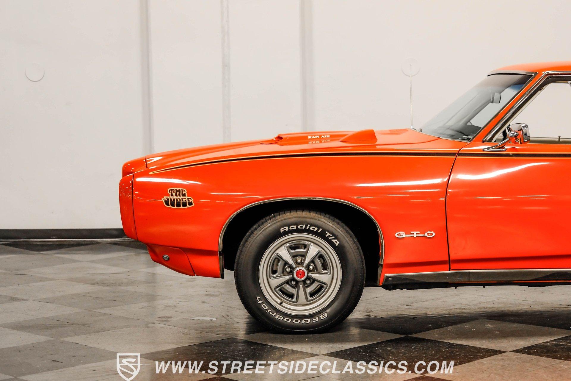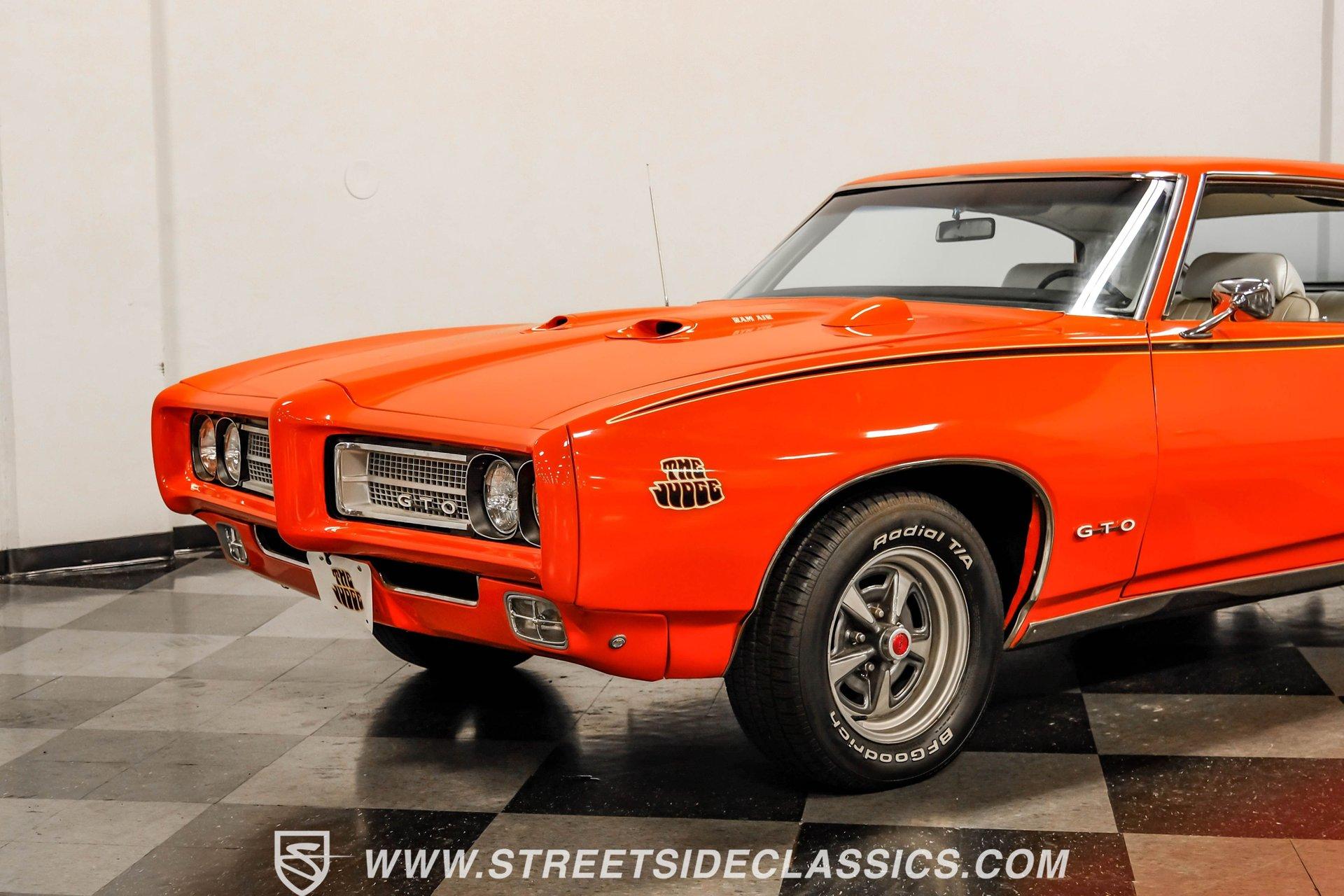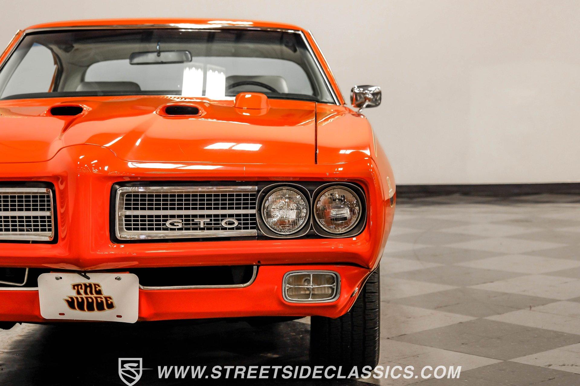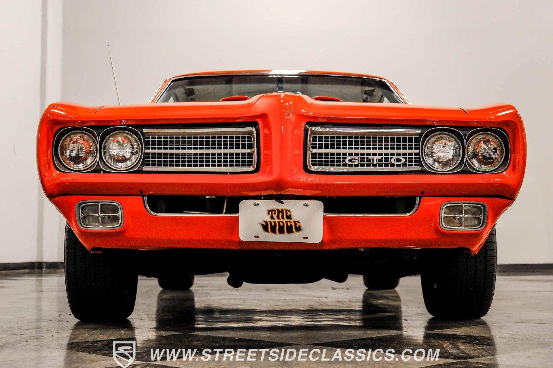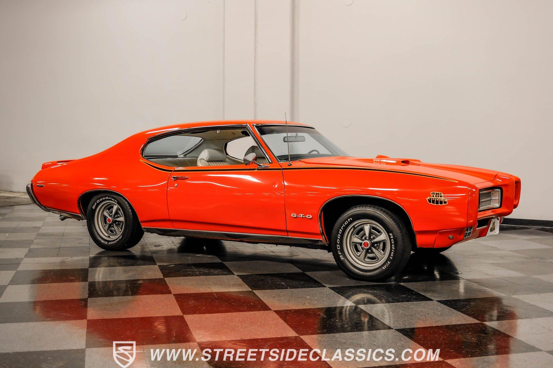 When it comes to collectible cars, the criteria by which we judge a vehicle can vary from person to person. However, almost all enthusiasts can agree that authenticity counts for a great deal. That's why, when a car like this numbers-matching 1969 Pontiac GTO Judge comes along with its official Pontiac Historic Services documentation, the verdict is a unanimous mix of awe and excitement. Fully repainted in its original Carousel Red, the muscular lines of this Judge present a compelling case for why this GTO may just be the G.O.A.T. of Goats. Inside, we find a stock and correctly outfitted interior, featuring an inviting Parchment and black motif, complemented by a touch of woodgrain trim along the dash. A three-pod Rally gauge cluster sits front and center of the power-assisted (and rare) wooden three-spoke steering wheel, featuring (from left to right) a multi-purpose fuel/oil/temperature readout, a big 140 mph speedometer, and a unique and equally large analog clock closest to the passenger side. If you're unfamiliar with the GTO, you might be asking yourself, "But where is the tach?" You need only look just above the dashboard and out the windshield to find an ingenious hood-mounted 8,000 rpm external tachometer, which not only looks unbelievably cool but makes it that much easier to keep your eyes on the fast-approaching road while still being able to hit that perfect 1-2 shift courtesy of a Hurst T-bar handle. The factory console and matching carpets and Vintage brand air conditioning add a touch of comfort. At the same time, the original AM radio remains on display, because, if we're honest, you'll never get tired of listening to that rumble emanating from the dual exhaust just beneath you anyway. Under that dual nostril, we find a clean engine bay, home to a functional Ram Air system. Beneath that curiously clever air-cleaner power package, we find a numbers-matching 400 cubic-inch Ram Air III V-8 engine. Topped with a single four-barrel Rochester Quadrajet carburetor, this mighty motor made use of a 10.75:1 compression ratio to pump out an advertised 366 horsepower and 445 pound-feet of torque. That prodigious power is routed through a numbers-matching Muncie four-speed manual transmission before being sent out to the original factory ten-bolt Safe-T-Trak rear end. Thanks to Positraction, those ponies are transferred to the pavement via a set of correct 15-inch Rally II wheels shod in staggered BFGoodrich tires measuring 245/60R-15. In contrast, a narrower 235/60R-15 set handles steering duties up front while simultaneously adding to this GTO's aggressive muscle car stance. HIGHLIGHTS: Authentic GTO Judge PHS Certified Numbers Matching Ram Air III V8 Numbers Matching Muncie 4 Speed Functional Ram Air Hood Correct Carousel Red Repaint Correct Parchment Vinyl Interior Hurst Shifter Rally Dash Hood Tach Vintage AC Power Steering Power Brakes Front Disc Brakes Safe T Track Rear Receipts Rare and Real Car Riding on a heavy-duty suspension upgraded with higher-rate springs and stiffer shocks, this 1969 Pontiac GTO Judge was capable of cornering markedly better than the base model, while a set of power brakes featuring front discs reins in speed at a moment's notice. While deliberating on which Golden Age muscle car is the best will likely end in a deadlock, there is no debate that this PHS-certified, numbers-matching authentic Judge will go a long way to endow its next owner with life, liberty, and especially the pursuit of happiness. And in the court of public opinion, the only thing you'll be guilty of (provided you keep your eye on the speedometer) is inspiring fits of jealousy anywhere you go behind the wheel of this undeniably amazing and rare machine. Don't wait, call today!