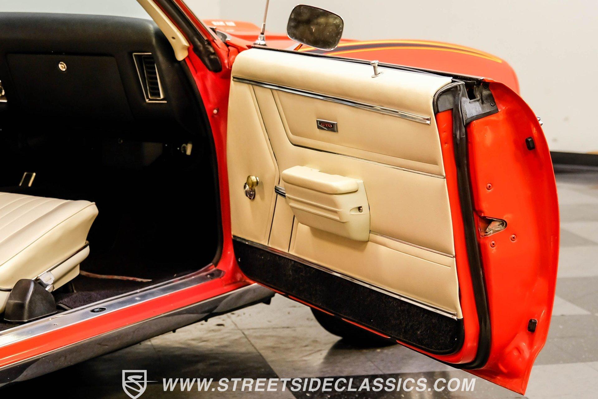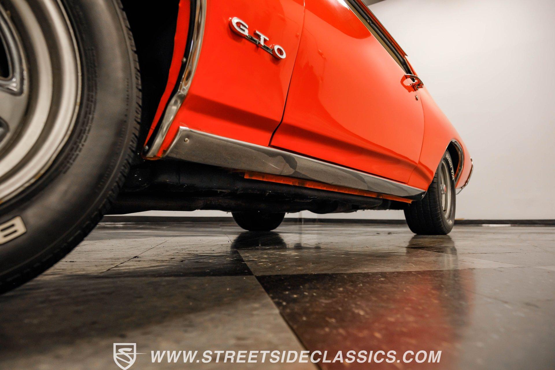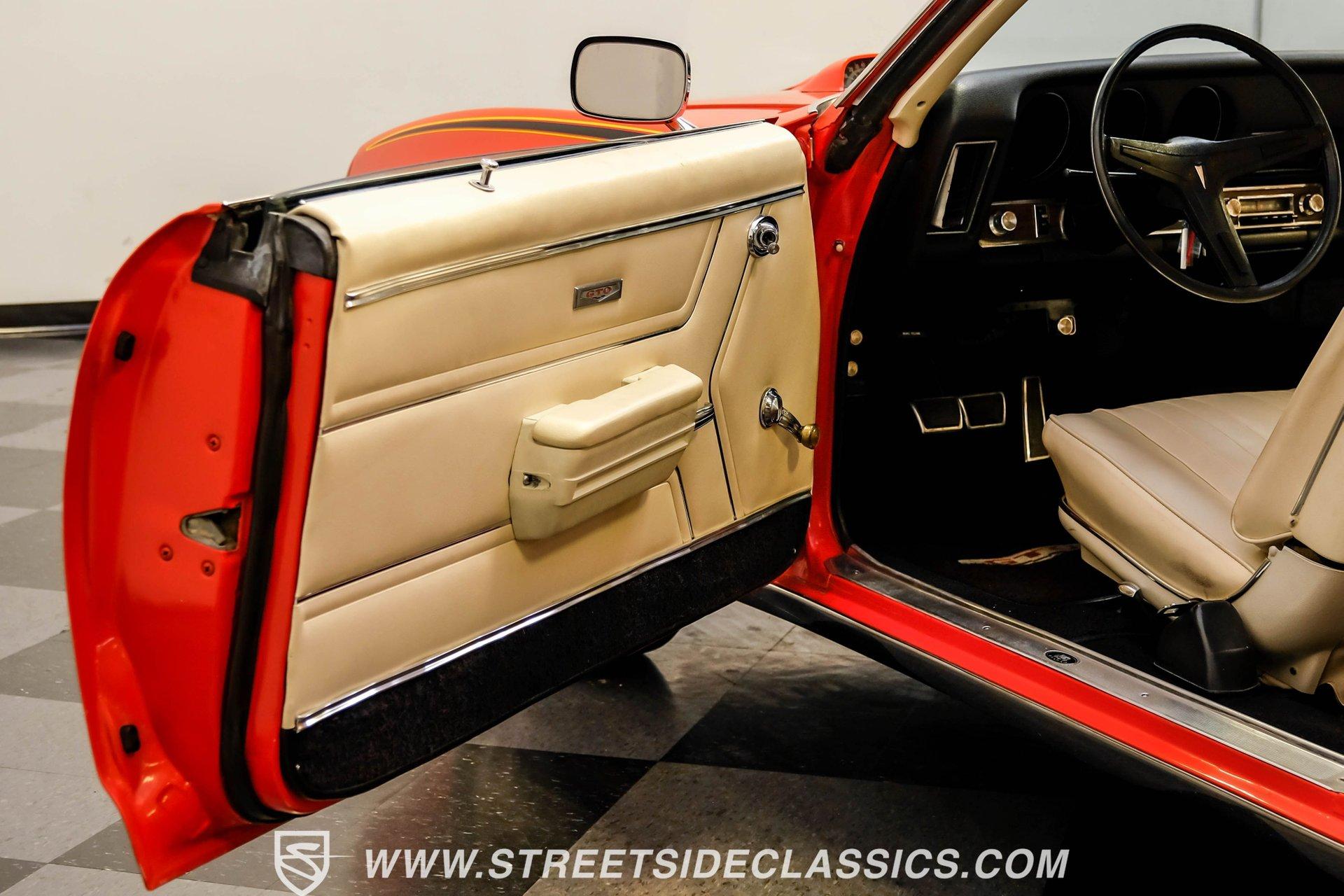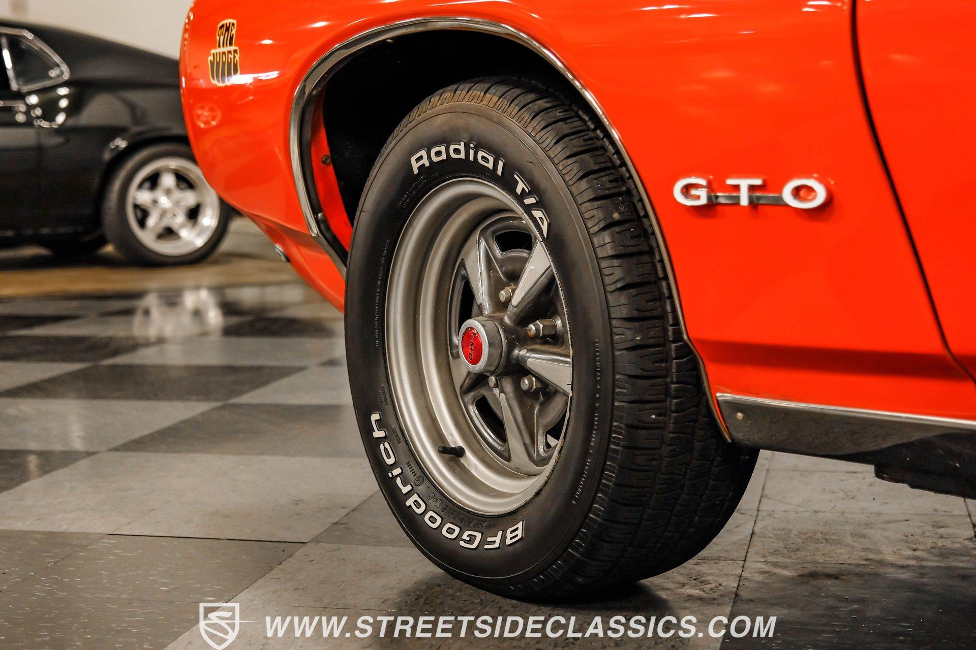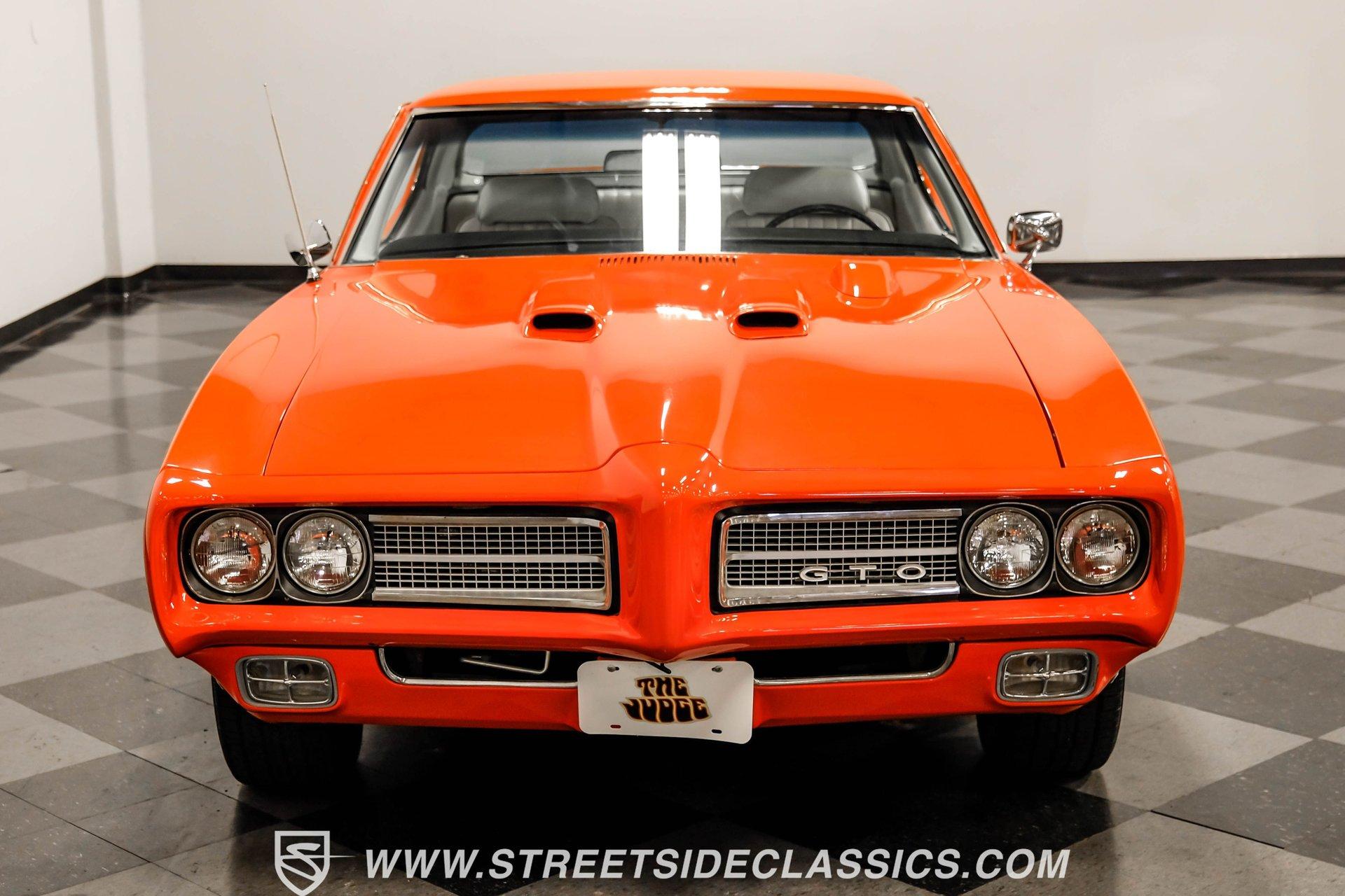 When it comes to collectible cars, the criteria by which we judge a vehicle can vary from person to person. However, almost all enthusiasts can agree that authenticity counts for a great deal. That's why, when a car like this numbers-matching 1969 Pontiac GTO Judge comes along with its official Pontiac Historic Services documentation, the verdict is a unanimous mix of awe and excitement. Fully repainted in its original Carousel Red, the muscular lines of this Judge present a compelling case for why this GTO may just be the G.O.A.T. of Goats. Inside, we find a stock and correctly outfitted interior, featuring an inviting Parchment and black motif, complemented by a touch of woodgrain trim along the dash. A three-pod Rally gauge cluster sits front and center of the power-assisted (and rare) wooden three-spoke steering wheel, featuring (from left to right) a multi-purpose fuel/oil/temperature readout, a big 140 mph speedometer, and a unique and equally large analog clock closest to the passenger side. If you're unfamiliar with the GTO, you might be asking yourself, "But where is the tach?" You need only look just above the dashboard and out the windshield to find an ingenious hood-mounted 8,000 rpm external tachometer, which not only looks unbelievably cool but makes it that much easier to keep your eyes on the fast-approaching road while still being able to hit that perfect 1-2 shift courtesy of a Hurst T-bar handle. The factory console and matching carpets and Vintage brand air conditioning add a touch of comfort. At the same time, the original AM radio remains on display, because, if we're honest, you'll never get tired of listening to that rumble emanating from the dual exhaust just beneath you anyway. Under that dual nostril, we find a clean engine bay, home to a functional Ram Air system. Beneath that curiously clever air-cleaner power package, we find a numbers-matching 400 cubic-inch Ram Air III V-8 engine. Topped with a single four-barrel Rochester Quadrajet carburetor, this mighty motor made use of a 10.75:1 compression ratio to pump out an advertised 366 horsepower and 445 pound-feet of torque. That prodigious power is routed through a numbers-matching Muncie four-speed manual transmission before being sent out to the original factory ten-bolt Safe-T-Trak rear end. Thanks to Positraction, those ponies are transferred to the pavement via a set of correct 15-inch Rally II wheels shod in staggered BFGoodrich tires measuring 245/60R-15. In contrast, a narrower 235/60R-15 set handles steering duties up front while simultaneously adding to this GTO's aggressive muscle car stance. HIGHLIGHTS: Authentic GTO Judge PHS Certified Numbers Matching Ram Air III V8 Numbers Matching Muncie 4 Speed Functional Ram Air Hood Correct Carousel Red Repaint Correct Parchment Vinyl Interior Hurst Shifter Rally Dash Hood Tach Vintage AC Power Steering Power Brakes Front Disc Brakes Safe T Track Rear Receipts Rare and Real Car Riding on a heavy-duty suspension upgraded with higher-rate springs and stiffer shocks, this 1969 Pontiac GTO Judge was capable of cornering markedly better than the base model, while a set of power brakes featuring front discs reins in speed at a moment's notice. While deliberating on which Golden Age muscle car is the best will likely end in a deadlock, there is no debate that this PHS-certified, numbers-matching authentic Judge will go a long way to endow its next owner with life, liberty, and especially the pursuit of happiness. And in the court of public opinion, the only thing you'll be guilty of (provided you keep your eye on the speedometer) is inspiring fits of jealousy anywhere you go behind the wheel of this undeniably amazing and rare machine. Don't wait, call today!