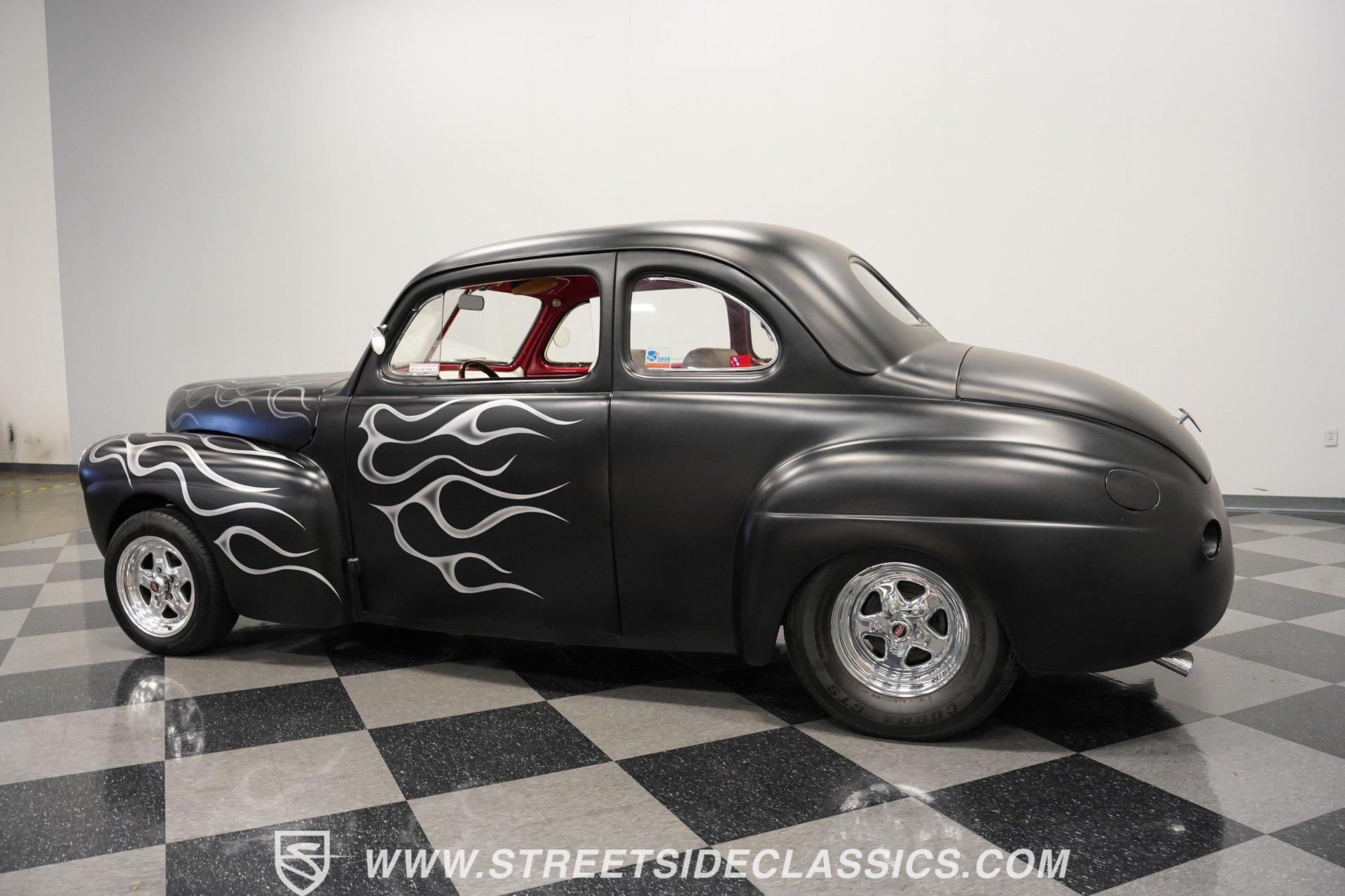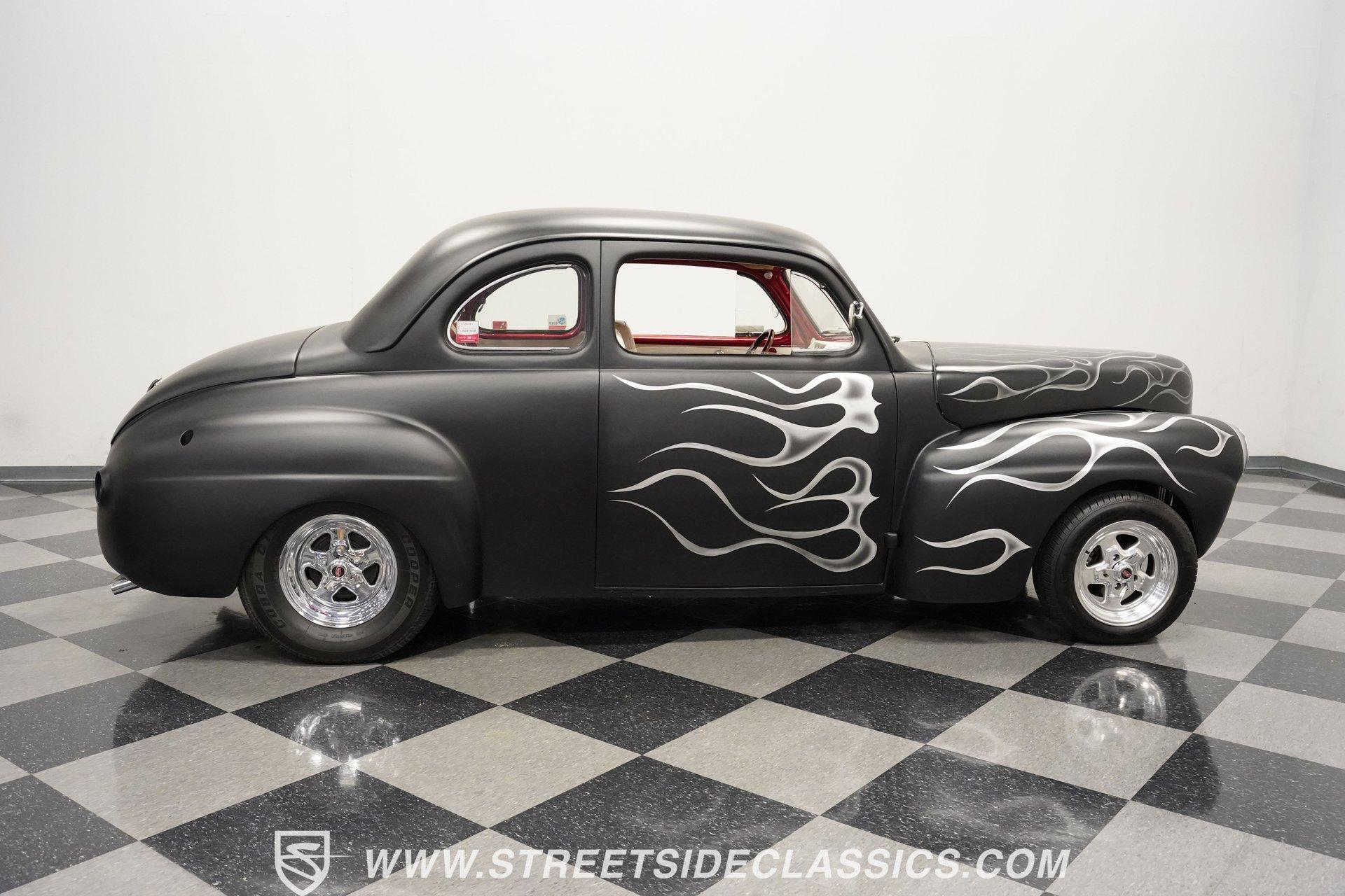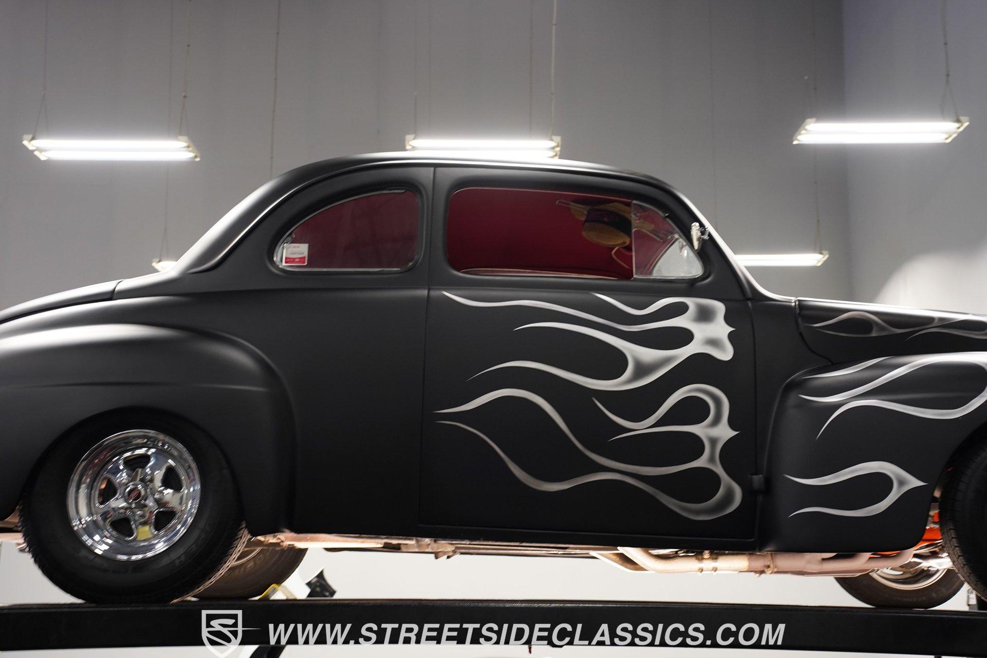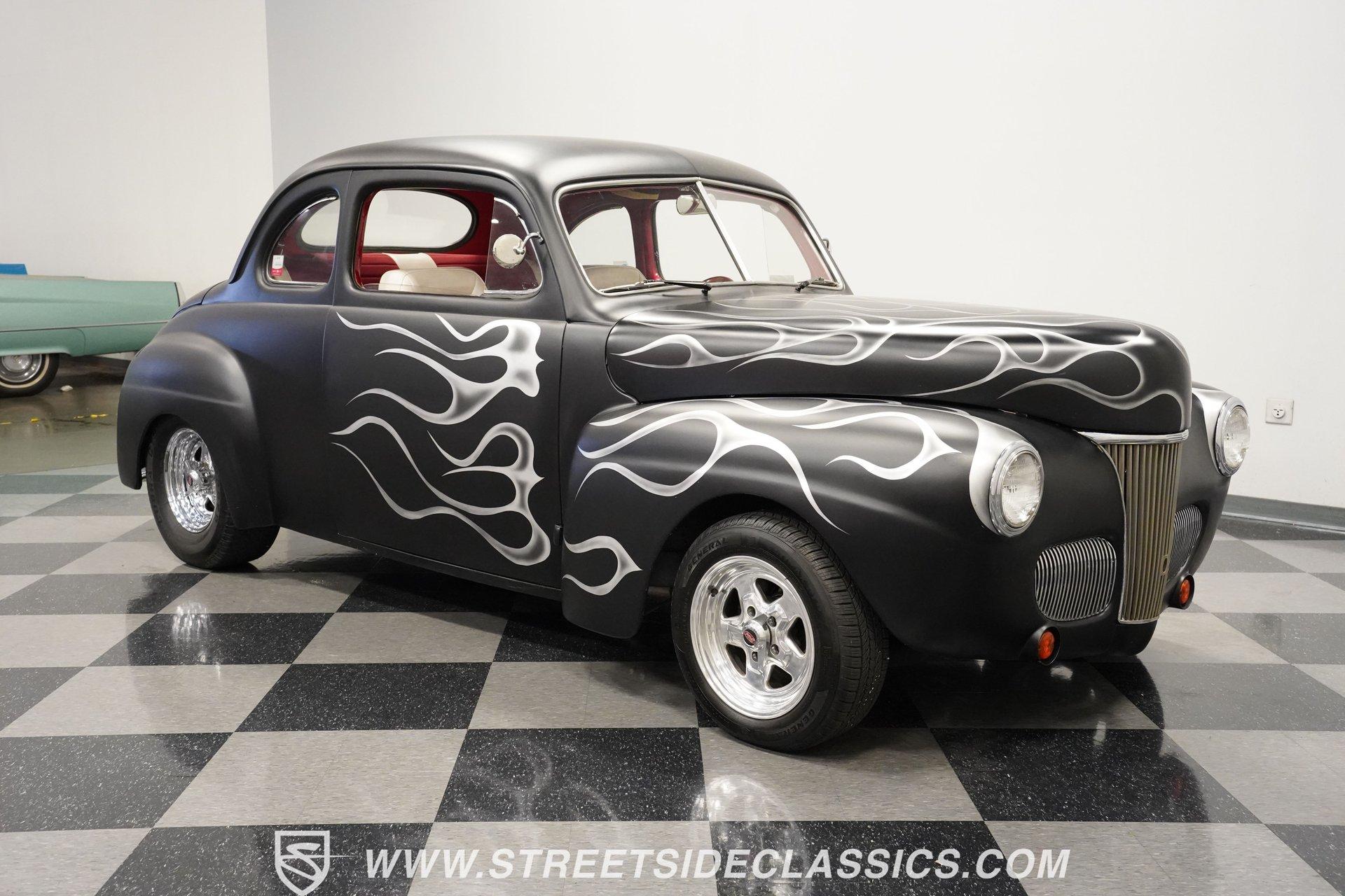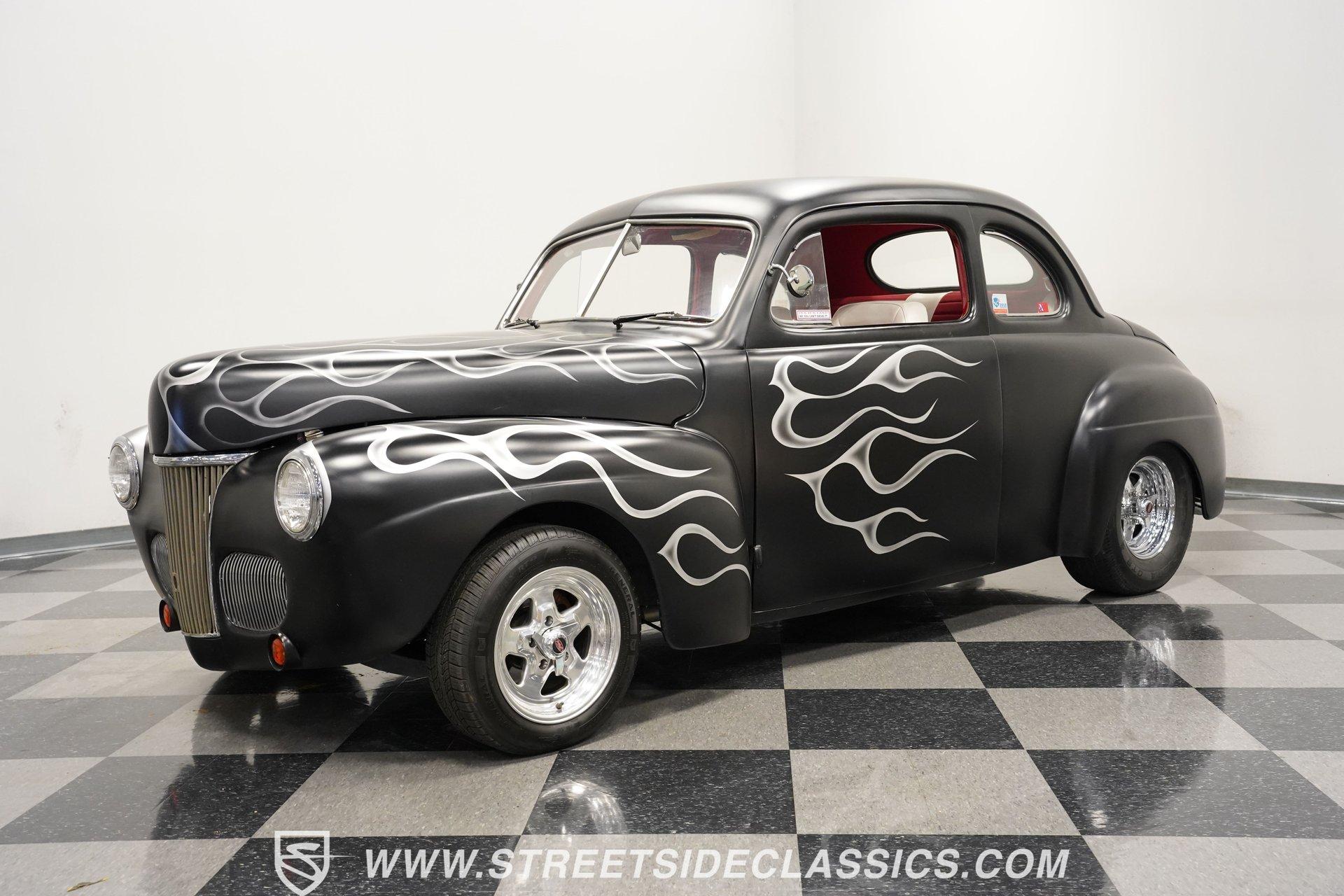 From hot rod culture to modern street machine, this 1941 Ford Coupe sports custom bodywork painted in matte black with silver flames accenting the sides. The modified exterior features custom rear tail lights, a frenched antenna, and a frenched license plate with deleted bumpers for a clean look. The low-slung profile comes from a carefully adjusted suspension that gives this Ford an authentic hot rod appearance. Rolling on 15" wheels with 185/65R15 front and 255/70R15 rear tires, this coupe maintains proper proportions while adding contemporary street cred to a classic American design. Open the doors to reveal a red and white two-tone interior that combines style with function. The vinyl and cloth bucket seats provide comfort during long drives while maintaining the proper hot rod aesthetic. VDO gauges mounted in the custom dashboard display all vital information clearly. The floor shifter puts control directly where you need it. Comfort comes standard with air conditioning for year-round enjoyment. The AM/FM radio with CD player allows for perfect cruising music, while the remote door openers add modern convenience to this classic package. A 383 Stroker V8 sits front and center, equipped with Holley Sniper electronic fuel injection and an Edelbrock intake for reliable performance. The TH350 3-speed automatic transmission transfers power efficiently to the 10-bolt rear axle. Long tube headers connect to a dual exhaust system with FlowMaster mufflers for a distinctive sound. The chassis features a Chevrolet front end with coils and shocks, while the rear utilizes leaf springs with shocks, lowered by approximately 2 inches on blocks. Power steering and power disc brakes provide excellent control and stopping ability. HIGHLIGHTS: 383 Stroker V8 Engine Holley Sniper Electronic Fuel Injection Edelbrock Intake TH350 3-Speed Automatic Transmission Long Tube Headers Dual Exhaust with FlowMaster Mufflers 10 Bolt Rear Axle Front Power Disc Brakes Chevrolet Front Suspension Matte Black Paint with Silver Flames Custom Rear Tail Lights Frenched Antenna Frenched License Plate 15" Wheels in 185/65R15 Front, 255/70R15 Rear Tires Red and White Two-Tone Interior Vinyl and Cloth Bucket Seats VDO Gauges Floor Shifter Air Conditioning AM/FM Radio with CD Player Power Steering Remote Door Openers A well-executed blend of classic styling and modern performance make this 1941 Ford Coupe an outstanding custom ride. With its 383 Stroker V8, custom paint scheme, and fully updated mechanical systems, you'll appreciate every mile behind the wheel. Call today!