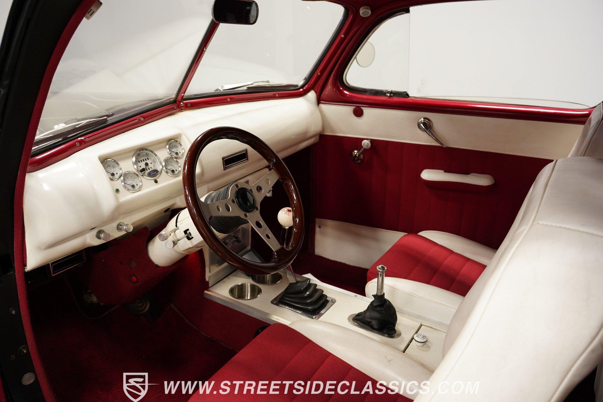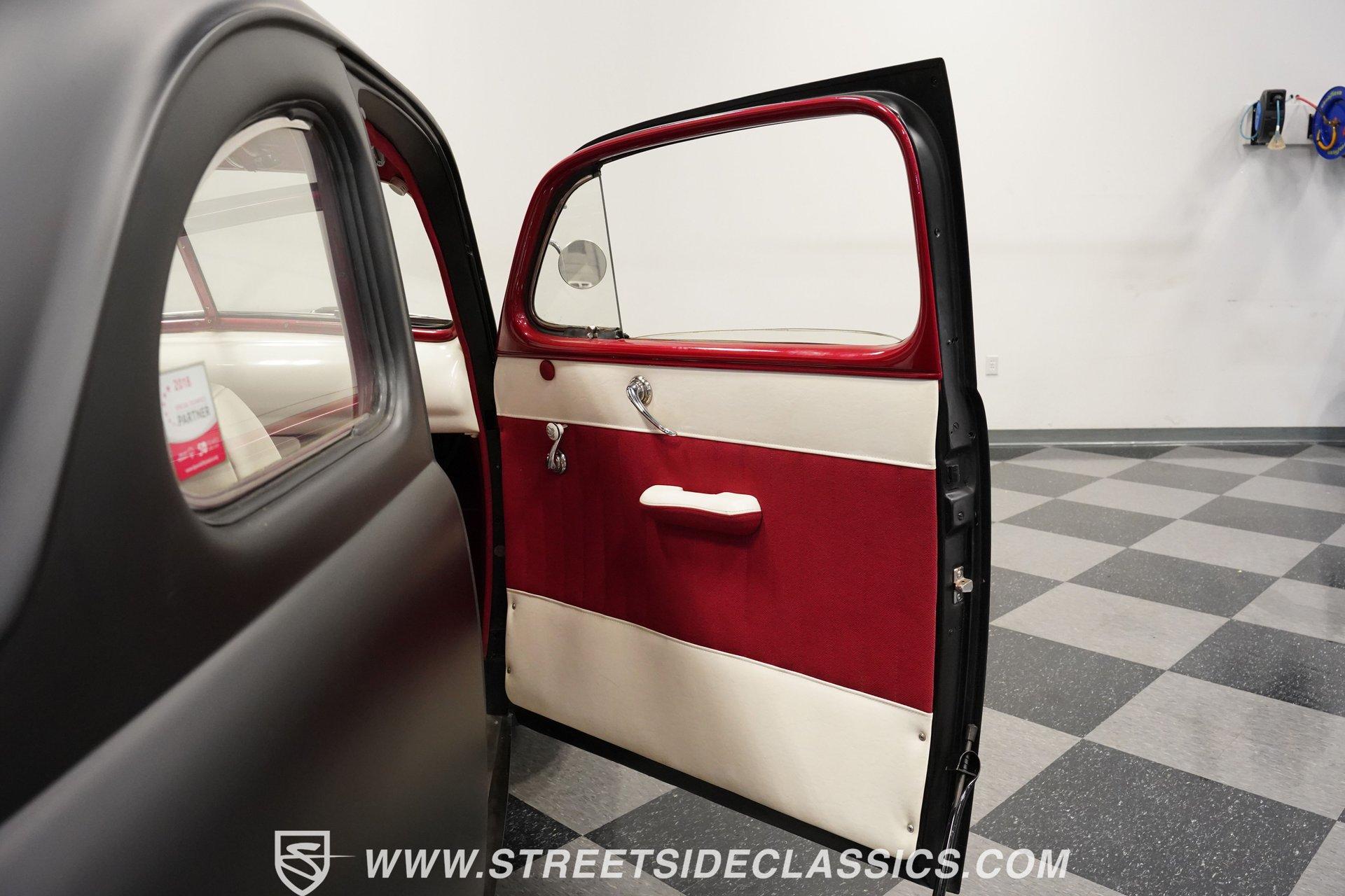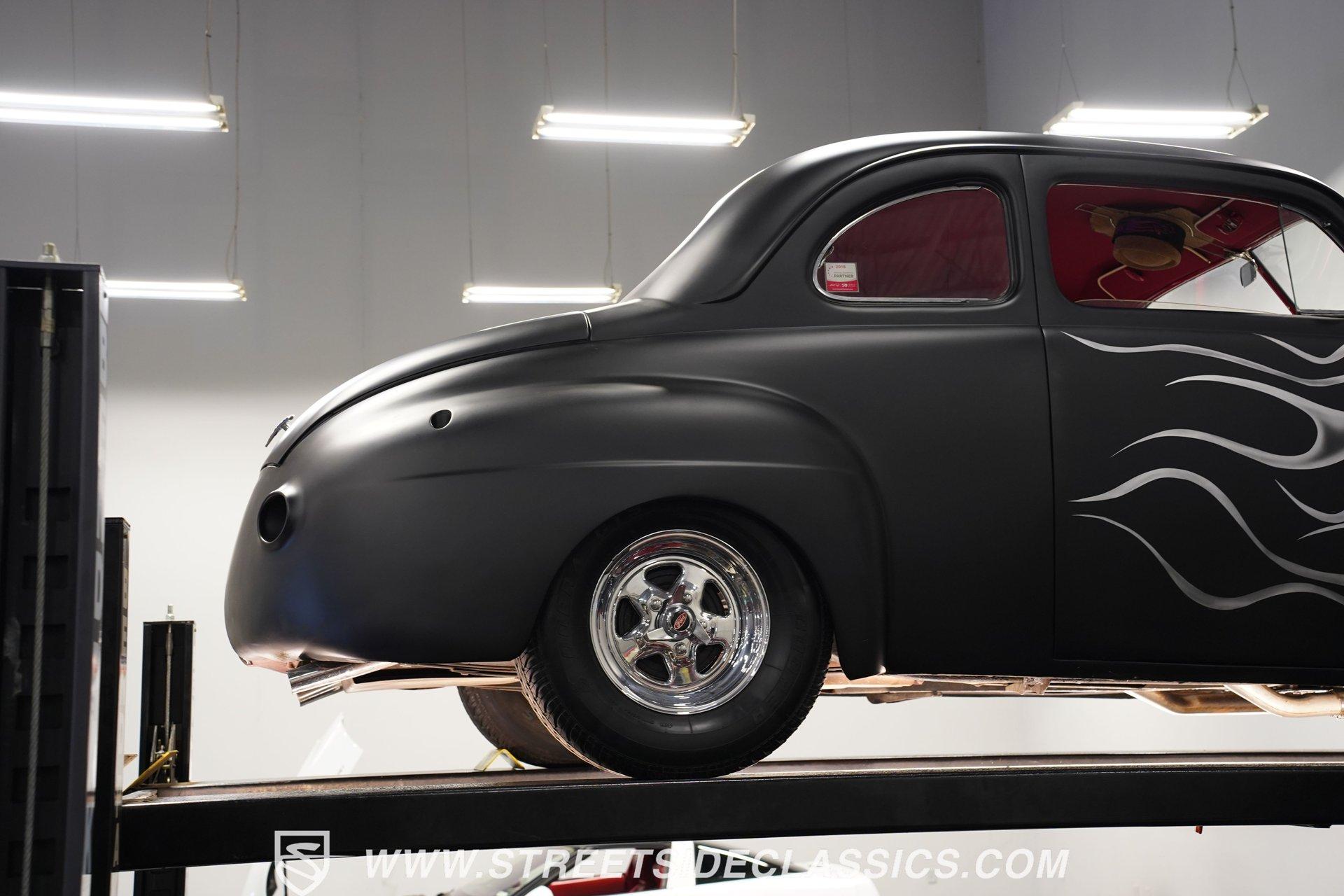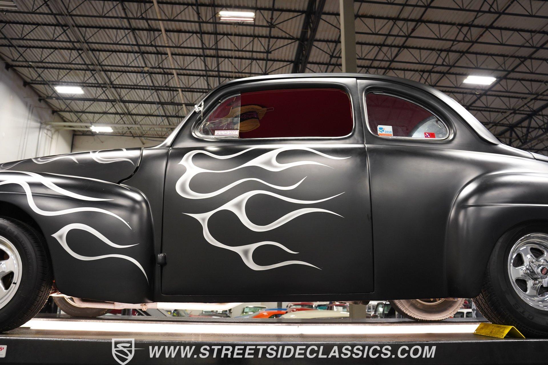 From hot rod culture to modern street machine, this 1941 Ford Coupe sports custom bodywork painted in matte black with silver flames accenting the sides. The modified exterior features custom rear tail lights, a frenched antenna, and a frenched license plate with deleted bumpers for a clean look. The low-slung profile comes from a carefully adjusted suspension that gives this Ford an authentic hot rod appearance. Rolling on 15" wheels with 185/65R15 front and 255/70R15 rear tires, this coupe maintains proper proportions while adding contemporary street cred to a classic American design. Open the doors to reveal a red and white two-tone interior that combines style with function. The vinyl and cloth bucket seats provide comfort during long drives while maintaining the proper hot rod aesthetic. VDO gauges mounted in the custom dashboard display all vital information clearly. The floor shifter puts control directly where you need it. Comfort comes standard with air conditioning for year-round enjoyment. The AM/FM radio with CD player allows for perfect cruising music, while the remote door openers add modern convenience to this classic package. A 383 Stroker V8 sits front and center, equipped with Holley Sniper electronic fuel injection and an Edelbrock intake for reliable performance. The TH350 3-speed automatic transmission transfers power efficiently to the 10-bolt rear axle. Long tube headers connect to a dual exhaust system with FlowMaster mufflers for a distinctive sound. The chassis features a Chevrolet front end with coils and shocks, while the rear utilizes leaf springs with shocks, lowered by approximately 2 inches on blocks. Power steering and power disc brakes provide excellent control and stopping ability. HIGHLIGHTS: 383 Stroker V8 Engine Holley Sniper Electronic Fuel Injection Edelbrock Intake TH350 3-Speed Automatic Transmission Long Tube Headers Dual Exhaust with FlowMaster Mufflers 10 Bolt Rear Axle Front Power Disc Brakes Chevrolet Front Suspension Matte Black Paint with Silver Flames Custom Rear Tail Lights Frenched Antenna Frenched License Plate 15" Wheels in 185/65R15 Front, 255/70R15 Rear Tires Red and White Two-Tone Interior Vinyl and Cloth Bucket Seats VDO Gauges Floor Shifter Air Conditioning AM/FM Radio with CD Player Power Steering Remote Door Openers A well-executed blend of classic styling and modern performance make this 1941 Ford Coupe an outstanding custom ride. With its 383 Stroker V8, custom paint scheme, and fully updated mechanical systems, you'll appreciate every mile behind the wheel. Call today!