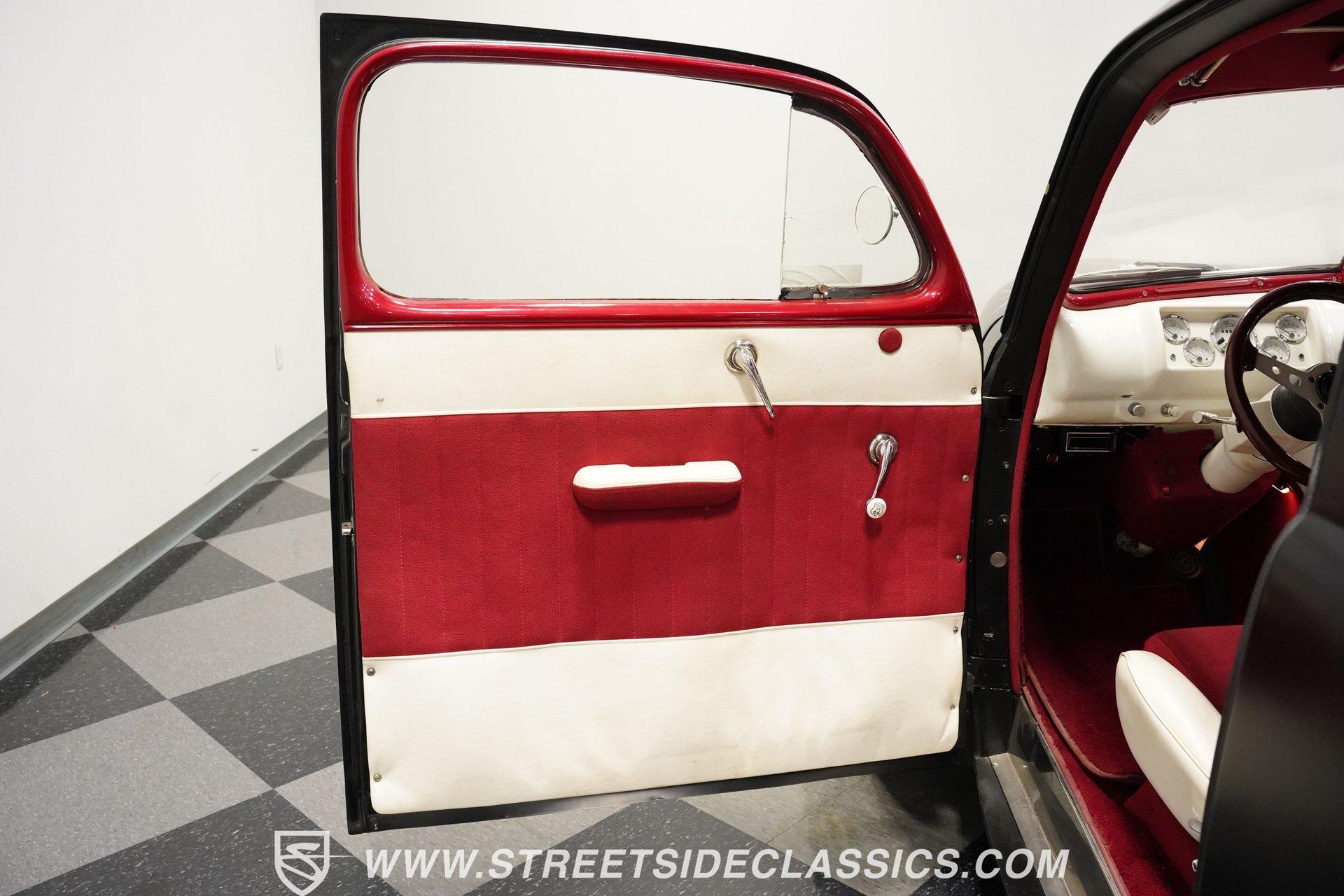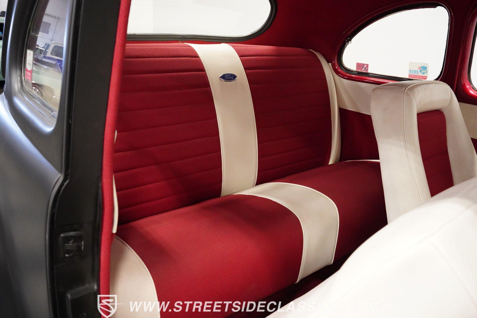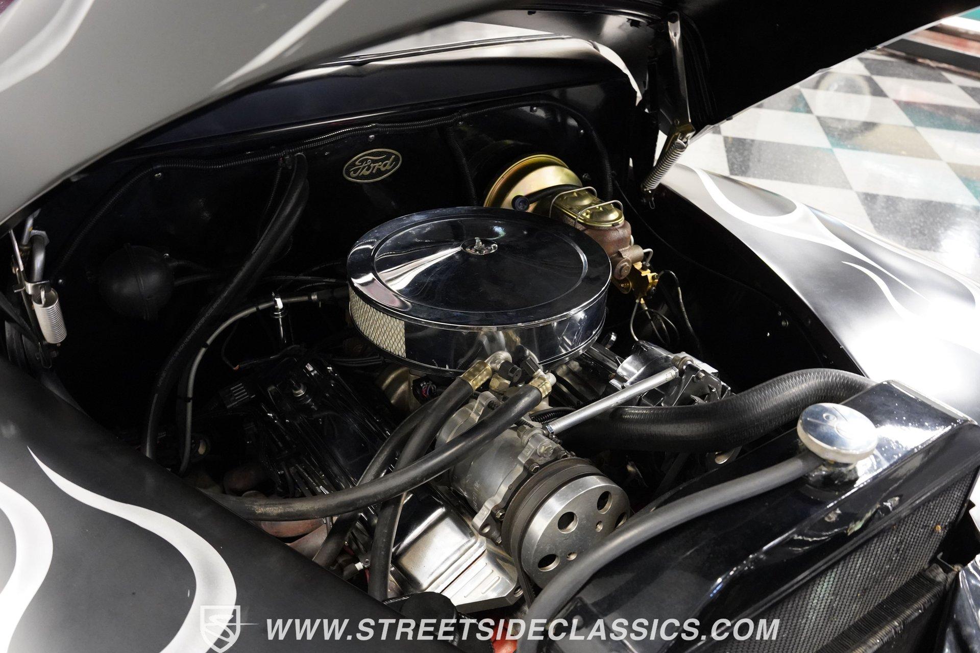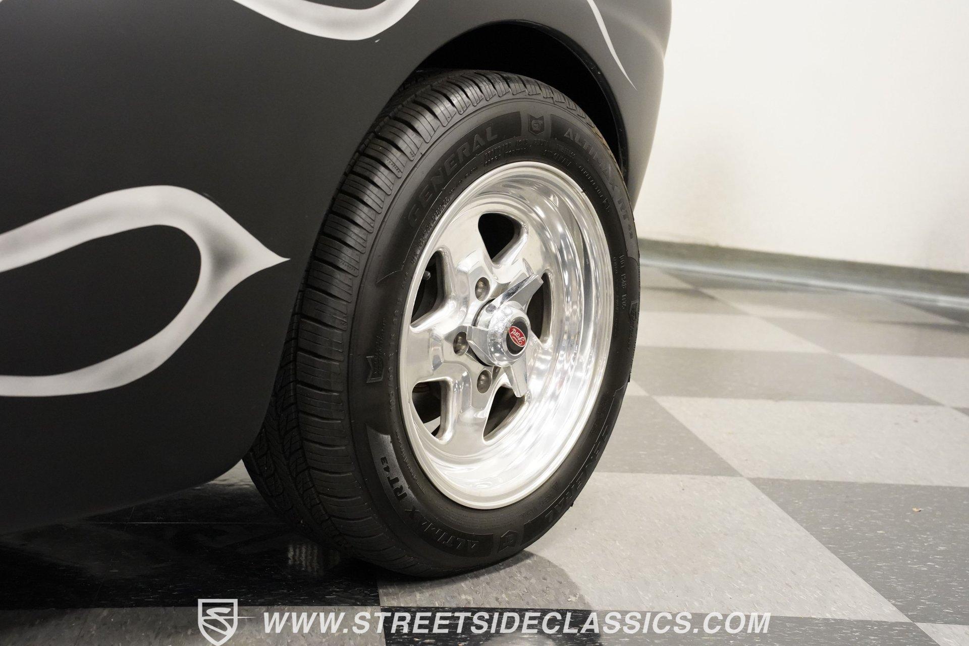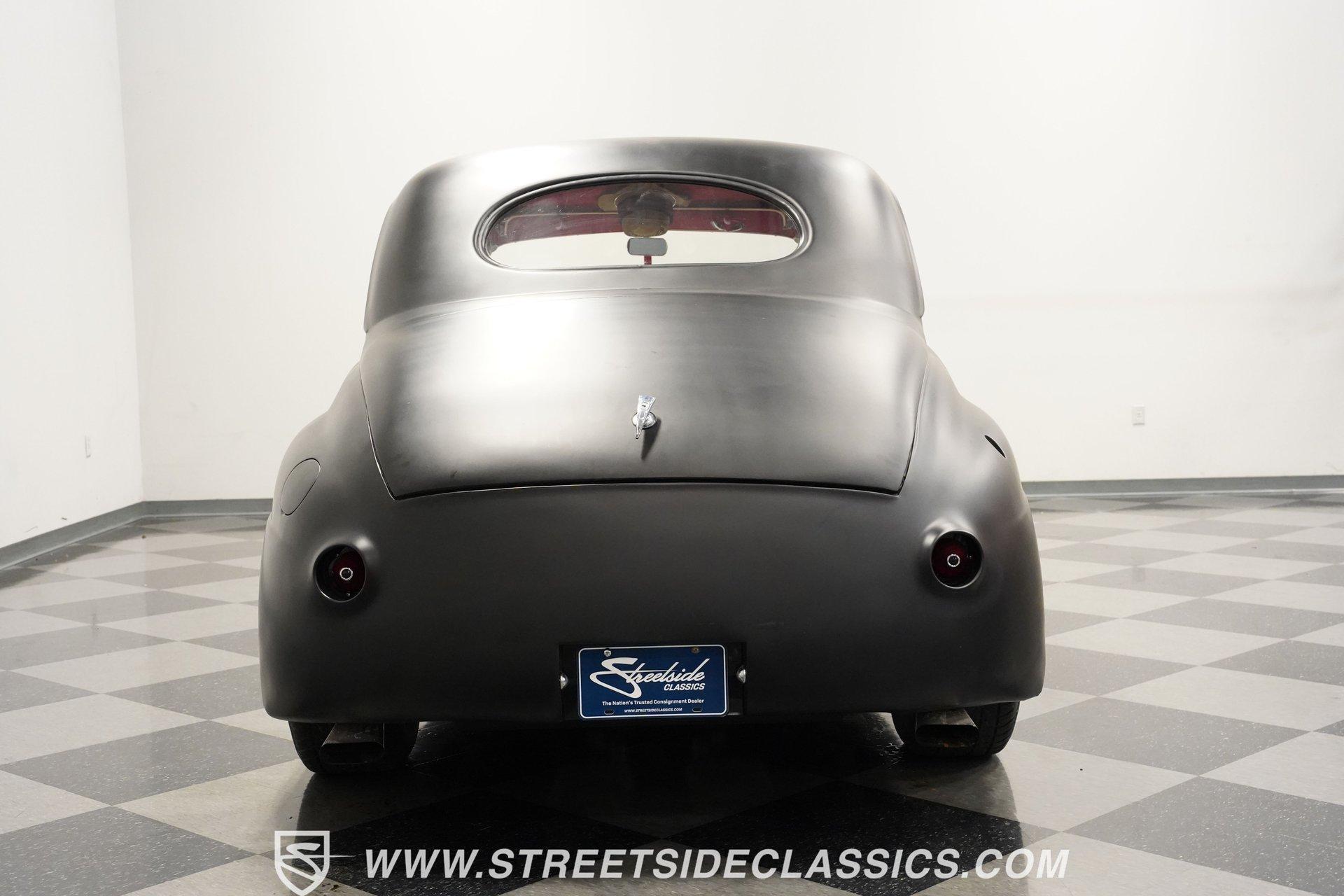 From hot rod culture to modern street machine, this 1941 Ford Coupe sports custom bodywork painted in matte black with silver flames accenting the sides. The modified exterior features custom rear tail lights, a frenched antenna, and a frenched license plate with deleted bumpers for a clean look. The low-slung profile comes from a carefully adjusted suspension that gives this Ford an authentic hot rod appearance. Rolling on 15" wheels with 185/65R15 front and 255/70R15 rear tires, this coupe maintains proper proportions while adding contemporary street cred to a classic American design. Open the doors to reveal a red and white two-tone interior that combines style with function. The vinyl and cloth bucket seats provide comfort during long drives while maintaining the proper hot rod aesthetic. VDO gauges mounted in the custom dashboard display all vital information clearly. The floor shifter puts control directly where you need it. Comfort comes standard with air conditioning for year-round enjoyment. The AM/FM radio with CD player allows for perfect cruising music, while the remote door openers add modern convenience to this classic package. A 383 Stroker V8 sits front and center, equipped with Holley Sniper electronic fuel injection and an Edelbrock intake for reliable performance. The TH350 3-speed automatic transmission transfers power efficiently to the 10-bolt rear axle. Long tube headers connect to a dual exhaust system with FlowMaster mufflers for a distinctive sound. The chassis features a Chevrolet front end with coils and shocks, while the rear utilizes leaf springs with shocks, lowered by approximately 2 inches on blocks. Power steering and power disc brakes provide excellent control and stopping ability. HIGHLIGHTS: 383 Stroker V8 Engine Holley Sniper Electronic Fuel Injection Edelbrock Intake TH350 3-Speed Automatic Transmission Long Tube Headers Dual Exhaust with FlowMaster Mufflers 10 Bolt Rear Axle Front Power Disc Brakes Chevrolet Front Suspension Matte Black Paint with Silver Flames Custom Rear Tail Lights Frenched Antenna Frenched License Plate 15" Wheels in 185/65R15 Front, 255/70R15 Rear Tires Red and White Two-Tone Interior Vinyl and Cloth Bucket Seats VDO Gauges Floor Shifter Air Conditioning AM/FM Radio with CD Player Power Steering Remote Door Openers A well-executed blend of classic styling and modern performance make this 1941 Ford Coupe an outstanding custom ride. With its 383 Stroker V8, custom paint scheme, and fully updated mechanical systems, you'll appreciate every mile behind the wheel. Call today!