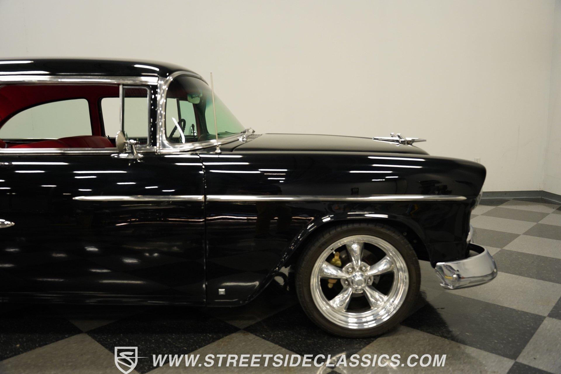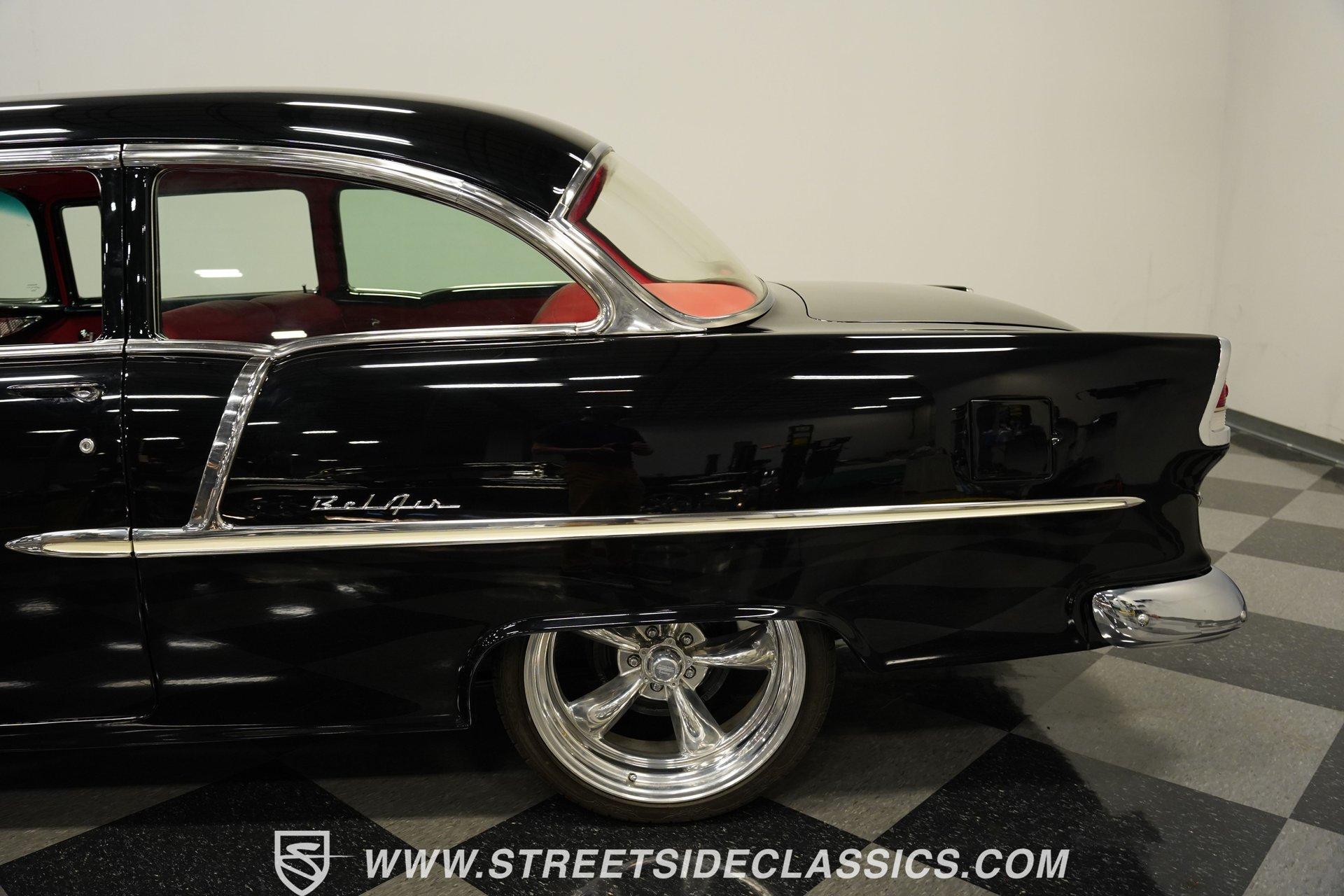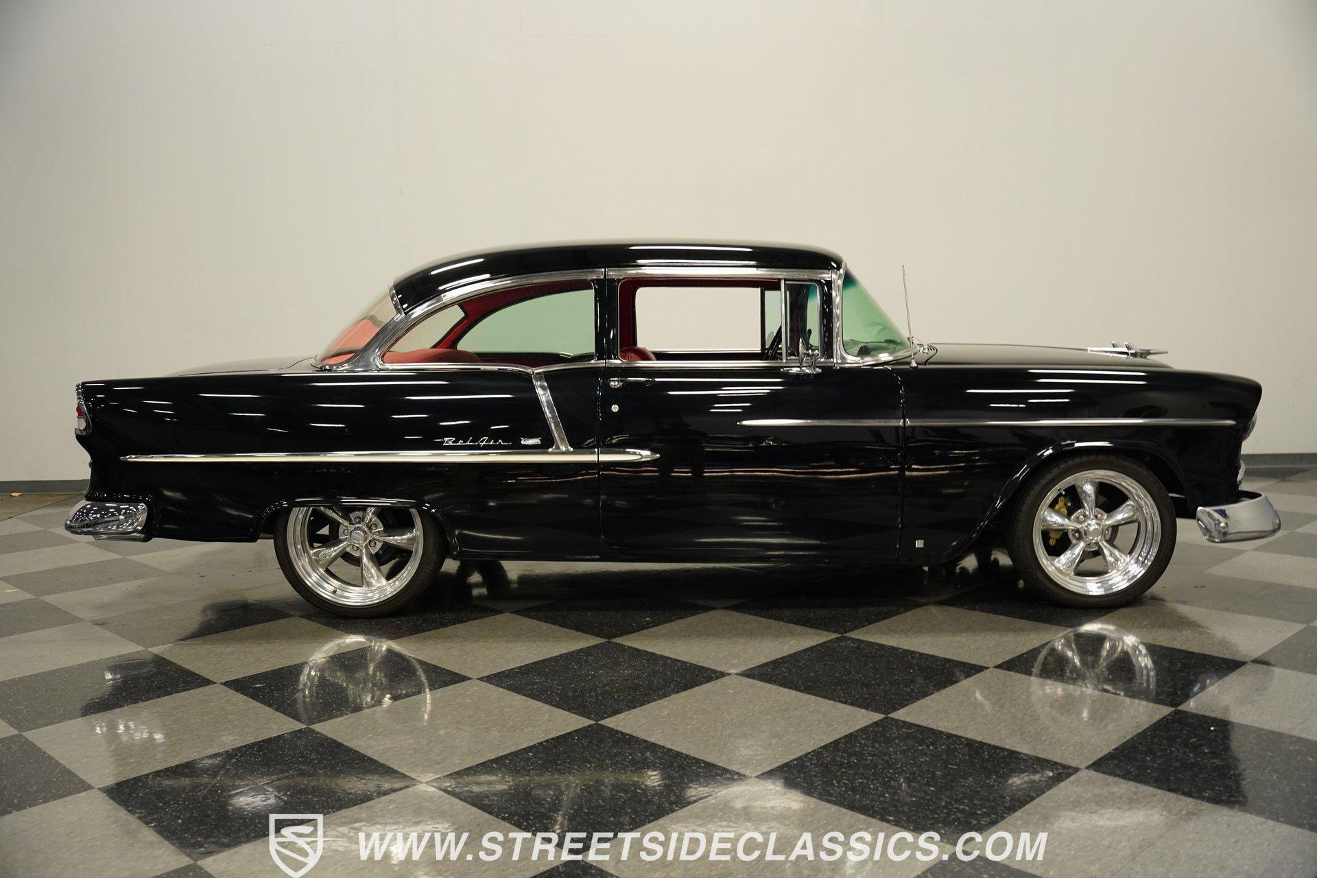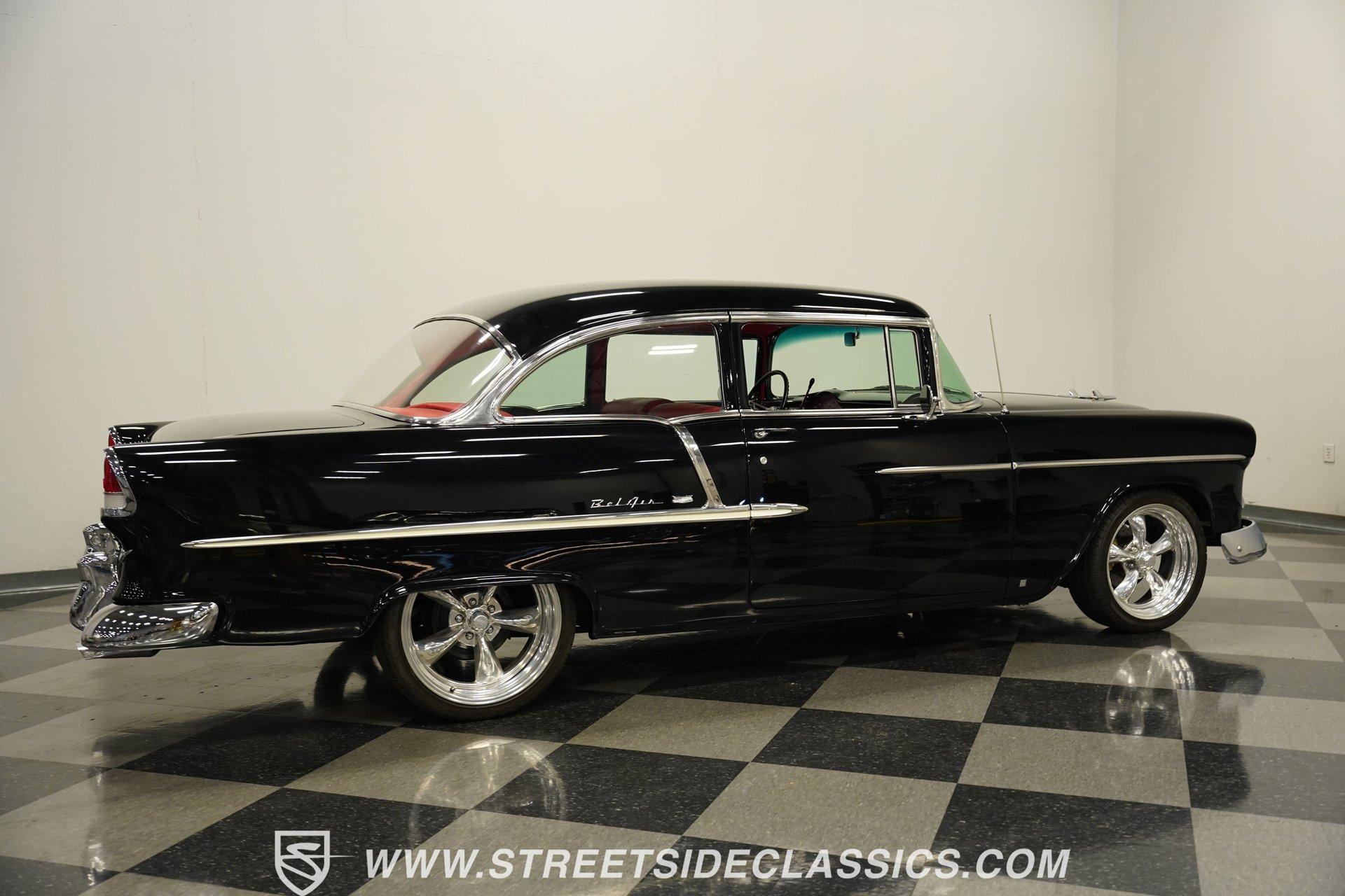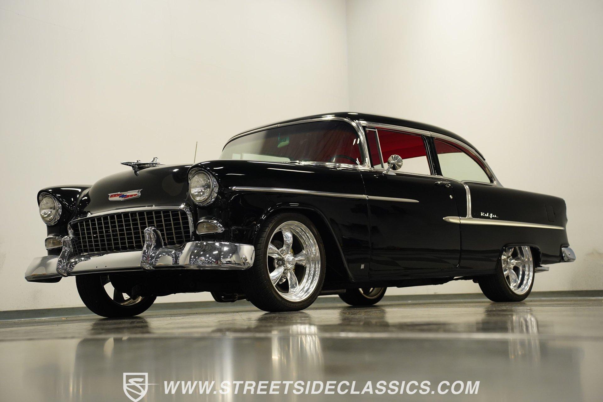 A full frame-off restoration brings this 1955 Chevrolet Bel Air back to life with black paint that flows across every panel and chrome brightwork that reflects decades of automotive evolution. Staggered American Racing wheels fill the wells with 18-inch fronts wearing 225/40ZR18 rubber and 20-inch rears mounted with 245/35ZR20 tires. The lowered stance gives this Bel Air an aggressive posture while dual exhaust exits provide the soundtrack. Chrome bumpers and trim pieces complete the exterior package on this two-door sedan. Inside, red vinyl split-bench seating dominates the cabin with matching rear bench and headliner creating a monochromatic interior theme. Classic Industries gauges replace the original cluster while a comfort grip steering wheel sits behind the column shifter. An AM/FM cassette deck handles entertainment duties while red carpeting and door panels maintain the color scheme throughout the cabin. Power steering makes maneuvering effortless while the black painted dash contrasts with the red appointments. The 327 V8 engine features a 1967 date code with Edelbrock single four-barrel carburetor feeding the small block. A TH350 three-speed automatic transmission handles shifting duties while power disc brakes provide stopping power up front. Long tube headers feed into the dual exhaust system while the lowered suspension includes coil springs with shocks front and leaf springs with shocks rear. An aluminum intake manifold and valve covers dress up the engine bay along with a chrome air cleaner. Power steering and power brakes complete the mechanical upgrades. HIGHLIGHTS: 327 V8 Engine Edelbrock Single 4 Barrel Carburetor TH350 3 Speed Automatic Transmission Power Disc Brakes Power Steering Long Tube Headers Dual Exhaust Lowered Suspension Aluminum Intake Manifold Chrome Valve Covers Black Paint 18" Front, 20" Rear American Racing Wheels 225/40ZR18 Front, 245/35ZR20 Rear Tires Chrome Bumpers and Trim Full Frame-Off Restoration Red Interior With Split-Bench Seats Classic Industries Gauges Comfort Grip Steering Wheel AM/FM Cassette Player Column Shifter Black Painted Dash Full Frame-Off Restoration Complete frame-off restoration, strong running 327 small block, and period-correct styling make this 1955 Chevrolet Bel Air a solid choice for cruising or showing. The combination of classic looks and modern reliability creates an appealing package. Call today!