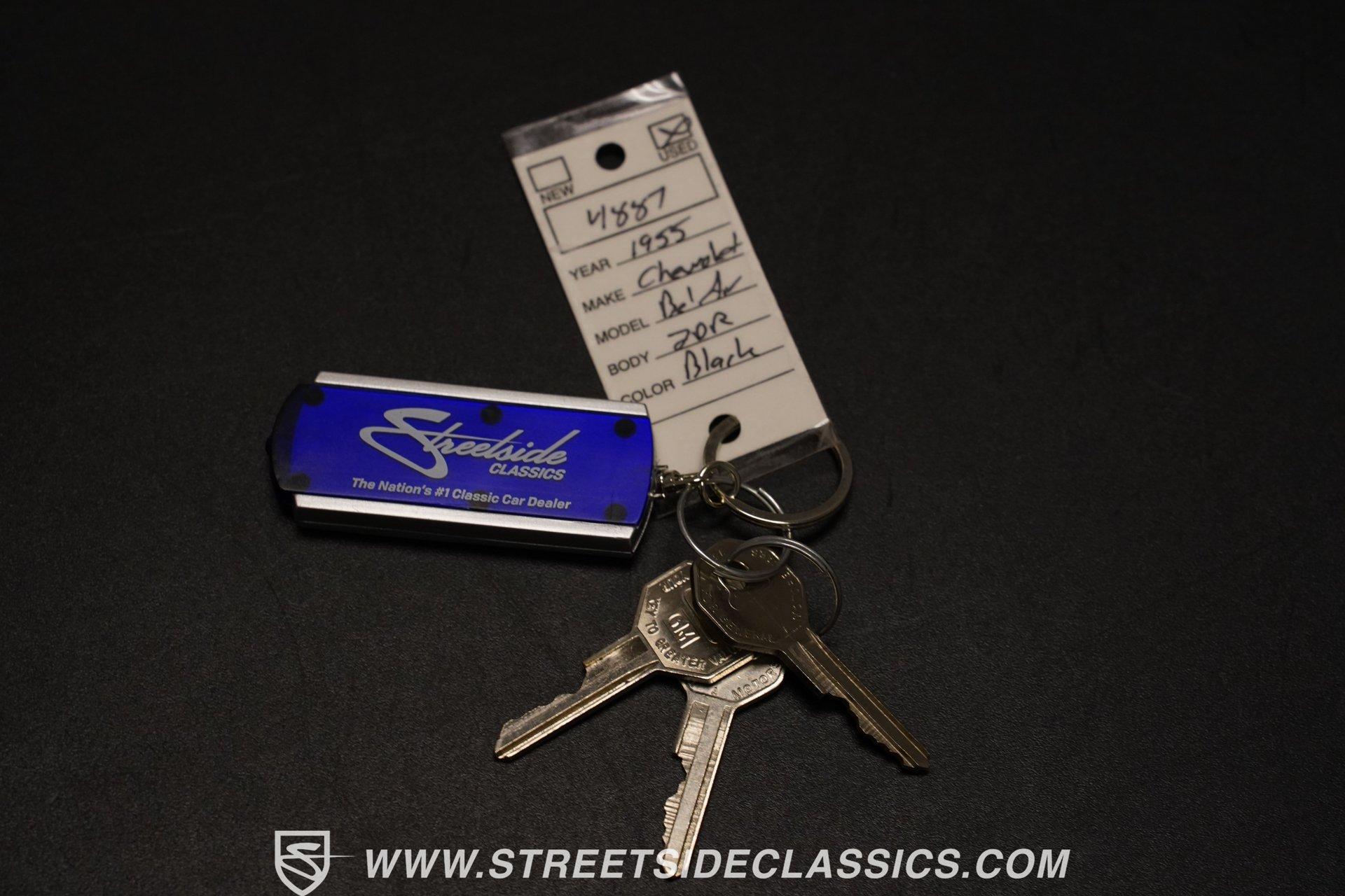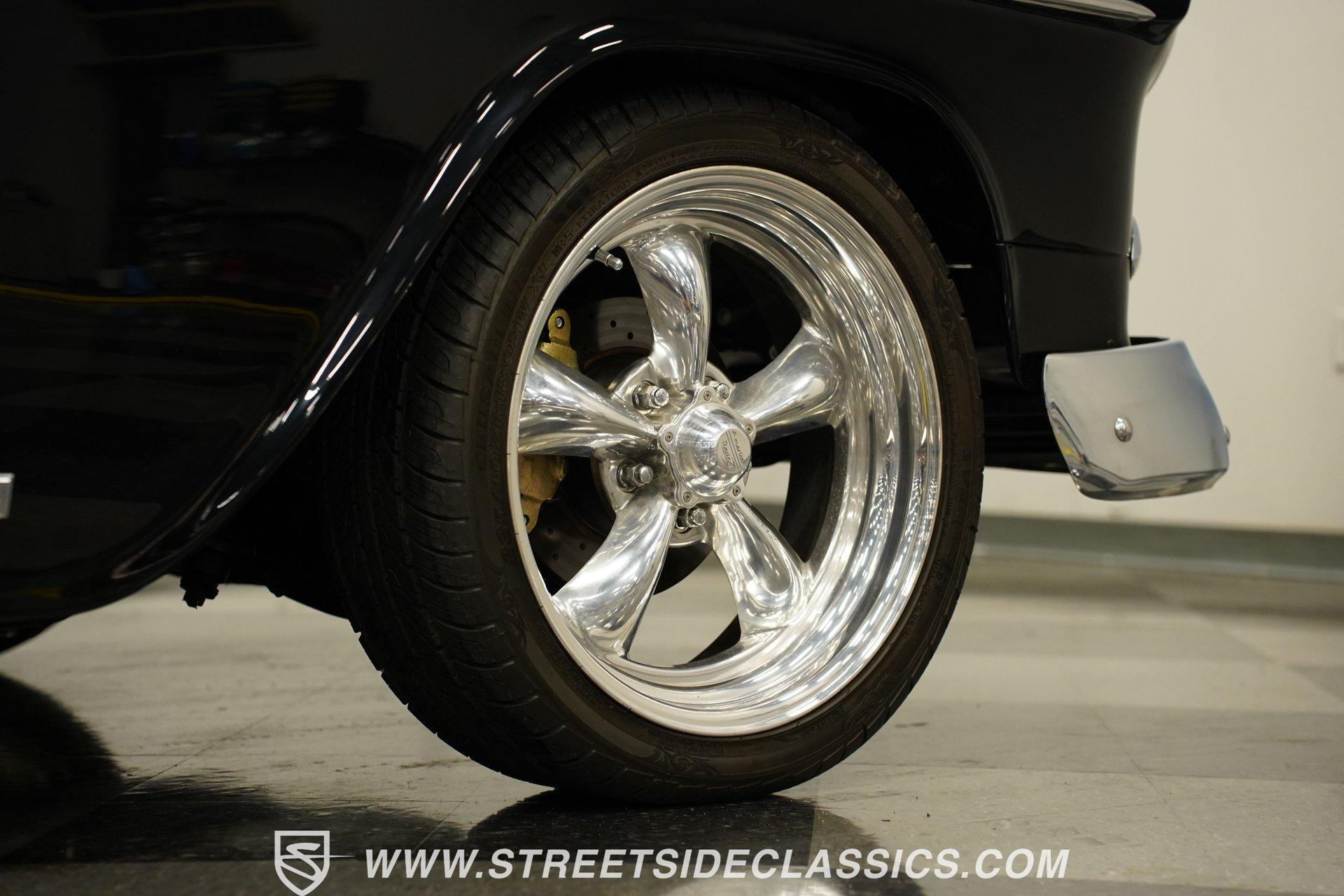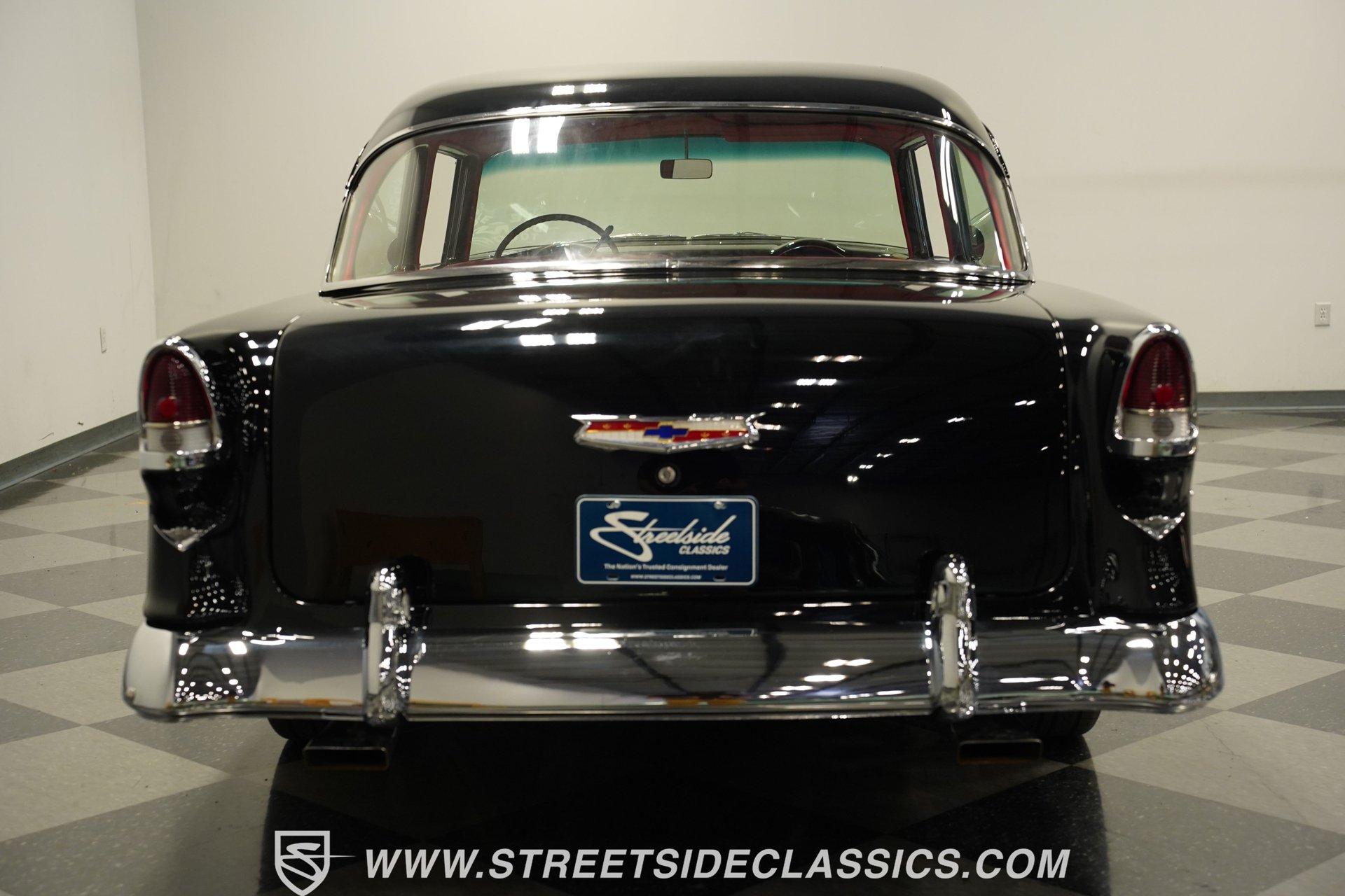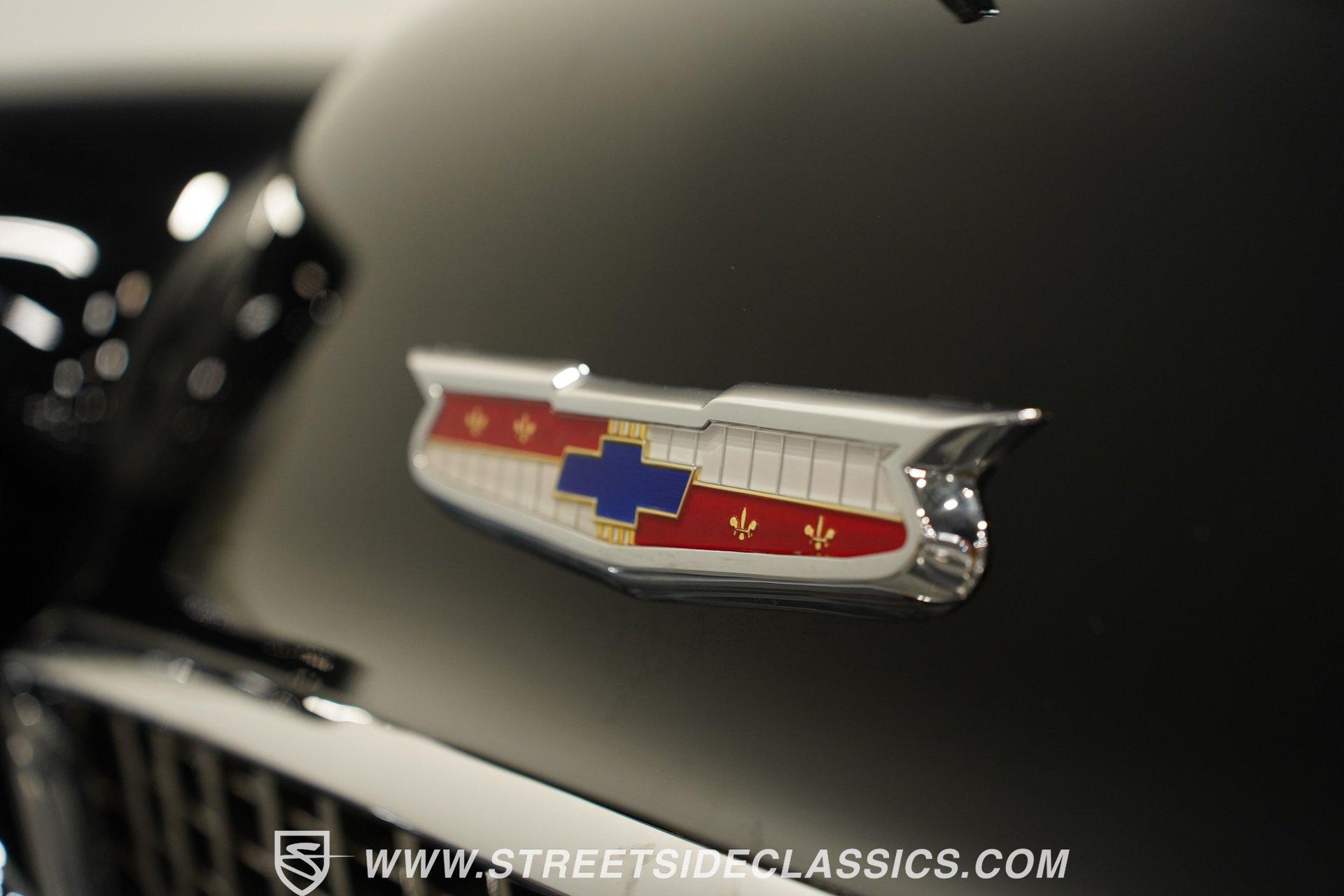 A full frame-off restoration brings this 1955 Chevrolet Bel Air back to life with black paint that flows across every panel and chrome brightwork that reflects decades of automotive evolution. Staggered American Racing wheels fill the wells with 18-inch fronts wearing 225/40ZR18 rubber and 20-inch rears mounted with 245/35ZR20 tires. The lowered stance gives this Bel Air an aggressive posture while dual exhaust exits provide the soundtrack. Chrome bumpers and trim pieces complete the exterior package on this two-door sedan. Inside, red vinyl split-bench seating dominates the cabin with matching rear bench and headliner creating a monochromatic interior theme. Classic Industries gauges replace the original cluster while a comfort grip steering wheel sits behind the column shifter. An AM/FM cassette deck handles entertainment duties while red carpeting and door panels maintain the color scheme throughout the cabin. Power steering makes maneuvering effortless while the black painted dash contrasts with the red appointments. The 327 V8 engine features a 1967 date code with Edelbrock single four-barrel carburetor feeding the small block. A TH350 three-speed automatic transmission handles shifting duties while power disc brakes provide stopping power up front. Long tube headers feed into the dual exhaust system while the lowered suspension includes coil springs with shocks front and leaf springs with shocks rear. An aluminum intake manifold and valve covers dress up the engine bay along with a chrome air cleaner. Power steering and power brakes complete the mechanical upgrades. HIGHLIGHTS: 327 V8 Engine Edelbrock Single 4 Barrel Carburetor TH350 3 Speed Automatic Transmission Power Disc Brakes Power Steering Long Tube Headers Dual Exhaust Lowered Suspension Aluminum Intake Manifold Chrome Valve Covers Black Paint 18" Front, 20" Rear American Racing Wheels 225/40ZR18 Front, 245/35ZR20 Rear Tires Chrome Bumpers and Trim Full Frame-Off Restoration Red Interior With Split-Bench Seats Classic Industries Gauges Comfort Grip Steering Wheel AM/FM Cassette Player Column Shifter Black Painted Dash Full Frame-Off Restoration Complete frame-off restoration, strong running 327 small block, and period-correct styling make this 1955 Chevrolet Bel Air a solid choice for cruising or showing. The combination of classic looks and modern reliability creates an appealing package. Call today!