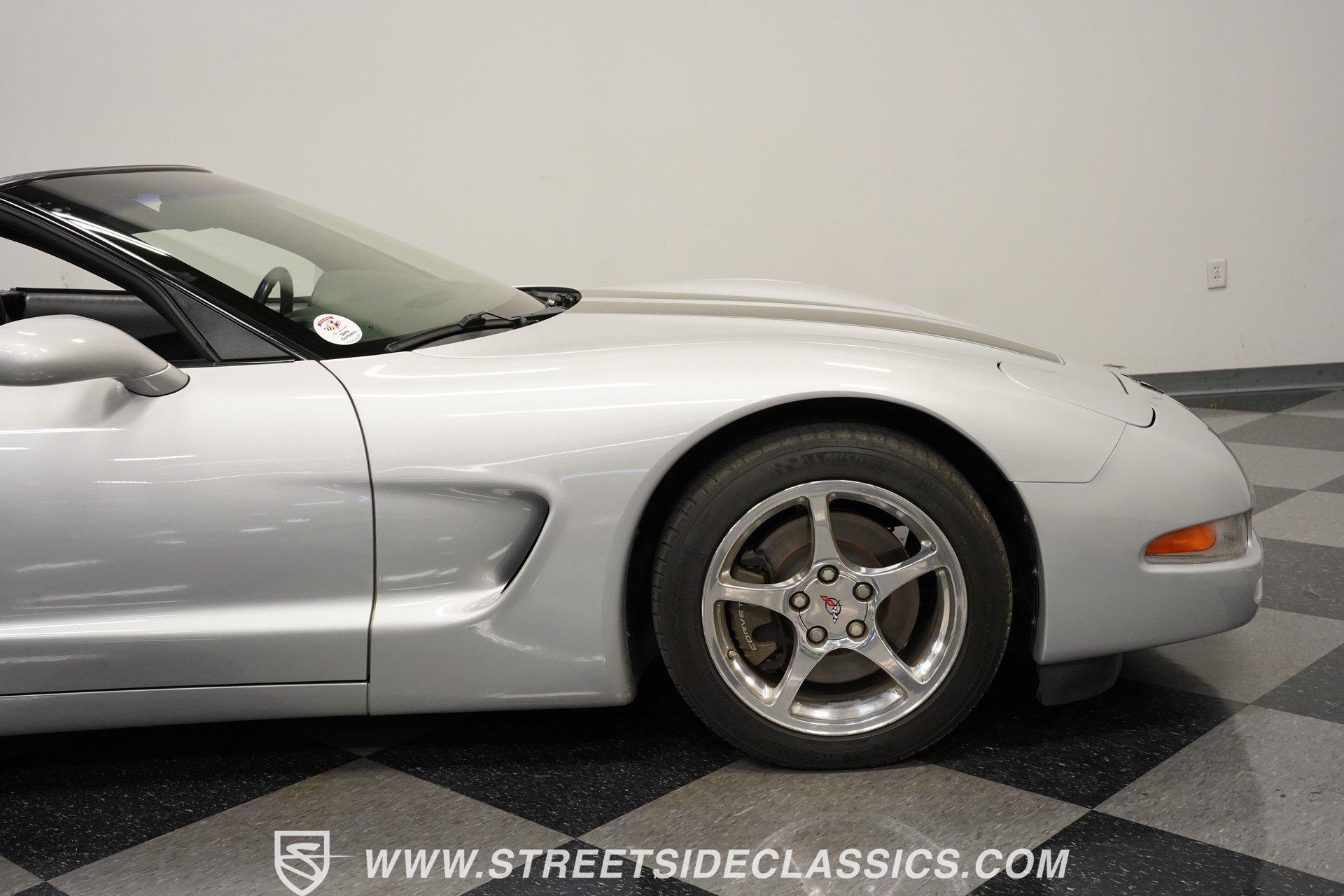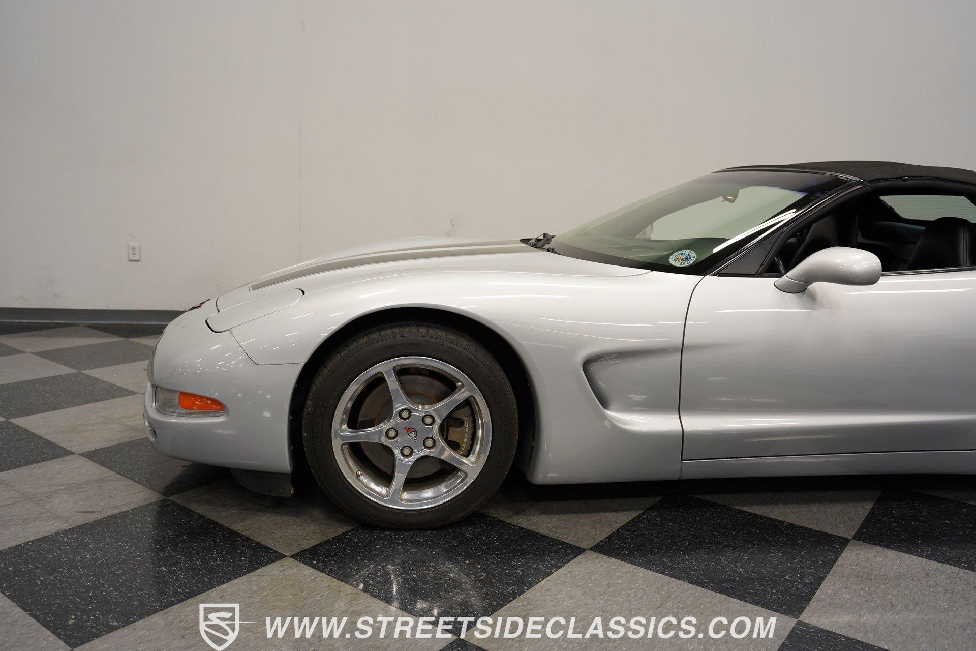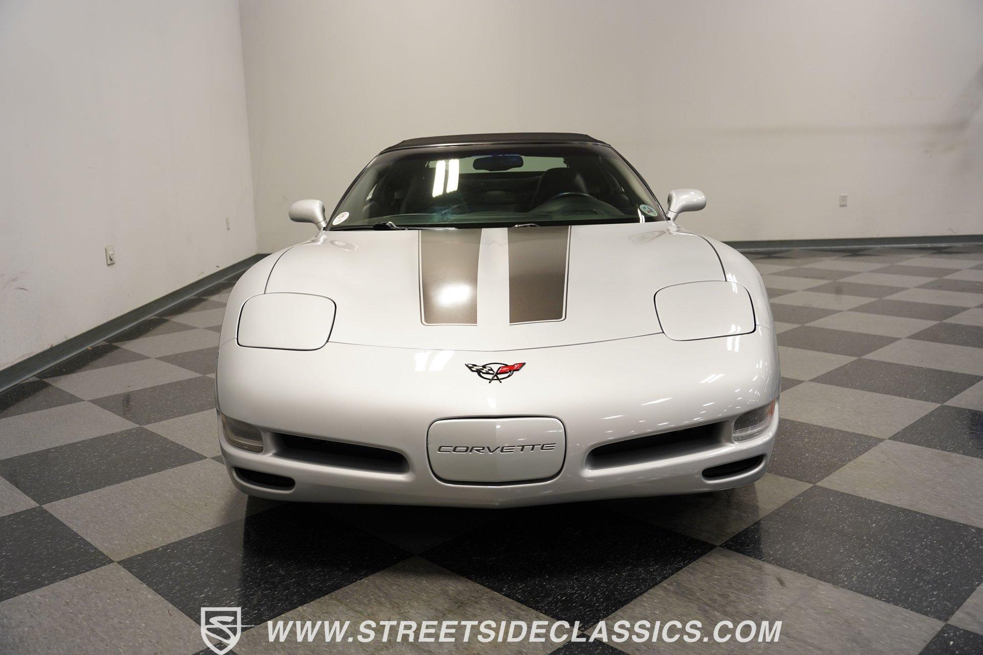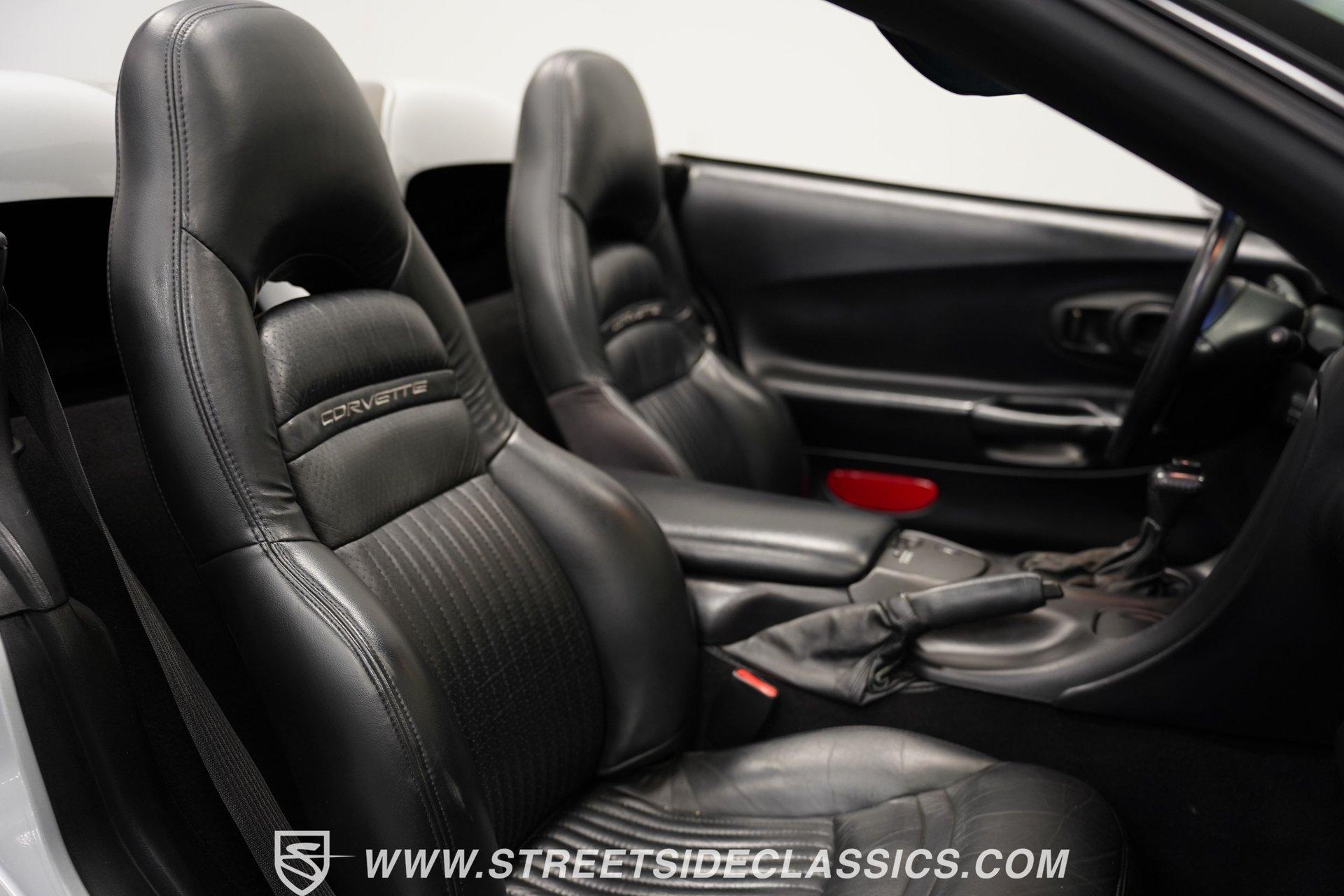 Sleek curves and aerodynamic lines flow across this 2000 Chevrolet Corvette Convertible in its Silver Metallic finish. Custom decal stripes run along this sports car, adding a personalized racing-inspired accent against this silver background. When adventure calls, this black cloth convertible top folds away for an open-air driving experience. Chrome wheels - 17 inches up front and 18 inches in the rear - give this Corvette a well-planted look. Wide 245/45ZR17 front and 275/40ZR18 rear tires connect firmly with the pavement, highlighting this vehicle's performance capabilities. This black vinyl interior offers a driver-centric layout with excellent visibility. Bucket seats provide lateral support during cornering while remaining comfortable for longer trips. A floor shifter mounted on this center console puts gear selection at your fingertips. This heads-up display projects important information directly on this windshield for easy viewing. Additional interior amenities include power windows, locks, and seats, plus air conditioning and an AM/FM CD player. This 5.7L LS1 V8 engine sits up front, an aluminum block powerhouse mated to a 4-speed automatic 4L60E transmission and dual exhaust system with aftermarket mufflers. This chassis features coil springs with shocks up front and a mono leaf spring rear suspension setup. Handling remains precise thanks to power steering, while stopping power comes from four-wheel power disc brakes with anti-lock capability. HIGHLIGHTS: 5.7L LS1 V8 Engine 4-Speed Automatic Transmission (4L60E) Electronic Fuel Injection Power Disc Brakes Dual Exhaust with Aftermarket Mufflers Front Suspension: Coils with Shocks Silver Metallic Paint Custom Decal Stripes 17" Front, 18" Rear Chrome Wheels 245/45ZR17 Front, 275/40ZR18 Rear Tires Black Cloth Convertible Top Glass Rear Window Black Interior with Power Bucket Seats Power Windows, Locks Tilt Wheel Power Steering Heads-Up Display Air Conditioning Cruise Control AM/FM Single CD Player Floor Shifter Anti-Theft System Driver and Passenger Airbags Owner's Manual Wheel Lock Maintenance Records Only 63,397 actual miles on this odometer makes this 2000 Chevrolet Corvette Convertible even more desirable. This combination of V8 power, automatic transmission, and convertible top offers year-round fun and performance. Call today!