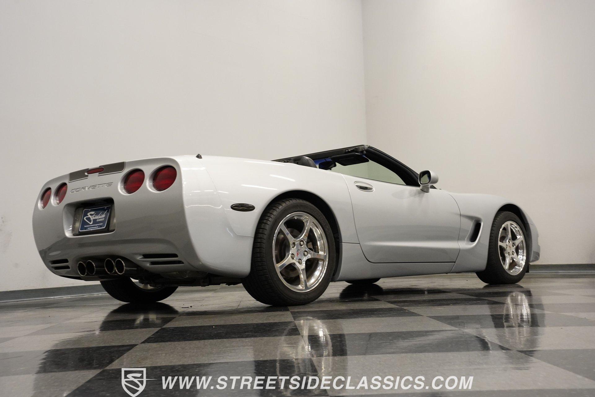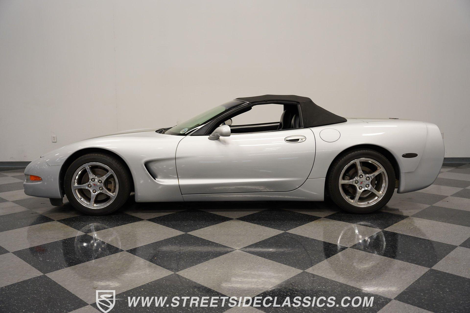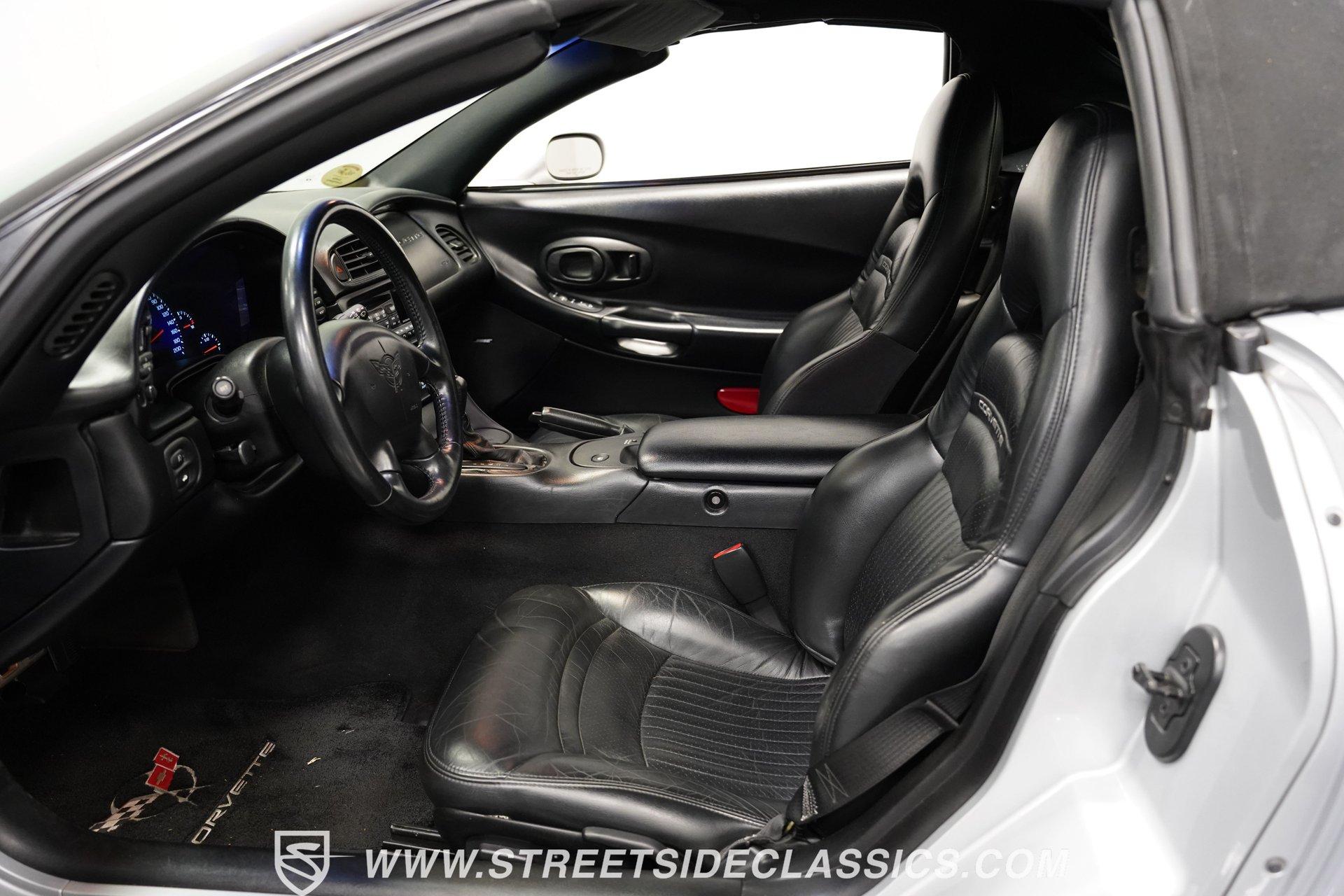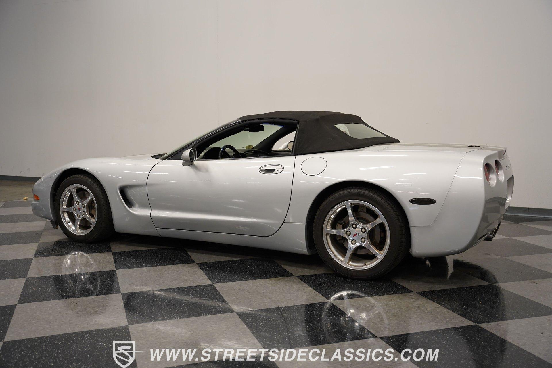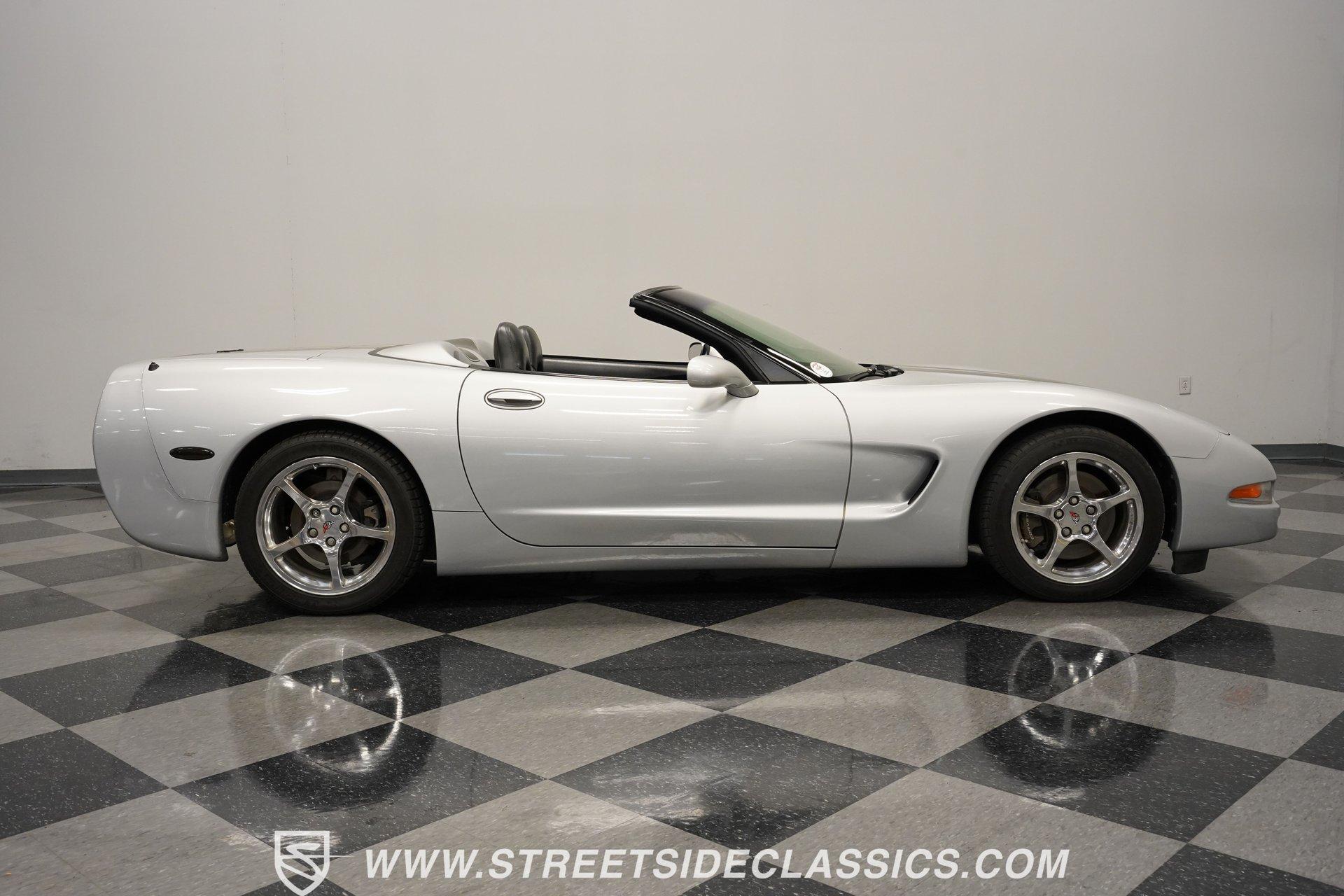 Sleek curves and aerodynamic lines flow across this 2000 Chevrolet Corvette Convertible in its Silver Metallic finish. Custom decal stripes run along this sports car, adding a personalized racing-inspired accent against this silver background. When adventure calls, this black cloth convertible top folds away for an open-air driving experience. Chrome wheels - 17 inches up front and 18 inches in the rear - give this Corvette a well-planted look. Wide 245/45ZR17 front and 275/40ZR18 rear tires connect firmly with the pavement, highlighting this vehicle's performance capabilities. This black vinyl interior offers a driver-centric layout with excellent visibility. Bucket seats provide lateral support during cornering while remaining comfortable for longer trips. A floor shifter mounted on this center console puts gear selection at your fingertips. This heads-up display projects important information directly on this windshield for easy viewing. Additional interior amenities include power windows, locks, and seats, plus air conditioning and an AM/FM CD player. This 5.7L LS1 V8 engine sits up front, an aluminum block powerhouse mated to a 4-speed automatic 4L60E transmission and dual exhaust system with aftermarket mufflers. This chassis features coil springs with shocks up front and a mono leaf spring rear suspension setup. Handling remains precise thanks to power steering, while stopping power comes from four-wheel power disc brakes with anti-lock capability. HIGHLIGHTS: 5.7L LS1 V8 Engine 4-Speed Automatic Transmission (4L60E) Electronic Fuel Injection Power Disc Brakes Dual Exhaust with Aftermarket Mufflers Front Suspension: Coils with Shocks Silver Metallic Paint Custom Decal Stripes 17" Front, 18" Rear Chrome Wheels 245/45ZR17 Front, 275/40ZR18 Rear Tires Black Cloth Convertible Top Glass Rear Window Black Interior with Power Bucket Seats Power Windows, Locks Tilt Wheel Power Steering Heads-Up Display Air Conditioning Cruise Control AM/FM Single CD Player Floor Shifter Anti-Theft System Driver and Passenger Airbags Owner's Manual Wheel Lock Maintenance Records Only 63,397 actual miles on this odometer makes this 2000 Chevrolet Corvette Convertible even more desirable. This combination of V8 power, automatic transmission, and convertible top offers year-round fun and performance. Call today!