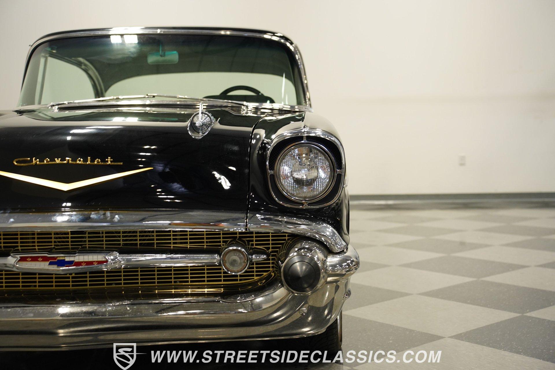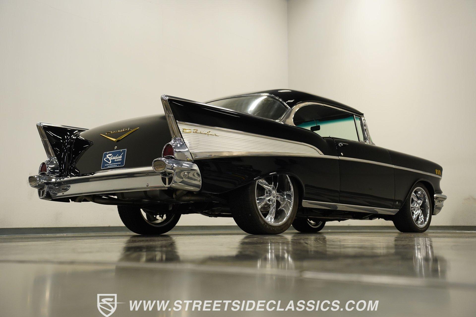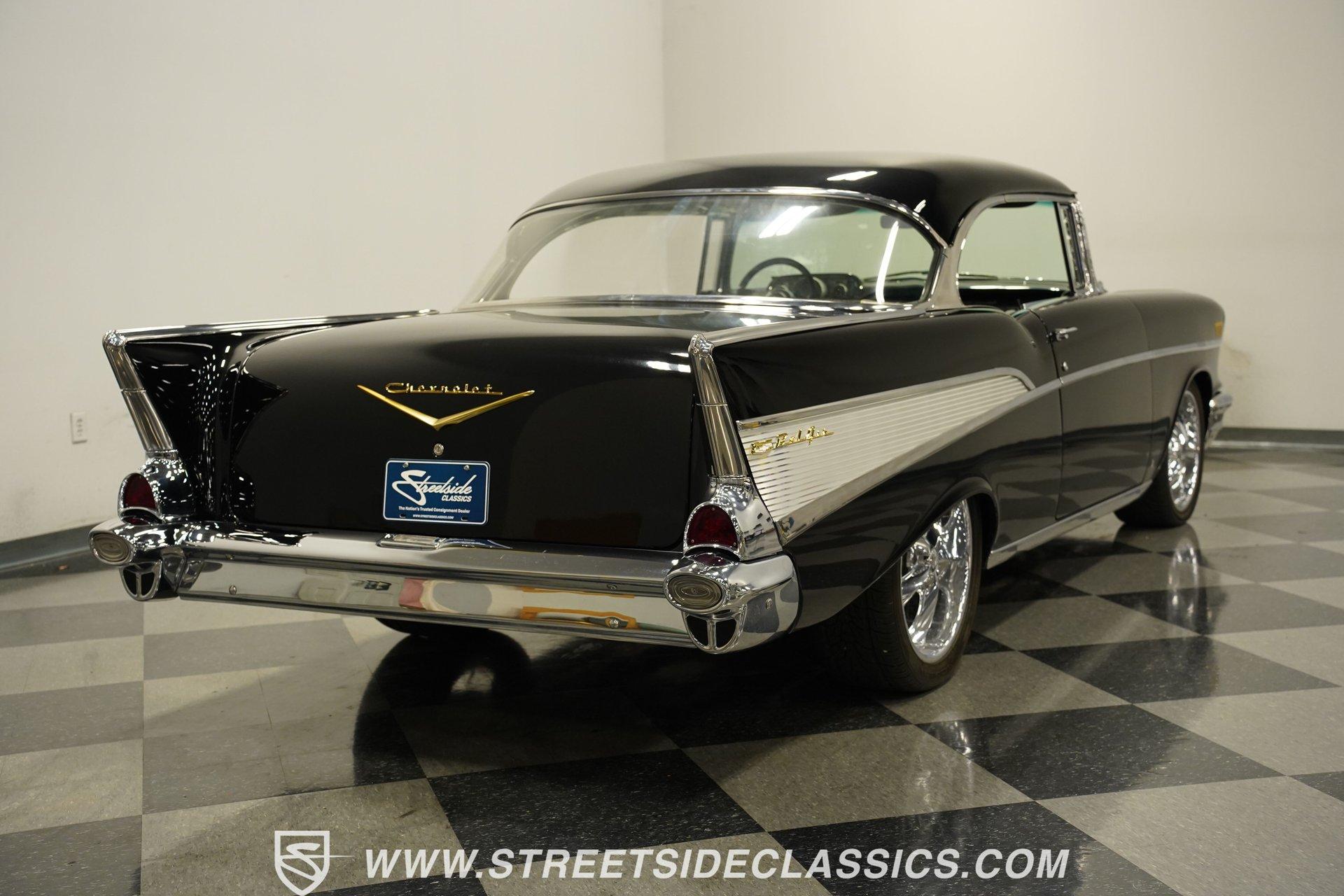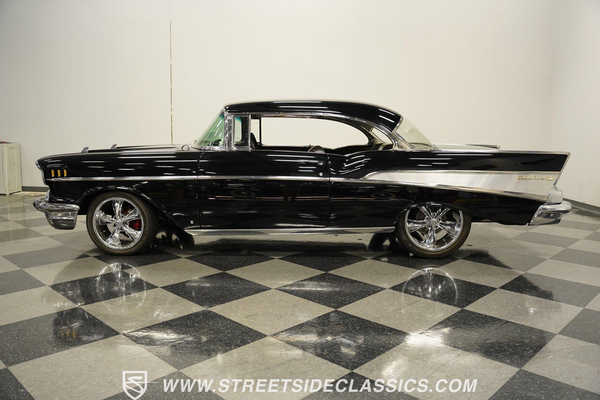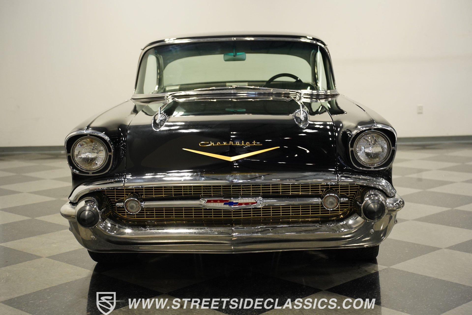 One of America's most celebrated Tri-Five Chevys, this 1957 Chevrolet Bel Air Hard Top comes dressed in Onyx Black with India Ivory accents. Chrome bumpers and bright work add depth to the two-tone color scheme, while the low-riding profile creates a lasting impression. Modified with a 2-inch drop in the rear, this Bel Air rolls on staggered Foose wheels - 18 inches up front and 20 inches in the rear, wrapped in 245/40ZR18 front and 275/40R20 rear tires. Inside, a full replacement gray interior blends classic style with modern touches. The two-tone gray vinyl and cloth split-bench seat provides ample room for long drives with passengers. A gray-painted dash displays gauges with excellent clarity, complemented by an aftermarket steering wheel for improved grip and control. The floor-mounted shifter for the 4-speed manual transmission sits within easy reach, and the AM radio remains in place for that authentic sound. A 383 Stroker V8 produces substantial power, appearing as a fresh build with minimal miles. A Holley 4-barrel carburetor manages fuel delivery, while Sanderson shorty headers feed into a dual exhaust system for improved breathing. The Borg Warner T10 4-speed manual transmission transfers power to the factory rear end. Handling benefits from tubular upper and lower CPP control arms, new steering components, ball joints, and body bushings, while power disc brakes up front give you plenty of stopping power. HIGHLIGHTS: 383 Stroker V8 Engine Holley 4-Barrel Carburetor Borg Warner T10 4-Speed Manual Transmission Sanderson Shorty Headers Dual Exhaust System Power Front Disc Brakes Tubular Upper and Lower CPP Control Arms New Steering Components and Ball Joints New Body Bushings Updated Radiator with Electric Fan CPP Steering Box Onyx Black with India Ivory Two-Tone Paint 18" Front, 20" Rear Foose Wheels 245/40ZR18 Front, 275/40R20 Rear Tires Chrome Bumpers Bright Work Trim Rear Lowered Approximately 2 Inches Two-Tone Gray Interior with Split-Bench Seat Gray-Painted Dash Clear Gauges Floor Shifter Aftermarket Steering Wheel AM Radio Power Steering Tilt Wheel From the 383 Stroker V8 to the 4-speed manual transmission and upgraded suspension, this 1957 Chevrolet Bel Air Hard Top combines classic American style with modern performance upgrades for a truly unique driving machine. Call today!