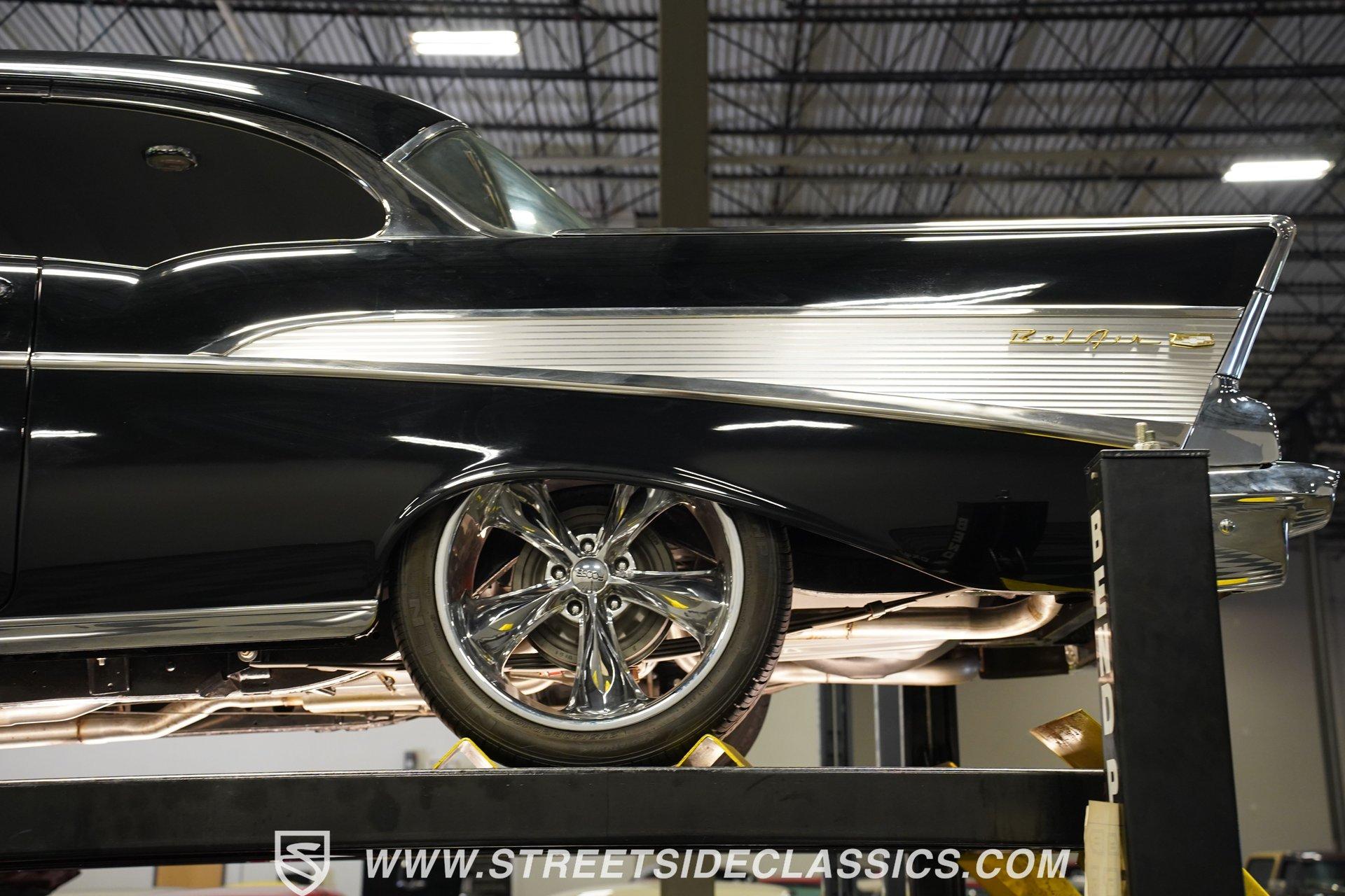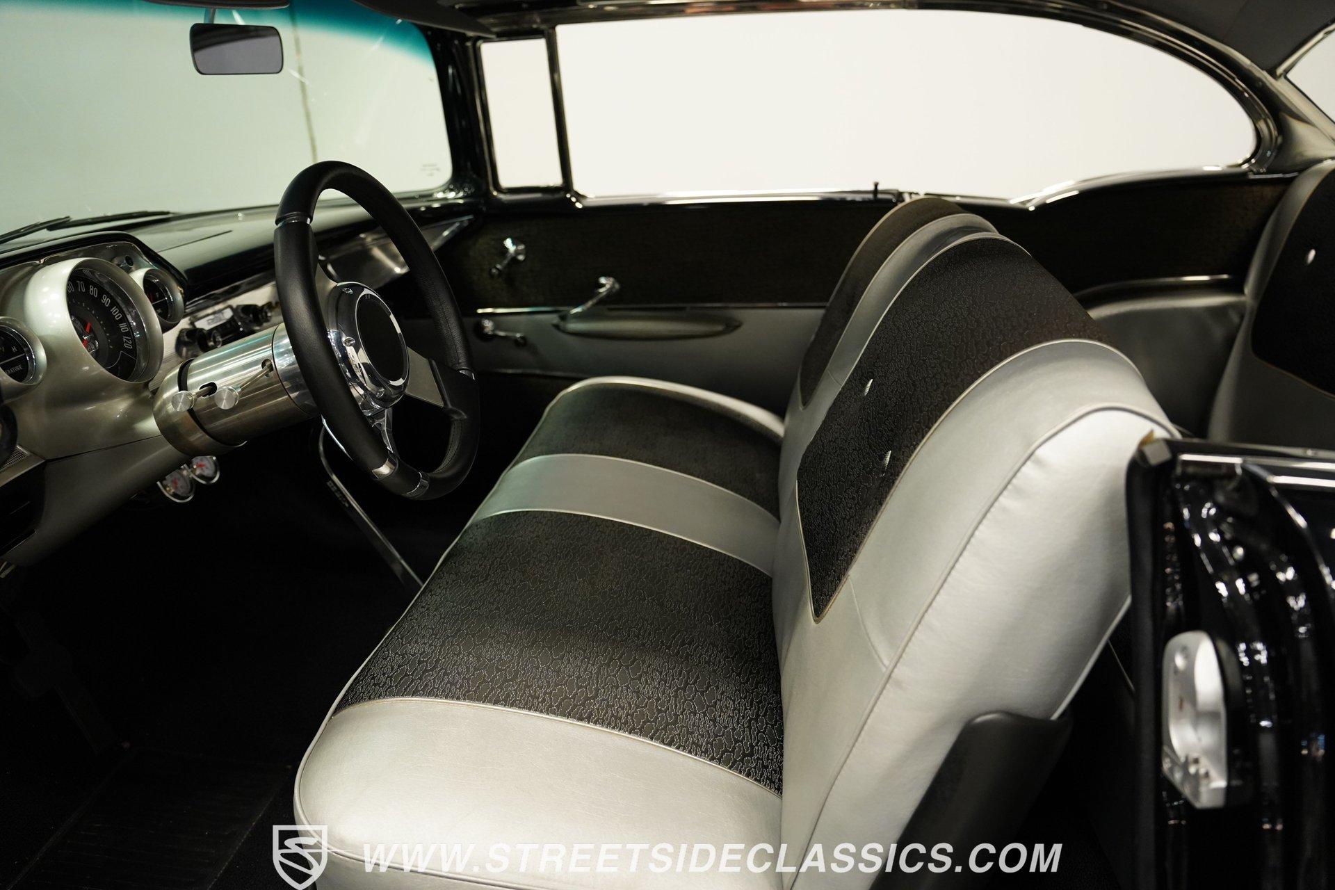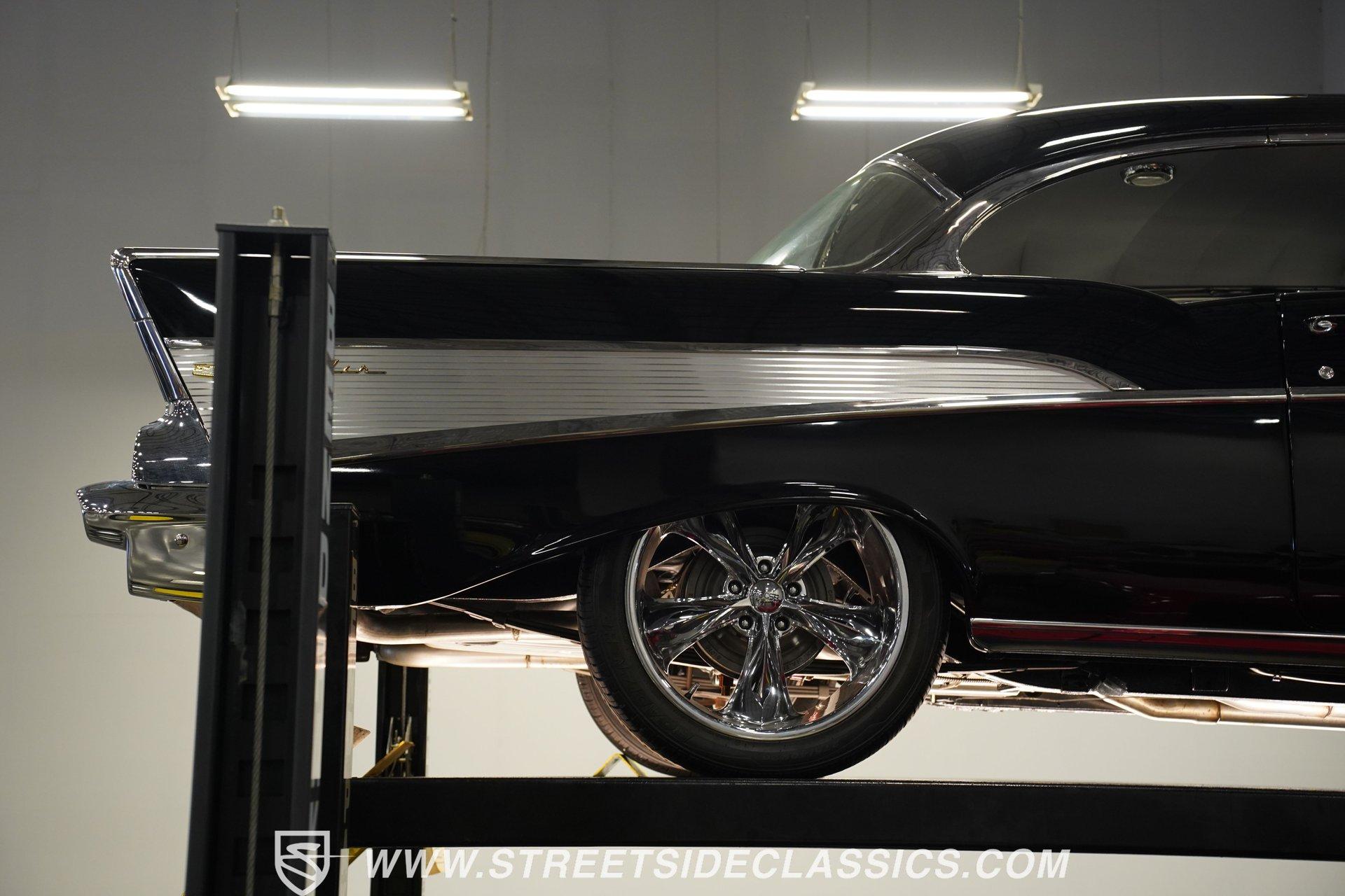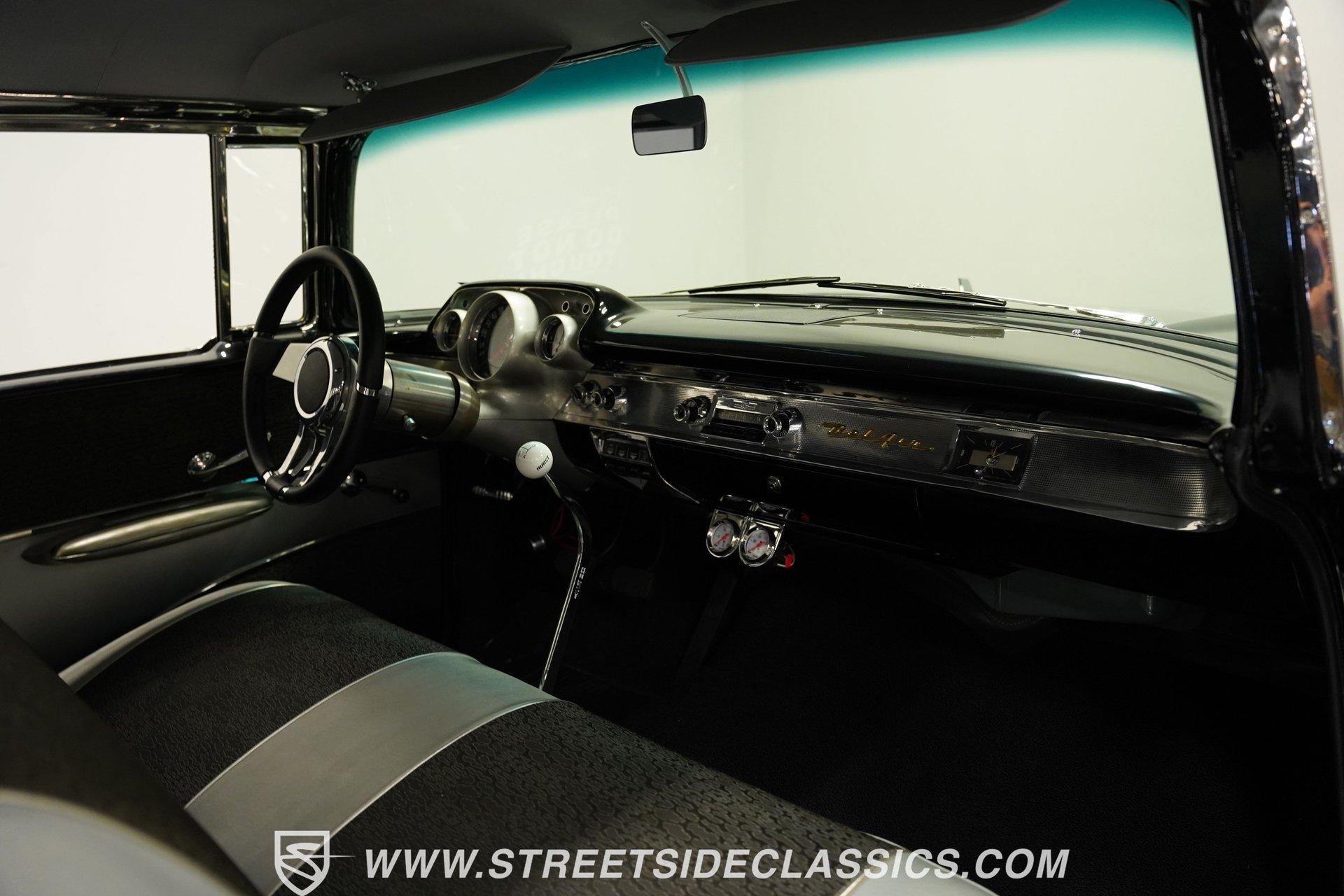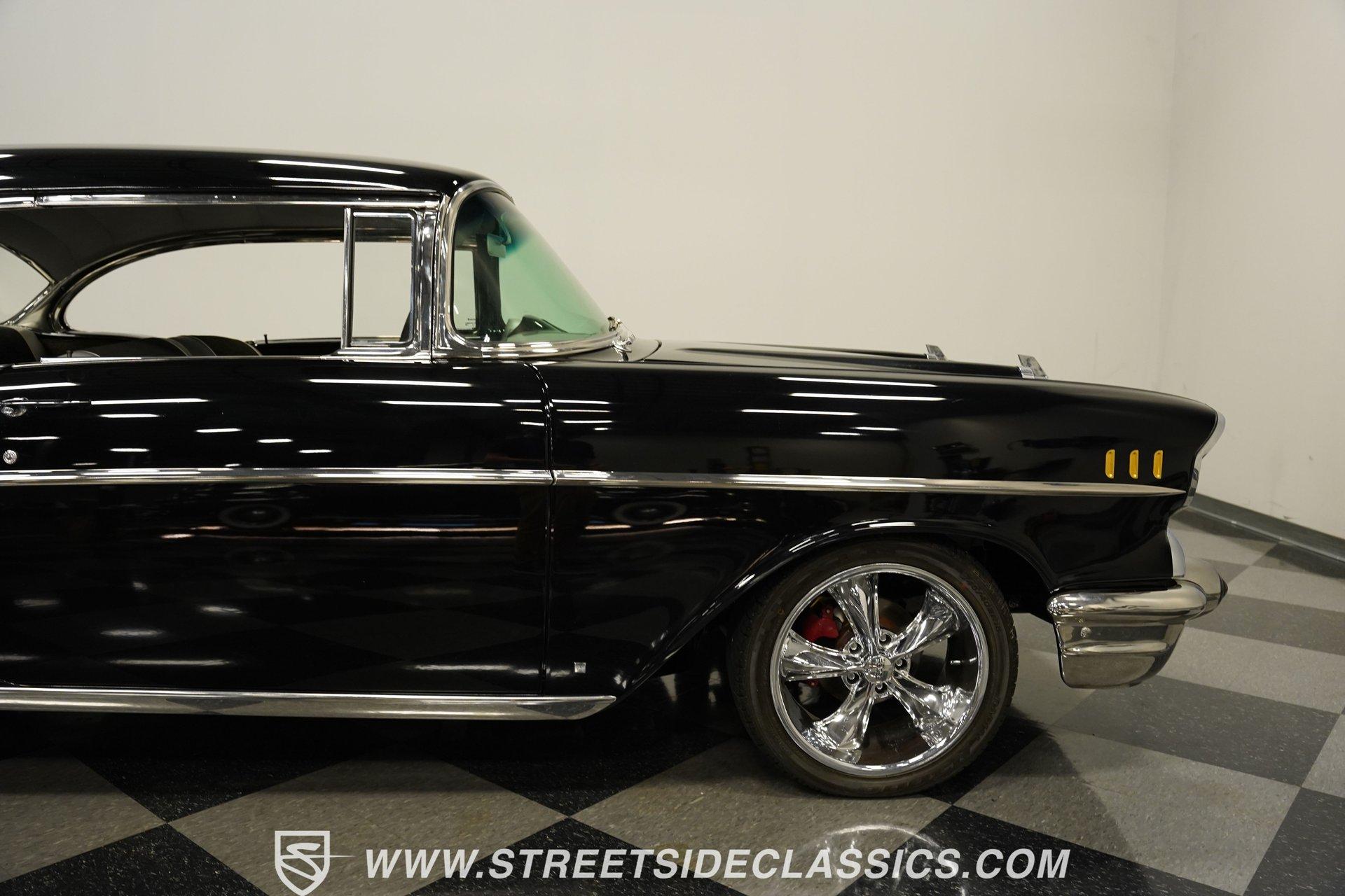 One of America's most celebrated Tri-Five Chevys, this 1957 Chevrolet Bel Air Hard Top comes dressed in Onyx Black with India Ivory accents. Chrome bumpers and bright work add depth to the two-tone color scheme, while the low-riding profile creates a lasting impression. Modified with a 2-inch drop in the rear, this Bel Air rolls on staggered Foose wheels - 18 inches up front and 20 inches in the rear, wrapped in 245/40ZR18 front and 275/40R20 rear tires. Inside, a full replacement gray interior blends classic style with modern touches. The two-tone gray vinyl and cloth split-bench seat provides ample room for long drives with passengers. A gray-painted dash displays gauges with excellent clarity, complemented by an aftermarket steering wheel for improved grip and control. The floor-mounted shifter for the 4-speed manual transmission sits within easy reach, and the AM radio remains in place for that authentic sound. A 383 Stroker V8 produces substantial power, appearing as a fresh build with minimal miles. A Holley 4-barrel carburetor manages fuel delivery, while Sanderson shorty headers feed into a dual exhaust system for improved breathing. The Borg Warner T10 4-speed manual transmission transfers power to the factory rear end. Handling benefits from tubular upper and lower CPP control arms, new steering components, ball joints, and body bushings, while power disc brakes up front give you plenty of stopping power. HIGHLIGHTS: 383 Stroker V8 Engine Holley 4-Barrel Carburetor Borg Warner T10 4-Speed Manual Transmission Sanderson Shorty Headers Dual Exhaust System Power Front Disc Brakes Tubular Upper and Lower CPP Control Arms New Steering Components and Ball Joints New Body Bushings Updated Radiator with Electric Fan CPP Steering Box Onyx Black with India Ivory Two-Tone Paint 18" Front, 20" Rear Foose Wheels 245/40ZR18 Front, 275/40R20 Rear Tires Chrome Bumpers Bright Work Trim Rear Lowered Approximately 2 Inches Two-Tone Gray Interior with Split-Bench Seat Gray-Painted Dash Clear Gauges Floor Shifter Aftermarket Steering Wheel AM Radio Power Steering Tilt Wheel From the 383 Stroker V8 to the 4-speed manual transmission and upgraded suspension, this 1957 Chevrolet Bel Air Hard Top combines classic American style with modern performance upgrades for a truly unique driving machine. Call today!