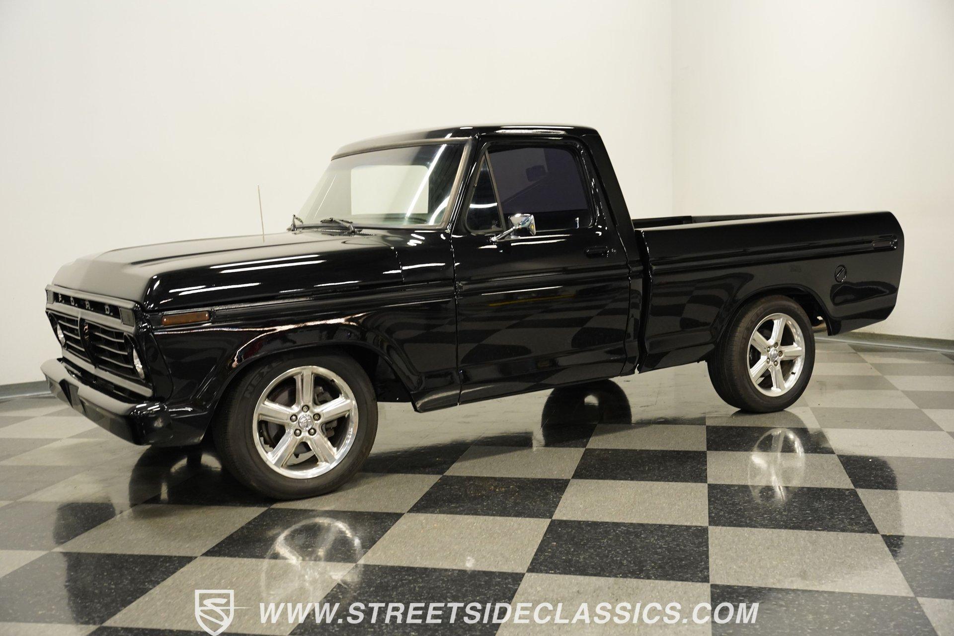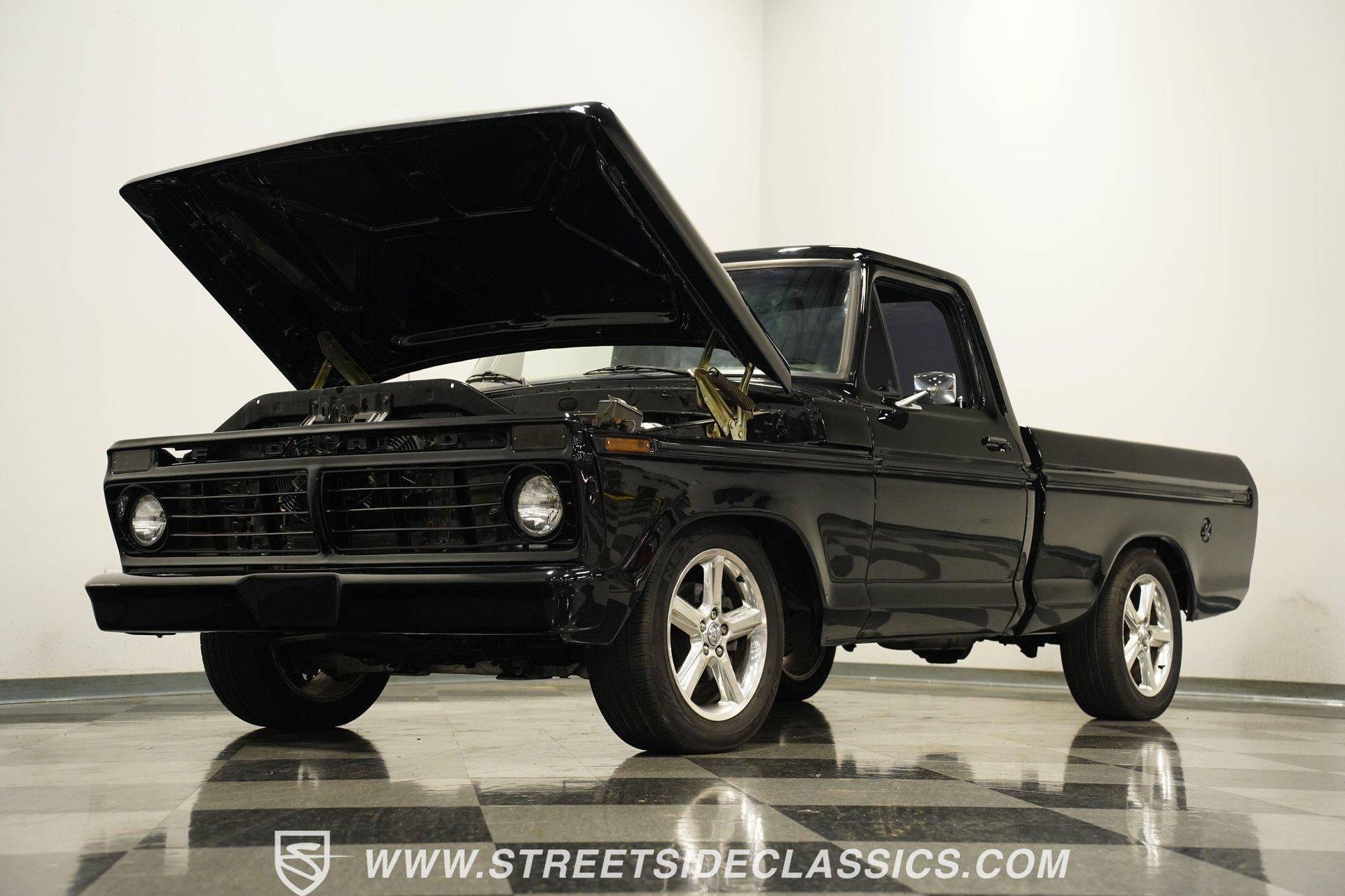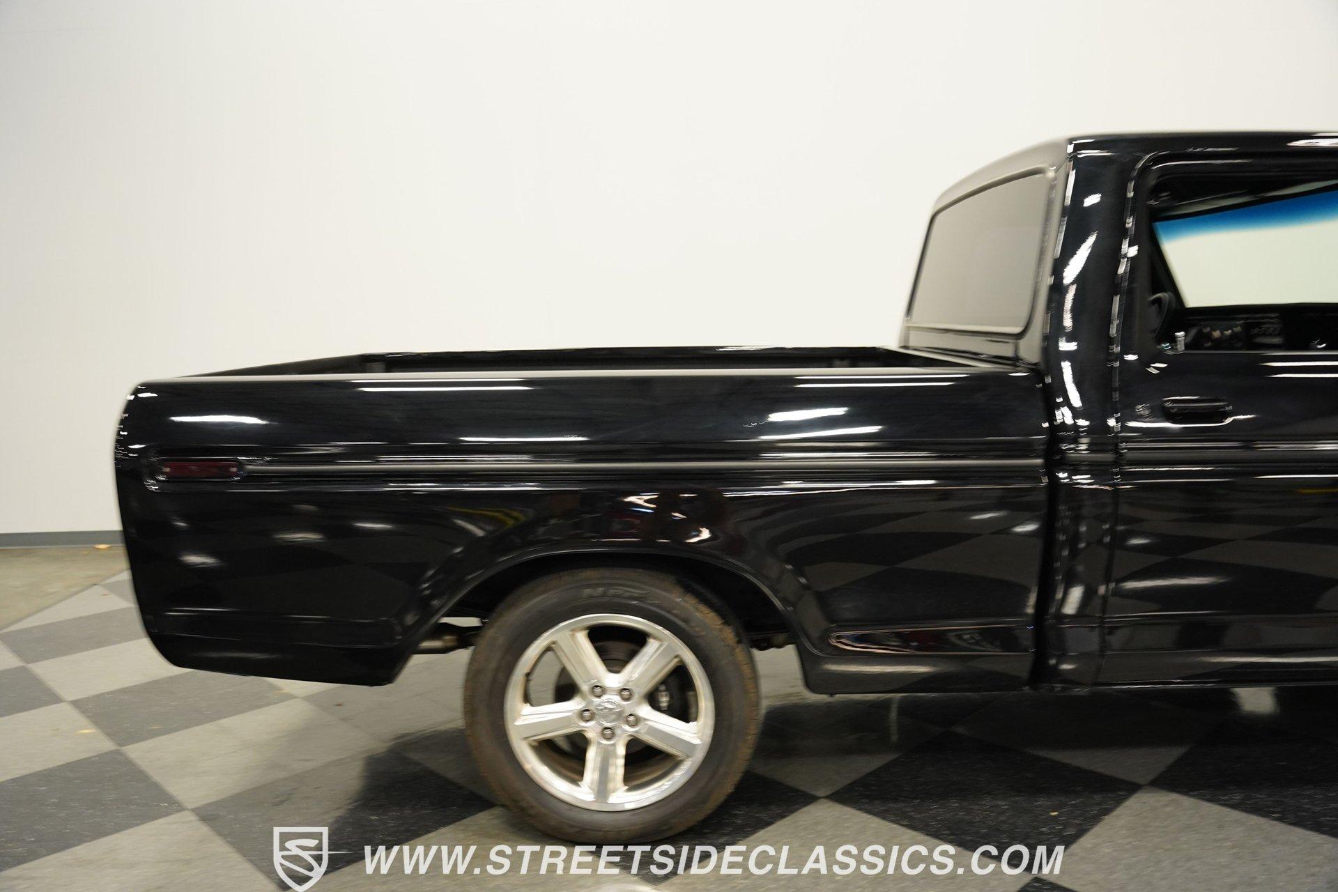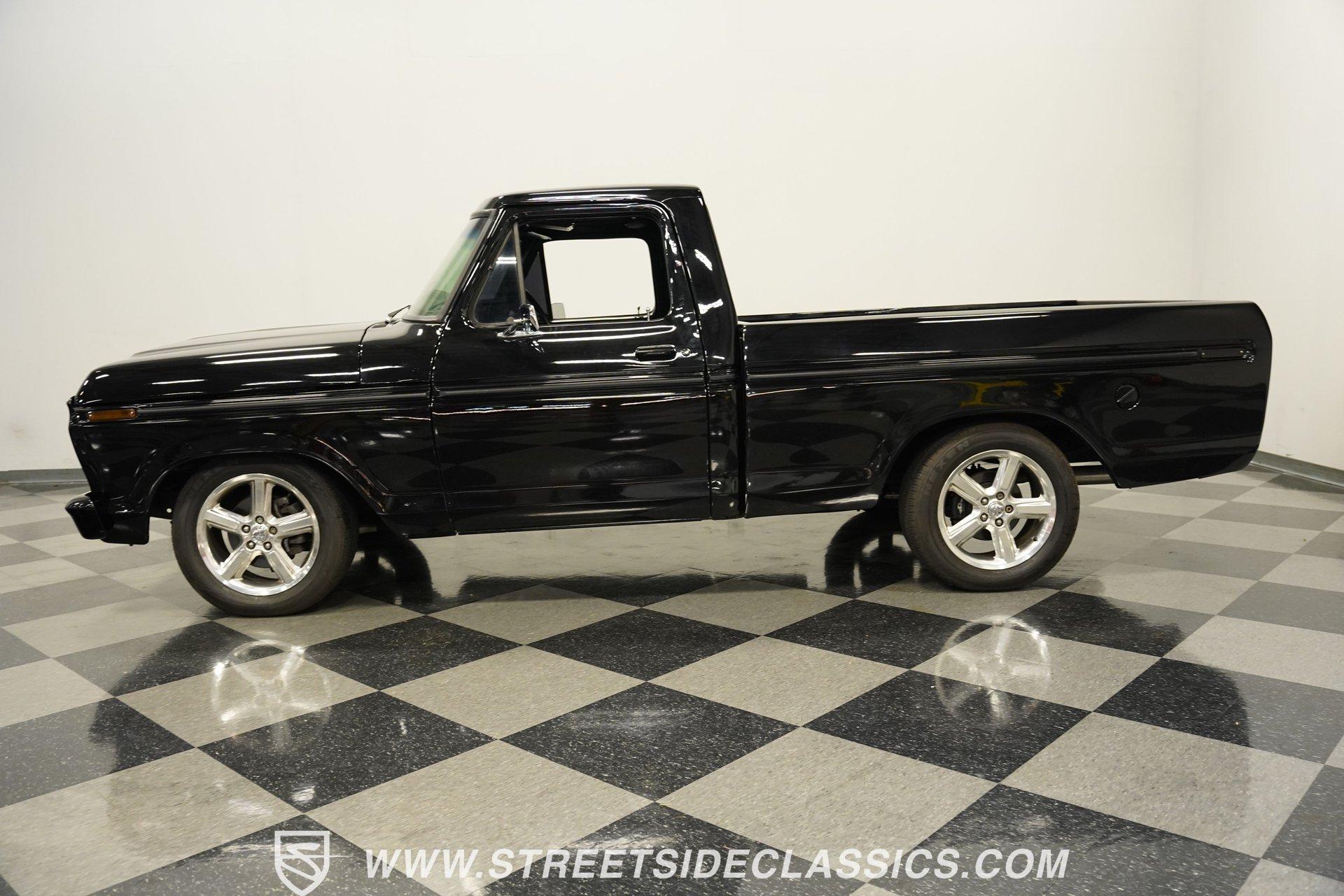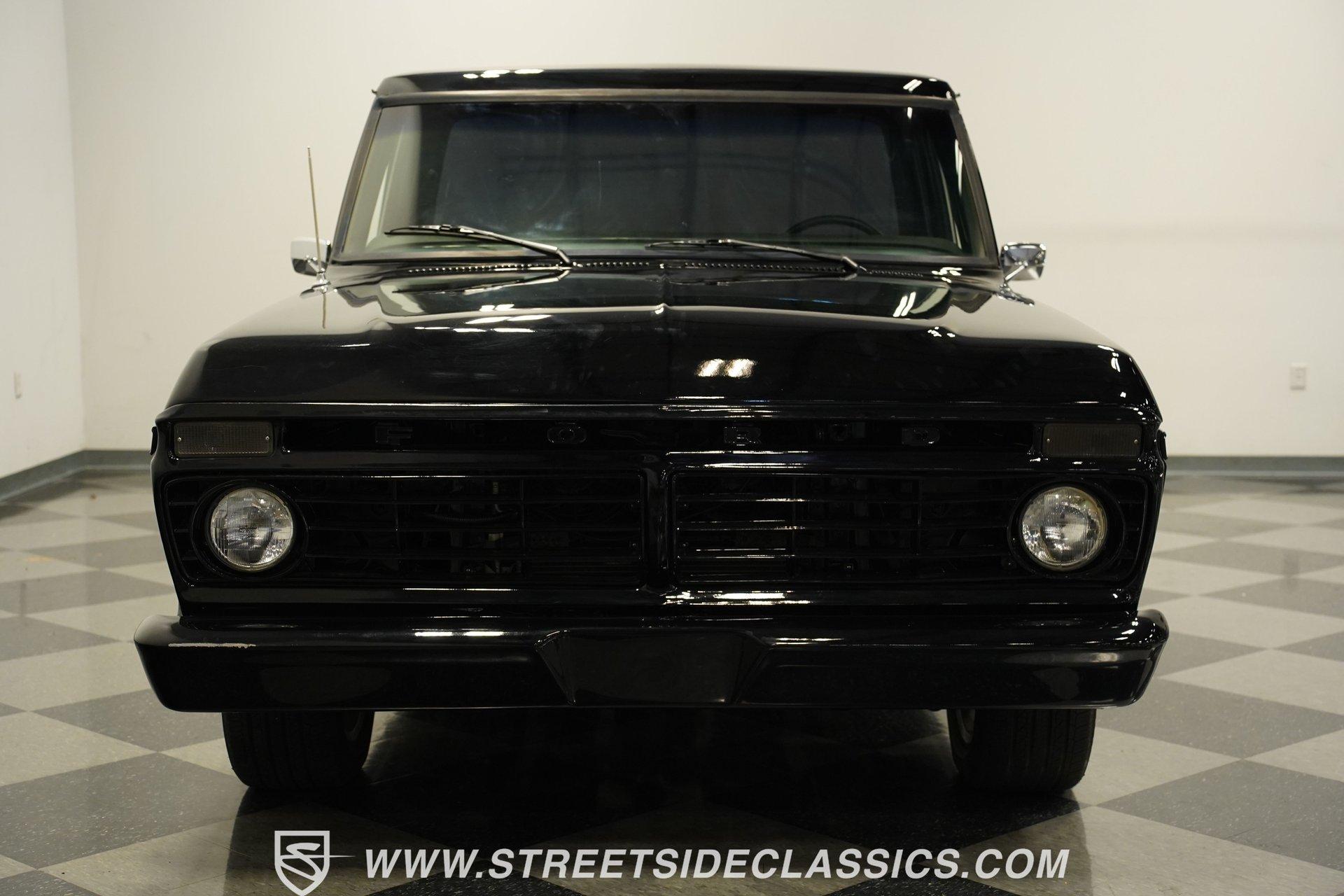 Midnight black from front to back, the 1975 Ford F-100 Restomod got a full makeover with a deep black paint job. Blacked out grille, painted bumpers, and darkened emblems create a complete blackout look that works exceptionally well on Ford's classic pickup design. Tinted windows add an extra layer of darkness to the overall appearance. 18" wheels and P245/55R18 tires give this F-100 an updated stance while maintaining the truck's tough character. Black vinyl wraps the bench seat and continues throughout the cabin for a factory-correct appearance. The dash shows excellent upkeep with zero cracks and a clean layout. Aftermarket gaugage placement gives the driver all necessary information at a glance. A JVC AM/FM/AUX stereo tucked away in the headliner adds modern audio capability without changing the original dashboard configuration. The floor-mounted shifter controls the four-speed automatic transmission with ease. A 4.6 liter 3-valve V8 engine sits in a clean engine bay, offering substantial power for this classic pickup. Holley Terminator electronic fuel injection improves starting, idle quality, and overall drivability compared to a carburetor. The AOD four-speed automatic transmission handles the power distribution. Mercury Marauder front-end components upgrade the handling characteristics. Four-wheel power disc brakes stop this truck with authority. Power steering is included for better control during all driving situations. HIGHLIGHTS: 4.6 Liter V8 3-Valve Engine 4 Speed Automatic AOD Transmission Holley Terminator Electronic Fuel Injection Mercury Marauder Front End Four Wheel Power Disc Brakes 8.8 Rear Axle Dual Exhaust With Aftermarket Mufflers Black Full Repaint 18" Wheels P245/55R18 Tires Blacked Out Grille Black Painted Bumpers Blacked Out Emblems And Trim Tinted Windows Black Interior With Bench Seat Clean Dash And Door Panels Aftermarket Gauges Power Steering JVC AM/FM/AUX Stereo In Headliner Floor Shifter Classic looks and modern muscle come together in this 1975 Ford F-100 Restomod. The 4.6L V8 engine and four-speed automatic transmission make for an excellent driving truck while the black-on-black color scheme gives it a tough, custom look that will never go out of style. Call today!