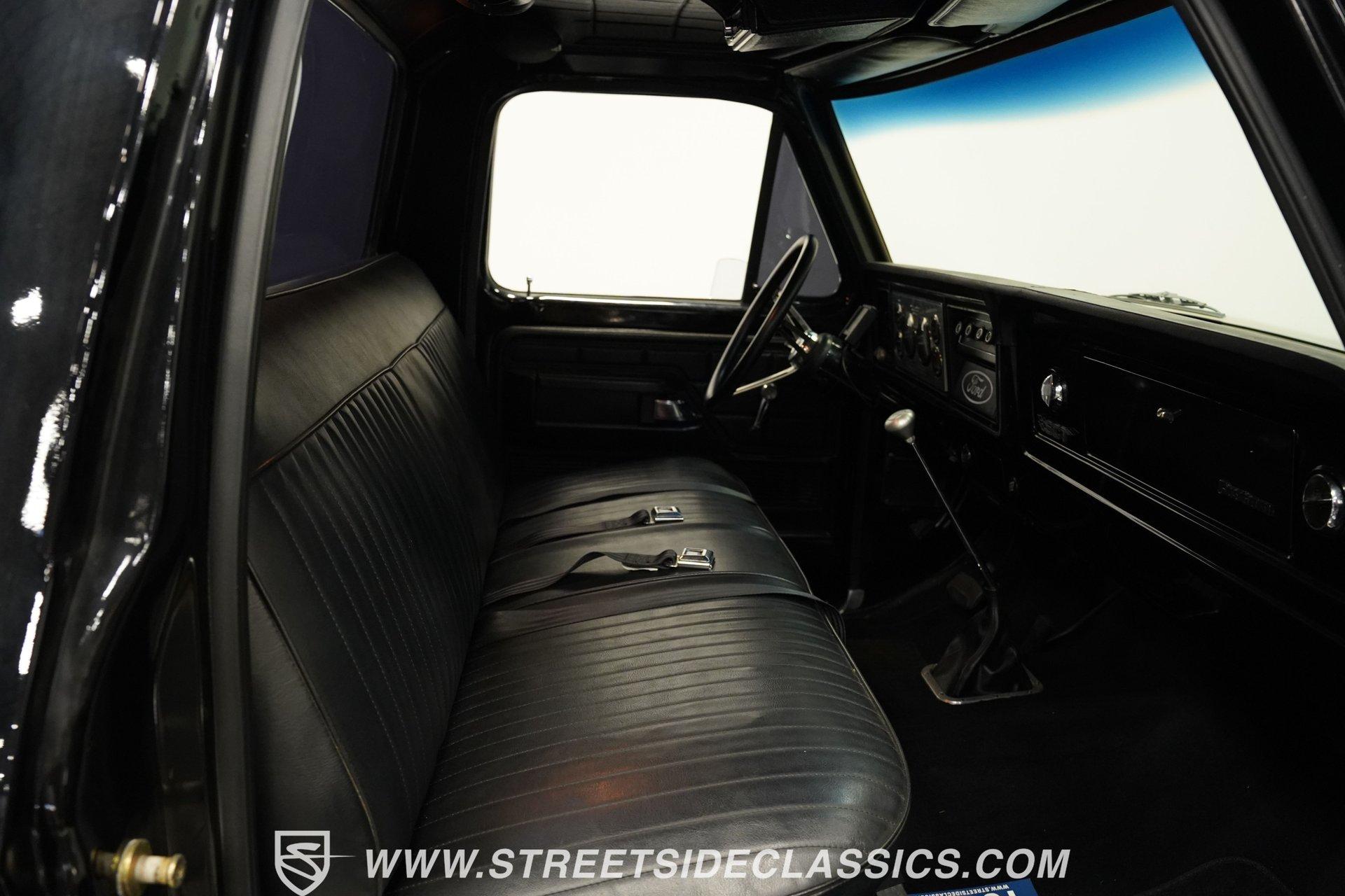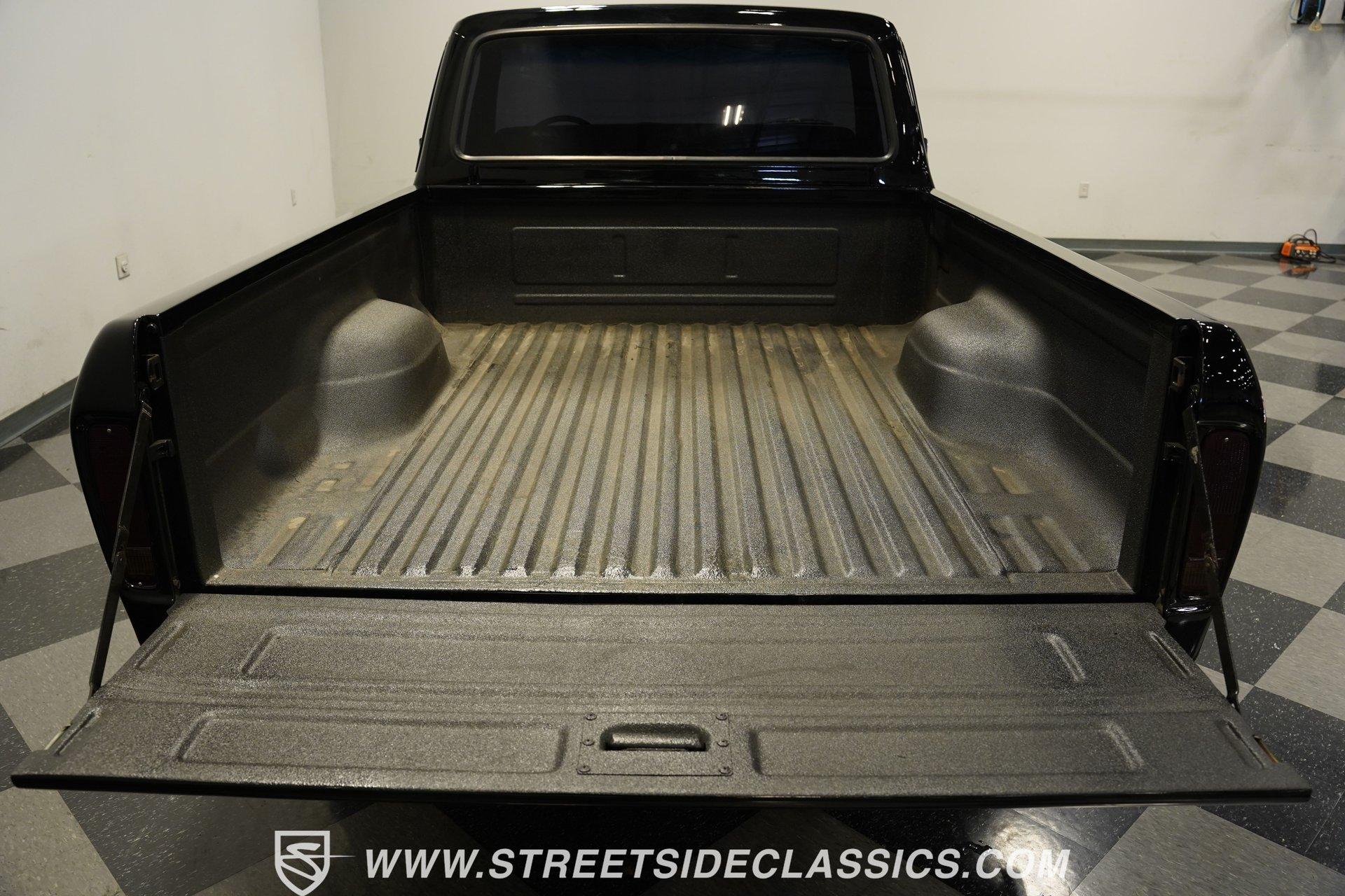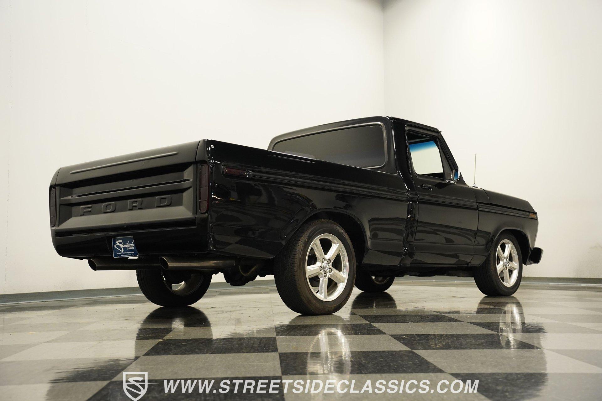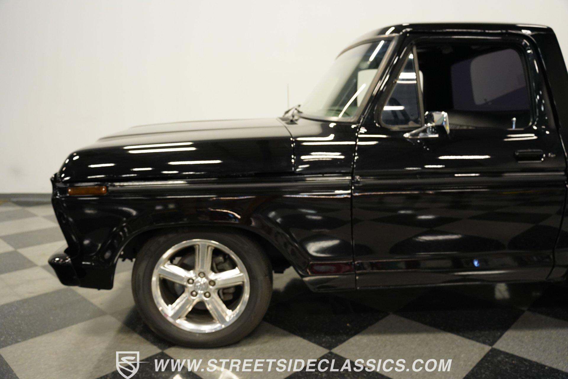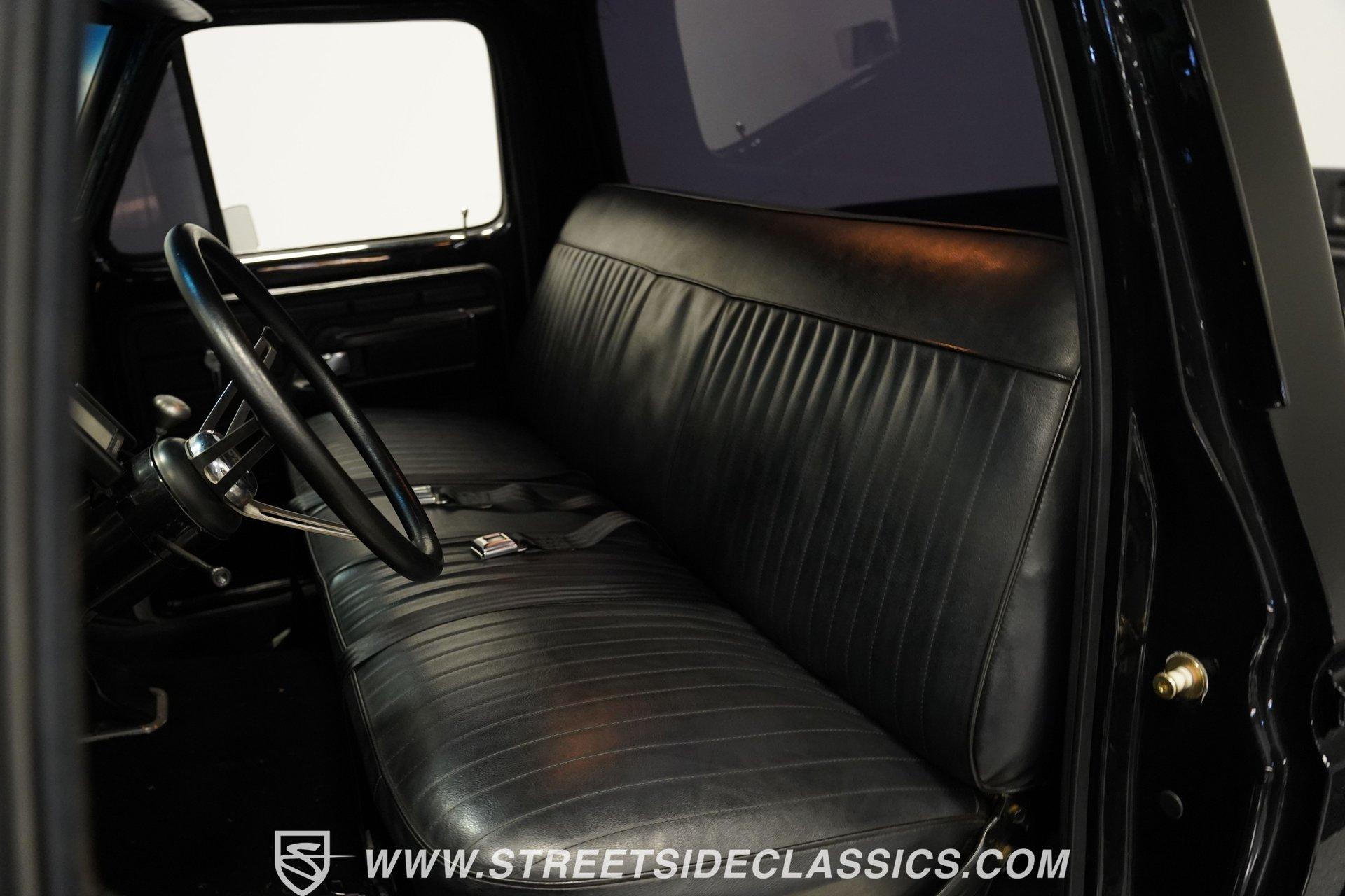 Midnight black from front to back, the 1975 Ford F-100 Restomod got a full makeover with a deep black paint job. Blacked out grille, painted bumpers, and darkened emblems create a complete blackout look that works exceptionally well on Ford's classic pickup design. Tinted windows add an extra layer of darkness to the overall appearance. 18" wheels and P245/55R18 tires give this F-100 an updated stance while maintaining the truck's tough character. Black vinyl wraps the bench seat and continues throughout the cabin for a factory-correct appearance. The dash shows excellent upkeep with zero cracks and a clean layout. Aftermarket gaugage placement gives the driver all necessary information at a glance. A JVC AM/FM/AUX stereo tucked away in the headliner adds modern audio capability without changing the original dashboard configuration. The floor-mounted shifter controls the four-speed automatic transmission with ease. A 4.6 liter 3-valve V8 engine sits in a clean engine bay, offering substantial power for this classic pickup. Holley Terminator electronic fuel injection improves starting, idle quality, and overall drivability compared to a carburetor. The AOD four-speed automatic transmission handles the power distribution. Mercury Marauder front-end components upgrade the handling characteristics. Four-wheel power disc brakes stop this truck with authority. Power steering is included for better control during all driving situations. HIGHLIGHTS: 4.6 Liter V8 3-Valve Engine 4 Speed Automatic AOD Transmission Holley Terminator Electronic Fuel Injection Mercury Marauder Front End Four Wheel Power Disc Brakes 8.8 Rear Axle Dual Exhaust With Aftermarket Mufflers Black Full Repaint 18" Wheels P245/55R18 Tires Blacked Out Grille Black Painted Bumpers Blacked Out Emblems And Trim Tinted Windows Black Interior With Bench Seat Clean Dash And Door Panels Aftermarket Gauges Power Steering JVC AM/FM/AUX Stereo In Headliner Floor Shifter Classic looks and modern muscle come together in this 1975 Ford F-100 Restomod. The 4.6L V8 engine and four-speed automatic transmission make for an excellent driving truck while the black-on-black color scheme gives it a tough, custom look that will never go out of style. Call today!
