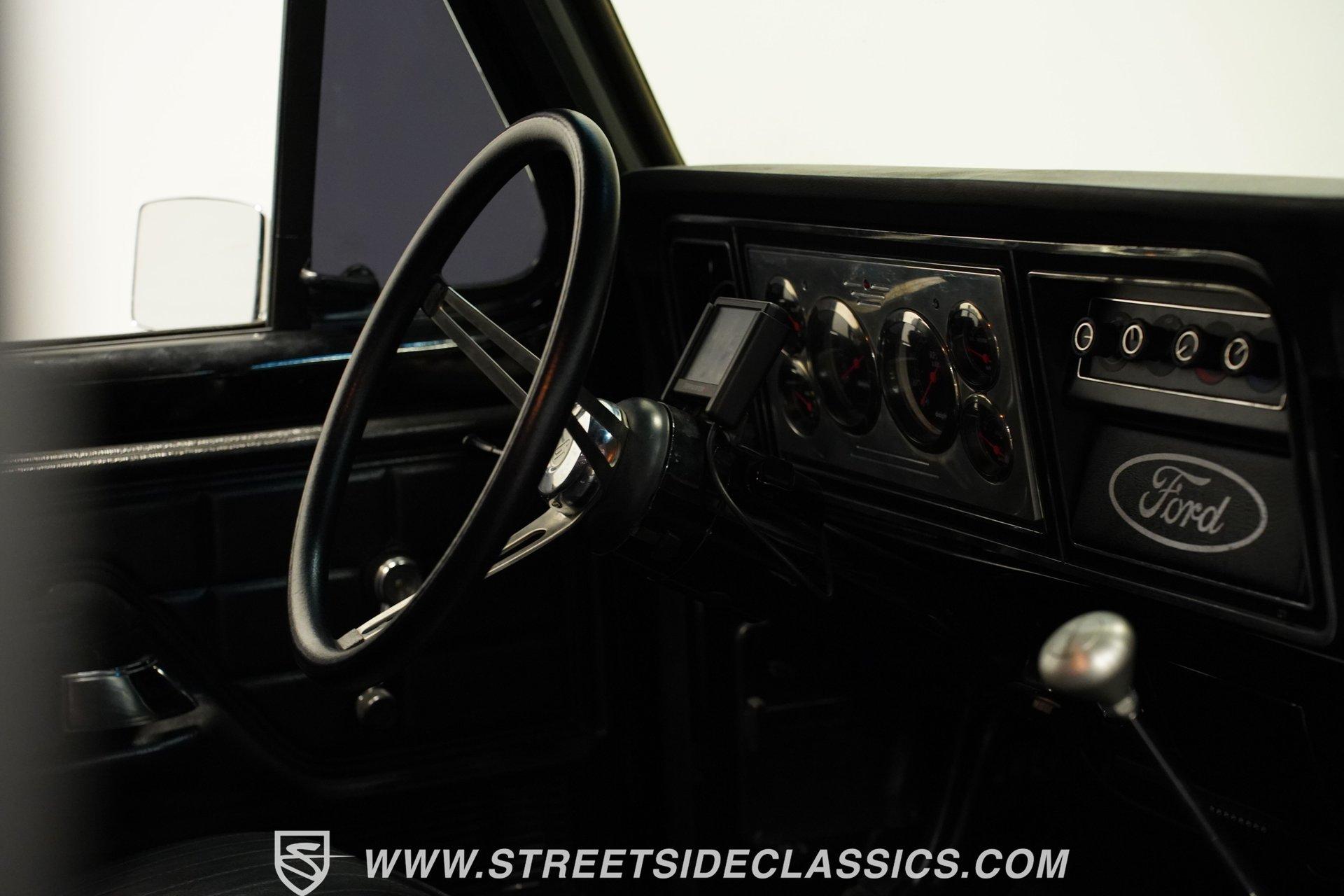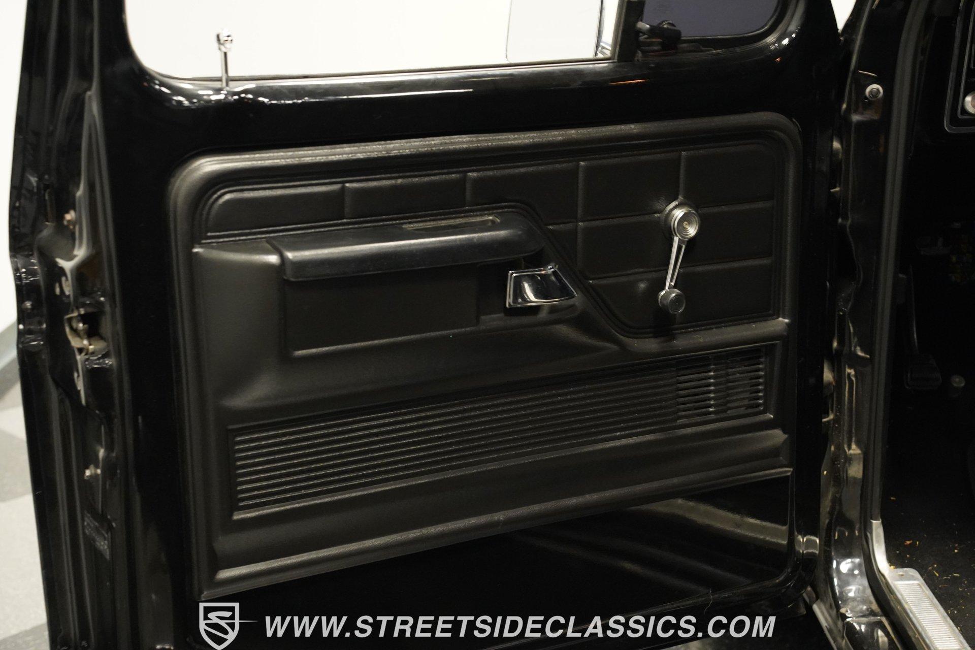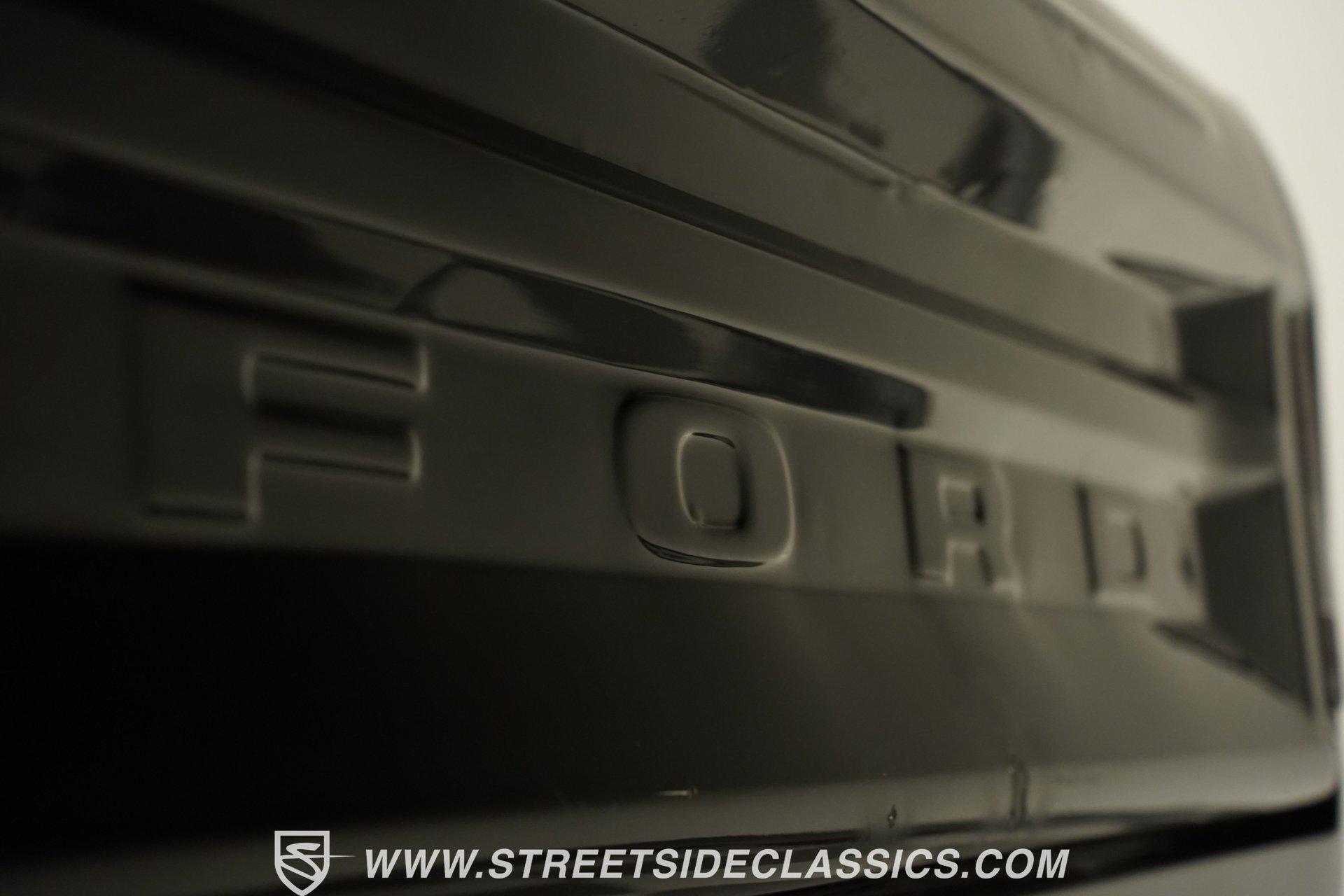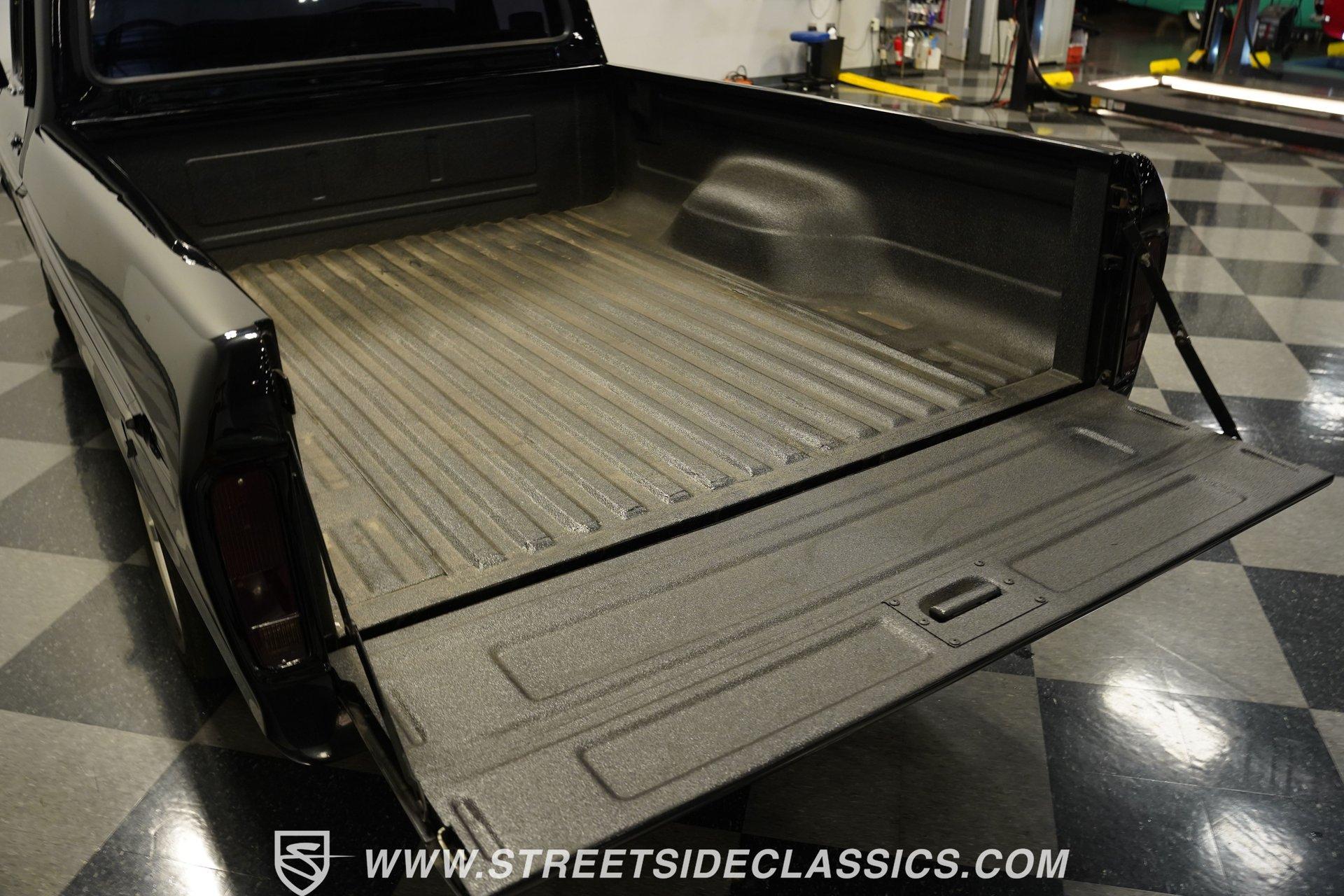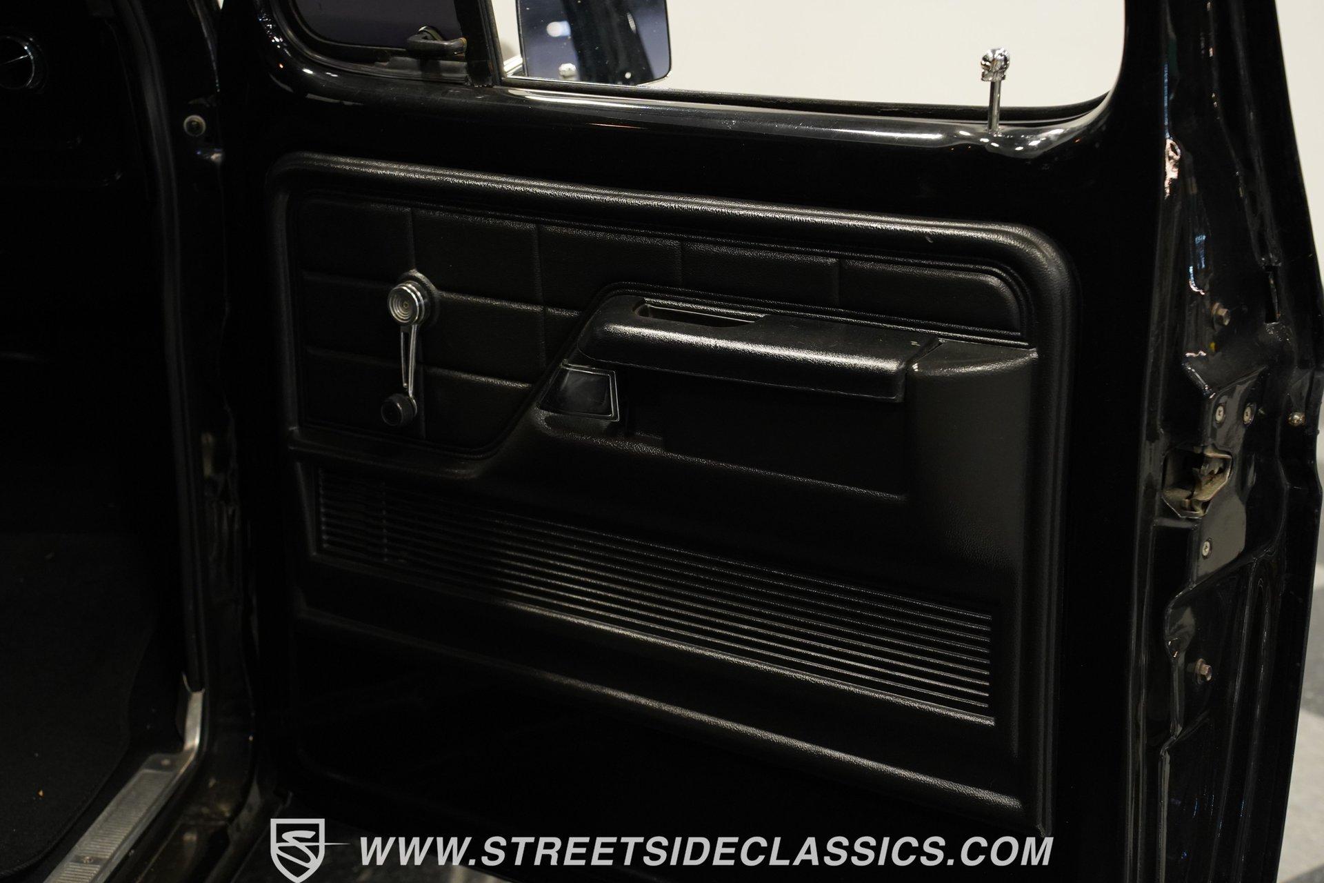 Midnight black from front to back, the 1975 Ford F-100 Restomod got a full makeover with a deep black paint job. Blacked out grille, painted bumpers, and darkened emblems create a complete blackout look that works exceptionally well on Ford's classic pickup design. Tinted windows add an extra layer of darkness to the overall appearance. 18" wheels and P245/55R18 tires give this F-100 an updated stance while maintaining the truck's tough character. Black vinyl wraps the bench seat and continues throughout the cabin for a factory-correct appearance. The dash shows excellent upkeep with zero cracks and a clean layout. Aftermarket gaugage placement gives the driver all necessary information at a glance. A JVC AM/FM/AUX stereo tucked away in the headliner adds modern audio capability without changing the original dashboard configuration. The floor-mounted shifter controls the four-speed automatic transmission with ease. A 4.6 liter 3-valve V8 engine sits in a clean engine bay, offering substantial power for this classic pickup. Holley Terminator electronic fuel injection improves starting, idle quality, and overall drivability compared to a carburetor. The AOD four-speed automatic transmission handles the power distribution. Mercury Marauder front-end components upgrade the handling characteristics. Four-wheel power disc brakes stop this truck with authority. Power steering is included for better control during all driving situations. HIGHLIGHTS: 4.6 Liter V8 3-Valve Engine 4 Speed Automatic AOD Transmission Holley Terminator Electronic Fuel Injection Mercury Marauder Front End Four Wheel Power Disc Brakes 8.8 Rear Axle Dual Exhaust With Aftermarket Mufflers Black Full Repaint 18" Wheels P245/55R18 Tires Blacked Out Grille Black Painted Bumpers Blacked Out Emblems And Trim Tinted Windows Black Interior With Bench Seat Clean Dash And Door Panels Aftermarket Gauges Power Steering JVC AM/FM/AUX Stereo In Headliner Floor Shifter Classic looks and modern muscle come together in this 1975 Ford F-100 Restomod. The 4.6L V8 engine and four-speed automatic transmission make for an excellent driving truck while the black-on-black color scheme gives it a tough, custom look that will never go out of style. Call today!