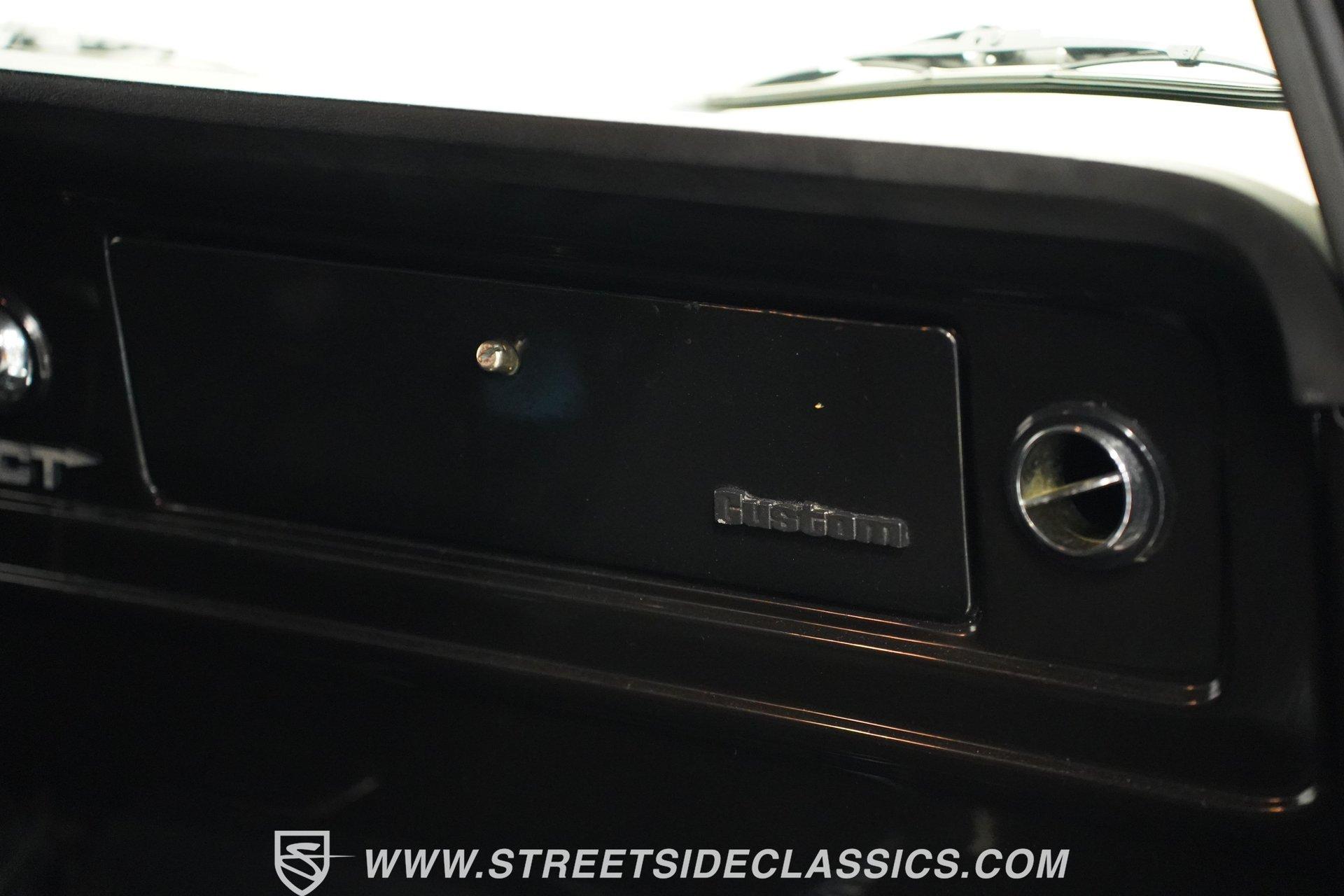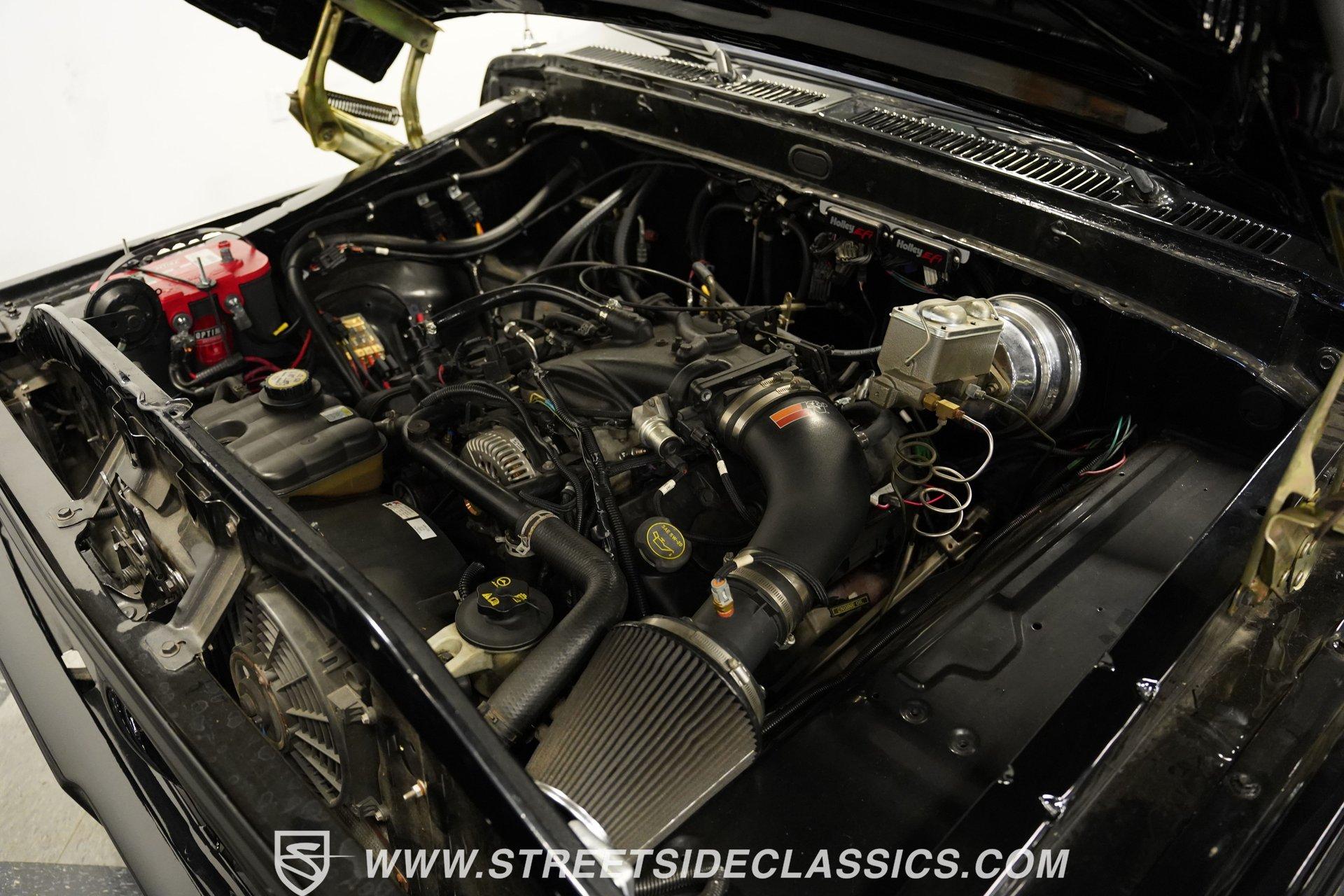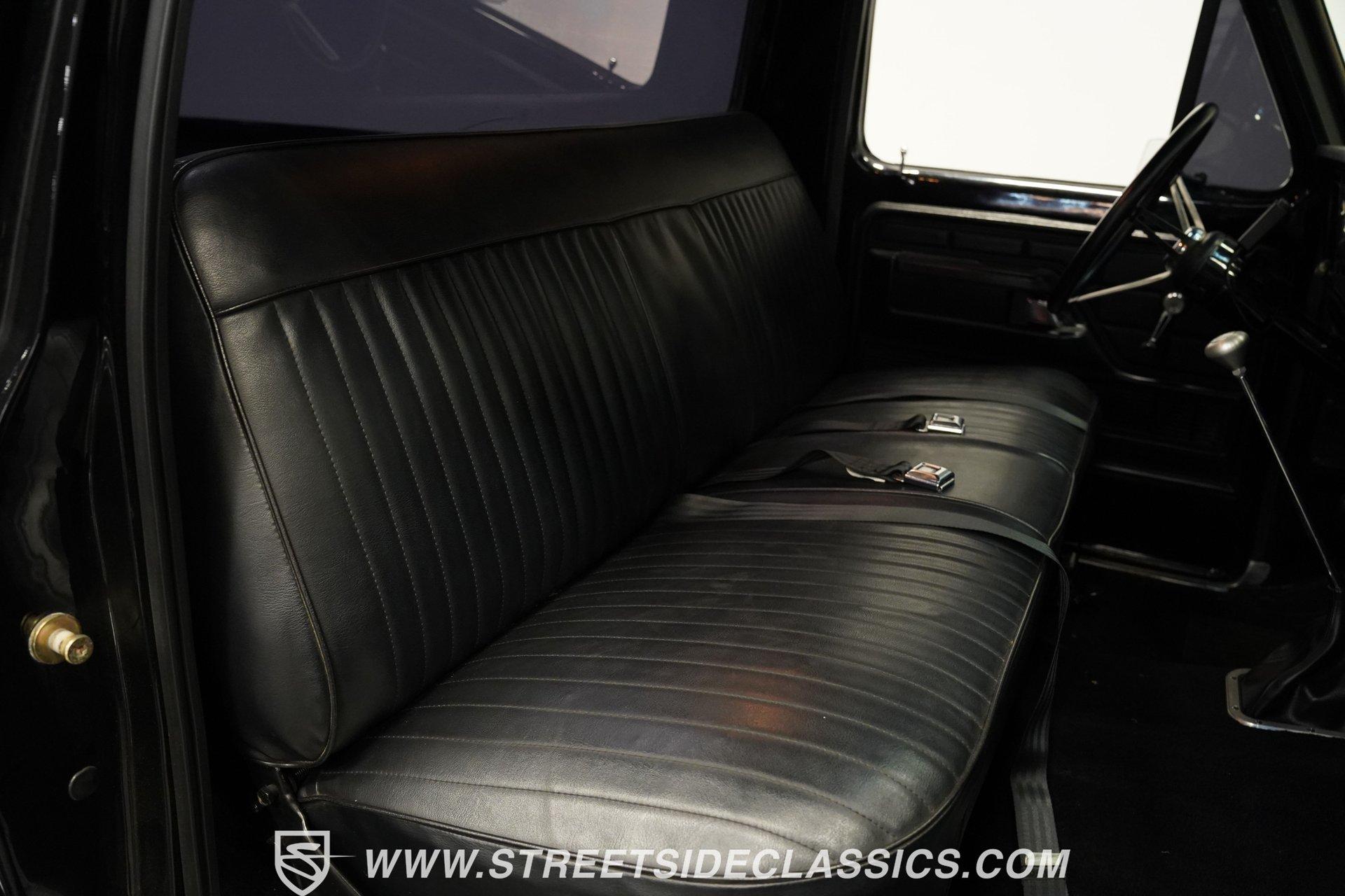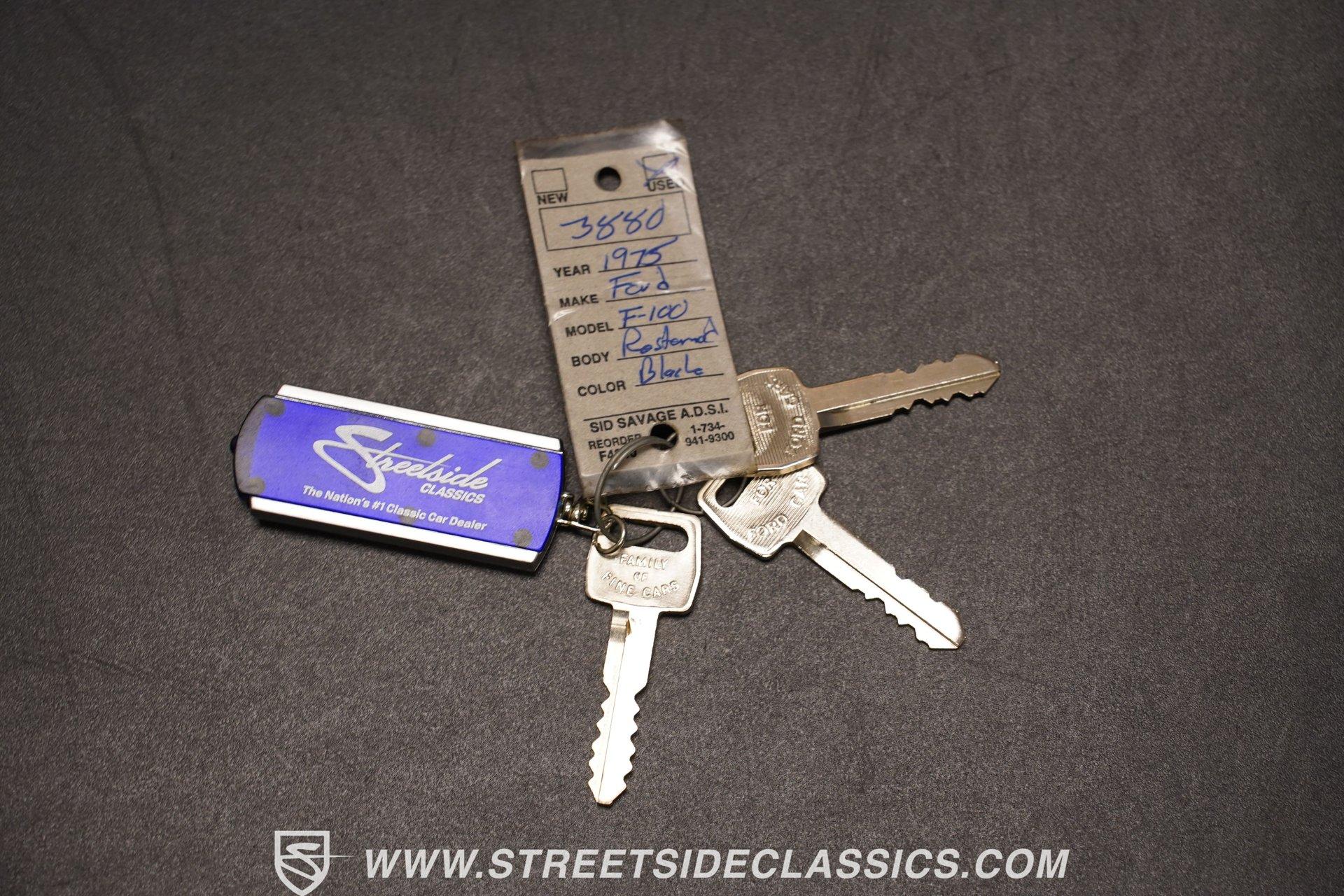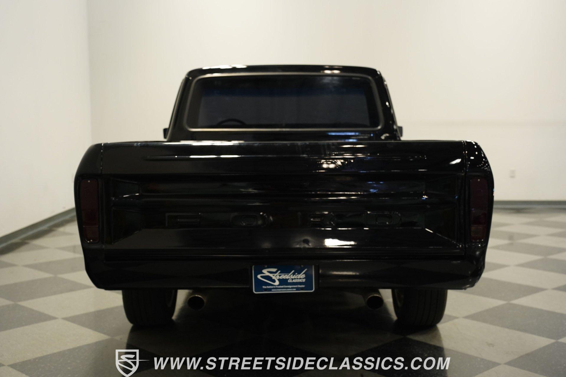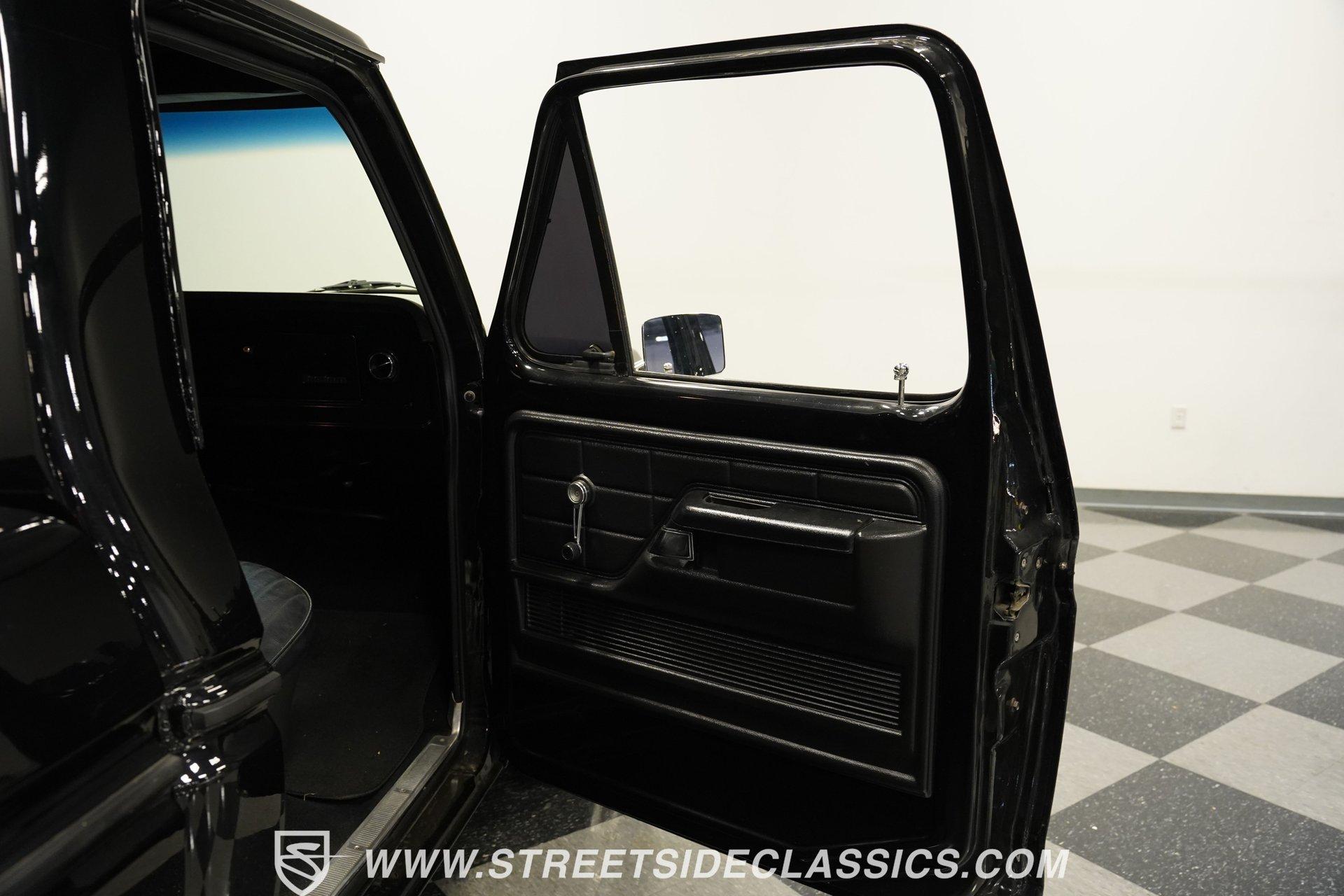 Midnight black from front to back, the 1975 Ford F-100 Restomod got a full makeover with a deep black paint job. Blacked out grille, painted bumpers, and darkened emblems create a complete blackout look that works exceptionally well on Ford's classic pickup design. Tinted windows add an extra layer of darkness to the overall appearance. 18" wheels and P245/55R18 tires give this F-100 an updated stance while maintaining the truck's tough character. Black vinyl wraps the bench seat and continues throughout the cabin for a factory-correct appearance. The dash shows excellent upkeep with zero cracks and a clean layout. Aftermarket gaugage placement gives the driver all necessary information at a glance. A JVC AM/FM/AUX stereo tucked away in the headliner adds modern audio capability without changing the original dashboard configuration. The floor-mounted shifter controls the four-speed automatic transmission with ease. A 4.6 liter 3-valve V8 engine sits in a clean engine bay, offering substantial power for this classic pickup. Holley Terminator electronic fuel injection improves starting, idle quality, and overall drivability compared to a carburetor. The AOD four-speed automatic transmission handles the power distribution. Mercury Marauder front-end components upgrade the handling characteristics. Four-wheel power disc brakes stop this truck with authority. Power steering is included for better control during all driving situations. HIGHLIGHTS: 4.6 Liter V8 3-Valve Engine 4 Speed Automatic AOD Transmission Holley Terminator Electronic Fuel Injection Mercury Marauder Front End Four Wheel Power Disc Brakes 8.8 Rear Axle Dual Exhaust With Aftermarket Mufflers Black Full Repaint 18" Wheels P245/55R18 Tires Blacked Out Grille Black Painted Bumpers Blacked Out Emblems And Trim Tinted Windows Black Interior With Bench Seat Clean Dash And Door Panels Aftermarket Gauges Power Steering JVC AM/FM/AUX Stereo In Headliner Floor Shifter Classic looks and modern muscle come together in this 1975 Ford F-100 Restomod. The 4.6L V8 engine and four-speed automatic transmission make for an excellent driving truck while the black-on-black color scheme gives it a tough, custom look that will never go out of style. Call today!