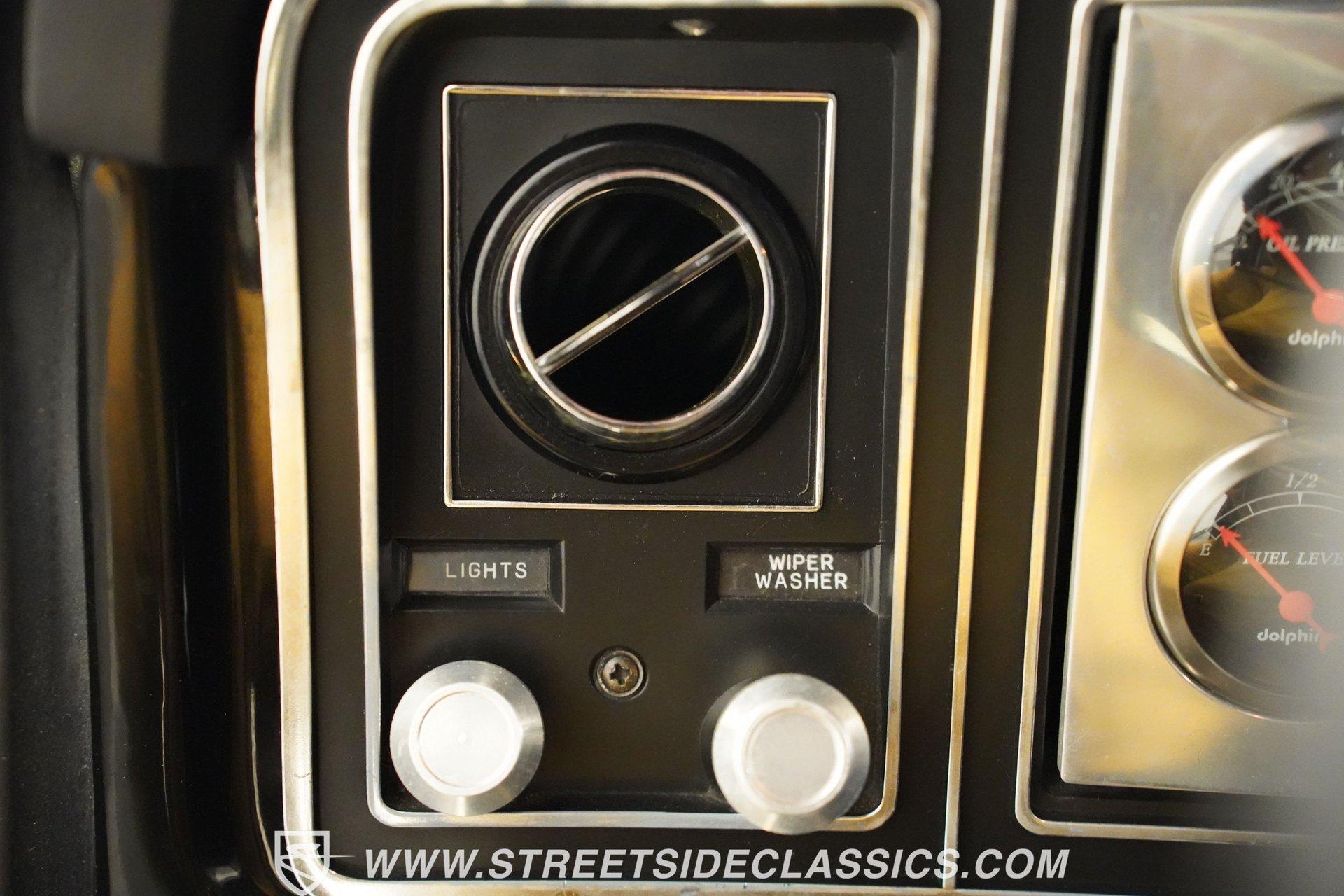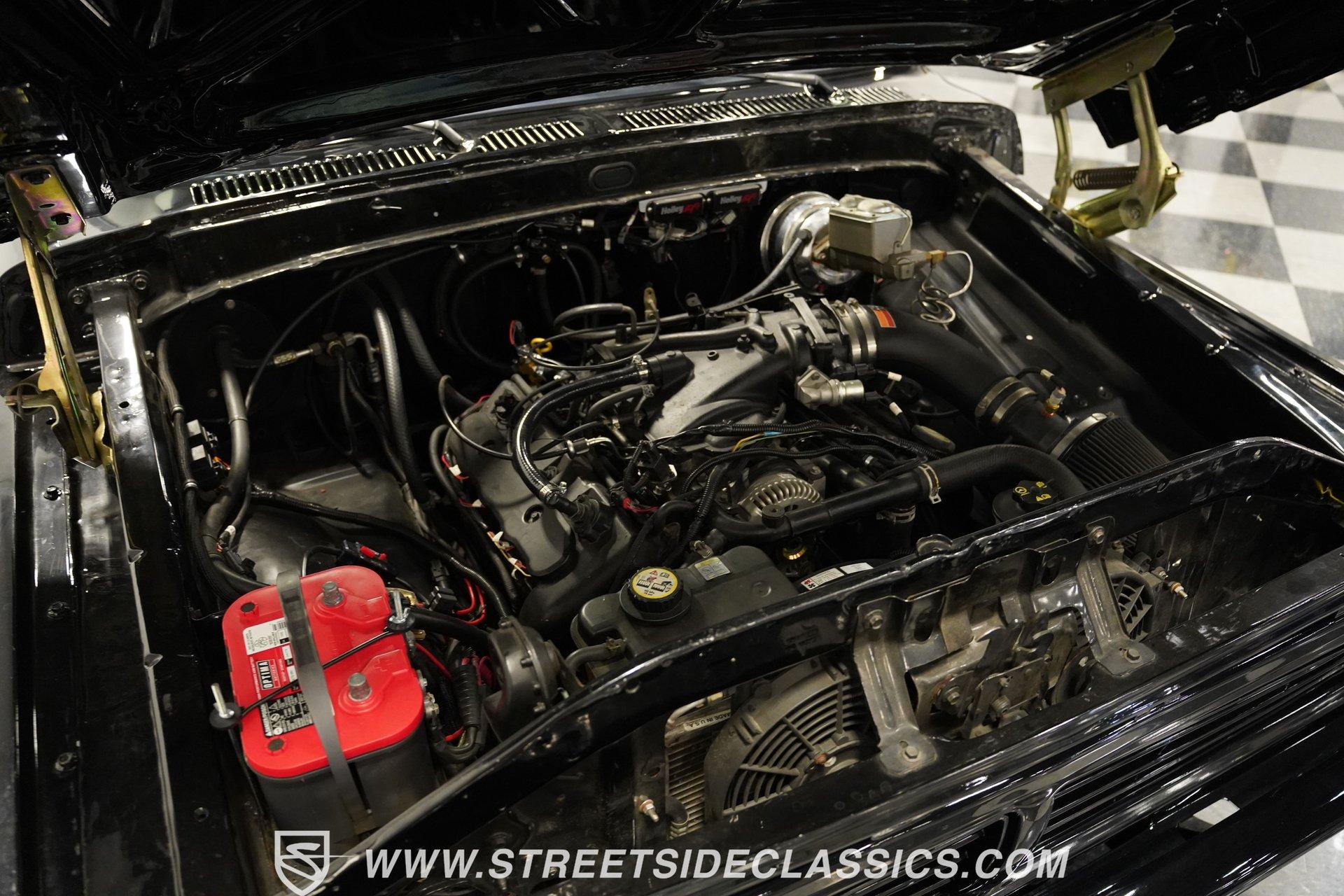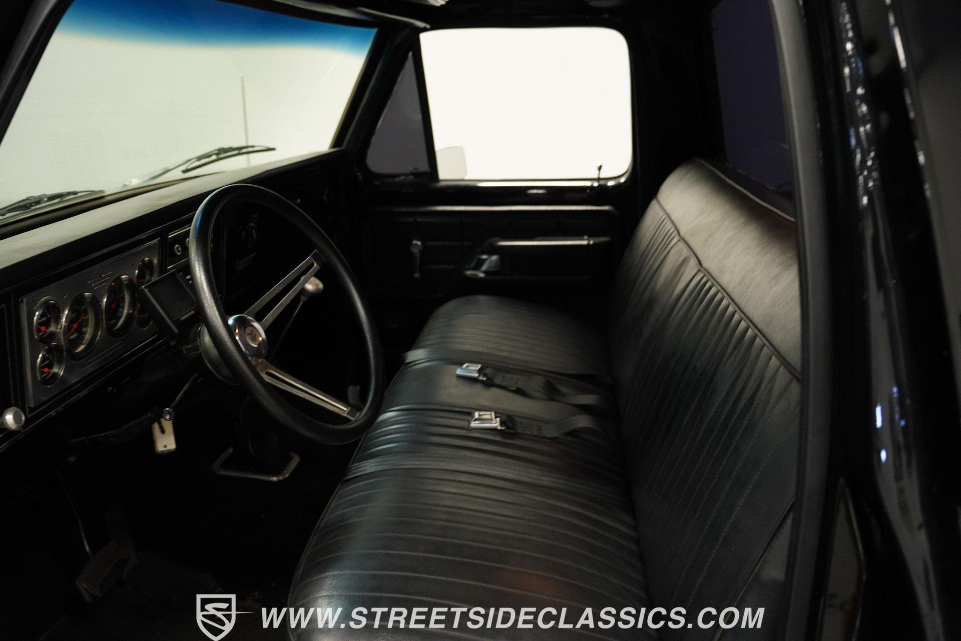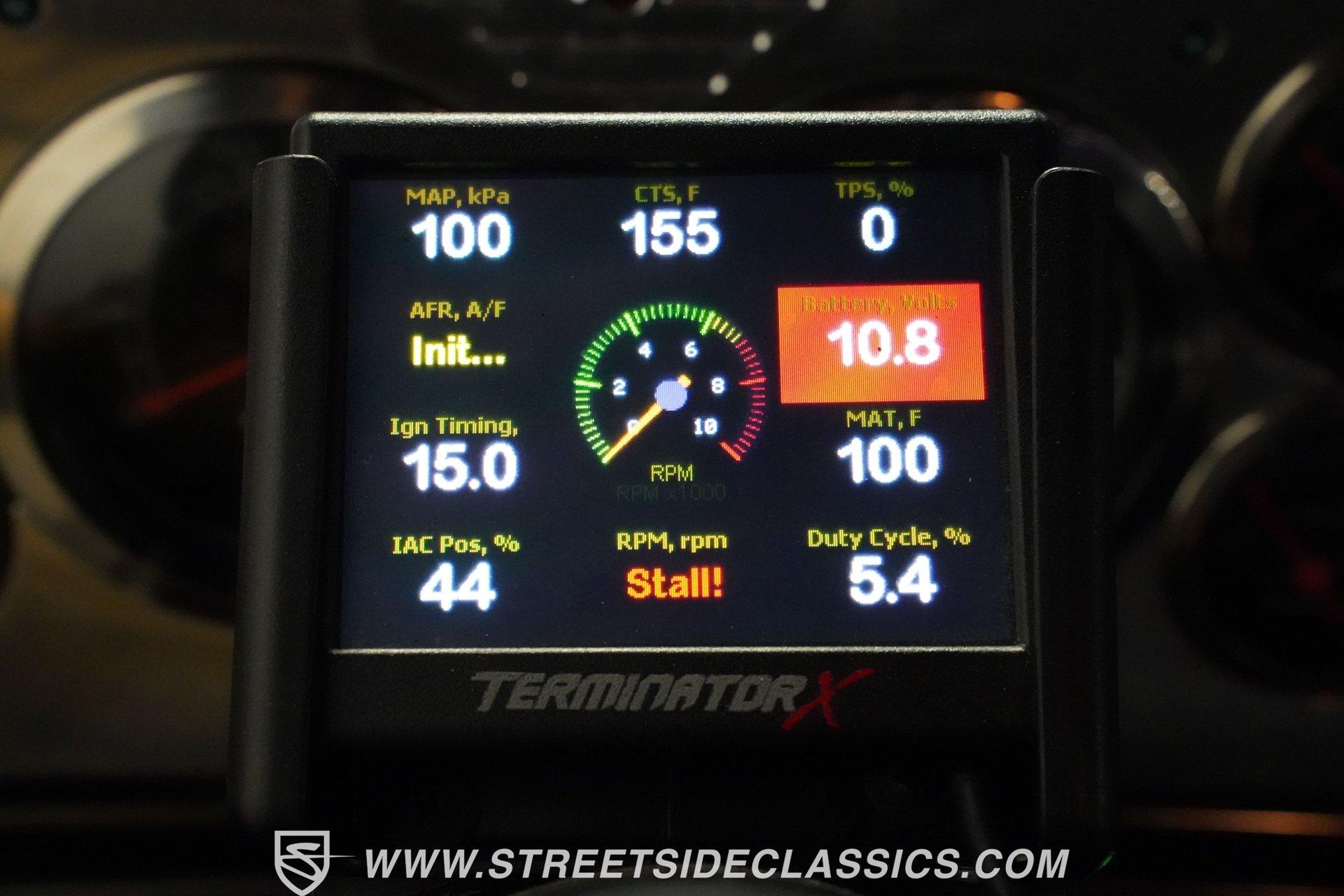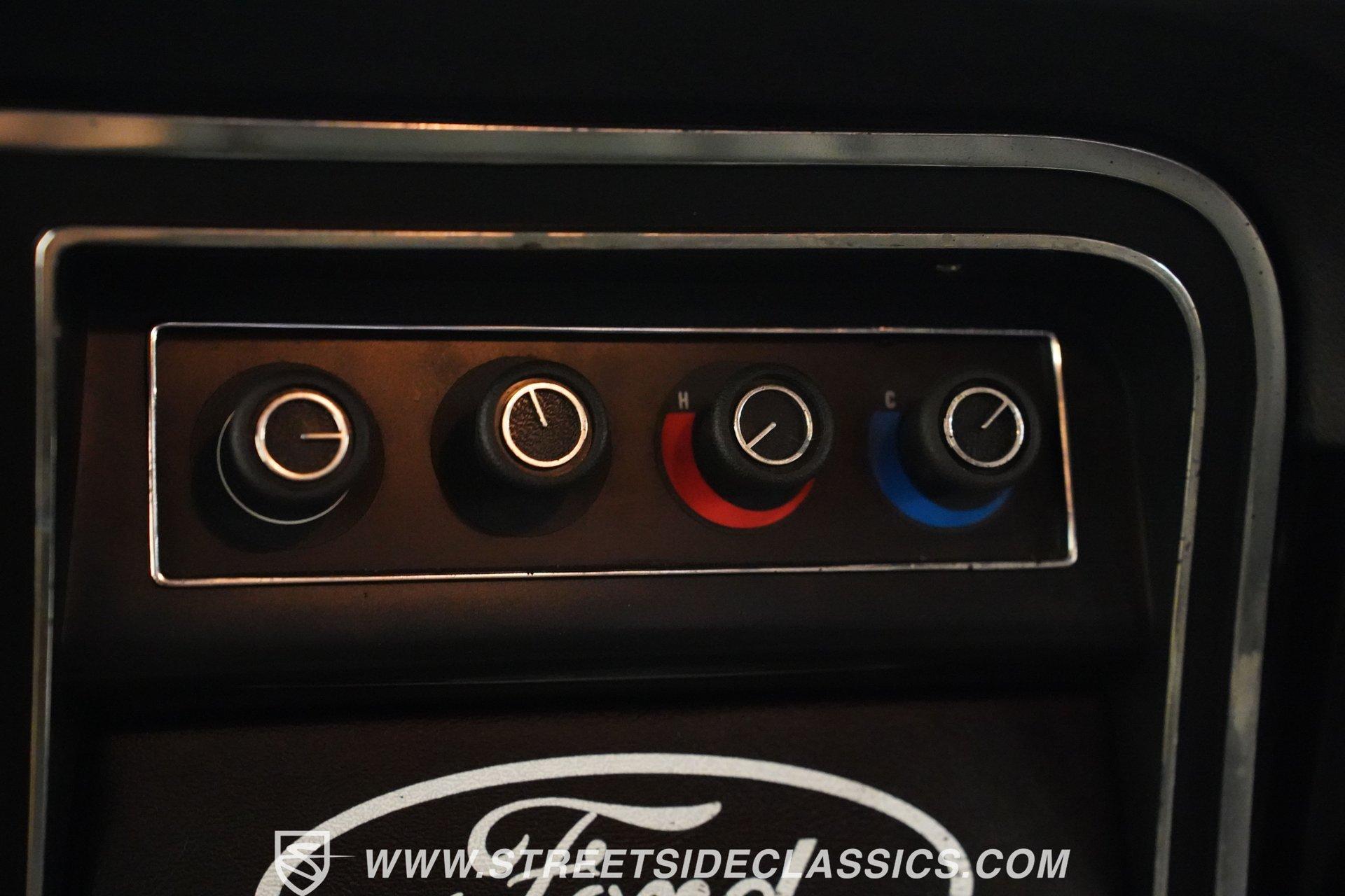 Midnight black from front to back, the 1975 Ford F-100 Restomod got a full makeover with a deep black paint job. Blacked out grille, painted bumpers, and darkened emblems create a complete blackout look that works exceptionally well on Ford's classic pickup design. Tinted windows add an extra layer of darkness to the overall appearance. 18" wheels and P245/55R18 tires give this F-100 an updated stance while maintaining the truck's tough character. Black vinyl wraps the bench seat and continues throughout the cabin for a factory-correct appearance. The dash shows excellent upkeep with zero cracks and a clean layout. Aftermarket gaugage placement gives the driver all necessary information at a glance. A JVC AM/FM/AUX stereo tucked away in the headliner adds modern audio capability without changing the original dashboard configuration. The floor-mounted shifter controls the four-speed automatic transmission with ease. A 4.6 liter 3-valve V8 engine sits in a clean engine bay, offering substantial power for this classic pickup. Holley Terminator electronic fuel injection improves starting, idle quality, and overall drivability compared to a carburetor. The AOD four-speed automatic transmission handles the power distribution. Mercury Marauder front-end components upgrade the handling characteristics. Four-wheel power disc brakes stop this truck with authority. Power steering is included for better control during all driving situations. HIGHLIGHTS: 4.6 Liter V8 3-Valve Engine 4 Speed Automatic AOD Transmission Holley Terminator Electronic Fuel Injection Mercury Marauder Front End Four Wheel Power Disc Brakes 8.8 Rear Axle Dual Exhaust With Aftermarket Mufflers Black Full Repaint 18" Wheels P245/55R18 Tires Blacked Out Grille Black Painted Bumpers Blacked Out Emblems And Trim Tinted Windows Black Interior With Bench Seat Clean Dash And Door Panels Aftermarket Gauges Power Steering JVC AM/FM/AUX Stereo In Headliner Floor Shifter Classic looks and modern muscle come together in this 1975 Ford F-100 Restomod. The 4.6L V8 engine and four-speed automatic transmission make for an excellent driving truck while the black-on-black color scheme gives it a tough, custom look that will never go out of style. Call today!