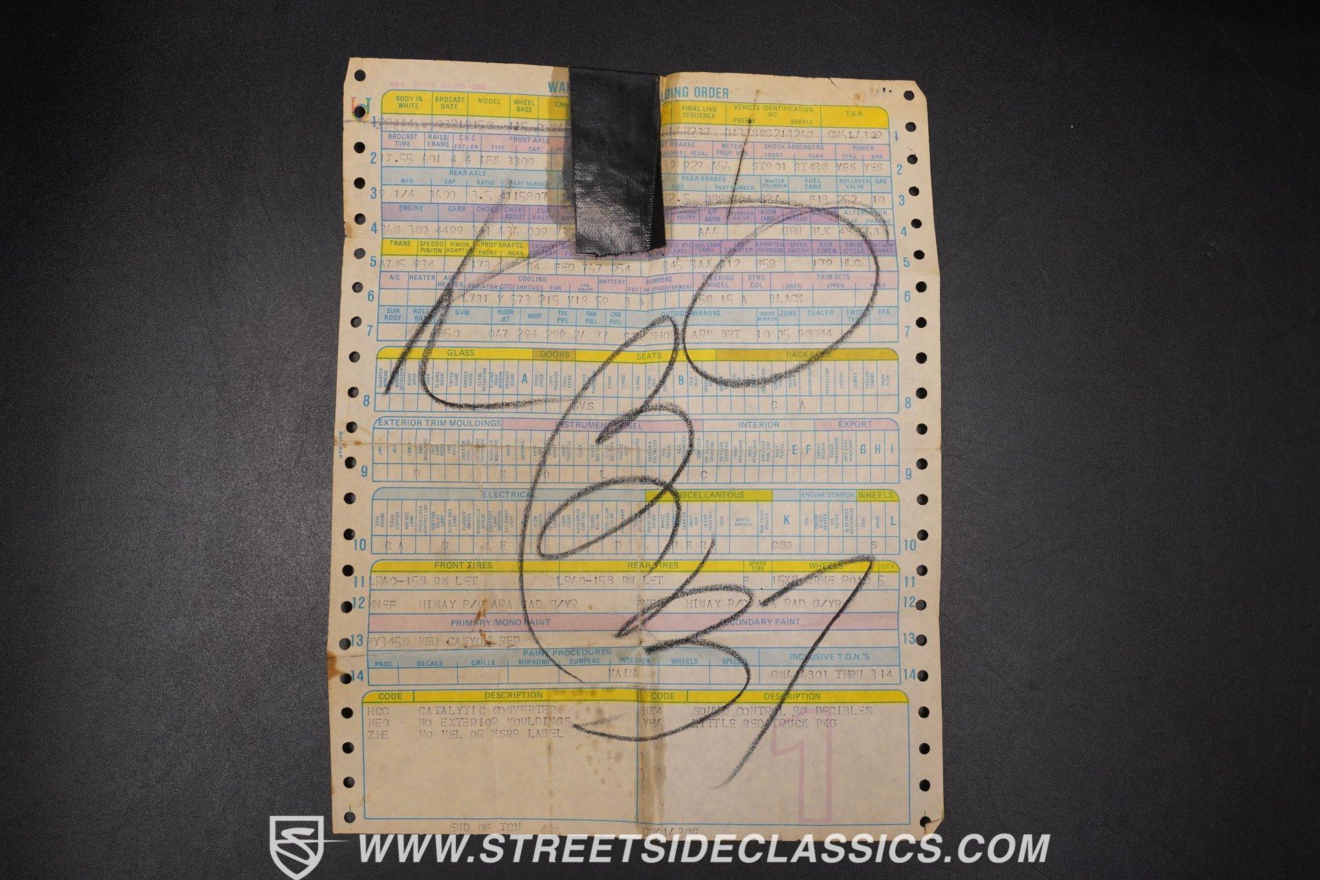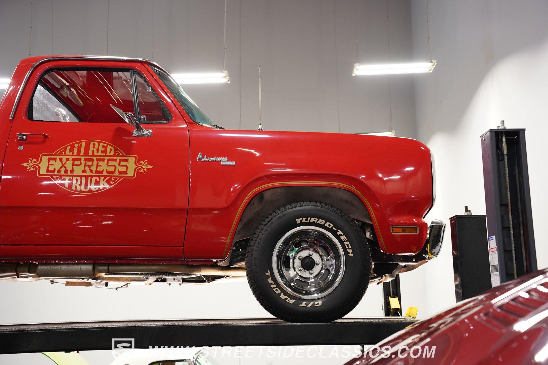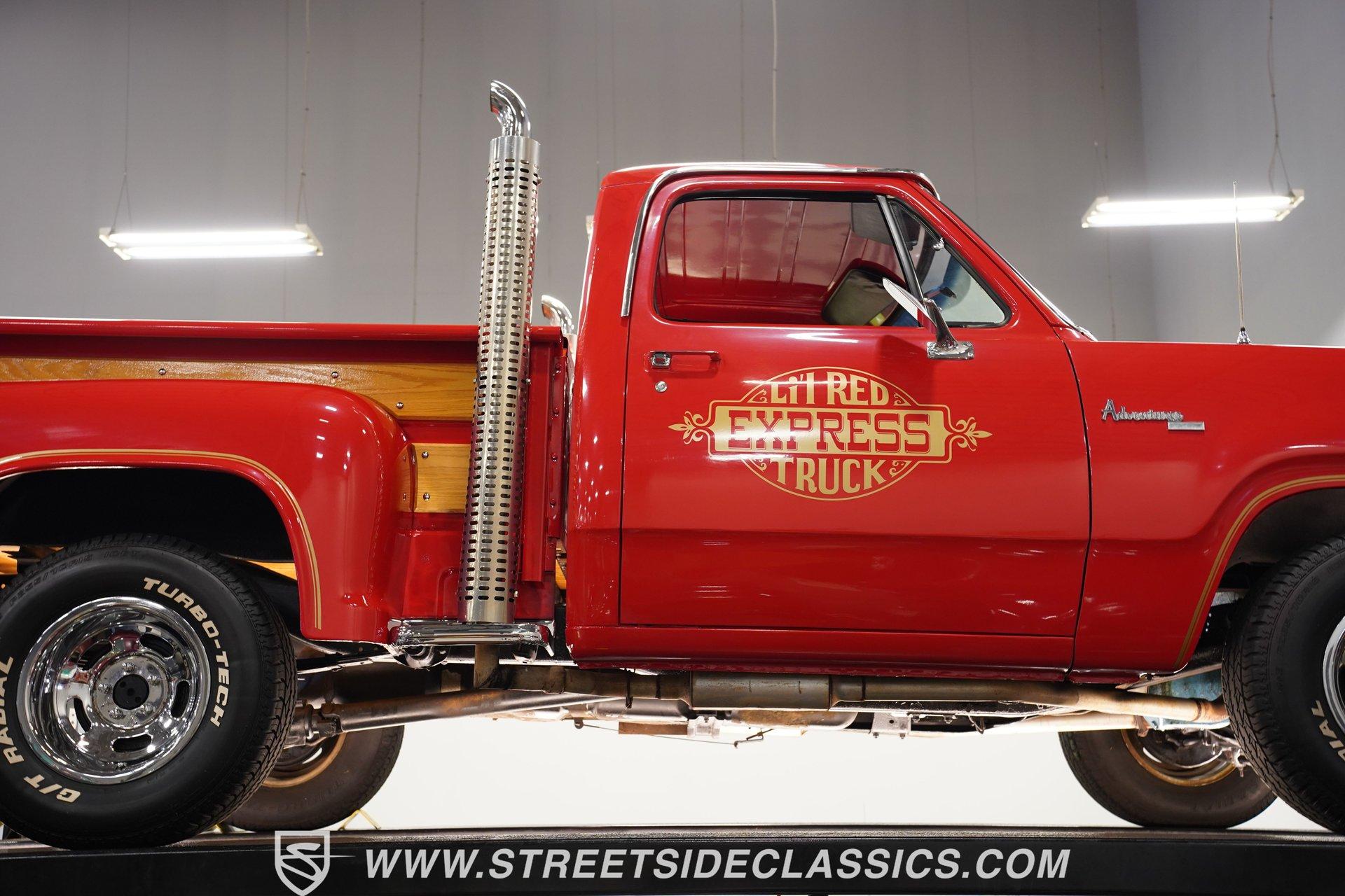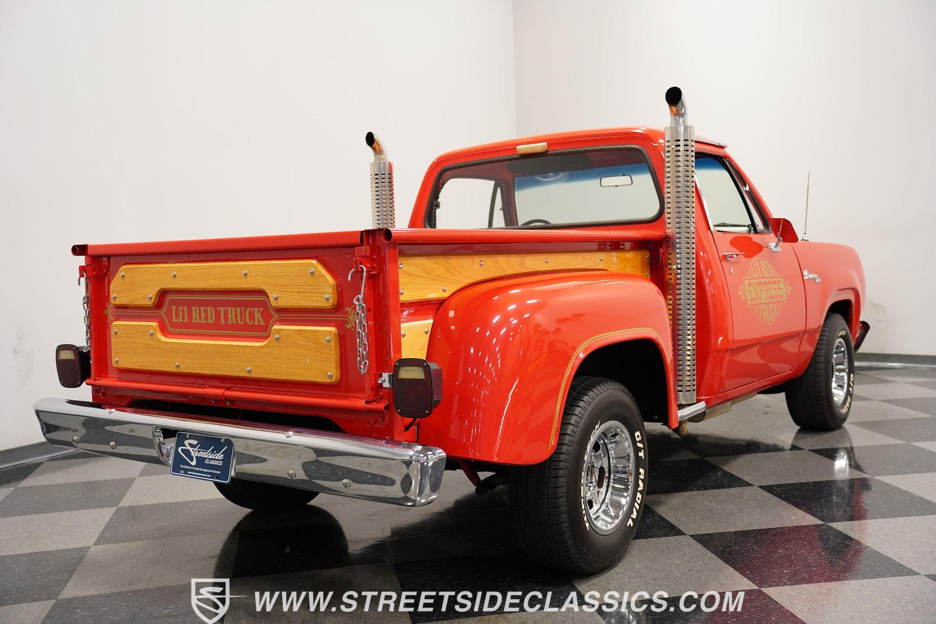 Limited to just two model years of production, this 1979 Dodge Lil Red Express features the signature red paint and Lil Red Express decals that mark its heritage. Chrome slotted wheels measuring 15 inches anchor each corner, wrapped in P255/70R15 tires that plant this pickup firmly to the pavement. The wood bed stretches behind the cab while chrome bumpers bookend the truck's profile, Side exit stacks punctuate the truck's flanks, creating the signature look that made these pickups so distinctive during their brief production run. Black vinyl covers the factory split bench seat, creating a workspace built for function over frills. The column shifter keeps the transmission controls within easy reach while auxiliary gauges mounted under the dash provide additional monitoring capabilities. Crack-free dash and door panels frame the interior space, complemented by clean carpet underfoot. The Pioneer AM/FM single CD player handles audio duties while crank windows and the absence of air conditioning keep things simple and mechanical in the cabin. The 360 V8 engine provides the power, fed by an Edelbrock AVS2 1906 carburetor that meters fuel delivery with precision. A 3-speed A727 Torqueflite automatic transmission transfers power to the rear wheels while power steering lightens the wheel effort during maneuvering. Power disc brakes up front handle stopping duties, and the side exit exhaust system creates its distinctive sound. Factory manifolds route exhaust gases through the system while power brakes assist with pedal effort during deceleration. HIGHLIGHTS: 360 V8 Engine 3-Speed A727 Torqueflite Automatic Transmission Edelbrock AVS2 1906 Carburetor Power Disc Brakes Side Exit Exhaust Stacks Factory Manifolds Red Paint 15" Chrome Slotted Wheels P255/70R15 Tires Wood Bed Chrome Bumpers Lil Red Express Decals Side Exit Stacks Black Interior with Split Bench Seat Column Shifter Pioneer AM/FM Single CD Player Auxiliary Gauges Under Dash Power Steering Clean Carpet Factory Buildsheet Owner's Manual This 1979 Dodge Lil Red Express combines the 360 V8 power, distinctive side exit stacks, and wood bed styling that made these limited production trucks collectible. The red exterior and black interior create the classic combination these trucks were known for. Call today!