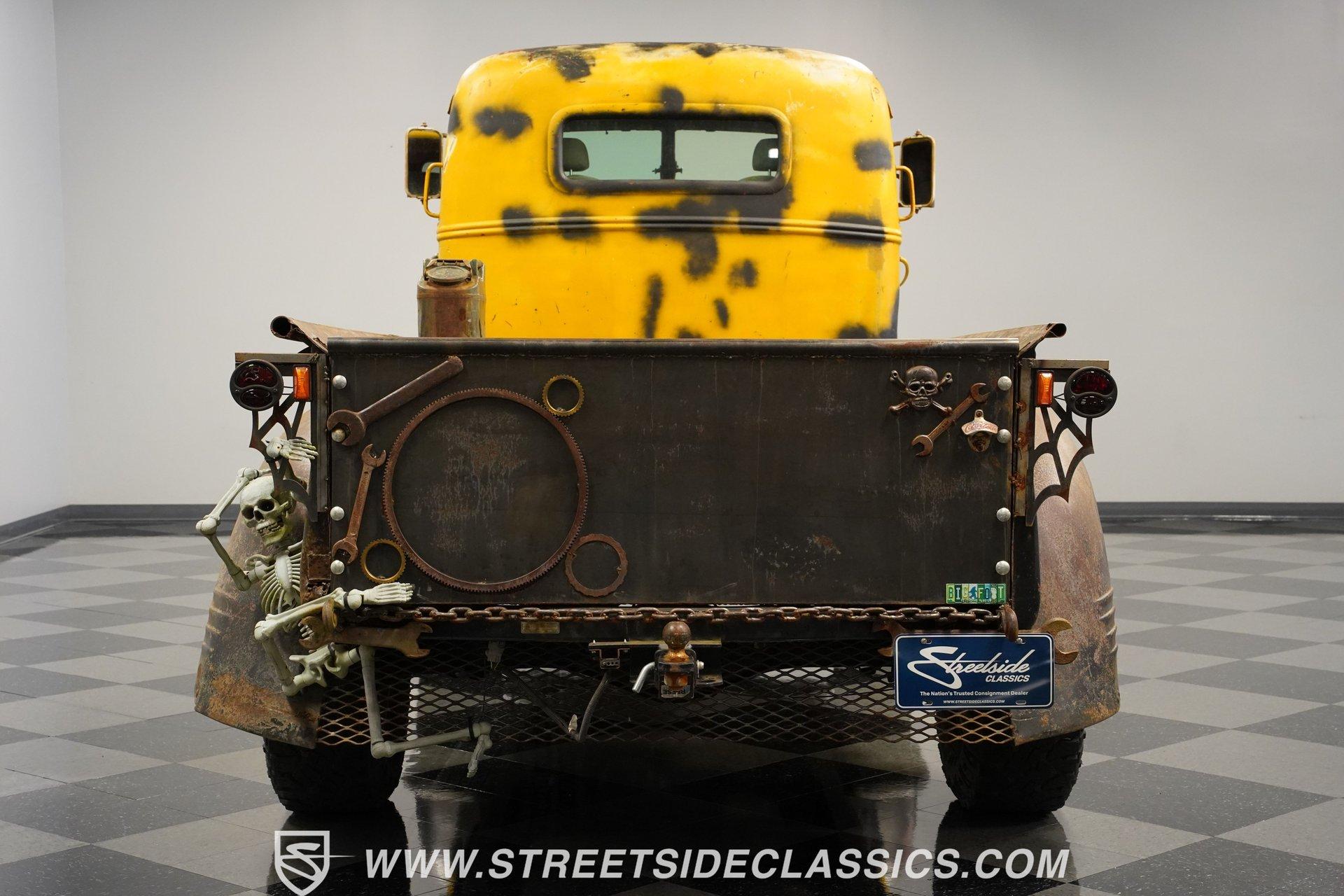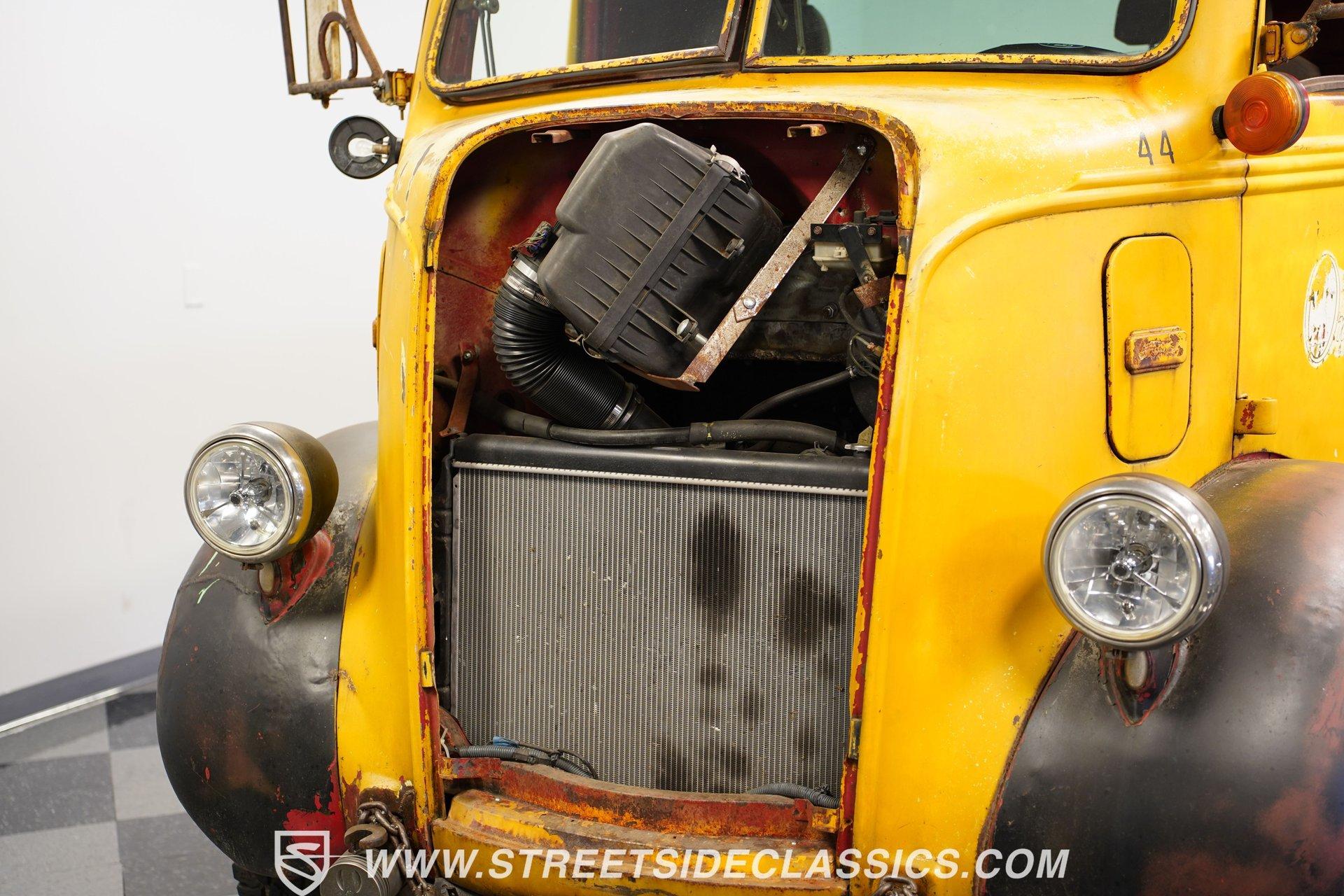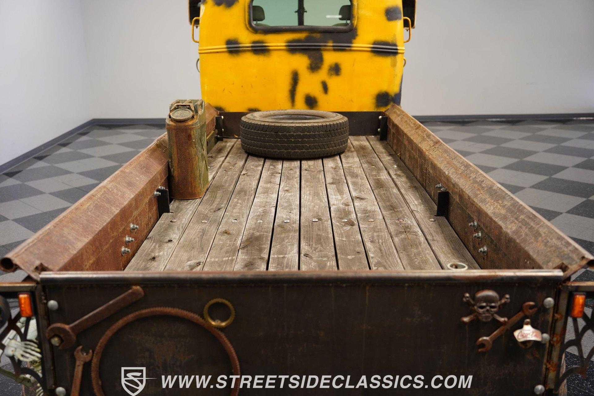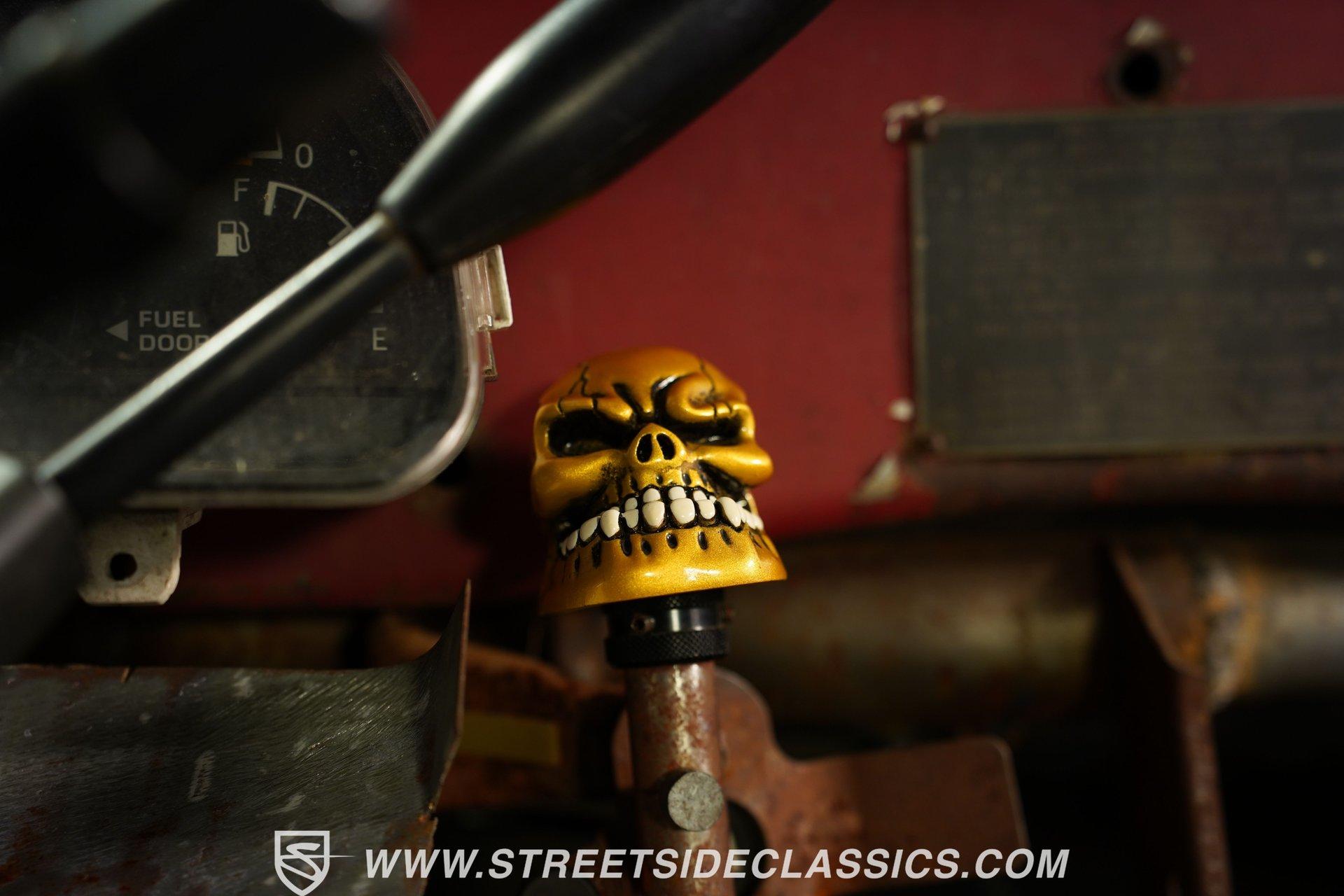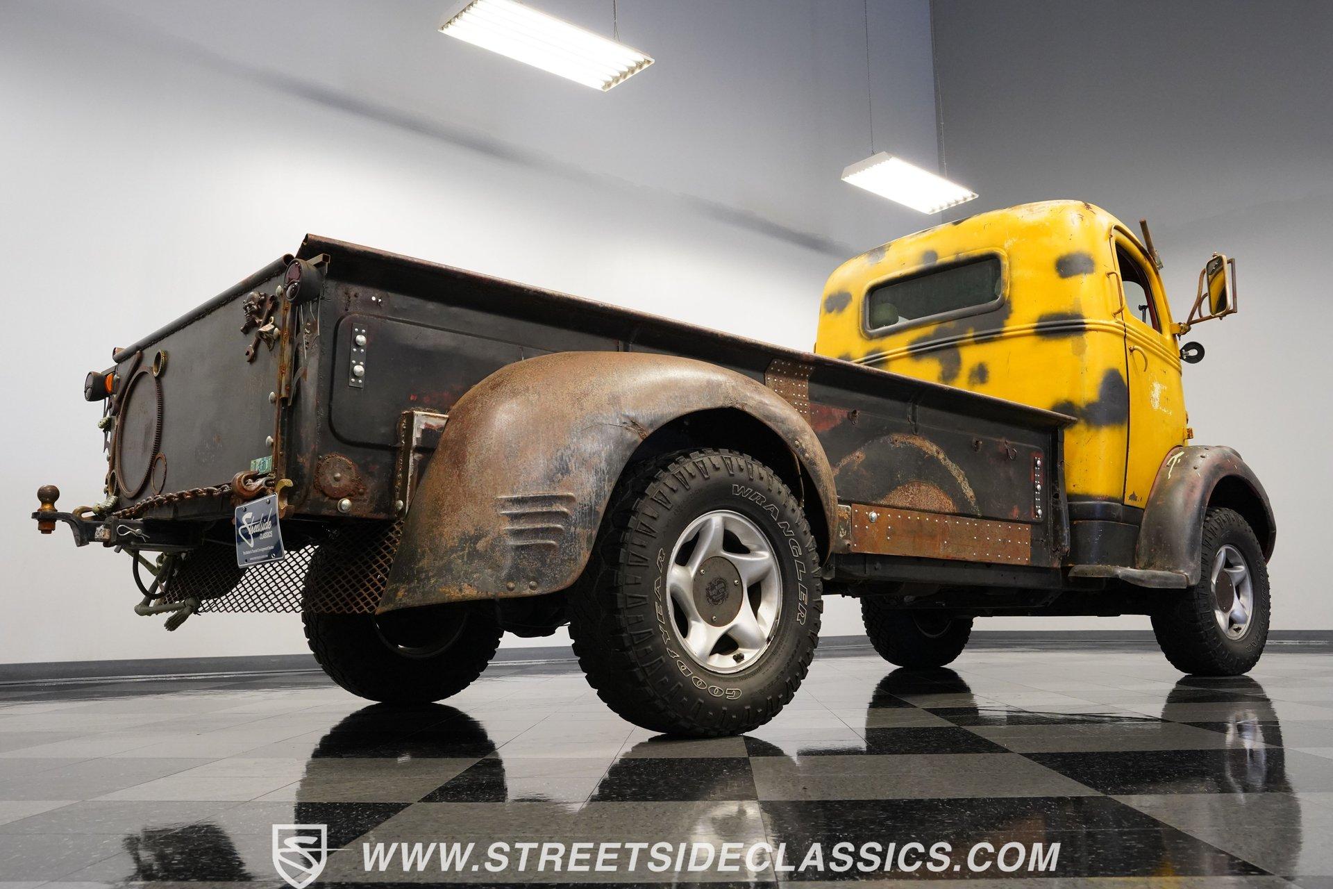 Custom crafted over three years using modern Toyota Tundra underpinnings, this 1947 Ford F-5 COE 4X4 Custom wears Patina Yellow finish that tells its own story. Clear tri-bar headlights with integrated turn signals anchor the front end, while a saw blade visor adds custom flair above. The weathered wood bed construction uses two beds bolted together, complete with a bolted-in gas can connected to the fuel system. Chain and piston front bumper, exposed welds, and surface rust create authentic rat rod character. LT265/75R16 tires mount on 16" wheels at all four corners, with a tow hitch and wiring plug completing the functional exterior package. Patina interior with red base continues the weathered aesthetic throughout the cabin. Bench seating uses cloth material sourced from the Toyota Tundra donor, providing fold-forward access to under-floor storage. Column shifter controls the automatic transmission, while the custom exposed steel center console houses the throttle pedal hand control. Toyota Tundra steering column and gauge cluster integrate modern reliability with vintage style. Power steering comes standard, though no radio keeps things simple and focused on the driving task at hand. Electronic fuel injection feeds the 4.7L V8 engine transplanted from the 2002 Toyota Tundra, paired with the matching 4-speed automatic transmission. Independent coilovers handle front suspension duties, while leaf springs with shocks control the rear axle movement. Power front disc brakes and rear drum brakes provide stopping power, with the dual-to-single exhaust system completing the drivetrain package. Factory-style manifolds and stock muffler keep the setup reliable, while 12V electrical system powers the essentials from a battery mounted under the driver seat. HIGHLIGHTS: 4.7 Liter V8 Engine 4 Speed Automatic Transmission Electronic Fuel Injection Independent Coilovers Front Suspension Leaf Springs With Shocks Rear Suspension Power Front Disc Brakes Dual To Single Exhaust 4X4 Drivetrain Patina Yellow Paint 16" Wheels With LT265/75R16 Tires Clear Tri-Bar Headlights With Turn Signals Saw Blade Visor Chain And Piston Front Bumper Custom Two-Bed Construction Weathered Wood Bed Tow Hitch With Wiring Plug Red Patina Interior With Tan Bench Seating Power Steering Custom Steel Center Console Toyota Tundra Steering Column Toyota Tundra Gauge Cluster Hand Throttle Control Under-Floor Storage Access Classic 1947 Ford F-5 COE styling with modern Toyota Tundra reliability creates this custom 4X4 truck, a unique machine with dependable performance and solid engineering. Three years of careful construction produced a one-of-a-kind build ready for work or weekend adventures. Call today!