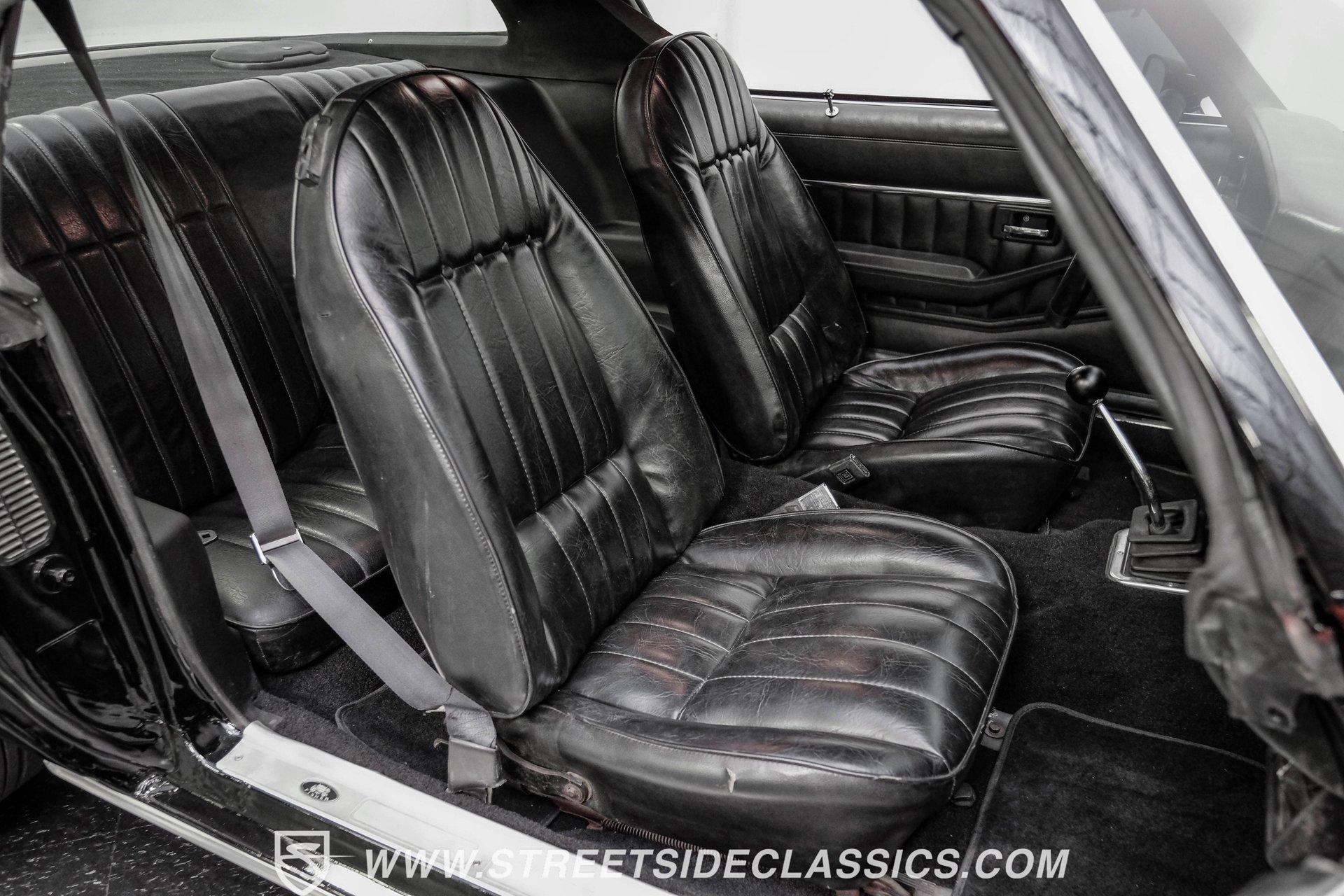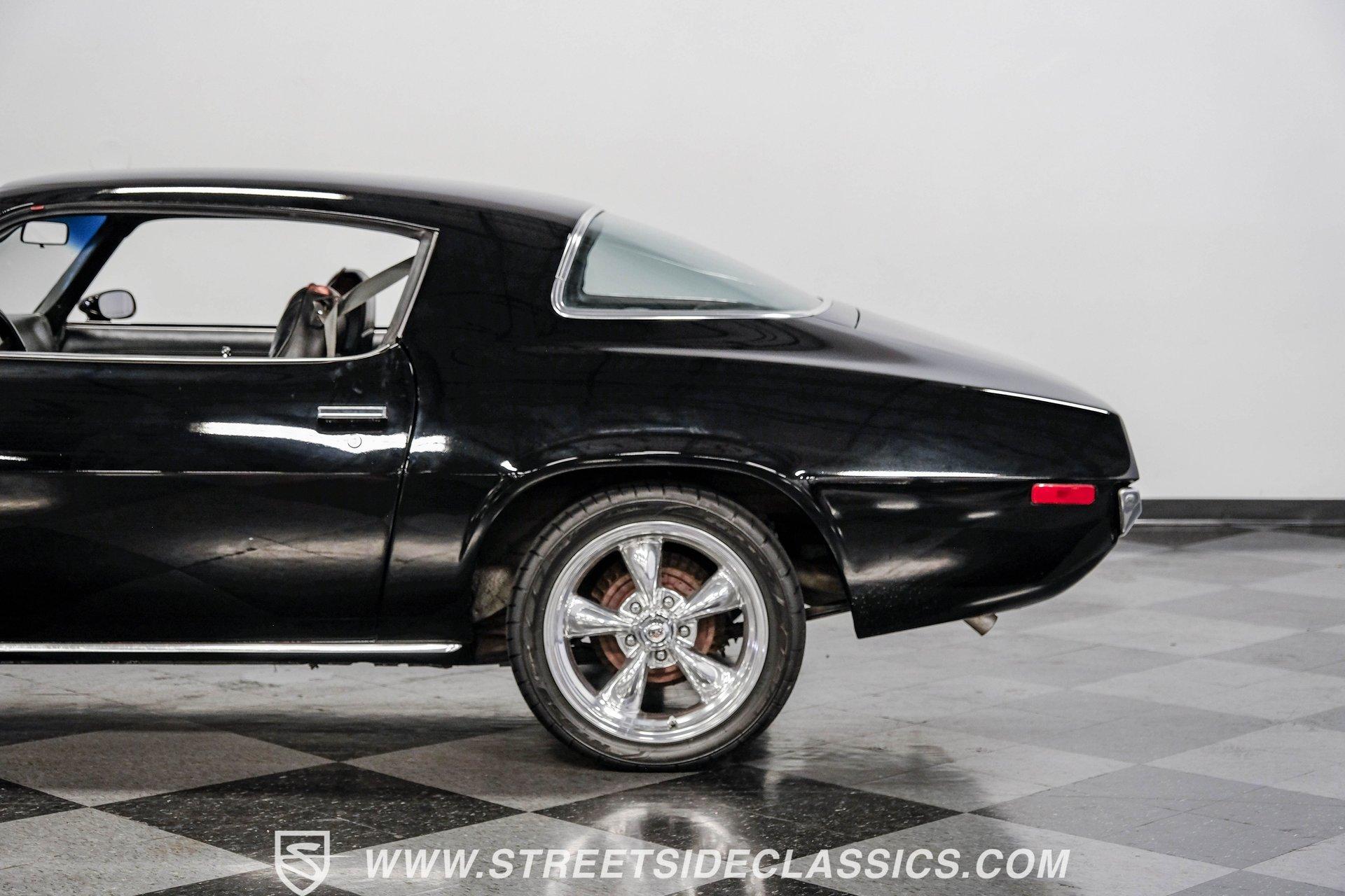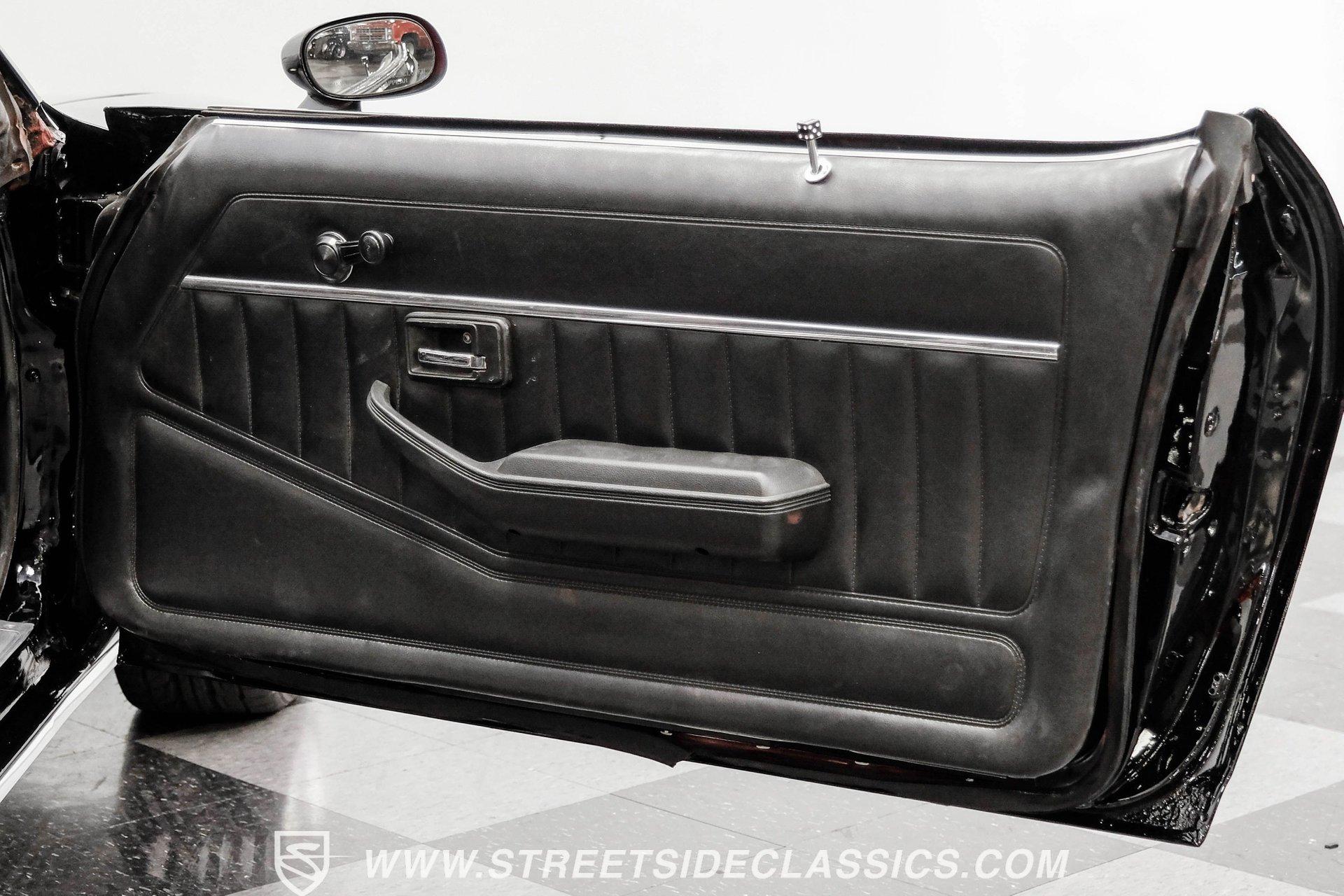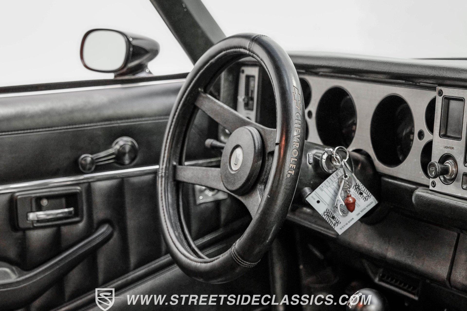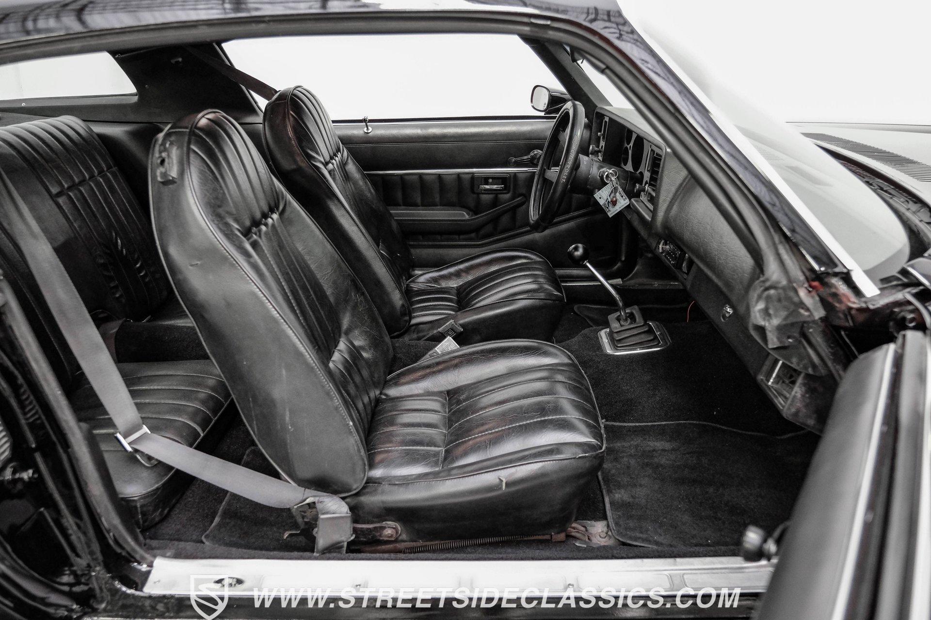 Converting the front clip and rear tail panel from an earlier second-generation model gives this 1979 Chevrolet Camaro Split Bumper Conversion the aggressive look of its predecessors. Black paint covers the transformed bodywork while gold decal stripes provide visual contrast across the surface. Chrome 17" Rev wheels fill the wheel wells, wrapped in 225/45ZR17 front and 255/40ZR17 rear Nitto tires. The conversion work includes both front and rear sections, creating the split bumper appearance that made the earlier Camaros so distinctive. Black vinyl bucket seats anchor the interior, complemented by matching door panels and a fresh headliner overhead. The floor-mounted shifter connects to the four-speed manual transmission, while an aftermarket Dual brand AM/FM/CD head unit with remote handles entertainment duties. Black carpet covers the floor, and the dashboard maintains its original configuration. Power steering assists with handling, and the interior reflects recent attention to detail with replaced components maintaining the factory appearance throughout the cabin. A 350 V8 engine provides motivation through the Quadrajet carburetor and aluminum intake manifold. Aftermarket Corvette valve covers dress up the engine bay, while the HEI distributor handles ignition duties. The four-speed manual transmission sends power through a 10-bolt rear axle. Power disc brakes handle stopping duties up front, with power drum brakes at the rear. An aluminum radiator manages cooling, and dual exhaust provides the soundtrack. Air shocks support the rear leaf springs, while coil springs and a sway bar handle front suspension duties. HIGHLIGHTS: 350 V8 Engine 4 Speed Manual Transmission Quadrajet Carburetor Aluminum Intake Manifold HEI Distributor Aftermarket Corvette Valve Covers Power Disc Front Brakes Dual Exhaust Aluminum Radiator 10 Bolt Rear Axle Air Shocks Rear Suspension Front Coil Springs With Sway Bar Black Paint With Gold Stripes Split Bumper Front Clip Conversion 17" Rev Wheels 225/45ZR17 Front, 255/40ZR17 Rear Nitto Tires Black Interior Floor Shifter Power Steering Dual Brand AM/FM/CD Head Unit With Remote Fresh Headliner Service Manuals Seatbelts Tilt Wheel Aggressive styling of earlier split bumper models and the solid foundation of a 1979 Chevrolet Camaro Split Bumper Conversion, this vehicle brings the right kind of muscle to the table. Call today!