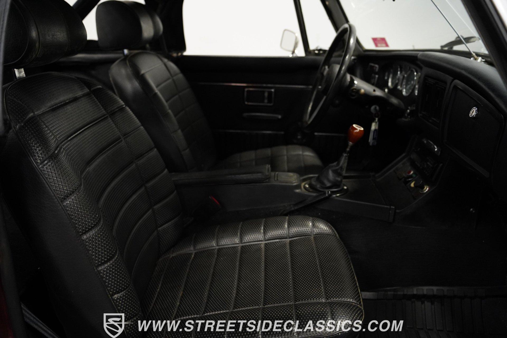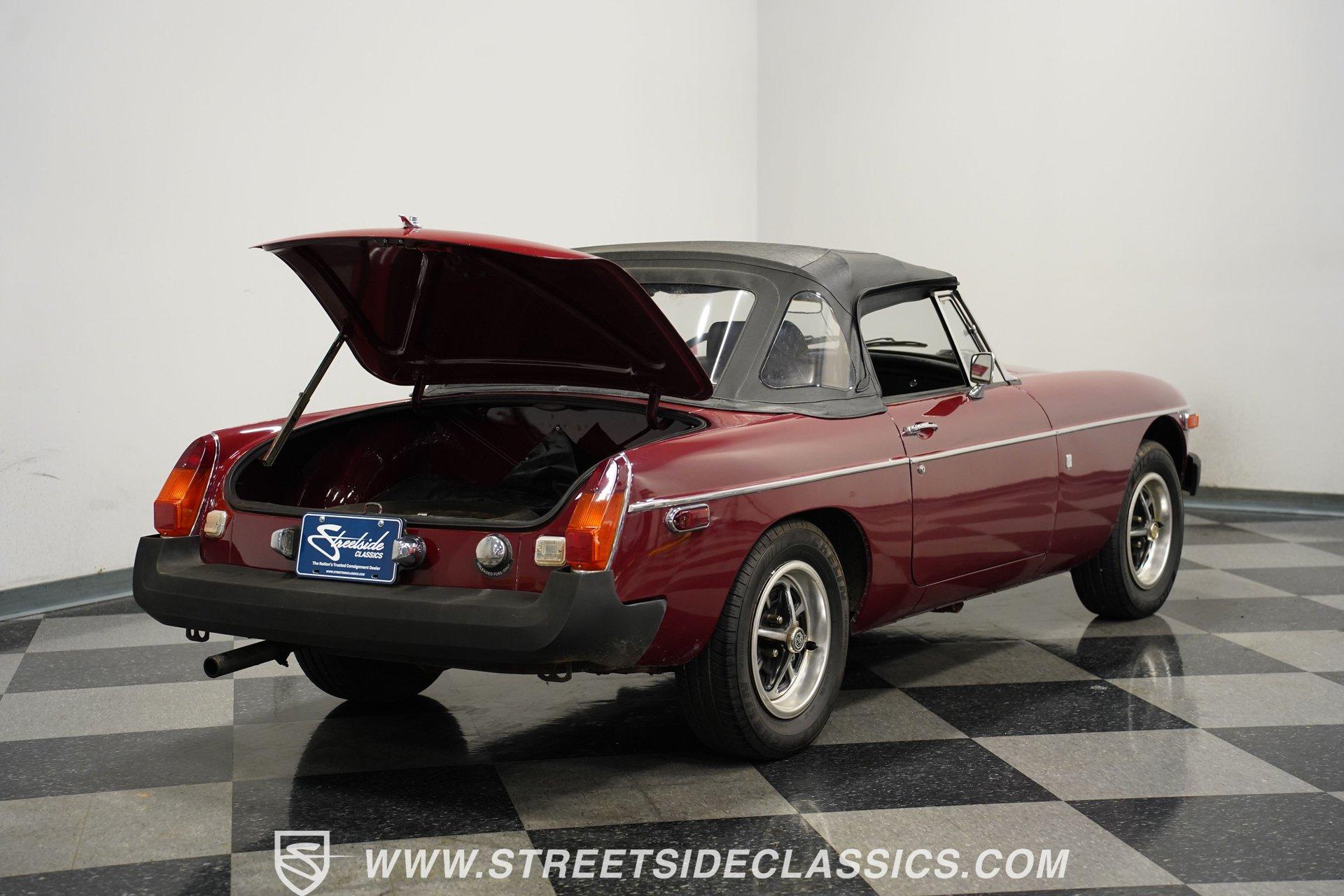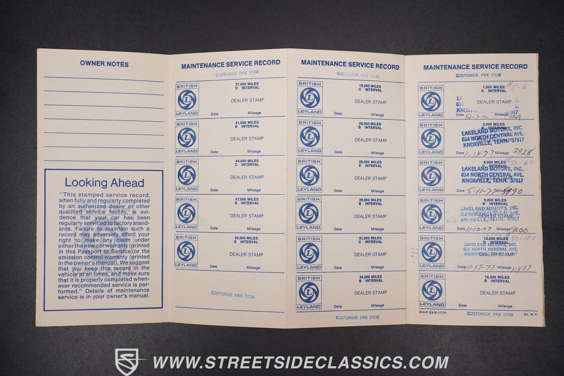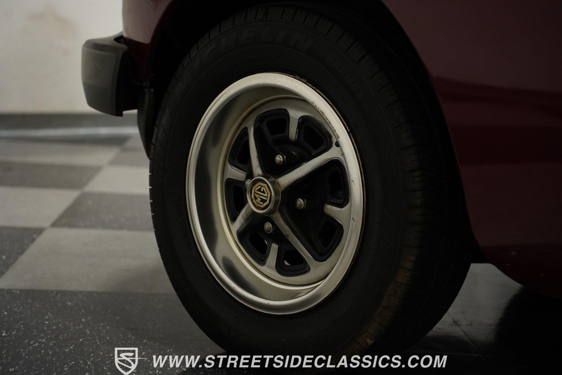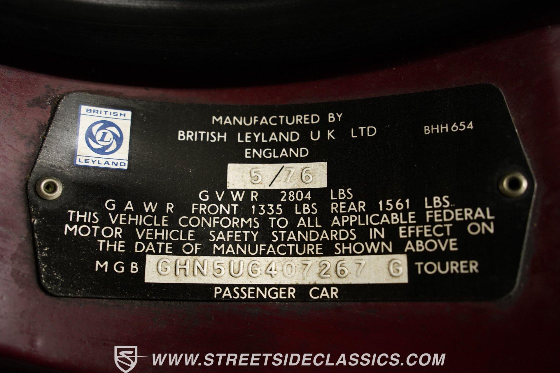 A genuine one-owner British classic, the 1976 MG MGB wears its Damask Red finish with distinction. Short overhangs and compact proportions give away its sporting intentions immediately. The black vinyl convertible top provides quick access to open-air motoring while maintaining a clean look when in place. Rolling on 14" wheels with P185/70R14 tires, this roadster maintains the authentic stance MG enthusiasts appreciate, with nothing extra added and nothing important left out. Black vinyl covers the interior surfaces, creating a straightforward cabin focused on driving. The dual bucket seats provide good support during cornering, while a center console houses the manual shifter for direct gear selection. An aftermarket AM/FM cassette player upgrades the audio capabilities beyond what came from the factory. The simple yet effective gauge layout provides all necessary information without distraction, keeping your attention where it belongs-on the road ahead. An original 1798 CC inline four-cylinder engine rests between the front wheels, upgraded with a Weber carburetor and Pierce intake for improved performance. The four-speed manual transmission puts full control in your hands for maximum enjoyment on winding roads. Power disc brakes handle stopping duties with efficiency. The single exhaust with factory muffler and shorty manifold completes the mechanical package, all maintained properly throughout the car's life to keep everything running as intended. HIGHLIGHTS: 1798 CC Inline Four-Cylinder Engine 4 Speed Manual Transmission Weber Carburetor Pierce Intake Power Disc Brakes Single Exhaust Shorty Manifold Factory Muffler Damask Red Paint Black Vinyl Convertible Top Plastic Rear Window 14" Wheels In P185/70R14 Tires Black Interior With Bucket Seats Console Shifter Center Console AM/FM Cassette Player Seatbelts Original Warranty Card Owner's Manual Service Manuals One Owner Since New From Knoxville since day one, this 1976 MG MGB offers pure roadster simplicity with its original 1798 CC engine, Weber carburetor upgrade, and manual-shift driving experience that keeps you connected to the road. A perfect addition to any garage that values authentic motoring. Call today!