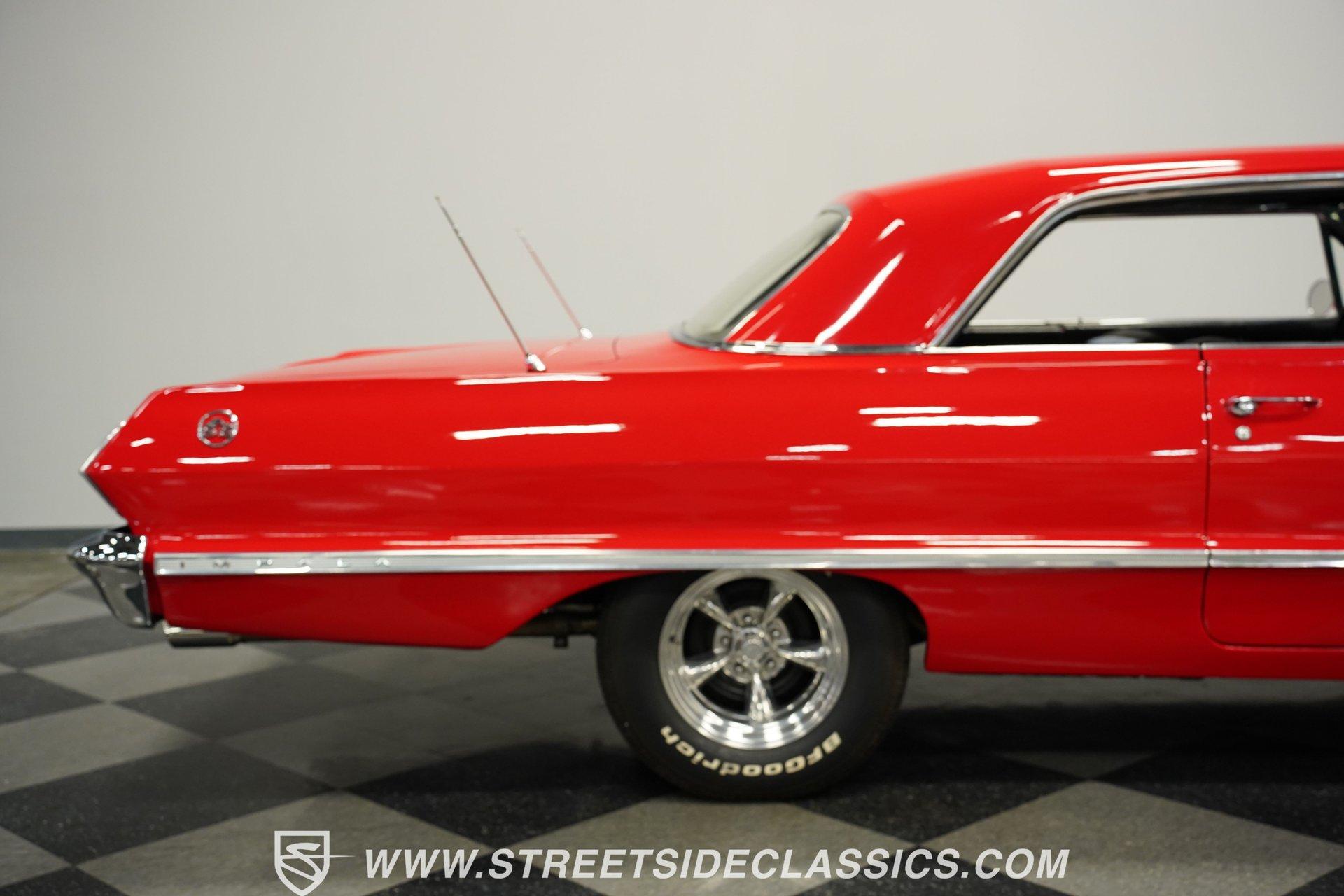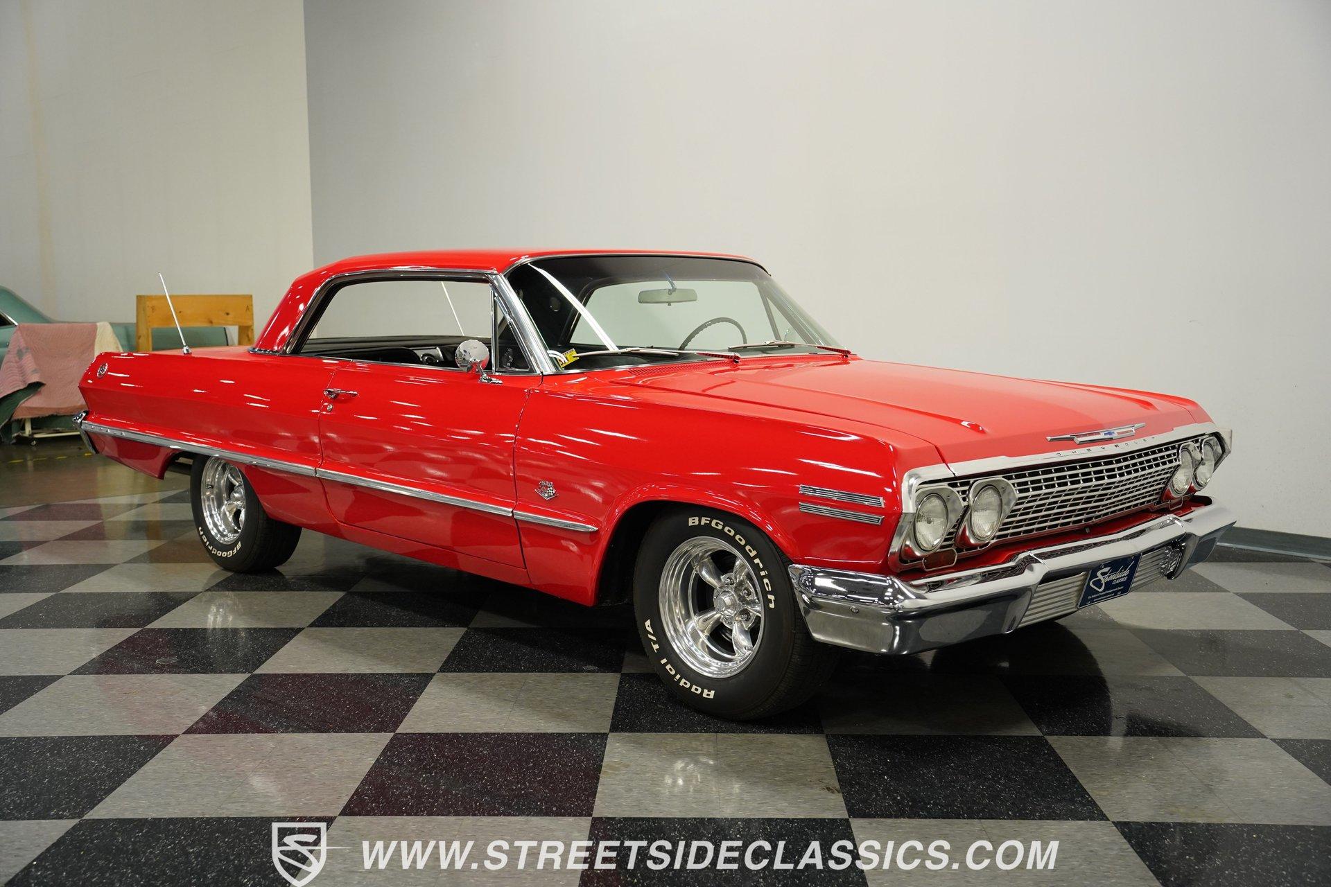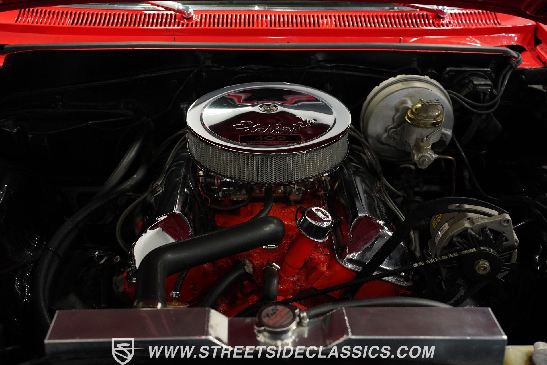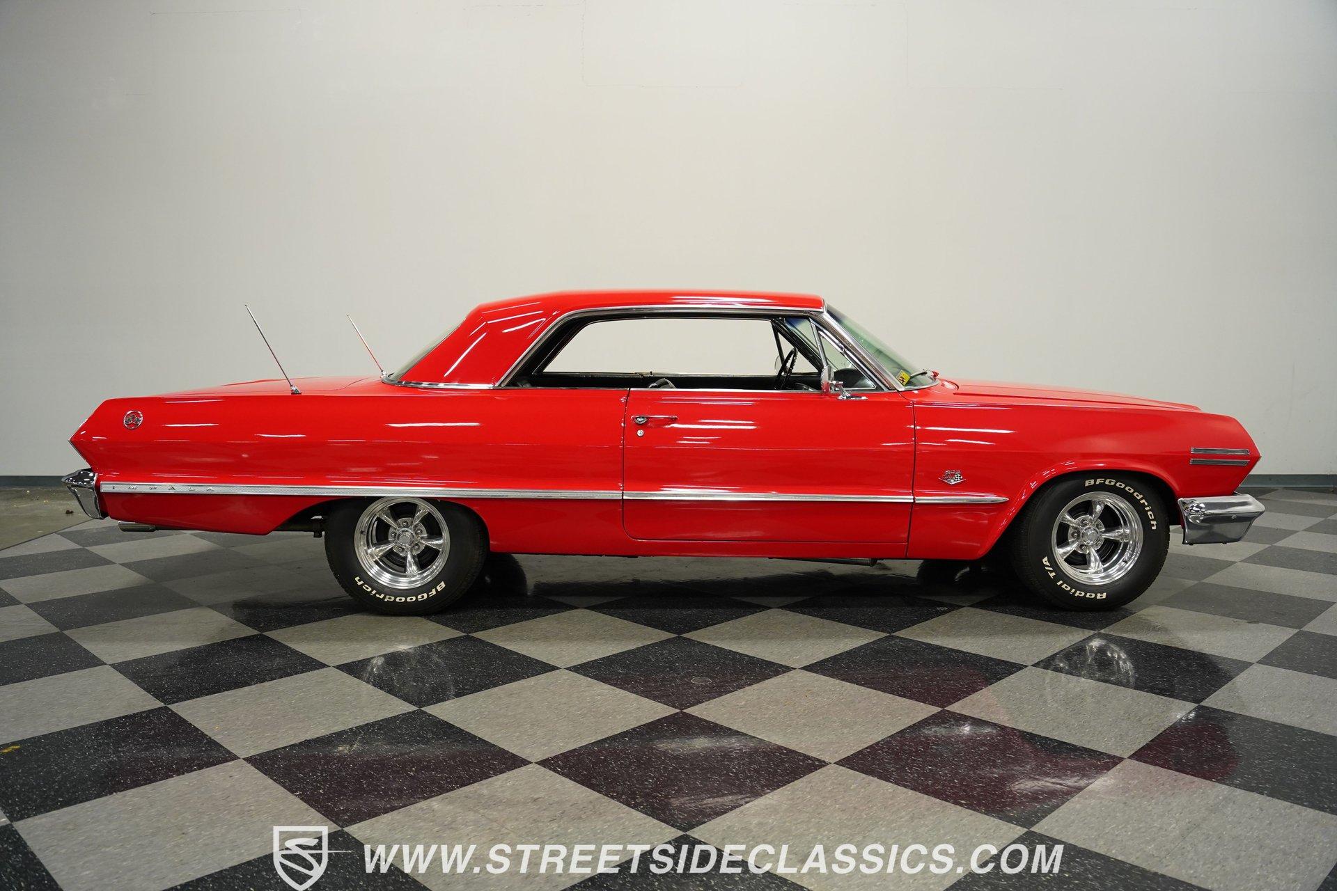 For the Beach Boys to write a hit song about an engine, it had to be a special motor attached to a special kind of car. This numbers-matching 1963 Chevrolet Impala SS 409, decked out in a fabulous full bright red repaint, stretches out over its two-door coupe configuration, showcasing its straight lines, shimmering chrome, and dual-triplet taillight arrangement. Inside, we find a mostly stock restored black vinyl interior. A center console separates the dual bucket seats, while the old-school two-spoke, power-assisted steering wheel is contrasted by the upgraded, cool-blue-hued Dakota Digital dashboard, featuring an 8,000 rpm tachometer and a 160 mph speedometer. Offset to the passenger side of the car is a quartet of matching auxiliary gauges, separated by a centrally-located digital speedometer to complete the look. A Retrosound AM/FM uses a digital display, while the sliding HVAC controls ensure at least some of this Impala's interior stays in the 1960s. Under that expansive hood, we find out what all the fuss is about. Centered inside a very clean engine bay sits a numbers-matching 409 cubic-inch V-8 engine. Part of Chevy's famous W-series big block motor family, this 409 has been painted old-school orange, with plenty of chrome accents. Topped with a single four-barrel Edelbrock carburetor, spent gases are expelled via a true-dual exhaust setup capped off with a set of chrome exhaust tips. Power is routed through a 700R4 four-speed automatic transmission before heading out to the factory-style rear end that transfers those ponies to the pavement through a set of beautiful, polished five-spoke American Racing Torq Thrust wheels shod in P235/70R-15 BF Goodrich radials. *Numbers Matching 409 *Edelbrock Four Barrel *700R4 Four Speed Auto *Power Brakes *American Racing Wheels *Dual Exhaust *Power Steering *Tilt Column *Dakota Digital Dashboard *Retrosound Radio *Kick Panel Speakers This 1963 Chevrolet Impala SS 409 rides on a traditional coil and shock suspension, accompanied by an old-school live axle rear, while power-assisted brakes help rein in speed whenever called upon. So, if owning a 409-powered Impala has been on your bucket list and you've saved your pennies and saved your dimes, then maybe it's time you buy a (not quite) brand new 409! Don't wait, call today!