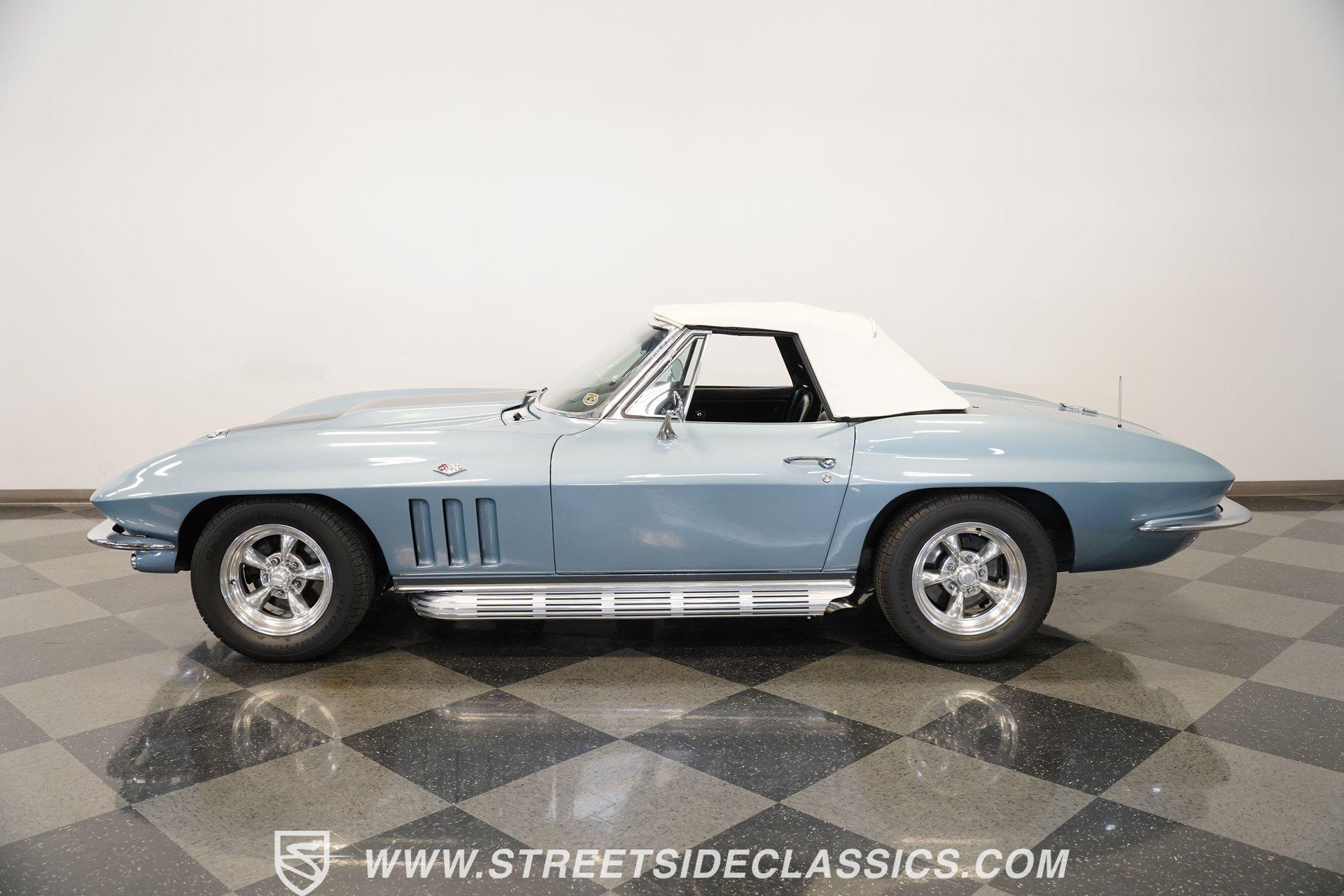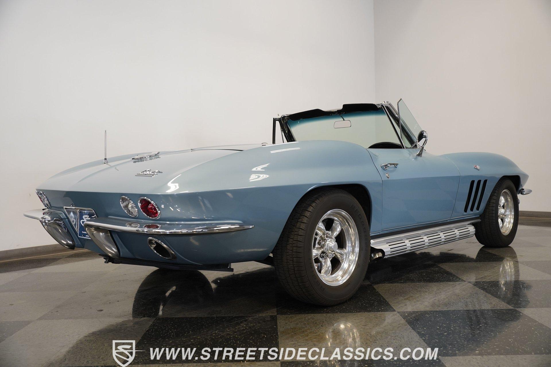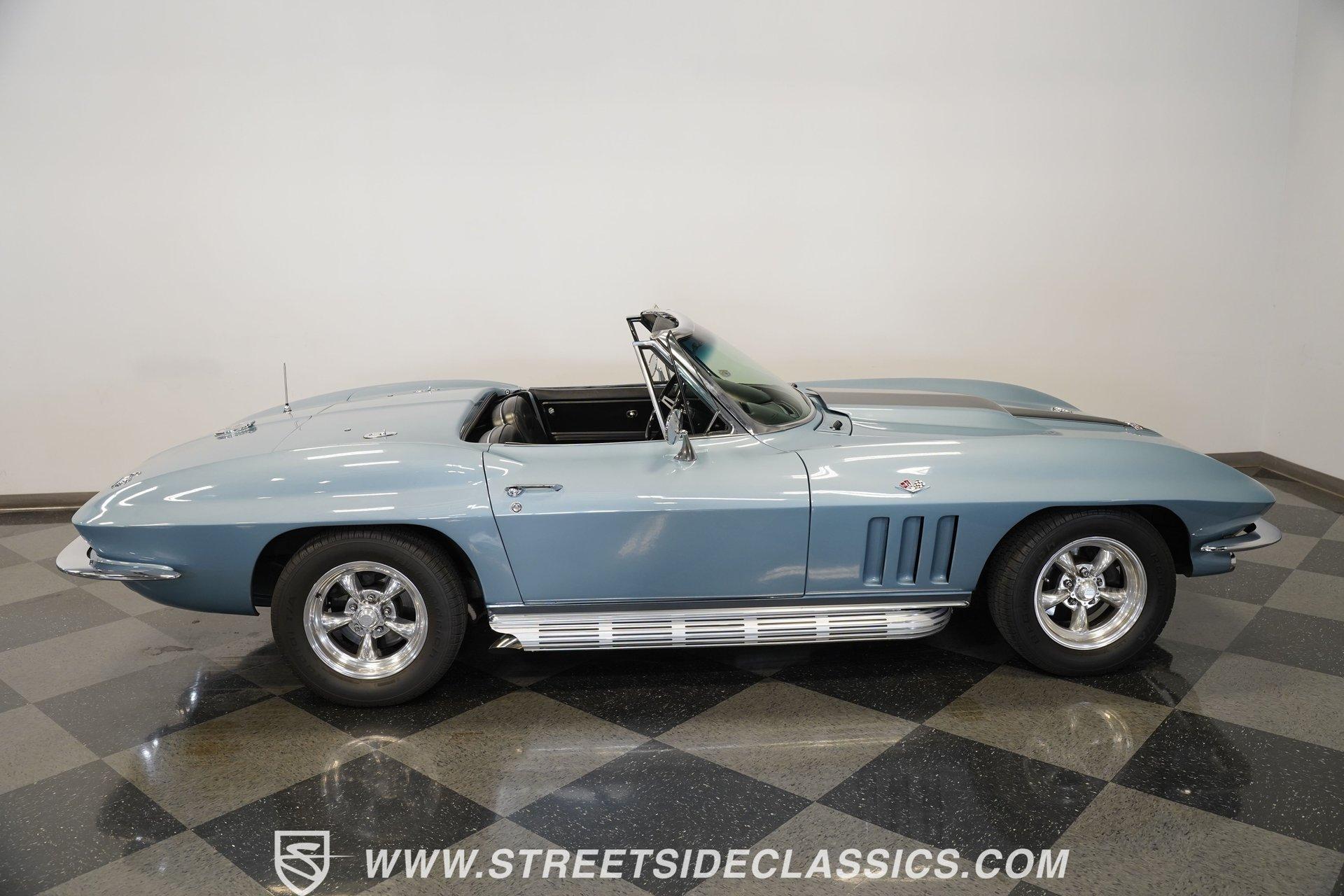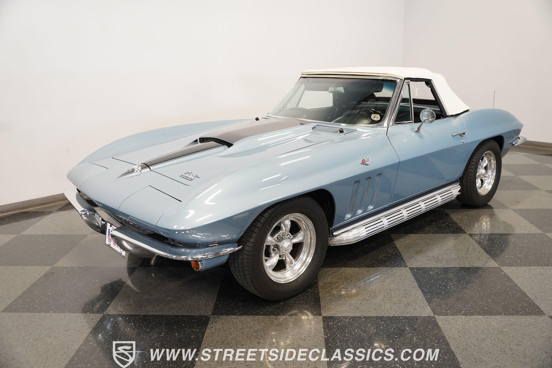 Outfitted with a 1967 big block hood and finished in Laguna Blue, this 1966 Chevrolet Corvette Convertible carries the right kind of attitude. The white canvas convertible top sets off the body color cleanly, while a black stripe draws a crisp line across the hood and deck. Aluminum American Racing 15-inch wheels hold to the pavement with 225/60R15 BFG Radial T/A tires. The stance is low and level, with side pipes stretching beneath the doors. Inside, this vehicle sticks to its black vinyl roots with bucket seats, matching door panels, and a clean black dash. A center console anchors the space, with a shifter showing a 5-speed pattern sticker-though what lies beneath tells a different story. Trim code 418 confirms its stock style approach, and a classic AM/FM radio rounds things out. Power steering makes life easier, and everything stays on theme. A 350 cubic inch V8 sits under the 1967-style hood, topped with a Holley Brawler 4-barrel carb on a Weiand intake. The shorty headers feed into those unmistakable side pipes. Backing the small block is a 700R4 4-speed automatic transmission. Independent suspension front and rear with mono leafs helps keep things civilized, while four-wheel disc brakes manage the stopping. The aluminum radiator sits up front to keep temps in check. HIGHLIGHTS 350 V8 Engine Holley Brawler 4-Barrel Carburetor Weiand Intake Manifold 700R4 4-Speed Automatic Transmission Aluminum Radiator McJacks Shorty Headers Side Pipe Exhaust Four-Wheel Disc Brakes Laguna Blue Paint 1967 Big Block Hood White Canvas Convertible Top 15" American Racing Aluminum Wheels 225/60R15 BFG Radial T/A Tires Black Interior With Bucket Seats Center Console With 5-Speed Pattern Sticker Power Steering AM/FM Radio This 1966 Chevrolet Corvette Convertible blends classic looks with tasteful upgrades and a small block that's ready to move. A factory feel with a few surprises beneath the skin makes it a car worth grabbing while it's available. Call today!