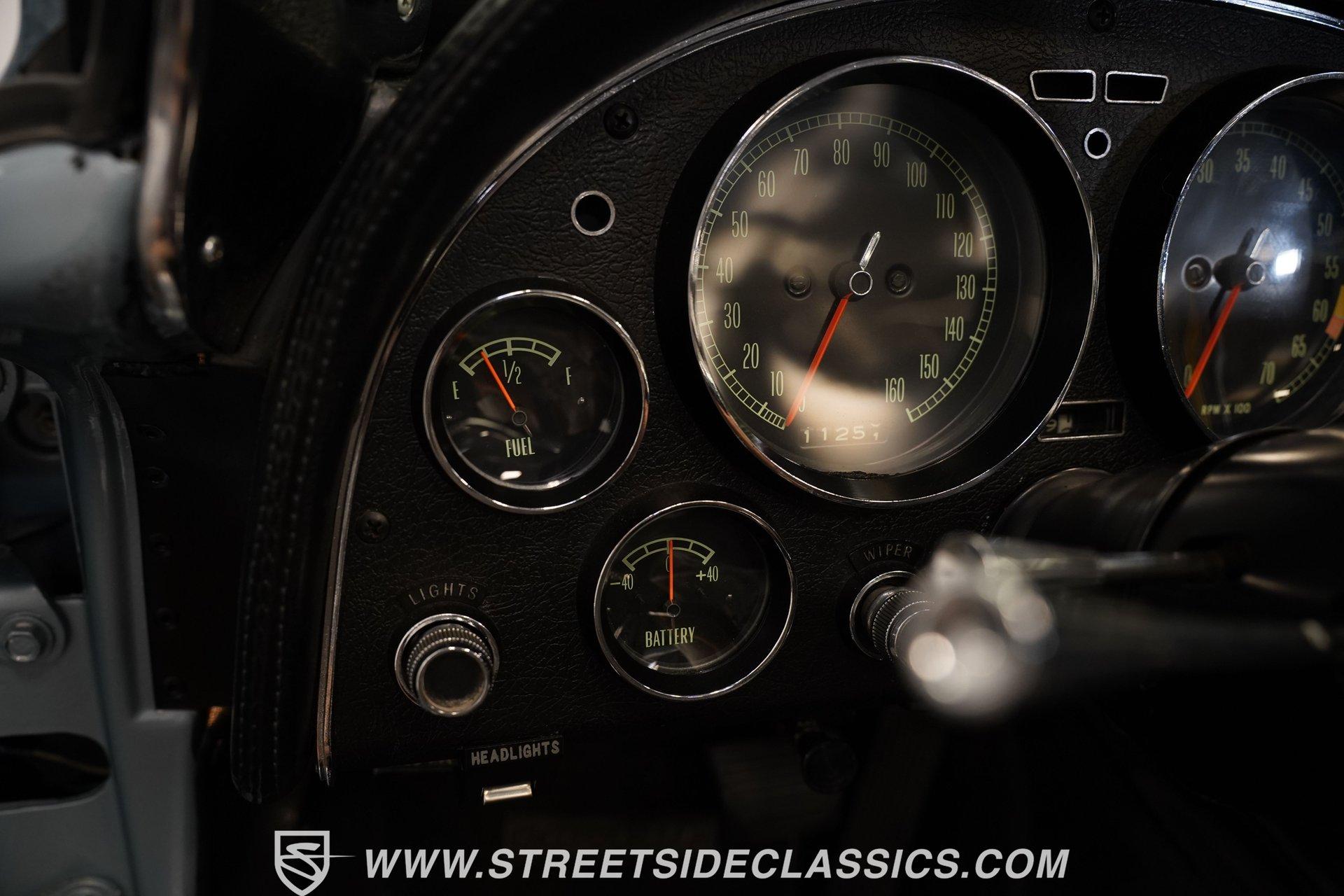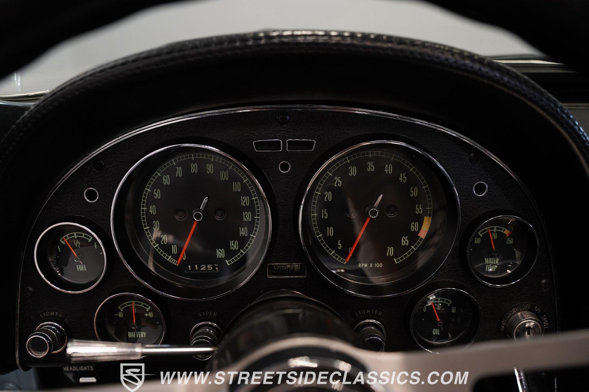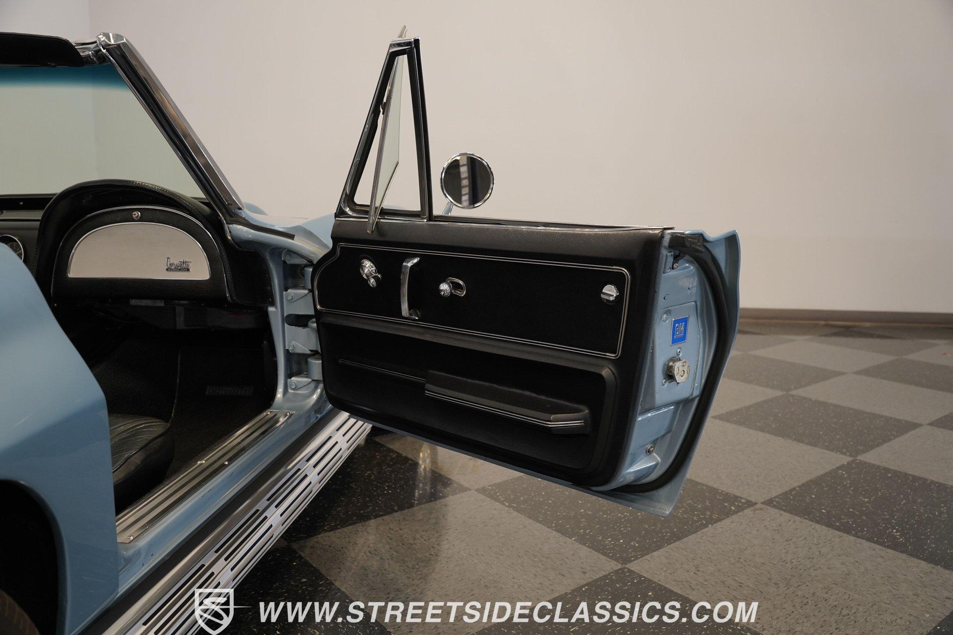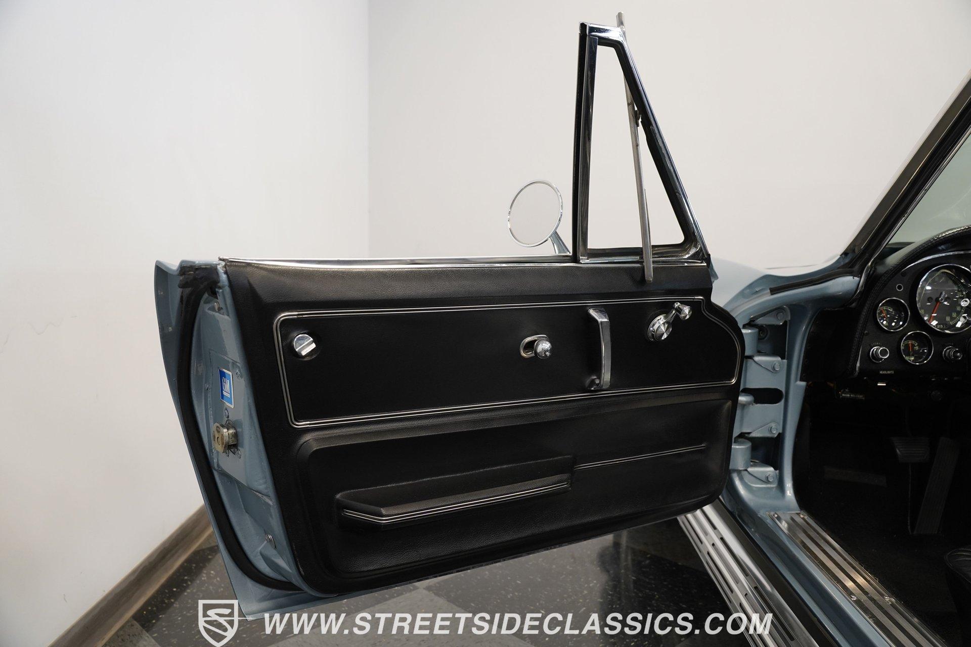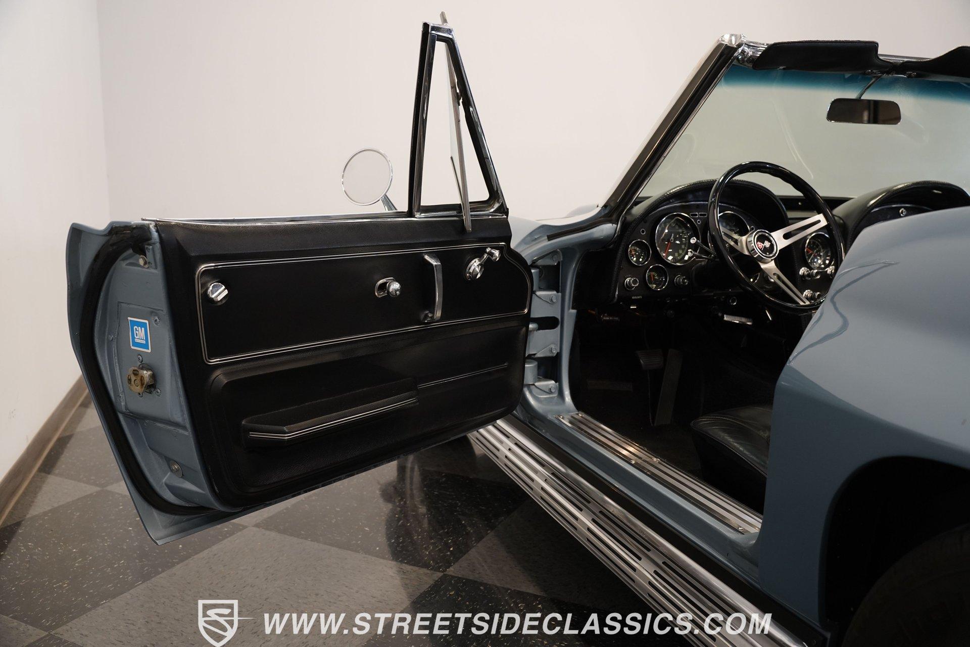 Outfitted with a 1967 big block hood and finished in Laguna Blue, this 1966 Chevrolet Corvette Convertible carries the right kind of attitude. The white canvas convertible top sets off the body color cleanly, while a black stripe draws a crisp line across the hood and deck. Aluminum American Racing 15-inch wheels hold to the pavement with 225/60R15 BFG Radial T/A tires. The stance is low and level, with side pipes stretching beneath the doors. Inside, this vehicle sticks to its black vinyl roots with bucket seats, matching door panels, and a clean black dash. A center console anchors the space, with a shifter showing a 5-speed pattern sticker-though what lies beneath tells a different story. Trim code 418 confirms its stock style approach, and a classic AM/FM radio rounds things out. Power steering makes life easier, and everything stays on theme. A 350 cubic inch V8 sits under the 1967-style hood, topped with a Holley Brawler 4-barrel carb on a Weiand intake. The shorty headers feed into those unmistakable side pipes. Backing the small block is a 700R4 4-speed automatic transmission. Independent suspension front and rear with mono leafs helps keep things civilized, while four-wheel disc brakes manage the stopping. The aluminum radiator sits up front to keep temps in check. HIGHLIGHTS 350 V8 Engine Holley Brawler 4-Barrel Carburetor Weiand Intake Manifold 700R4 4-Speed Automatic Transmission Aluminum Radiator McJacks Shorty Headers Side Pipe Exhaust Four-Wheel Disc Brakes Laguna Blue Paint 1967 Big Block Hood White Canvas Convertible Top 15" American Racing Aluminum Wheels 225/60R15 BFG Radial T/A Tires Black Interior With Bucket Seats Center Console With 5-Speed Pattern Sticker Power Steering AM/FM Radio This 1966 Chevrolet Corvette Convertible blends classic looks with tasteful upgrades and a small block that's ready to move. A factory feel with a few surprises beneath the skin makes it a car worth grabbing while it's available. Call today!