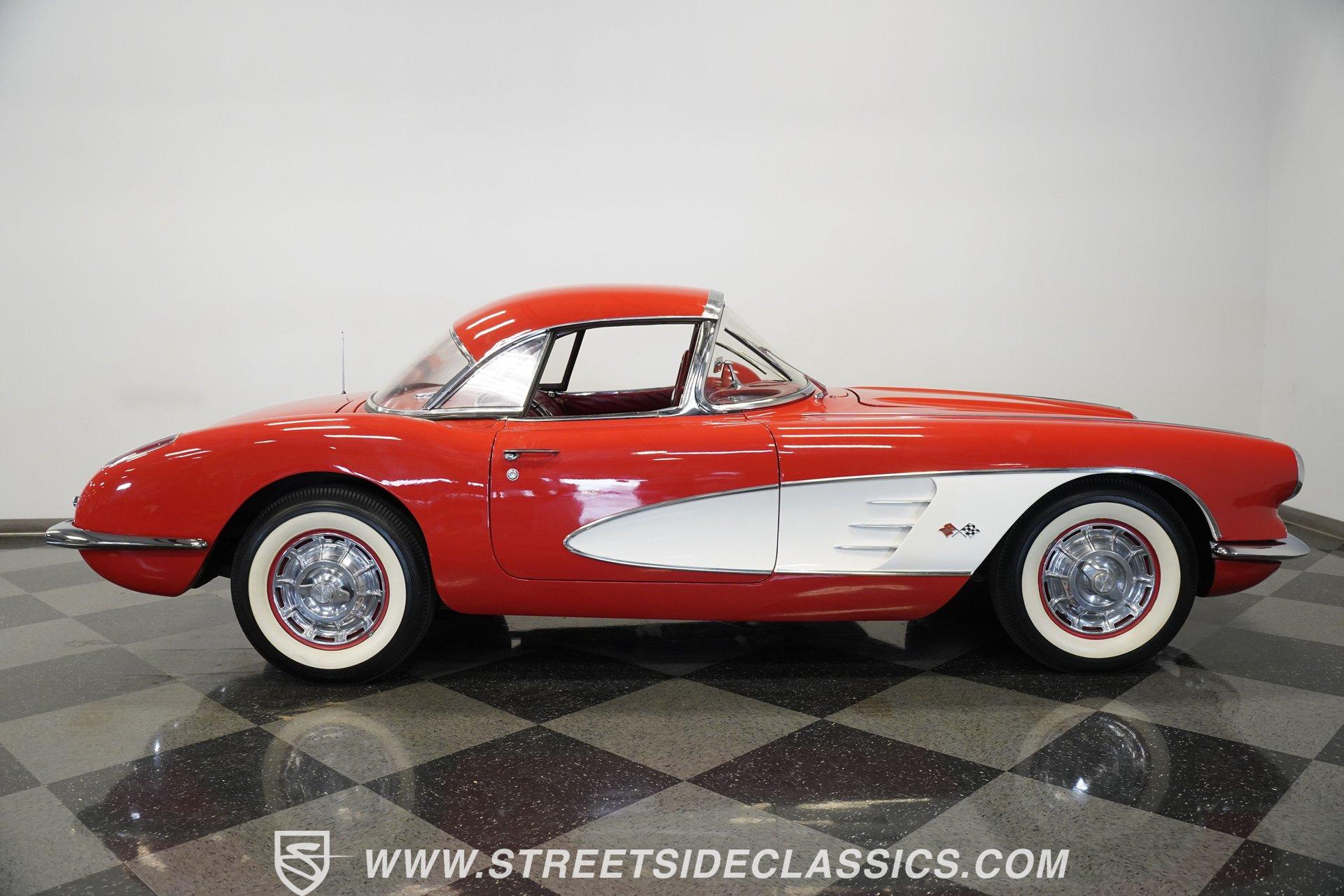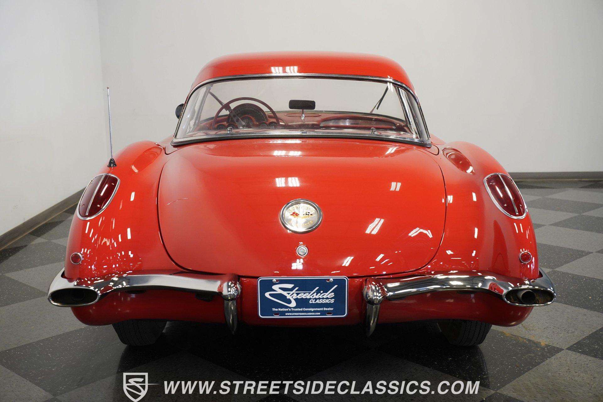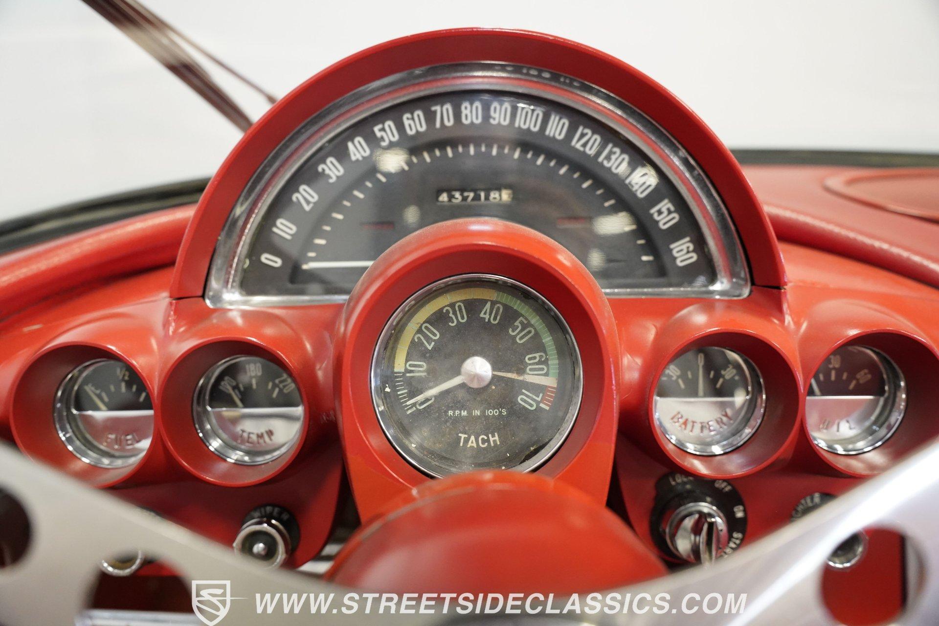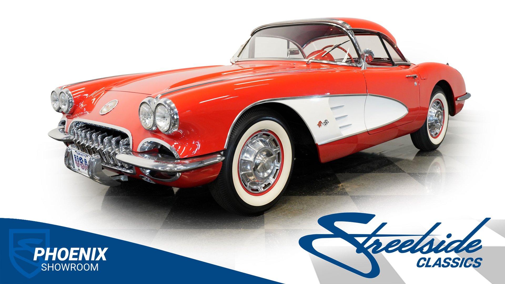 In the eight generations of the Corvette, determining which cars are the most collectible usually revolves around firsts and lasts. Generally speaking, a 'Vette that is the first to introduce something or the last to say goodbye to some aspect of Chevy's flagship tends to resonate with enthusiasts everywhere. This particular 1960 Chevrolet Corvette, fully repainted in eye-catching Roman Red, with its white canvas top and removable body-color hard top, is a stellar example of a first-generation car. With its numbers-matching engine, the 1960 model is the final year before the Corvette changed over to its quad-taillight setup, making it a noteworthy C1. Inside, we find a clean, stock-looking red interior. Dual bucket seats offer an expansive view of the fast-approaching road ahead for both the driver and passenger. A three-spoke, red-rimmed steering wheel sits in front of a classic six-pod C1 dashboard, featuring a large, half-moon 160 mph speedometer and a 7,000-rpm tachometer positioned front and center for the driver, flanked by a pair of auxiliary gauges on either side. Although non-functional at check-in, the original Wonderbar AM radio still looks plenty cool sitting above the three HVAC knobs and big analog clock. The passenger gets a red expletive-bar with a Corvette logo just beyond it. Under that signature front-hinged hood, we find a numbers-matching 283 cubic-inch V-8 engine. Topped with a set of dual-quad Carter carburetors sitting on a factory intake manifold feed that vintage small block, while a dual exhaust sends spent gases out through a set of factory-style replacement mufflers to allow this 'Vette to sound just the way it did three-quarters of a century ago. Those 270 advertised horsepower are routed through a Borg Warner T10 four-speed manual transmission before being sent out to a GM 55p drop-out style rear end, which transfers power to the pavement via a set of fifteen-inch red steel wheels, complete with Corvette hubcaps, shod in BFG Silvertown white-wall tires. *Numbers Matching 283 V8 *270 Advertised Horsepower *Dual Quad Carter Carbs *Borg Warner T10 *Four On The Floor *Drop Out Rear End *Steel Wheels *White Wall Tires *Full Roman Red Repaint *Removable Hardtop *Clean Factory Interior *Final Year Fender Mounted Tailights Riding on a suspension consisting of an independent setup in front and a solid axle/leaf spring rear configuration out back, this 1960 Chevrolet Corvette shares, along with all other C1's, the distinction of having a solid axle rear and drum brakes before the C2 came along with an independent rear and disc brakes in 1963 and 1965, respectively. If you've always wanted to join the vaunted Corvette Club, this 1960 model comes with the notoriety of being the first generation of this heralded line, and the last 'Vette to offer fender-mounted taillights. Don't wait, call today!