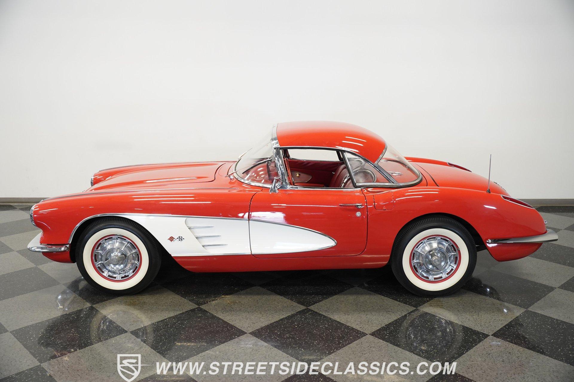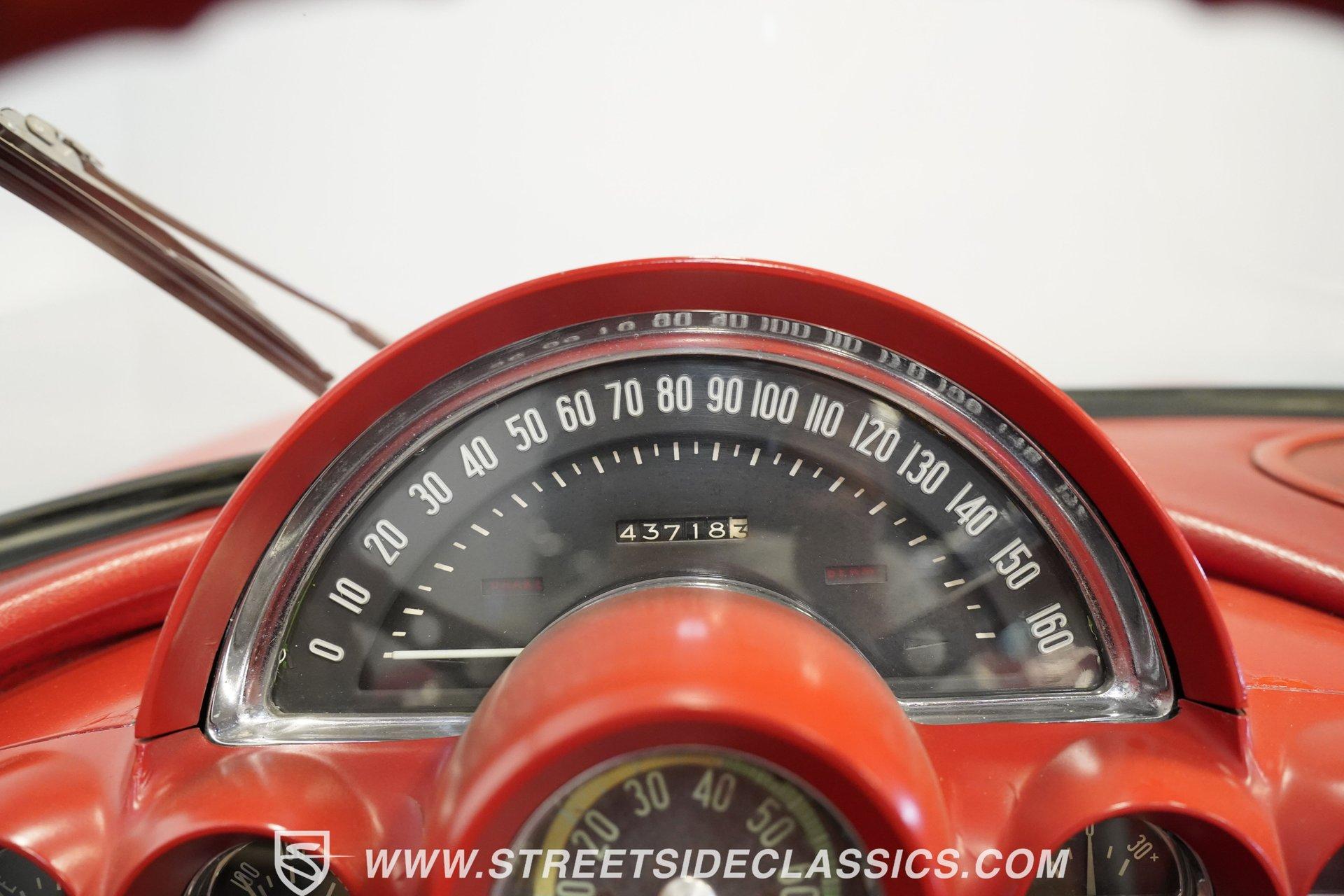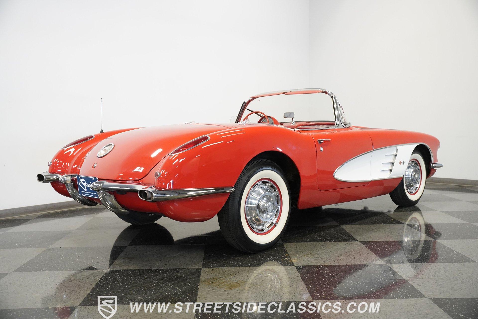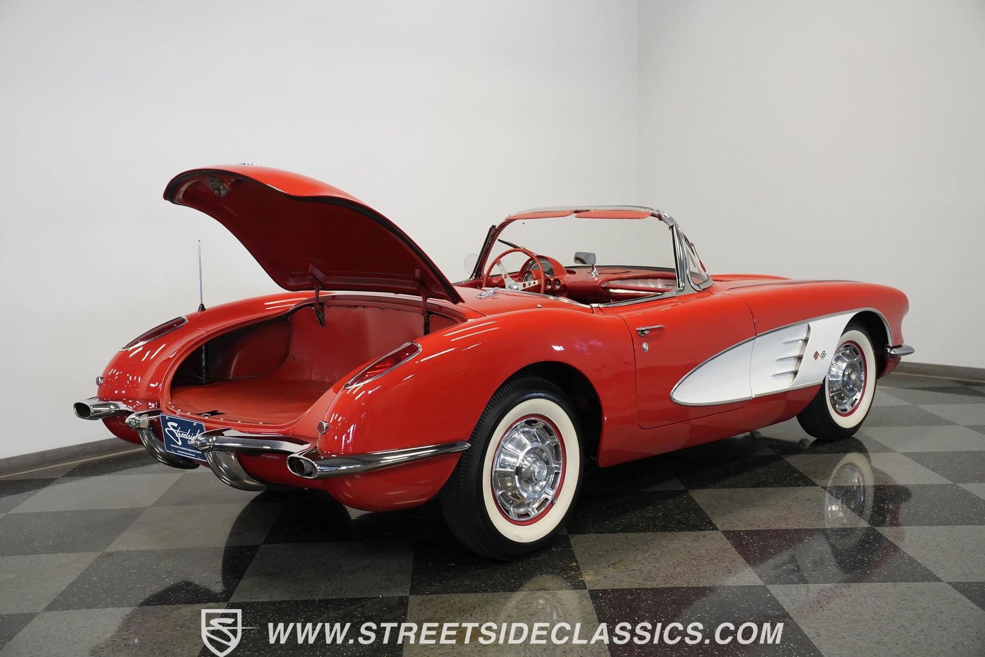 In the eight generations of the Corvette, determining which cars are the most collectible usually revolves around firsts and lasts. Generally speaking, a 'Vette that is the first to introduce something or the last to say goodbye to some aspect of Chevy's flagship tends to resonate with enthusiasts everywhere. This particular 1960 Chevrolet Corvette, fully repainted in eye-catching Roman Red, with its white canvas top and removable body-color hard top, is a stellar example of a first-generation car. With its numbers-matching engine, the 1960 model is the final year before the Corvette changed over to its quad-taillight setup, making it a noteworthy C1. Inside, we find a clean, stock-looking red interior. Dual bucket seats offer an expansive view of the fast-approaching road ahead for both the driver and passenger. A three-spoke, red-rimmed steering wheel sits in front of a classic six-pod C1 dashboard, featuring a large, half-moon 160 mph speedometer and a 7,000-rpm tachometer positioned front and center for the driver, flanked by a pair of auxiliary gauges on either side. Although non-functional at check-in, the original Wonderbar AM radio still looks plenty cool sitting above the three HVAC knobs and big analog clock. The passenger gets a red expletive-bar with a Corvette logo just beyond it. Under that signature front-hinged hood, we find a numbers-matching 283 cubic-inch V-8 engine. Topped with a set of dual-quad Carter carburetors sitting on a factory intake manifold feed that vintage small block, while a dual exhaust sends spent gases out through a set of factory-style replacement mufflers to allow this 'Vette to sound just the way it did three-quarters of a century ago. Those 270 advertised horsepower are routed through a Borg Warner T10 four-speed manual transmission before being sent out to a GM 55p drop-out style rear end, which transfers power to the pavement via a set of fifteen-inch red steel wheels, complete with Corvette hubcaps, shod in BFG Silvertown white-wall tires. *Numbers Matching 283 V8 *270 Advertised Horsepower *Dual Quad Carter Carbs *Borg Warner T10 *Four On The Floor *Drop Out Rear End *Steel Wheels *White Wall Tires *Full Roman Red Repaint *Removable Hardtop *Clean Factory Interior *Final Year Fender Mounted Tailights Riding on a suspension consisting of an independent setup in front and a solid axle/leaf spring rear configuration out back, this 1960 Chevrolet Corvette shares, along with all other C1's, the distinction of having a solid axle rear and drum brakes before the C2 came along with an independent rear and disc brakes in 1963 and 1965, respectively. If you've always wanted to join the vaunted Corvette Club, this 1960 model comes with the notoriety of being the first generation of this heralded line, and the last 'Vette to offer fender-mounted taillights. Don't wait, call today!