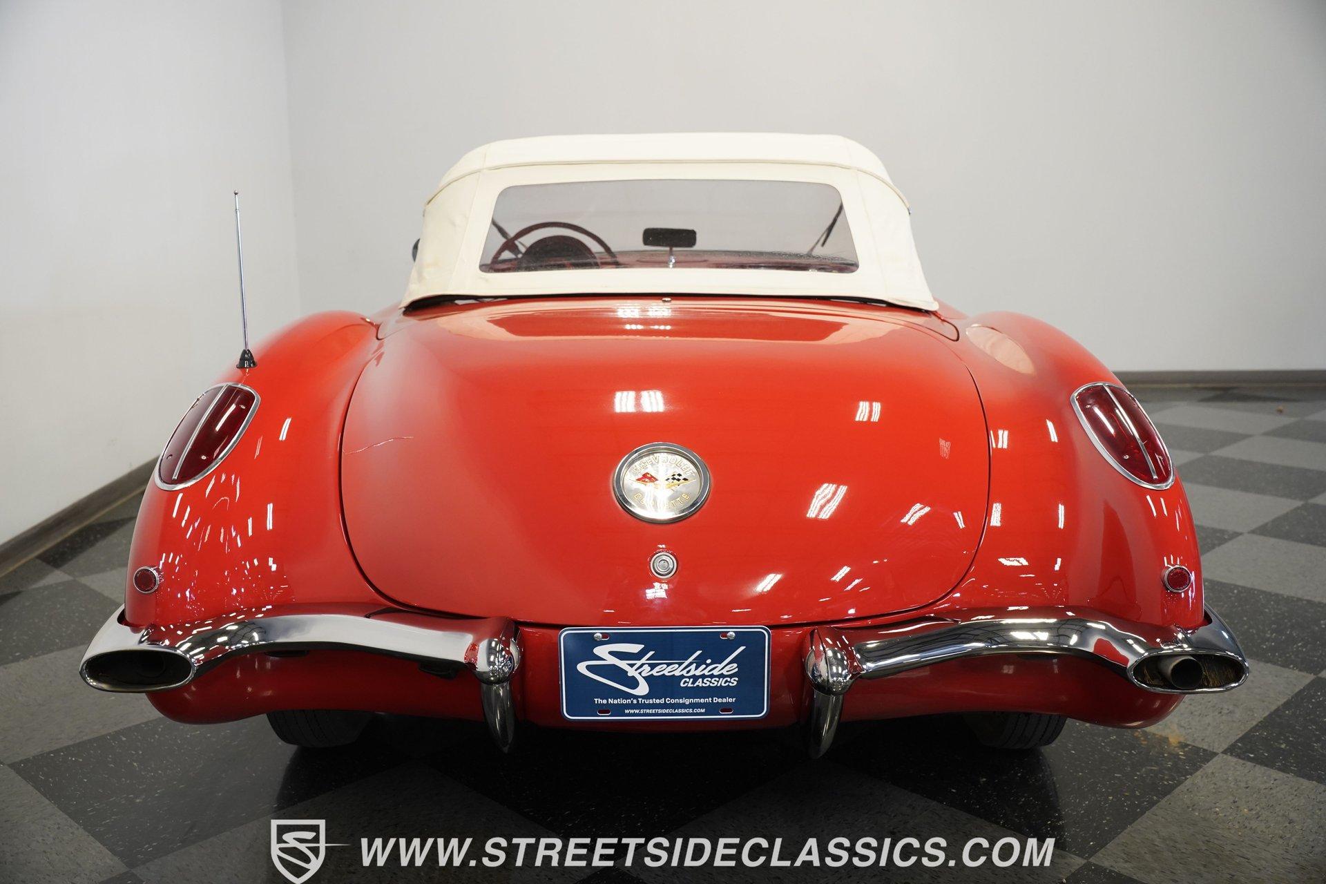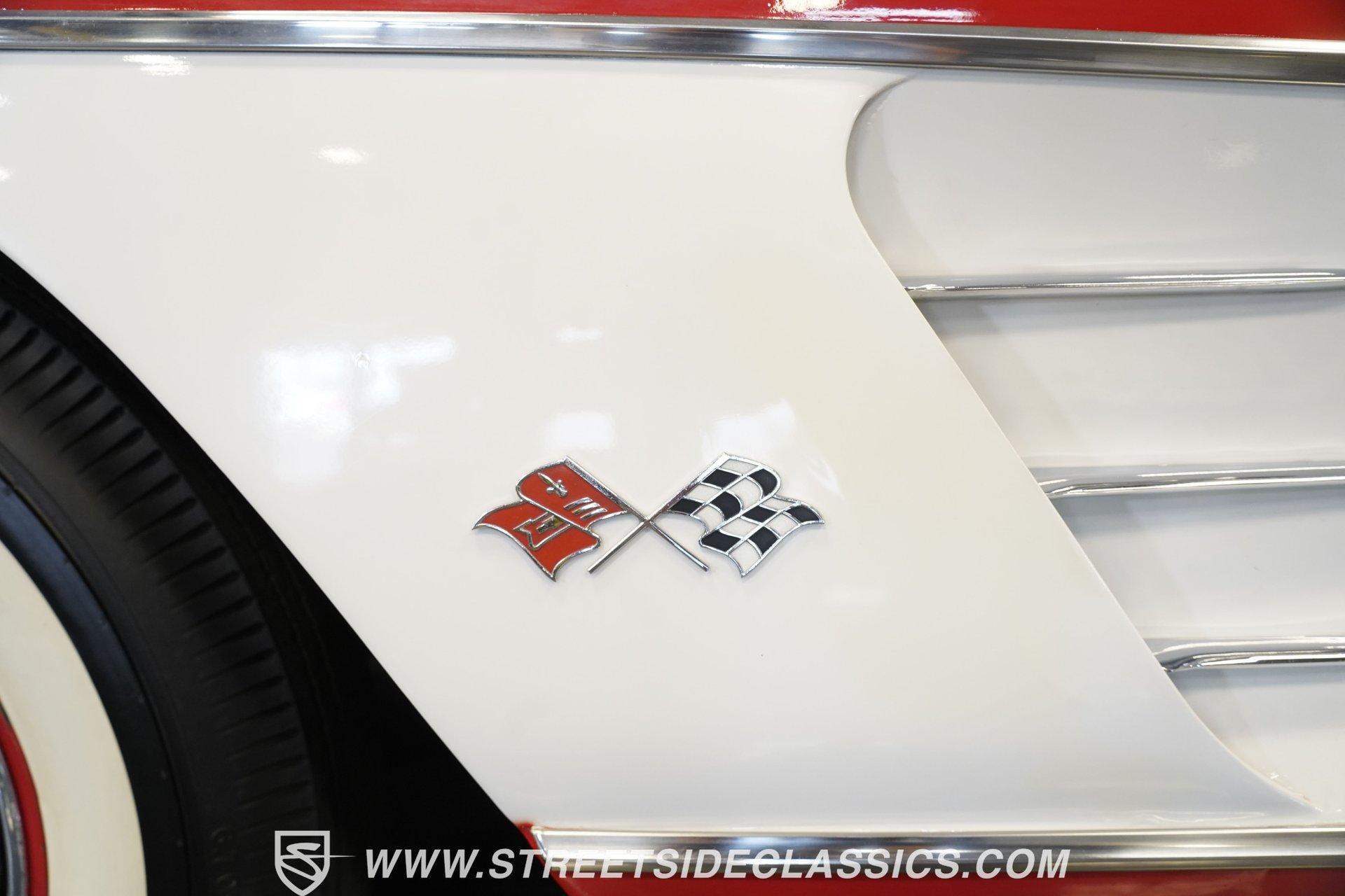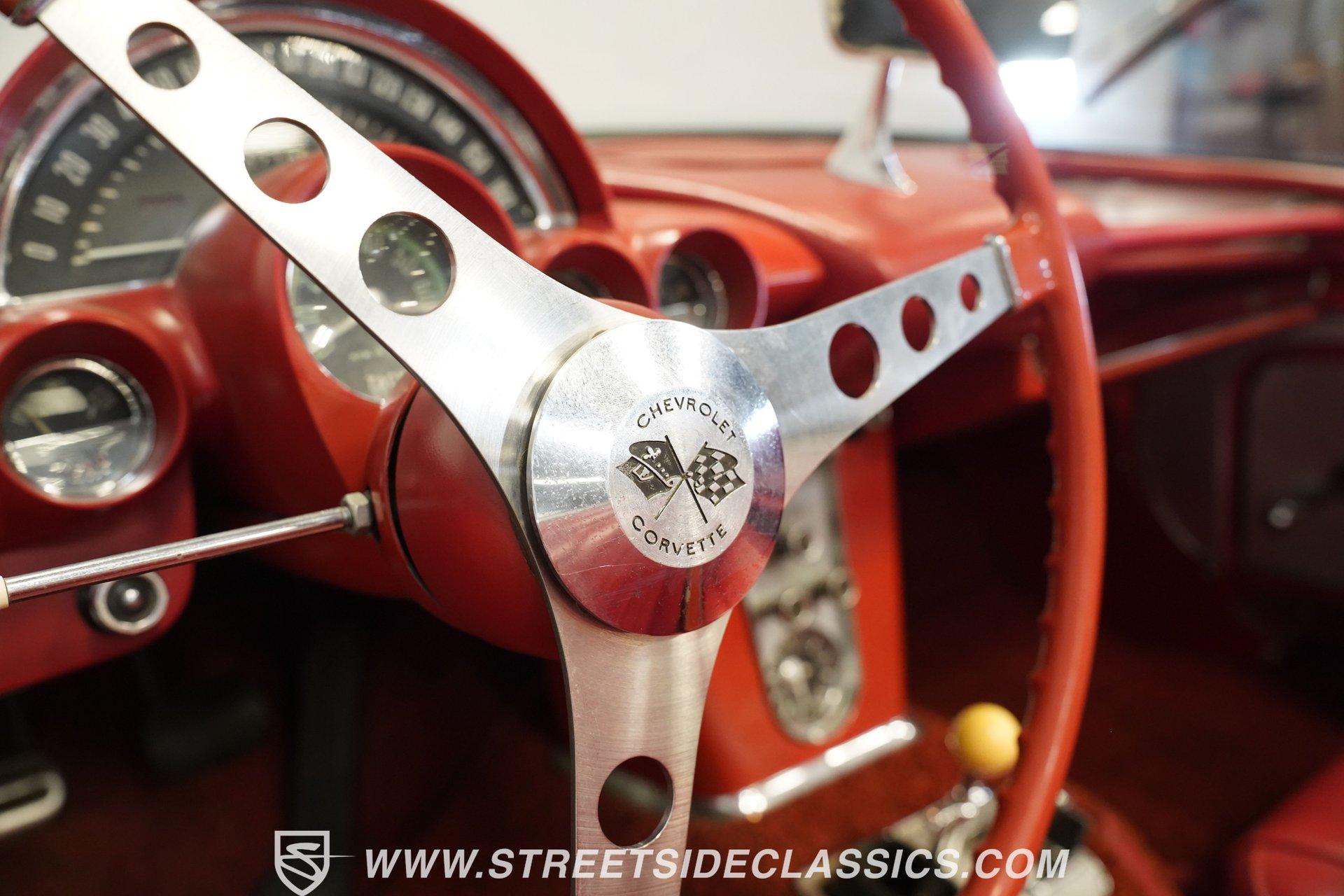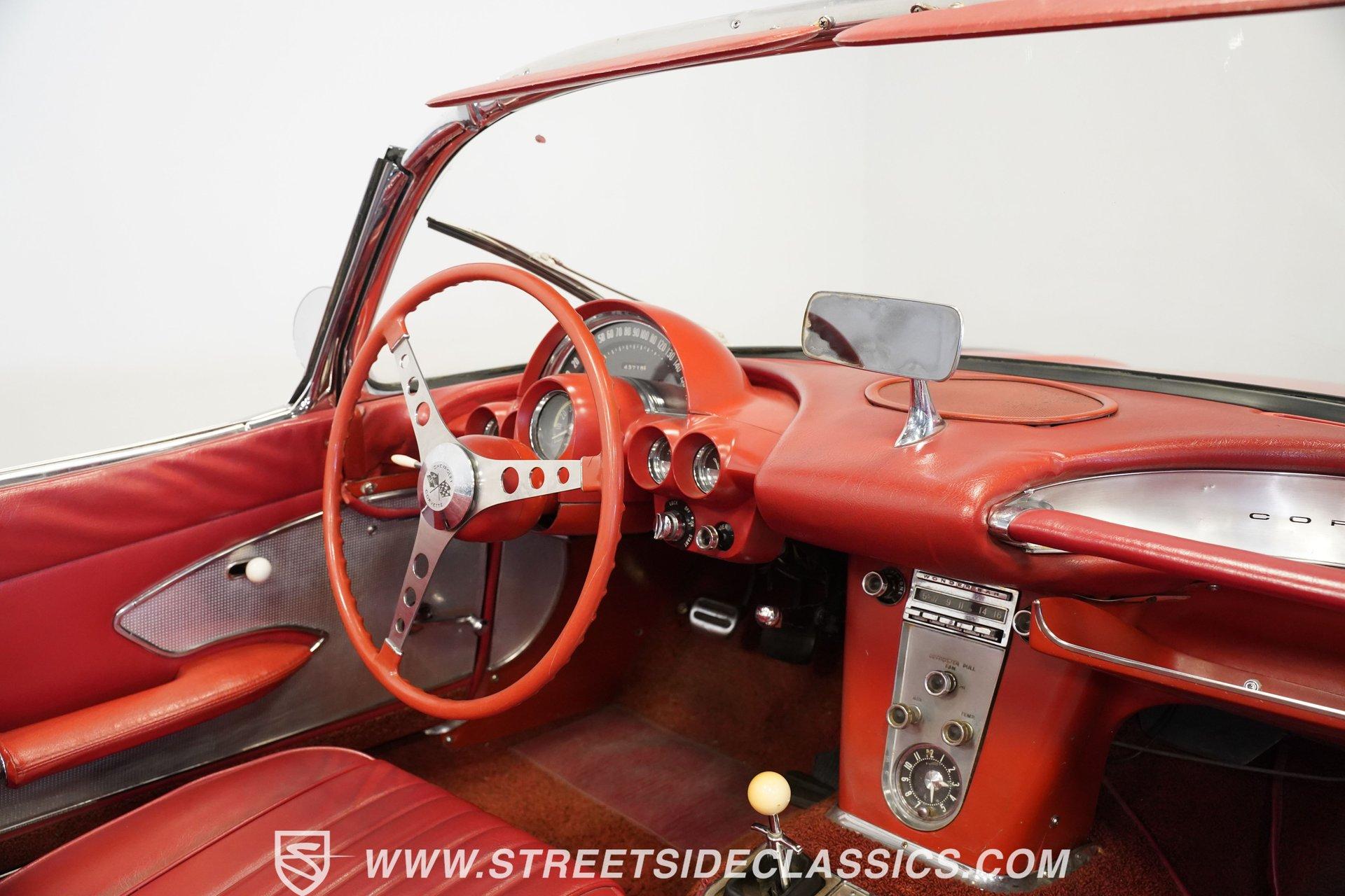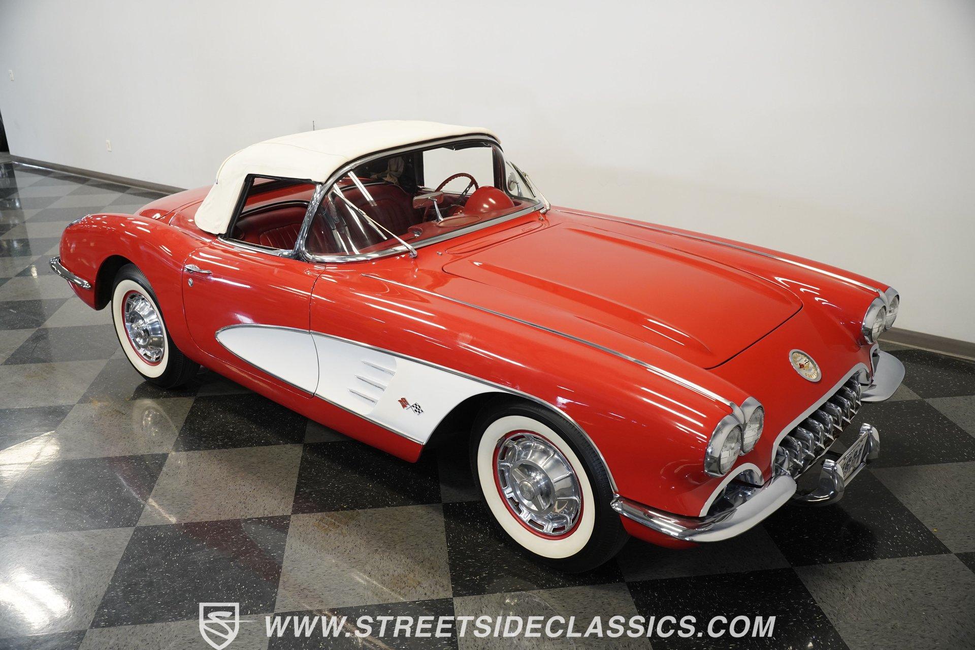 In the eight generations of the Corvette, determining which cars are the most collectible usually revolves around firsts and lasts. Generally speaking, a 'Vette that is the first to introduce something or the last to say goodbye to some aspect of Chevy's flagship tends to resonate with enthusiasts everywhere. This particular 1960 Chevrolet Corvette, fully repainted in eye-catching Roman Red, with its white canvas top and removable body-color hard top, is a stellar example of a first-generation car. With its numbers-matching engine, the 1960 model is the final year before the Corvette changed over to its quad-taillight setup, making it a noteworthy C1. Inside, we find a clean, stock-looking red interior. Dual bucket seats offer an expansive view of the fast-approaching road ahead for both the driver and passenger. A three-spoke, red-rimmed steering wheel sits in front of a classic six-pod C1 dashboard, featuring a large, half-moon 160 mph speedometer and a 7,000-rpm tachometer positioned front and center for the driver, flanked by a pair of auxiliary gauges on either side. Although non-functional at check-in, the original Wonderbar AM radio still looks plenty cool sitting above the three HVAC knobs and big analog clock. The passenger gets a red expletive-bar with a Corvette logo just beyond it. Under that signature front-hinged hood, we find a numbers-matching 283 cubic-inch V-8 engine. Topped with a set of dual-quad Carter carburetors sitting on a factory intake manifold feed that vintage small block, while a dual exhaust sends spent gases out through a set of factory-style replacement mufflers to allow this 'Vette to sound just the way it did three-quarters of a century ago. Those 270 advertised horsepower are routed through a Borg Warner T10 four-speed manual transmission before being sent out to a GM 55p drop-out style rear end, which transfers power to the pavement via a set of fifteen-inch red steel wheels, complete with Corvette hubcaps, shod in BFG Silvertown white-wall tires. *Numbers Matching 283 V8 *270 Advertised Horsepower *Dual Quad Carter Carbs *Borg Warner T10 *Four On The Floor *Drop Out Rear End *Steel Wheels *White Wall Tires *Full Roman Red Repaint *Removable Hardtop *Clean Factory Interior *Final Year Fender Mounted Tailights Riding on a suspension consisting of an independent setup in front and a solid axle/leaf spring rear configuration out back, this 1960 Chevrolet Corvette shares, along with all other C1's, the distinction of having a solid axle rear and drum brakes before the C2 came along with an independent rear and disc brakes in 1963 and 1965, respectively. If you've always wanted to join the vaunted Corvette Club, this 1960 model comes with the notoriety of being the first generation of this heralded line, and the last 'Vette to offer fender-mounted taillights. Don't wait, call today!