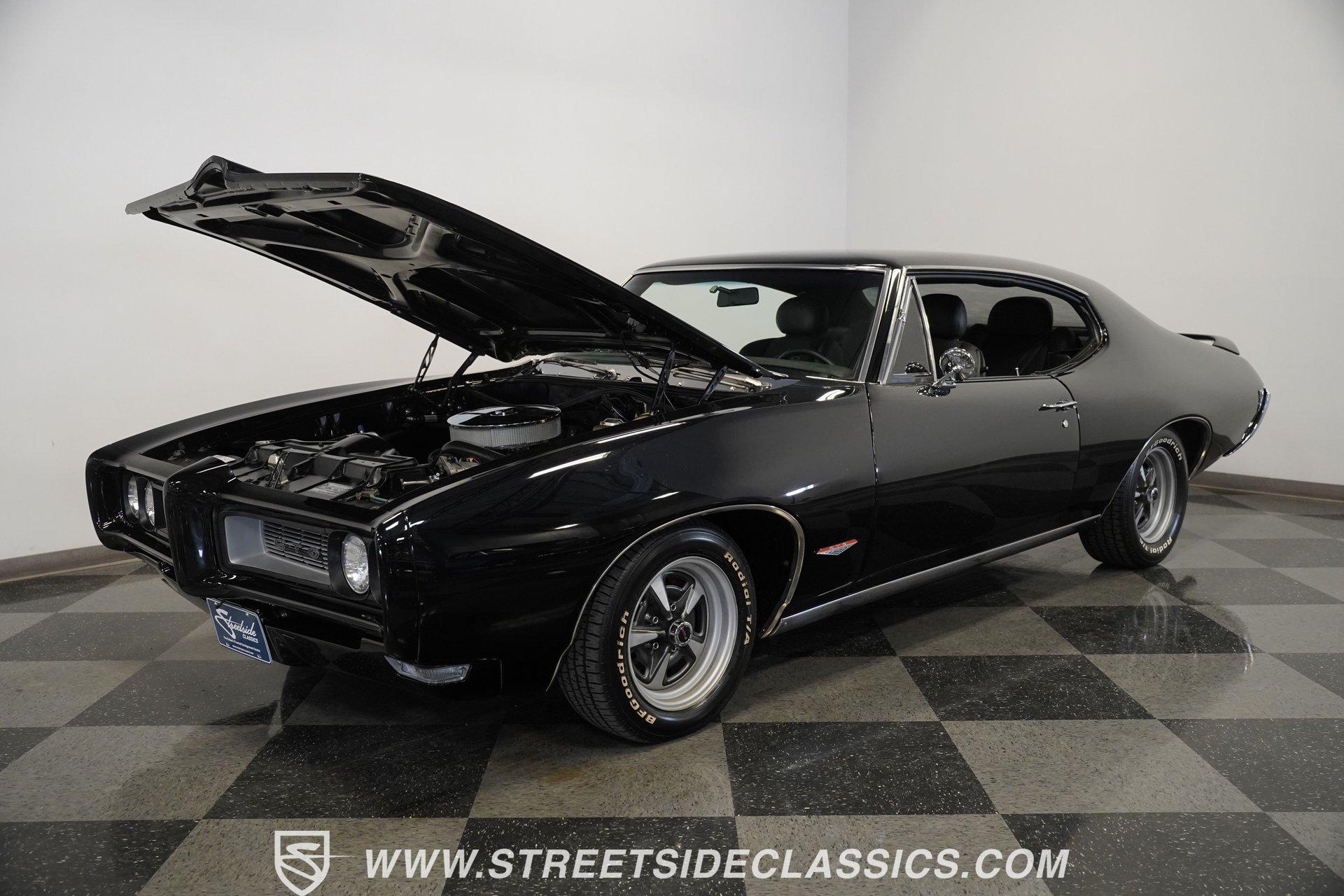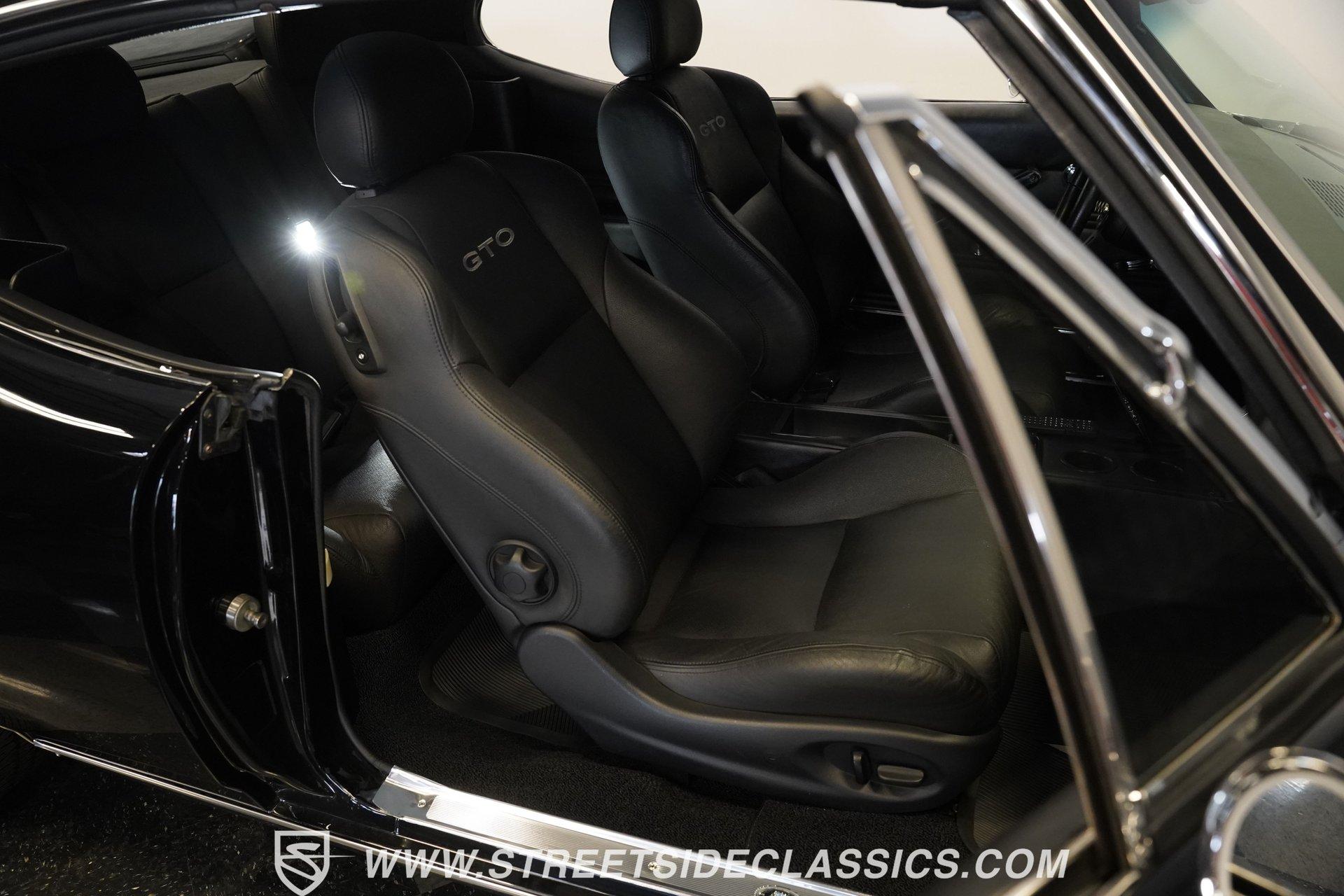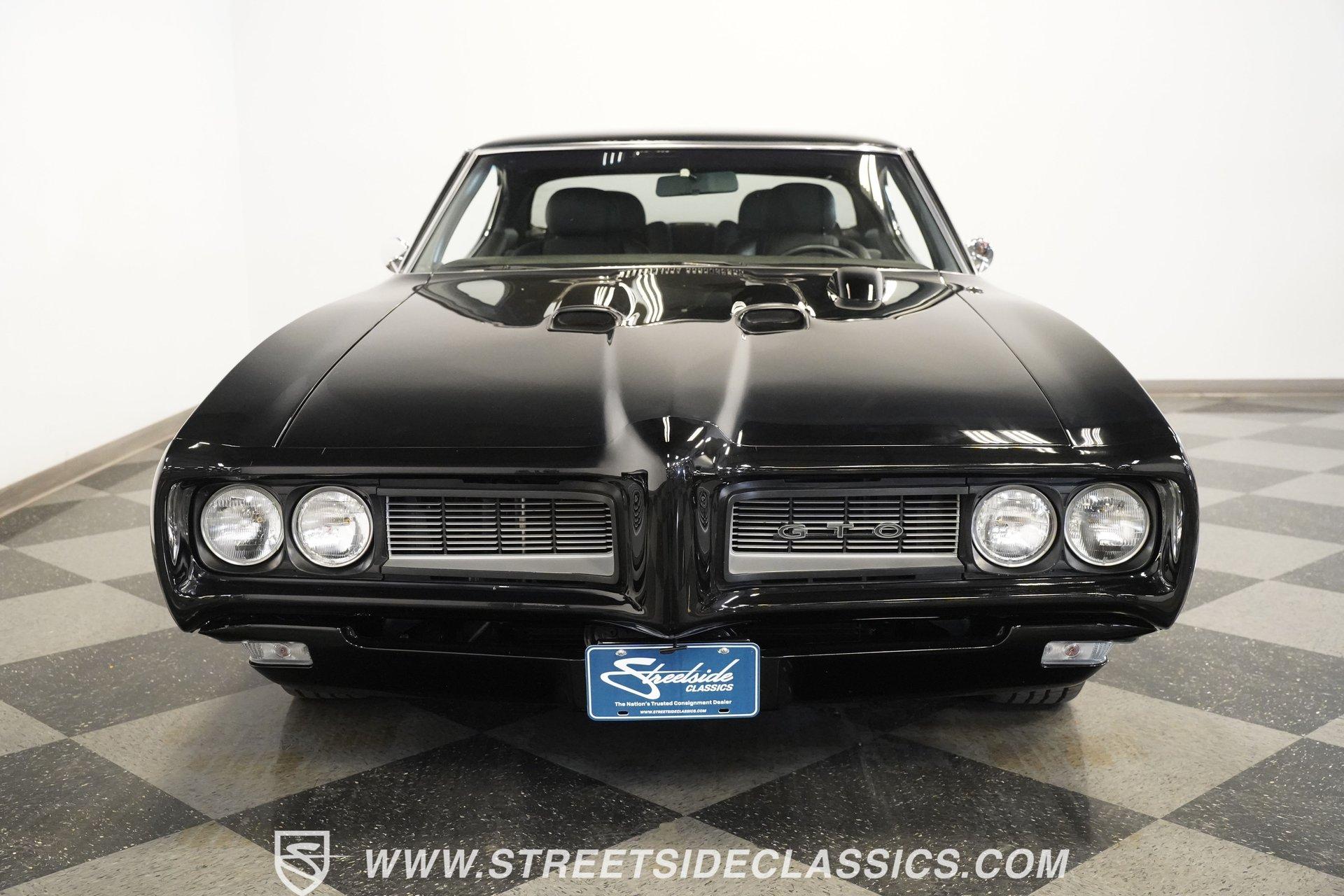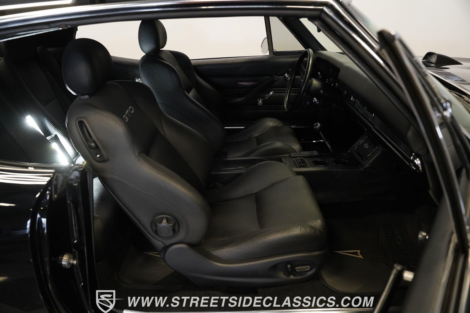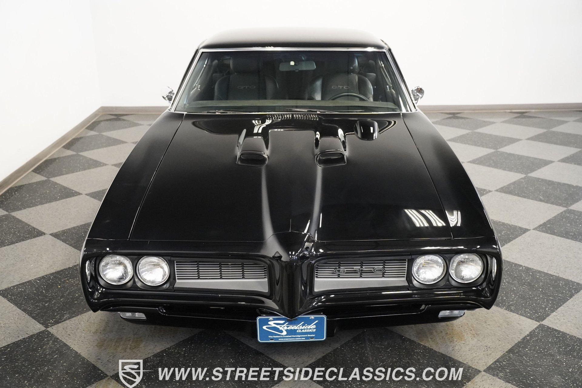 This 1968 Pontiac GTO, all muscle finished in a deep black that seems to stretch into infinity, asserts its dominance with more than just its color. Its distinctive hood, crowned with dual scoops and a hood tach, as well as a Judge style rear wing ad to the excitement. Perched on 15-inch Pontiac Rally ll wheels that anchor it firmly to the asphalt, its road presence is undeniable. The car's stance is aggressive, with BF Goodrich Radial T/A front tires sized at 205/60R15 and wider rear tires at 235/60R15, ensuring that every bit of power is translated directly to the road. This GTO makes an entrance with the unmistakable allure of American muscle. The interior, a sea of classic black, envelops you in an ambiance of vintage luxury. Luxurious leather bucket seats sourced from a late-model GTO offer a front-row seat to the road ahead, while the rear passengers enjoy the comfort of another pair of leather trimmed bucket seats. A custom console with cup holders houses JBL sound with Bluetooth controls and a Hurst shifter before sweeping up to house a Pioneer touchscreen infotainment center with remote. The custom dash face is fitted with a full set of red analog gauges by Speed Hut and a Vintage Air air conditioning system keeps the cabin cool. Underneath the hood lies the soul of the beast: a Pontiac XW code 400 V8 engine that has been bored to 461 cubic inches for enhanced for performance. The detailed engine bay is highlighted by factory-style chrome valve covers and a chrome open-element air cleaner. Power is sent to the rear wheels via a Borg-Warner T-10 4-speed manual transmission. Exhaust rumbles back through an X-pipe and dual Quiet Flow mufflers. Handling capabilities have been greatly improved with Hotchkis lowering springs, Hotchkis rear sway bar and trailing arms, a beefy front sway bar and power assisted disc brakes with drilled and slotted rotors on all four corners.