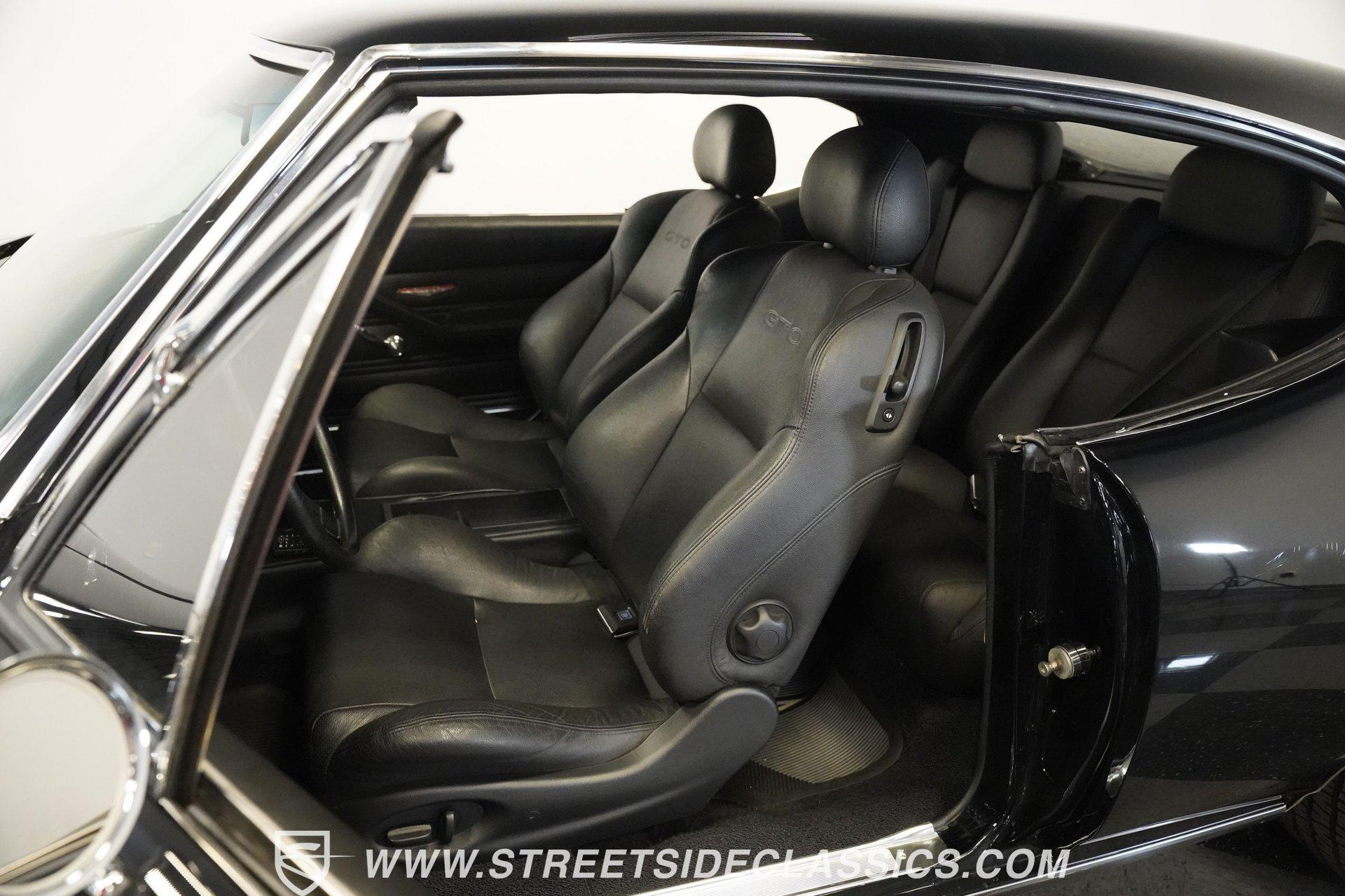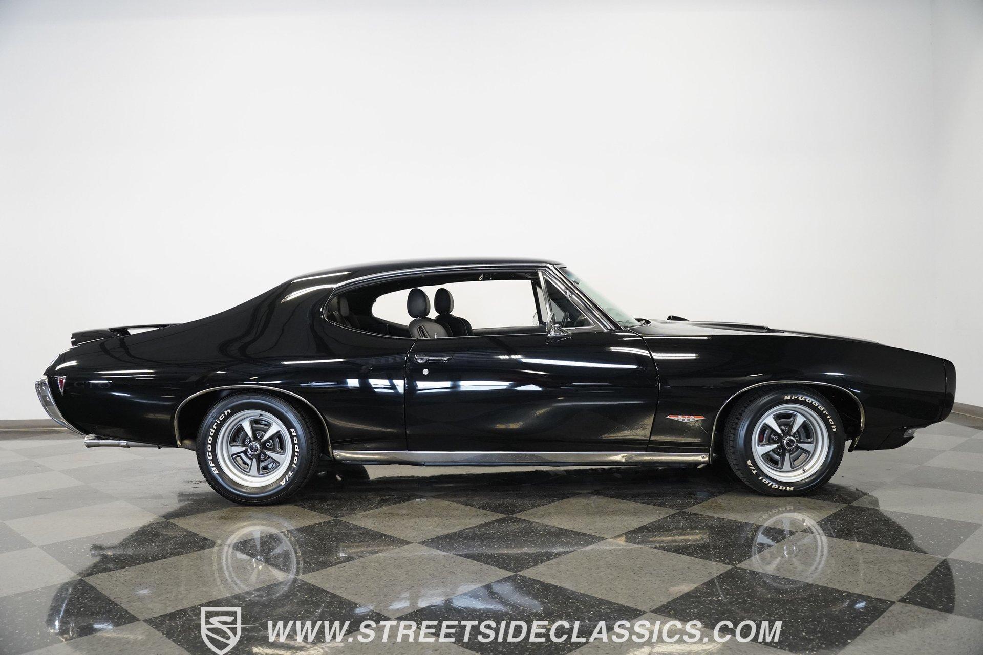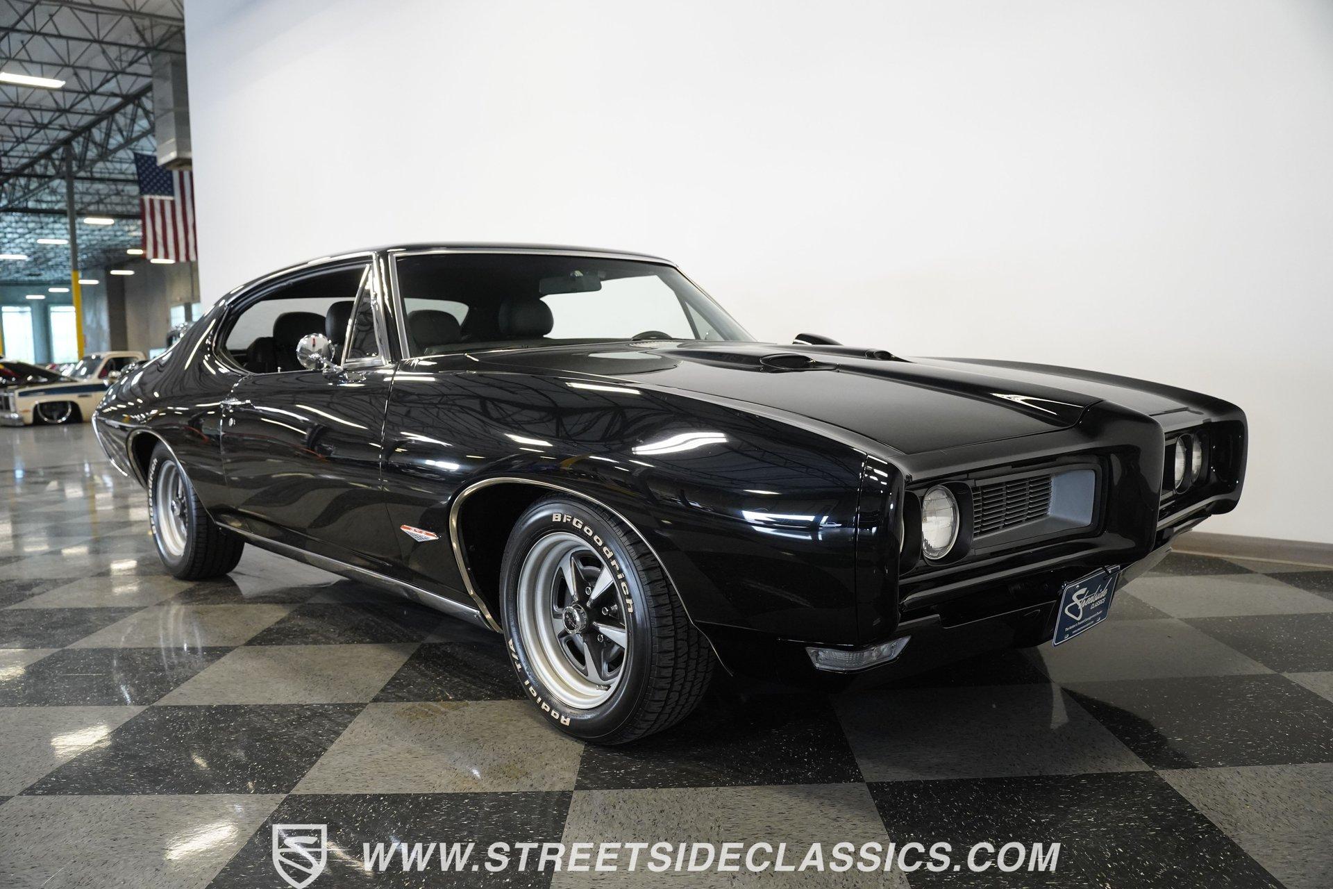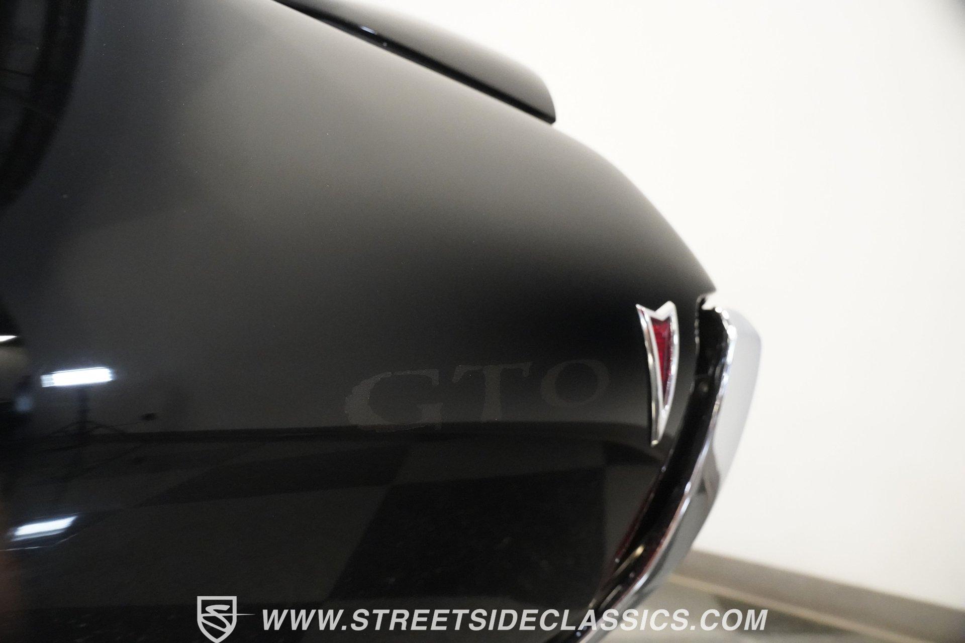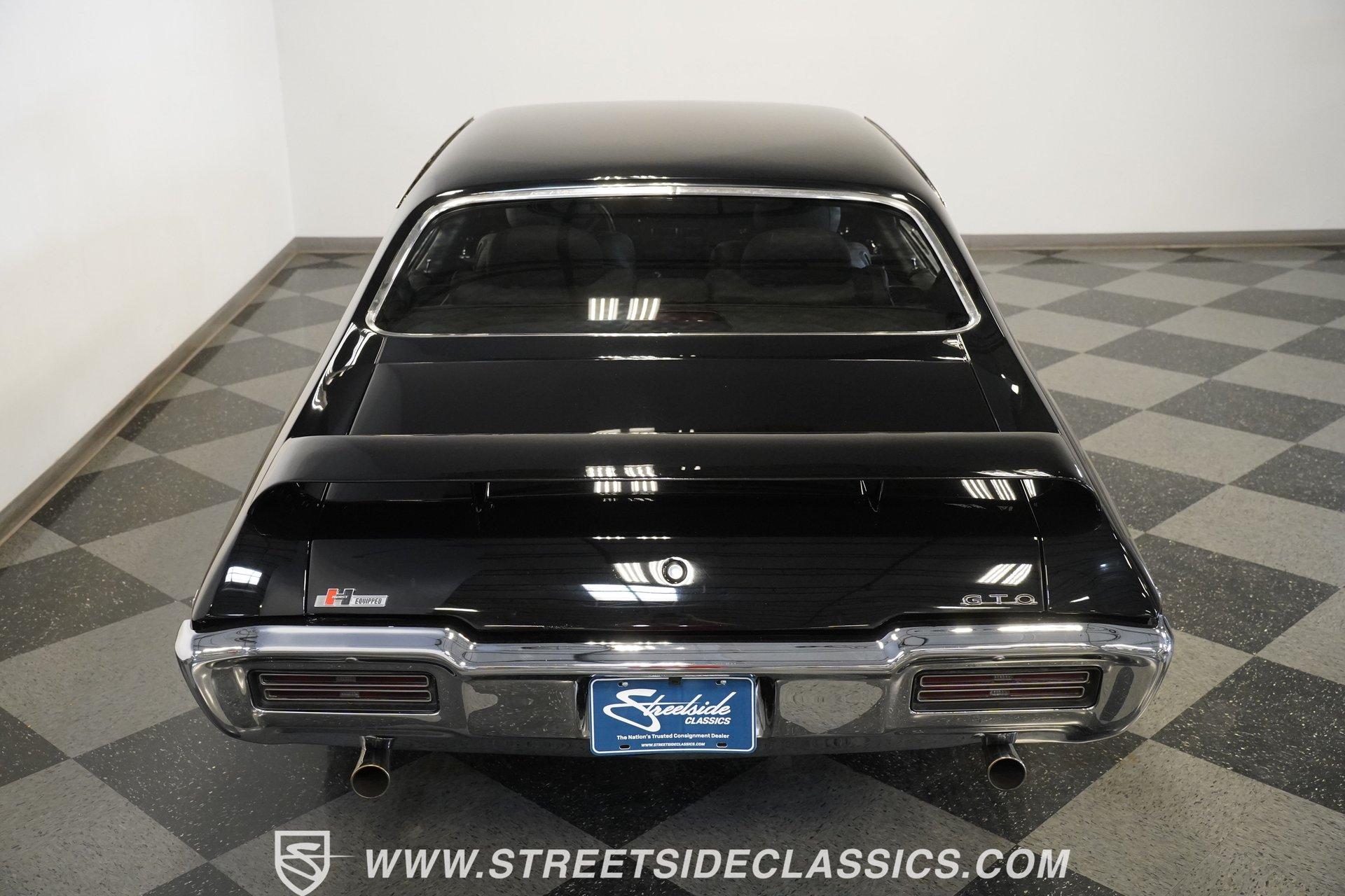 This 1968 Pontiac GTO, all muscle finished in a deep black that seems to stretch into infinity, asserts its dominance with more than just its color. Its distinctive hood, crowned with dual scoops and a hood tach, as well as a Judge style rear wing ad to the excitement. Perched on 15-inch Pontiac Rally ll wheels that anchor it firmly to the asphalt, its road presence is undeniable. The car's stance is aggressive, with BF Goodrich Radial T/A front tires sized at 205/60R15 and wider rear tires at 235/60R15, ensuring that every bit of power is translated directly to the road. This GTO makes an entrance with the unmistakable allure of American muscle. The interior, a sea of classic black, envelops you in an ambiance of vintage luxury. Luxurious leather bucket seats sourced from a late-model GTO offer a front-row seat to the road ahead, while the rear passengers enjoy the comfort of another pair of leather trimmed bucket seats. A custom console with cup holders houses JBL sound with Bluetooth controls and a Hurst shifter before sweeping up to house a Pioneer touchscreen infotainment center with remote. The custom dash face is fitted with a full set of red analog gauges by Speed Hut and a Vintage Air air conditioning system keeps the cabin cool. Underneath the hood lies the soul of the beast: a Pontiac XW code 400 V8 engine that has been bored to 461 cubic inches for enhanced for performance. The detailed engine bay is highlighted by factory-style chrome valve covers and a chrome open-element air cleaner. Power is sent to the rear wheels via a Borg-Warner T-10 4-speed manual transmission. Exhaust rumbles back through an X-pipe and dual Quiet Flow mufflers. Handling capabilities have been greatly improved with Hotchkis lowering springs, Hotchkis rear sway bar and trailing arms, a beefy front sway bar and power assisted disc brakes with drilled and slotted rotors on all four corners.