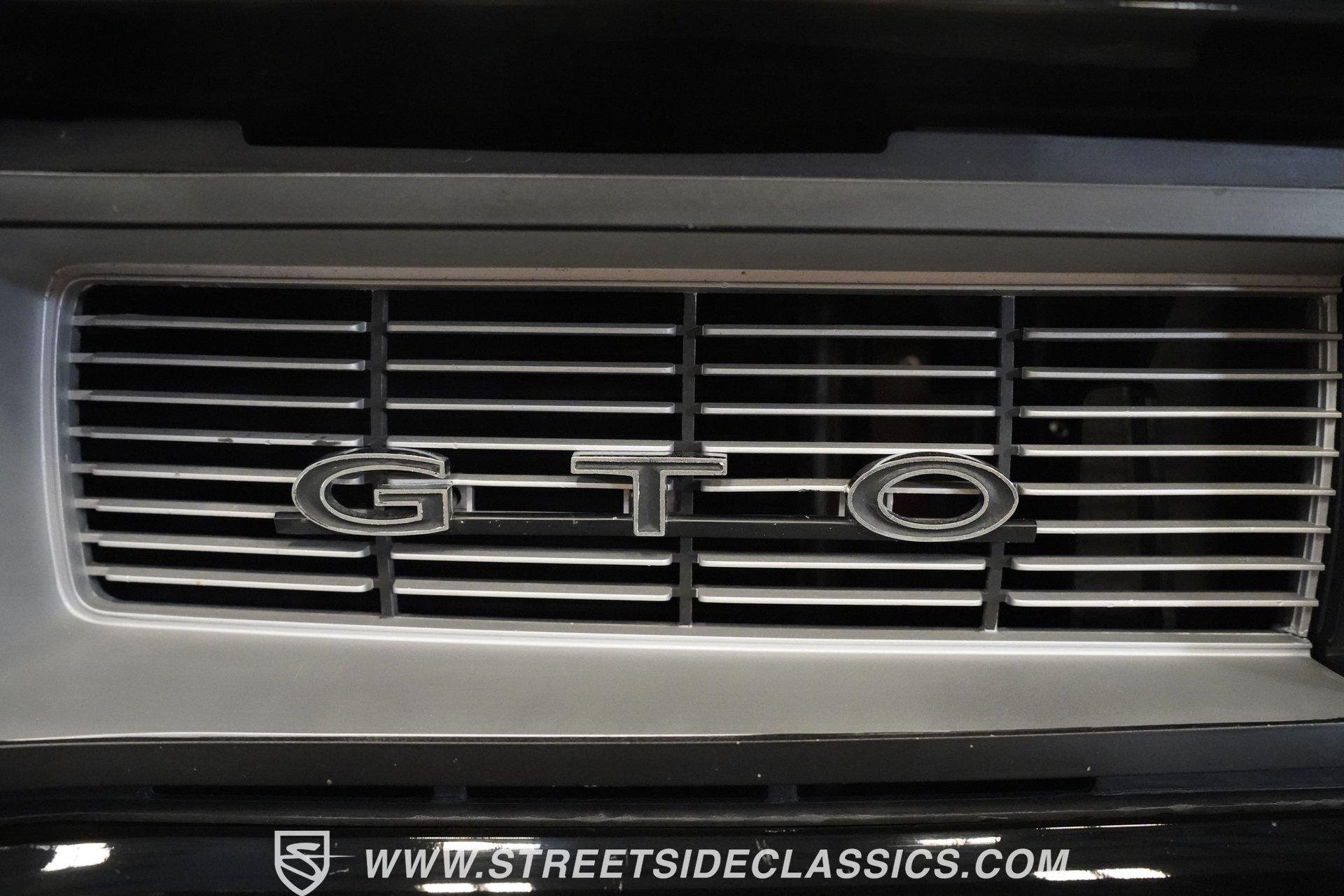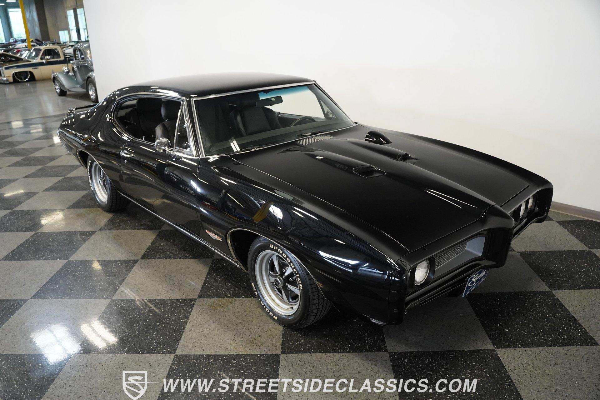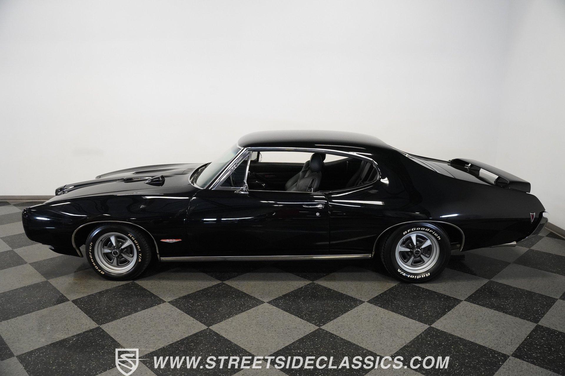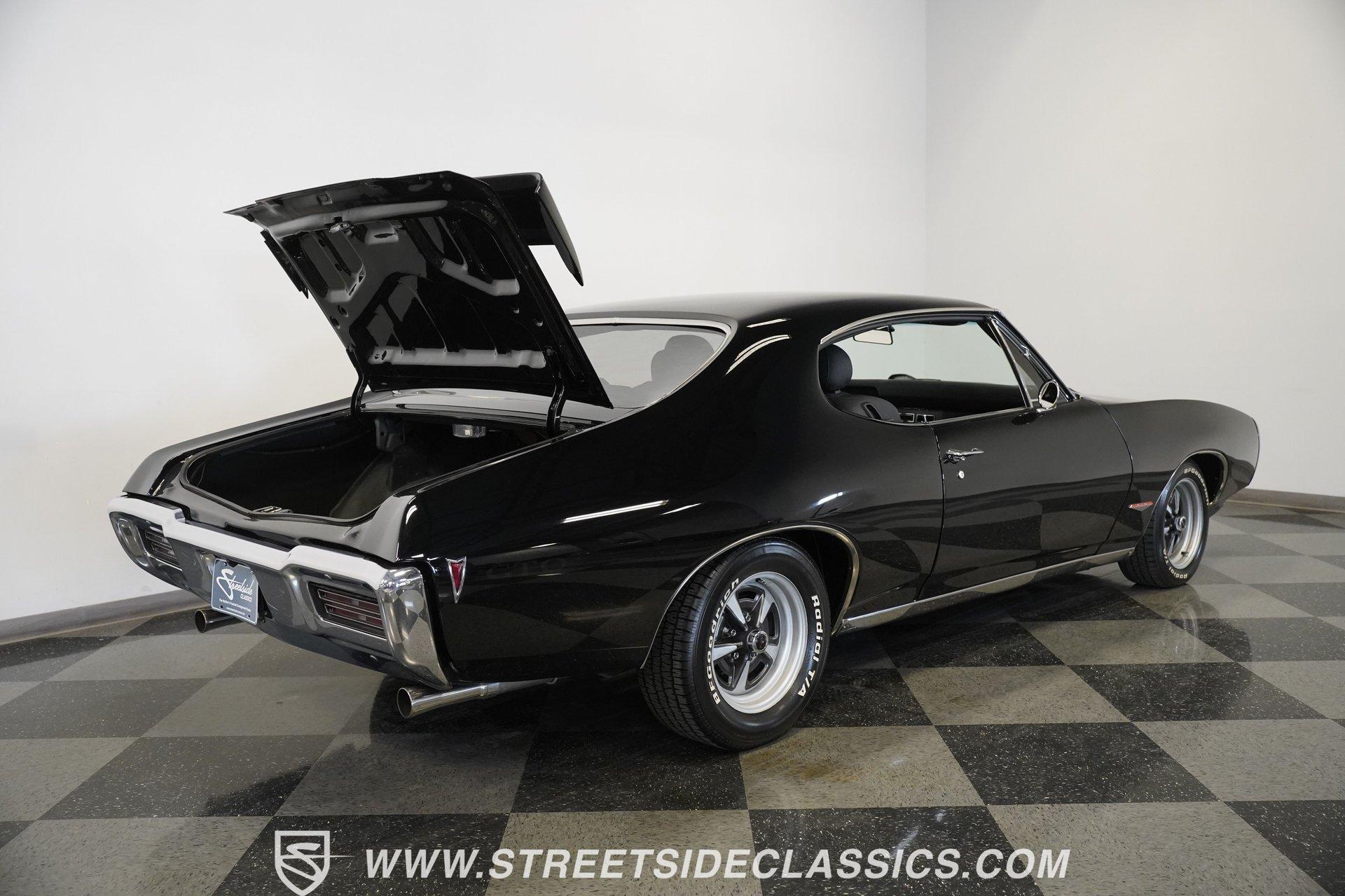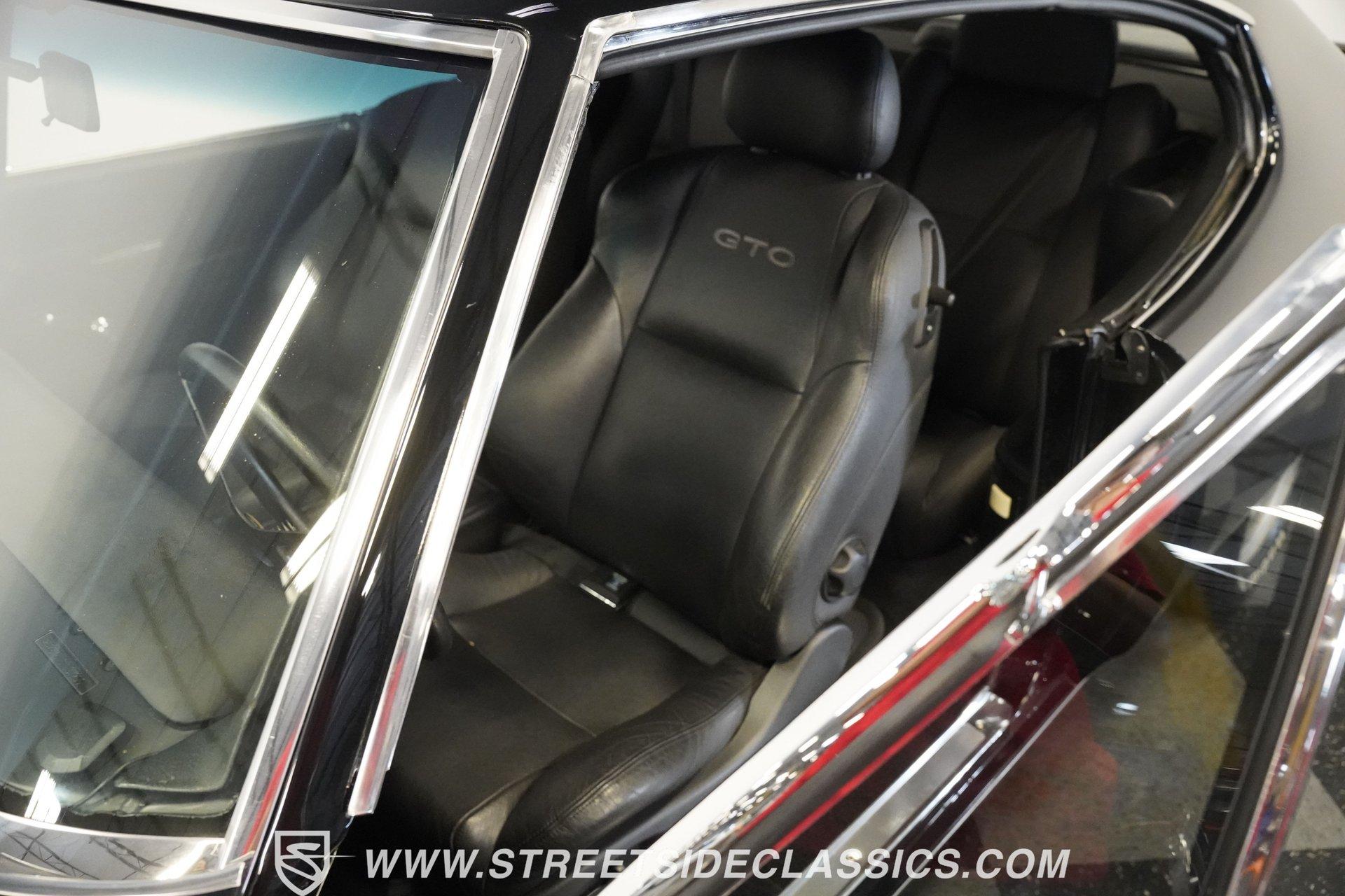 This 1968 Pontiac GTO, all muscle finished in a deep black that seems to stretch into infinity, asserts its dominance with more than just its color. Its distinctive hood, crowned with dual scoops and a hood tach, as well as a Judge style rear wing ad to the excitement. Perched on 15-inch Pontiac Rally ll wheels that anchor it firmly to the asphalt, its road presence is undeniable. The car's stance is aggressive, with BF Goodrich Radial T/A front tires sized at 205/60R15 and wider rear tires at 235/60R15, ensuring that every bit of power is translated directly to the road. This GTO makes an entrance with the unmistakable allure of American muscle. The interior, a sea of classic black, envelops you in an ambiance of vintage luxury. Luxurious leather bucket seats sourced from a late-model GTO offer a front-row seat to the road ahead, while the rear passengers enjoy the comfort of another pair of leather trimmed bucket seats. A custom console with cup holders houses JBL sound with Bluetooth controls and a Hurst shifter before sweeping up to house a Pioneer touchscreen infotainment center with remote. The custom dash face is fitted with a full set of red analog gauges by Speed Hut and a Vintage Air air conditioning system keeps the cabin cool. Underneath the hood lies the soul of the beast: a Pontiac XW code 400 V8 engine that has been bored to 461 cubic inches for enhanced for performance. The detailed engine bay is highlighted by factory-style chrome valve covers and a chrome open-element air cleaner. Power is sent to the rear wheels via a Borg-Warner T-10 4-speed manual transmission. Exhaust rumbles back through an X-pipe and dual Quiet Flow mufflers. Handling capabilities have been greatly improved with Hotchkis lowering springs, Hotchkis rear sway bar and trailing arms, a beefy front sway bar and power assisted disc brakes with drilled and slotted rotors on all four corners.
