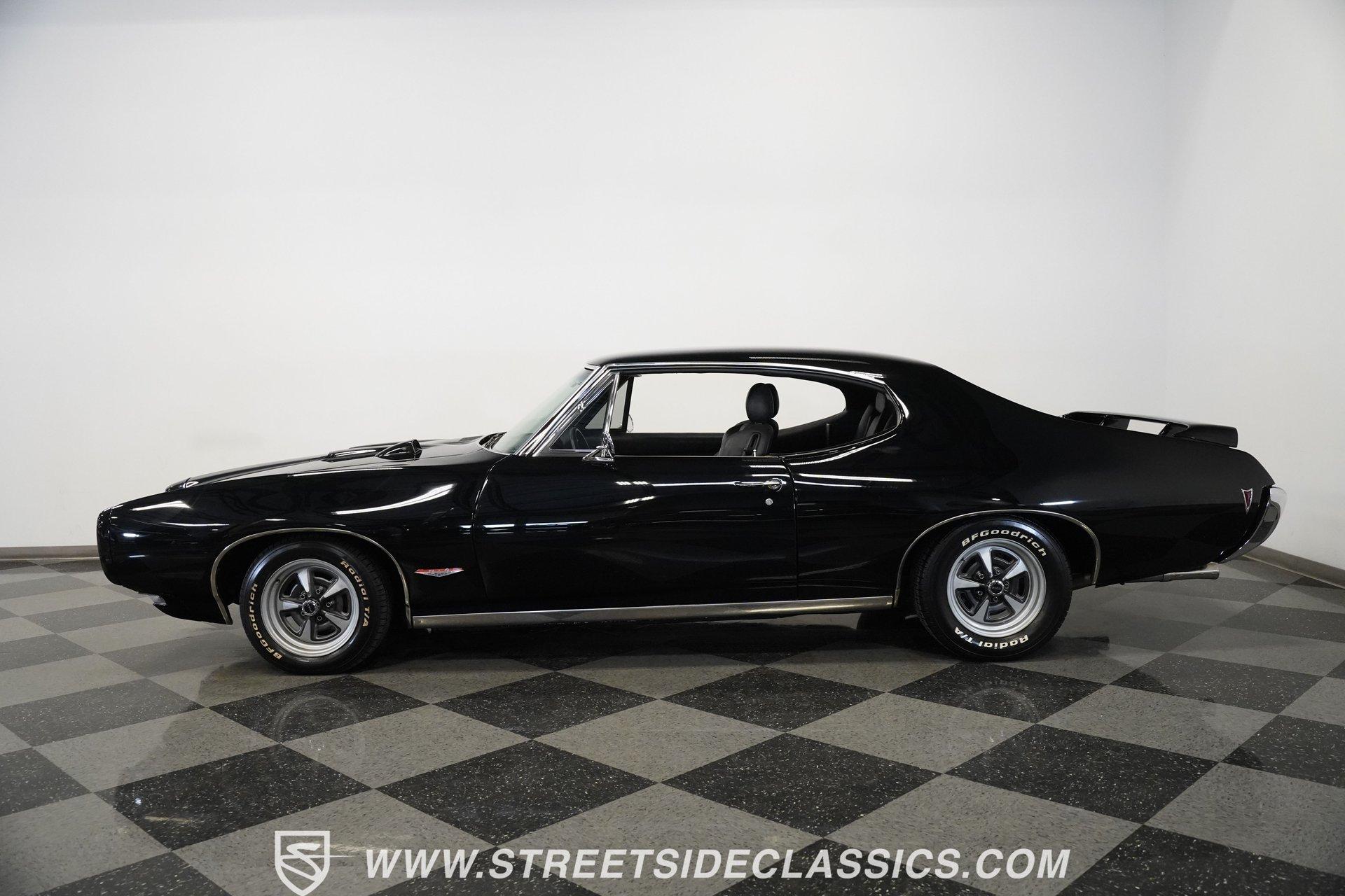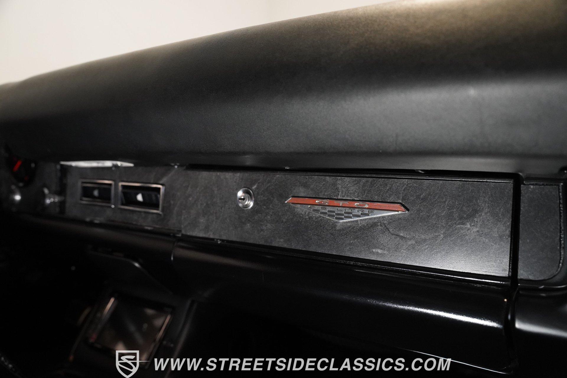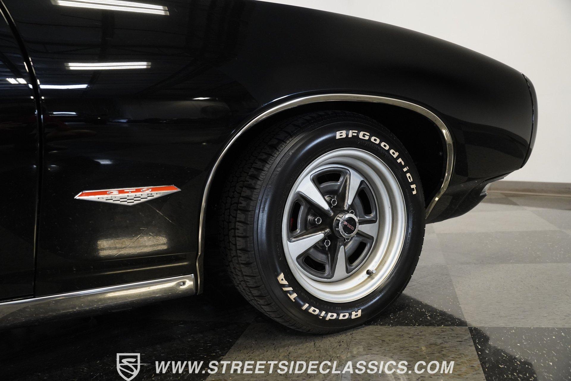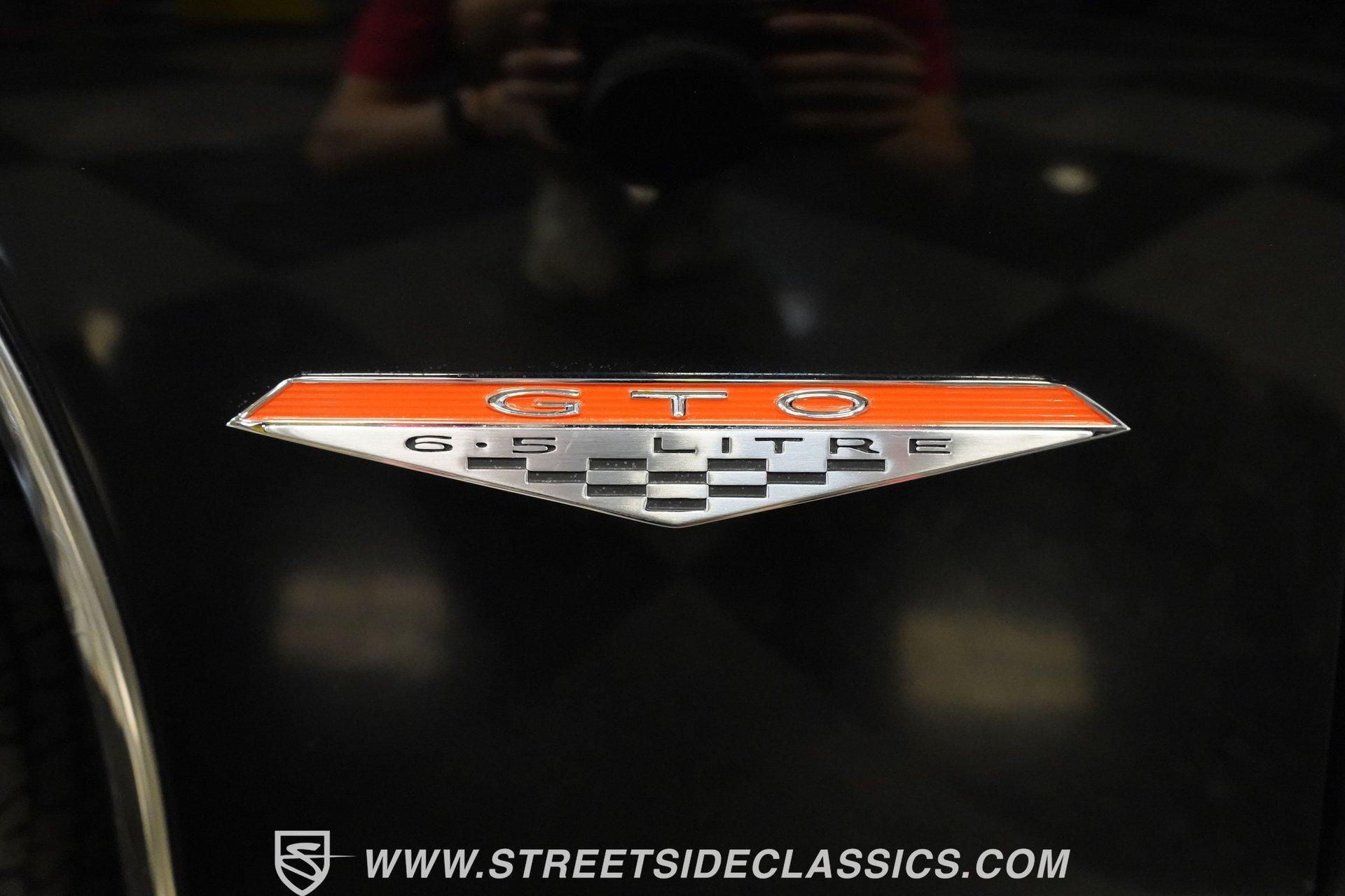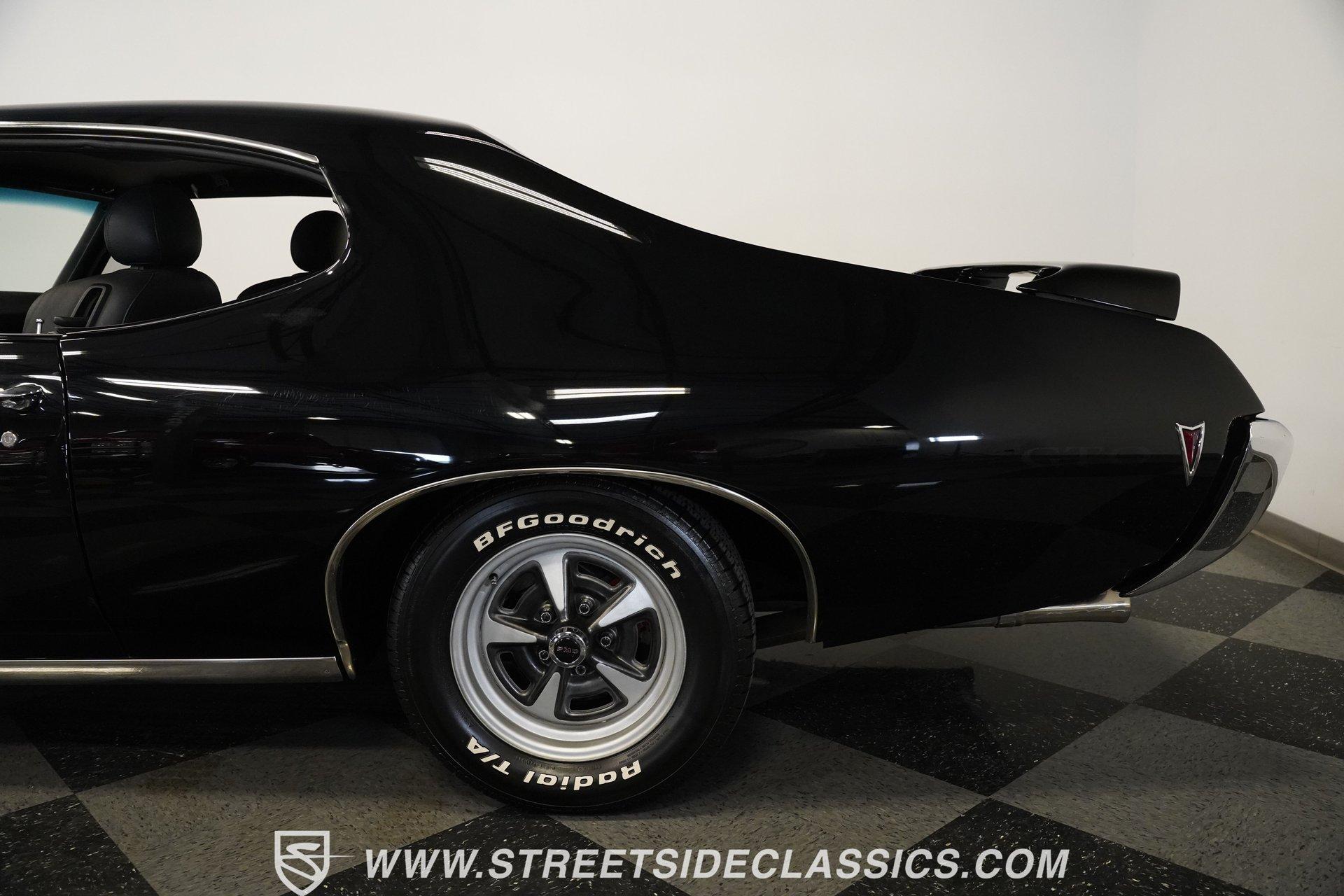 This 1968 Pontiac GTO, all muscle finished in a deep black that seems to stretch into infinity, asserts its dominance with more than just its color. Its distinctive hood, crowned with dual scoops and a hood tach, as well as a Judge style rear wing ad to the excitement. Perched on 15-inch Pontiac Rally ll wheels that anchor it firmly to the asphalt, its road presence is undeniable. The car's stance is aggressive, with BF Goodrich Radial T/A front tires sized at 205/60R15 and wider rear tires at 235/60R15, ensuring that every bit of power is translated directly to the road. This GTO makes an entrance with the unmistakable allure of American muscle. The interior, a sea of classic black, envelops you in an ambiance of vintage luxury. Luxurious leather bucket seats sourced from a late-model GTO offer a front-row seat to the road ahead, while the rear passengers enjoy the comfort of another pair of leather trimmed bucket seats. A custom console with cup holders houses JBL sound with Bluetooth controls and a Hurst shifter before sweeping up to house a Pioneer touchscreen infotainment center with remote. The custom dash face is fitted with a full set of red analog gauges by Speed Hut and a Vintage Air air conditioning system keeps the cabin cool. Underneath the hood lies the soul of the beast: a Pontiac XW code 400 V8 engine that has been bored to 461 cubic inches for enhanced for performance. The detailed engine bay is highlighted by factory-style chrome valve covers and a chrome open-element air cleaner. Power is sent to the rear wheels via a Borg-Warner T-10 4-speed manual transmission. Exhaust rumbles back through an X-pipe and dual Quiet Flow mufflers. Handling capabilities have been greatly improved with Hotchkis lowering springs, Hotchkis rear sway bar and trailing arms, a beefy front sway bar and power assisted disc brakes with drilled and slotted rotors on all four corners.