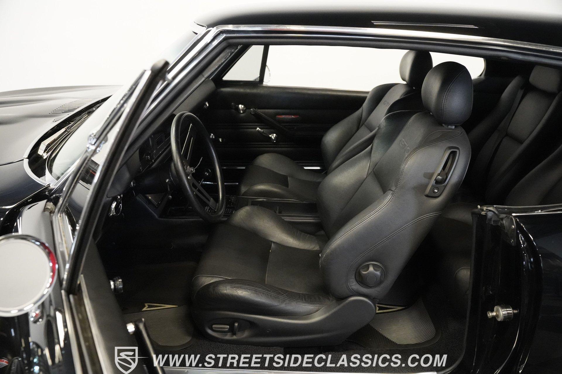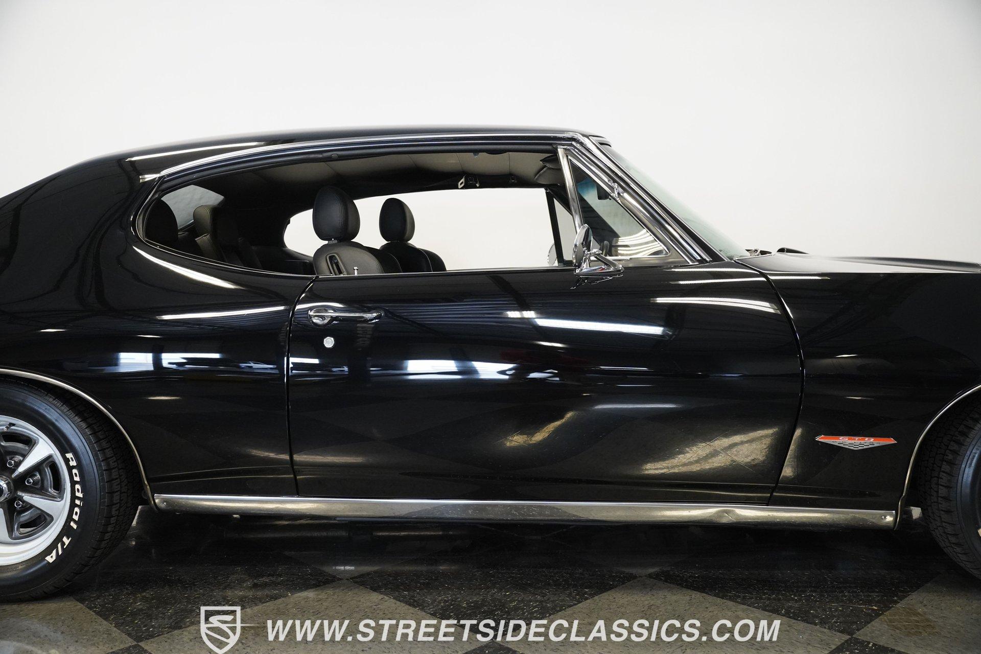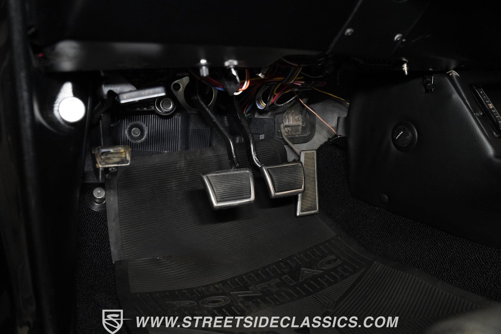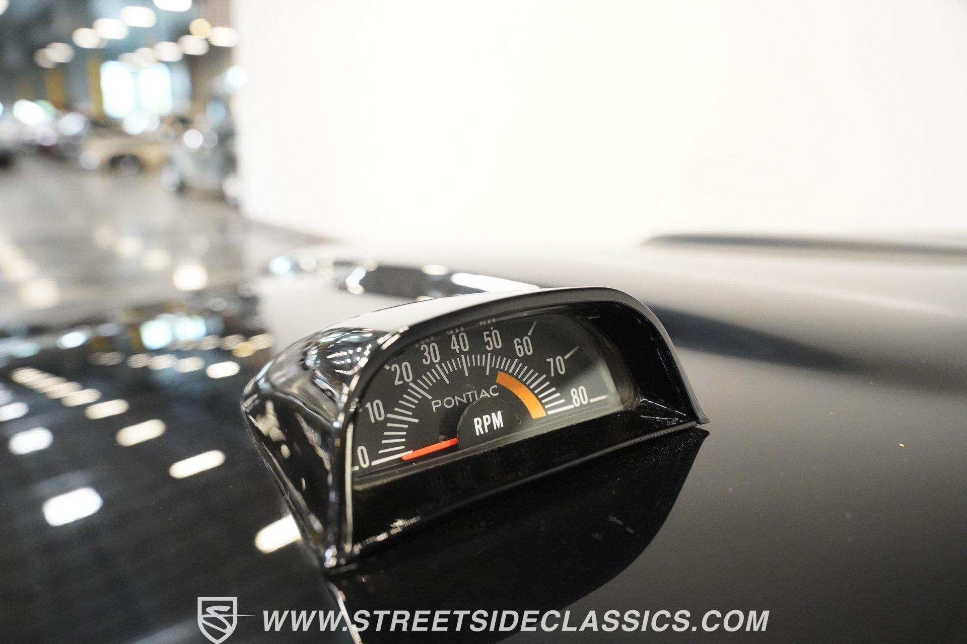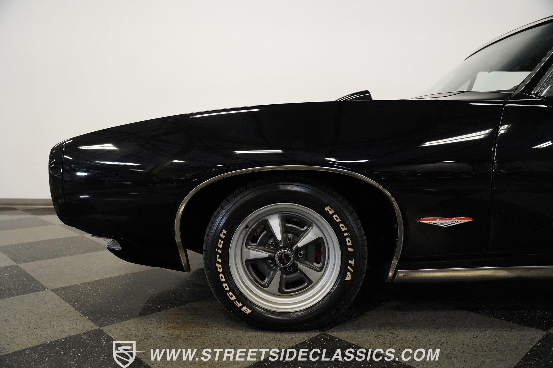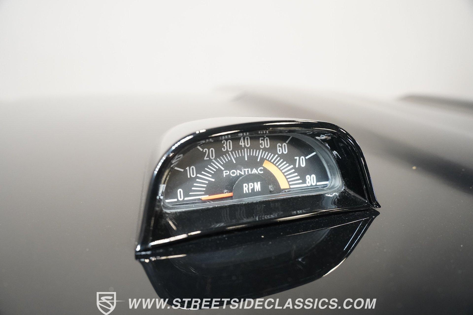 This 1968 Pontiac GTO, all muscle finished in a deep black that seems to stretch into infinity, asserts its dominance with more than just its color. Its distinctive hood, crowned with dual scoops and a hood tach, as well as a Judge style rear wing ad to the excitement. Perched on 15-inch Pontiac Rally ll wheels that anchor it firmly to the asphalt, its road presence is undeniable. The car's stance is aggressive, with BF Goodrich Radial T/A front tires sized at 205/60R15 and wider rear tires at 235/60R15, ensuring that every bit of power is translated directly to the road. This GTO makes an entrance with the unmistakable allure of American muscle. The interior, a sea of classic black, envelops you in an ambiance of vintage luxury. Luxurious leather bucket seats sourced from a late-model GTO offer a front-row seat to the road ahead, while the rear passengers enjoy the comfort of another pair of leather trimmed bucket seats. A custom console with cup holders houses JBL sound with Bluetooth controls and a Hurst shifter before sweeping up to house a Pioneer touchscreen infotainment center with remote. The custom dash face is fitted with a full set of red analog gauges by Speed Hut and a Vintage Air air conditioning system keeps the cabin cool. Underneath the hood lies the soul of the beast: a Pontiac XW code 400 V8 engine that has been bored to 461 cubic inches for enhanced for performance. The detailed engine bay is highlighted by factory-style chrome valve covers and a chrome open-element air cleaner. Power is sent to the rear wheels via a Borg-Warner T-10 4-speed manual transmission. Exhaust rumbles back through an X-pipe and dual Quiet Flow mufflers. Handling capabilities have been greatly improved with Hotchkis lowering springs, Hotchkis rear sway bar and trailing arms, a beefy front sway bar and power assisted disc brakes with drilled and slotted rotors on all four corners.