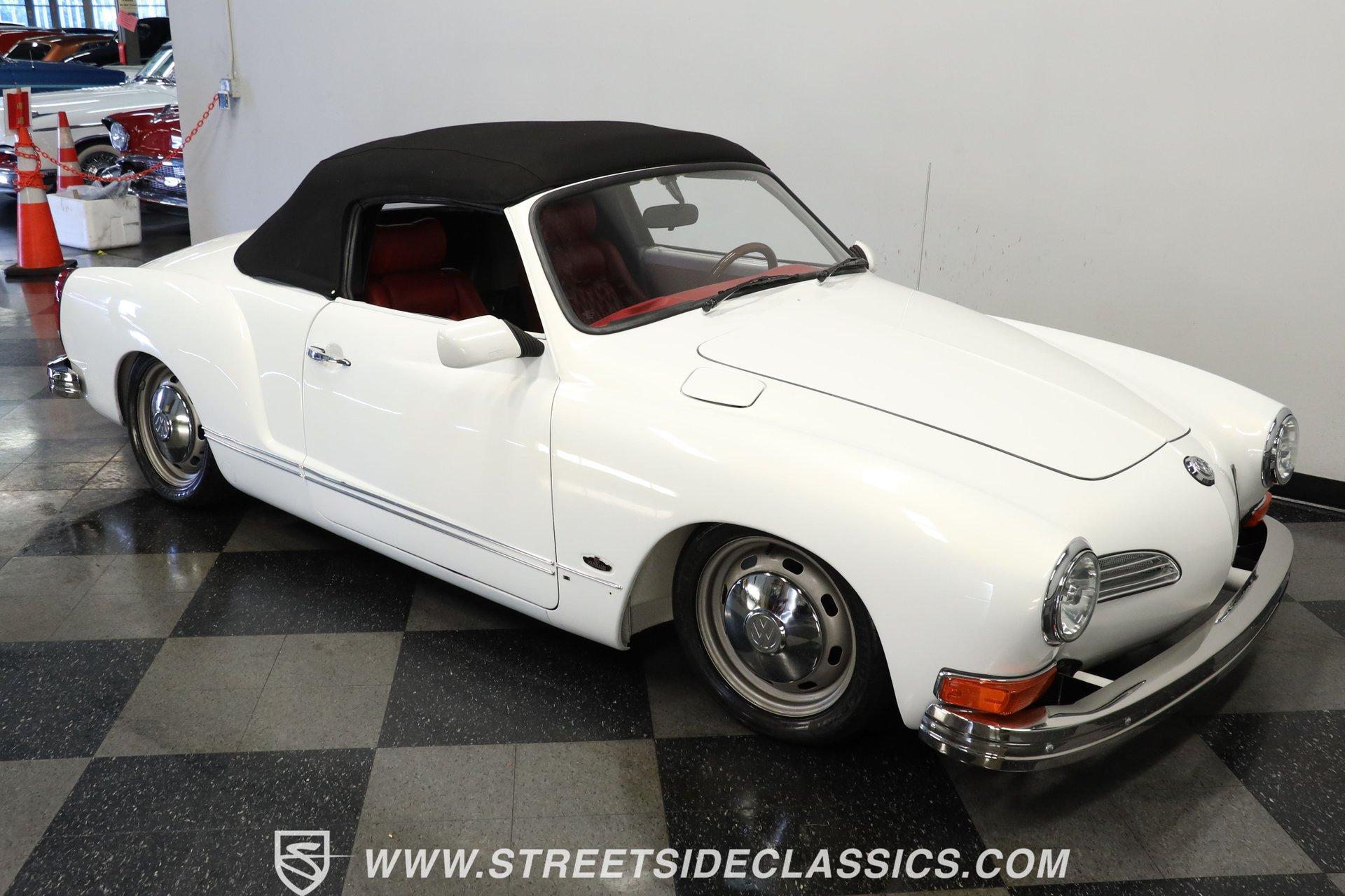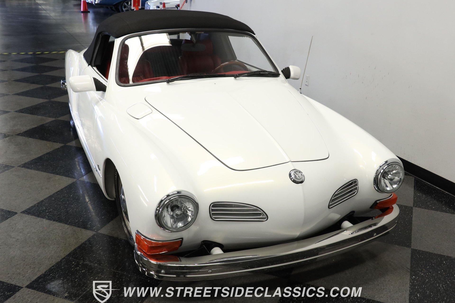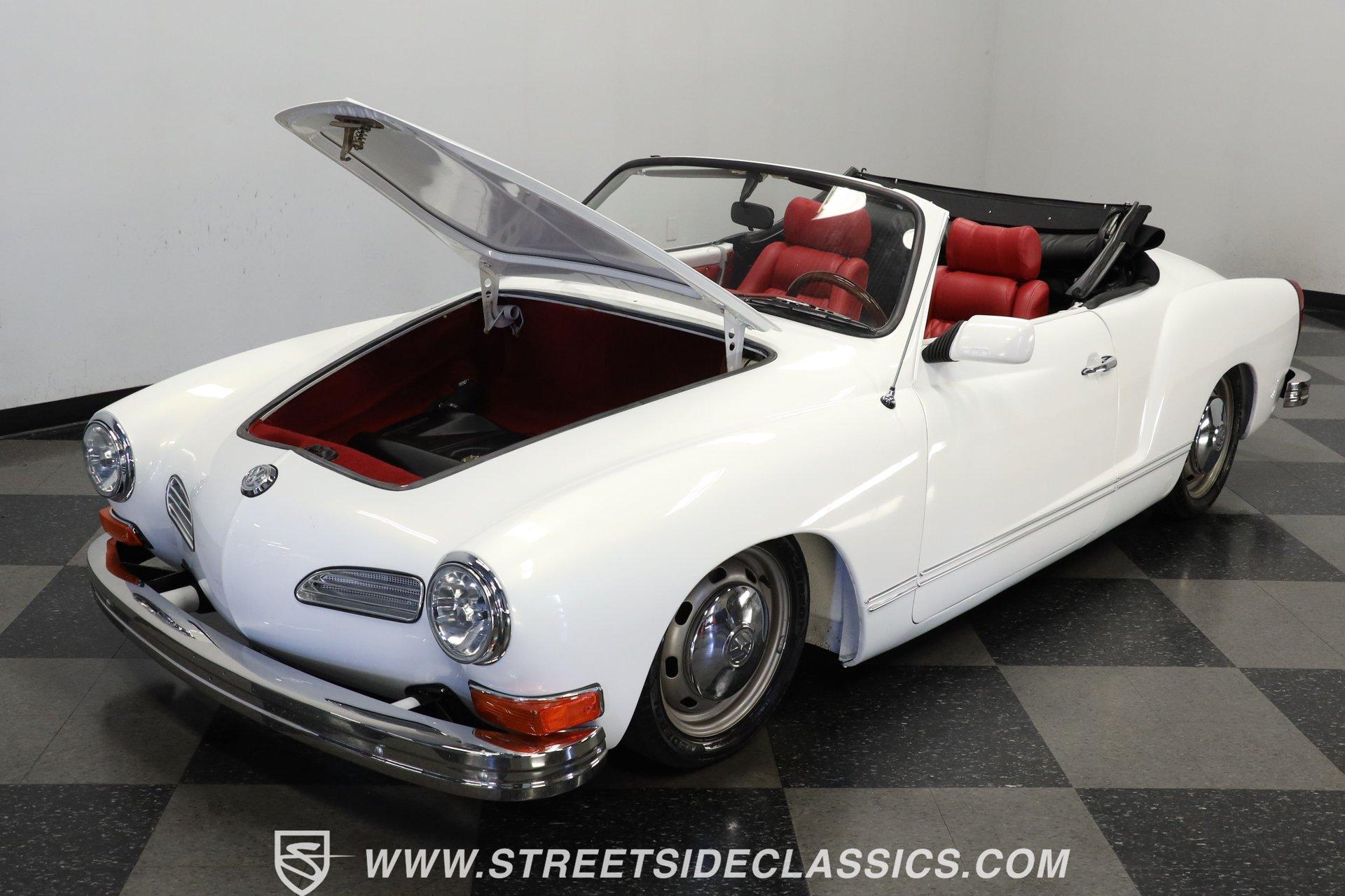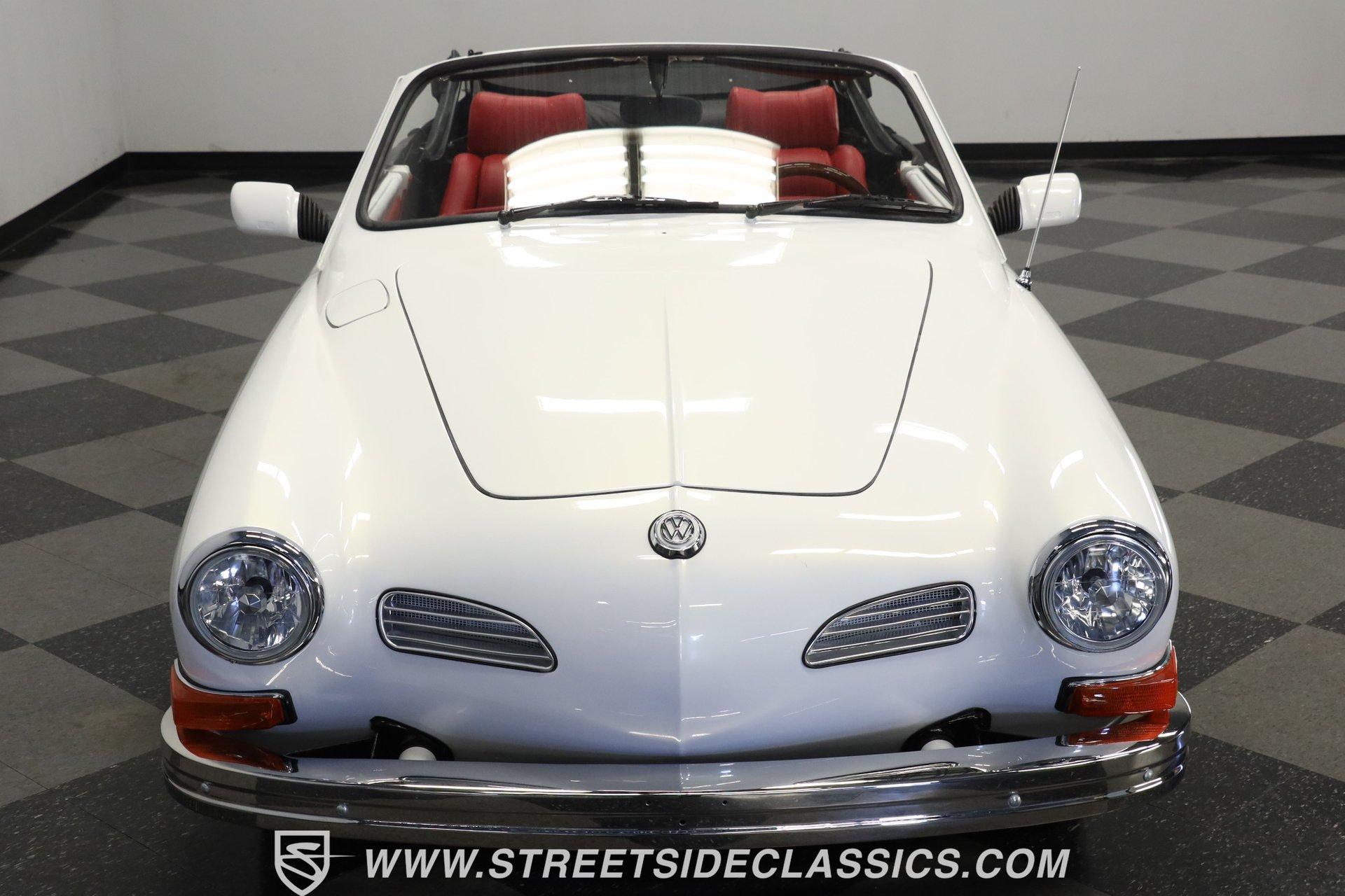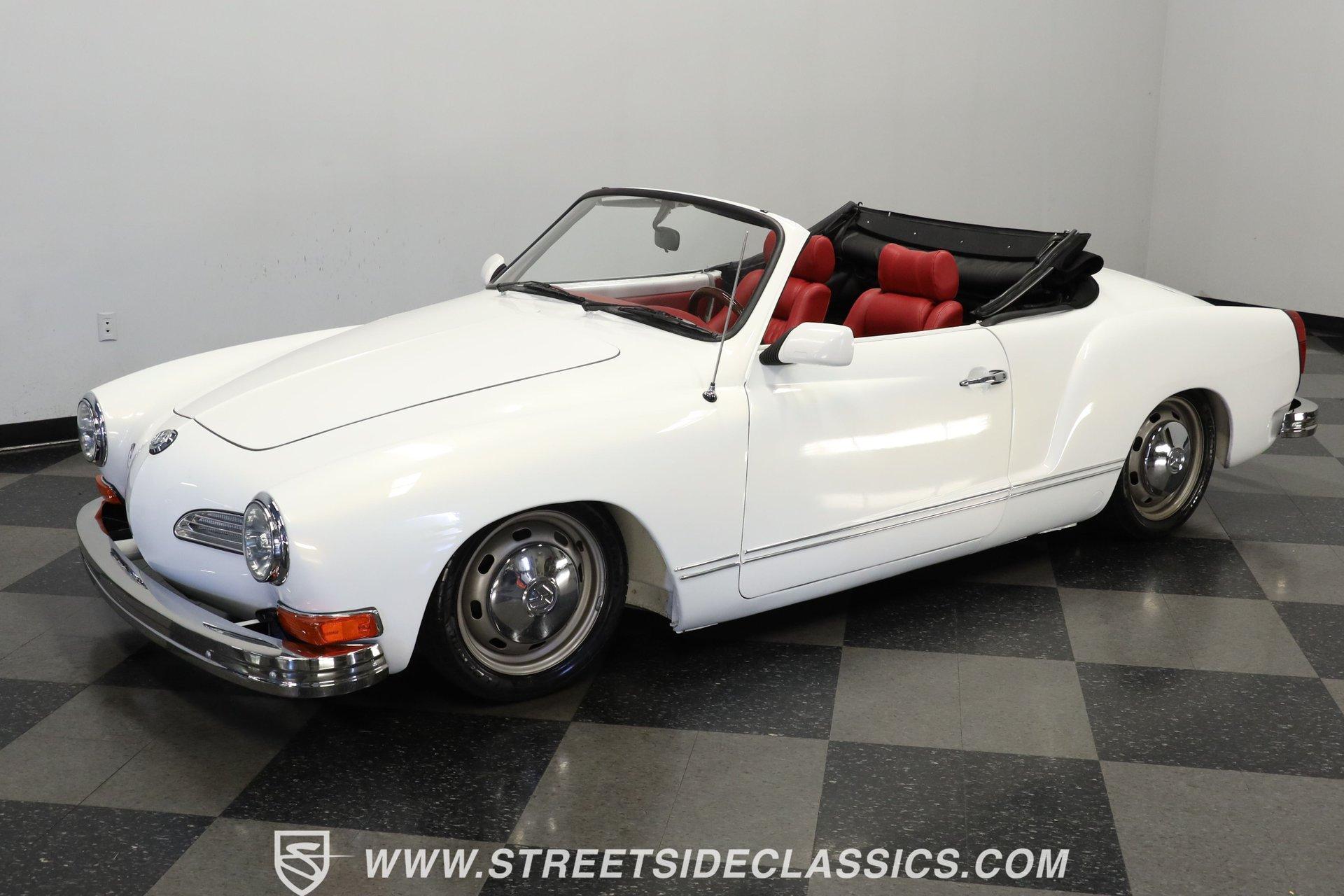 Sculpted by Italian design firm Ghia and hand-built by Karmann coachworks, this 1973 Volkswagen Karmann Ghia Convertible wears pearl white paint with exceptional gloss and shine. The athletic proportions and low stance give it a distinctive road presence. Black cloth convertible top provides open-air enjoyment when folded down. Chrome bumpers both front and rear appear almost new with very minimal wear. The 15-inch rims are fitted with radial tires (2020 date code) and finished with chrome VW hub caps. Upgraded clear headlights add a contemporary touch to the classic design. Vivid red dominates the cabin of this German classic, creating a bold contrast to the pearl white exterior. Aftermarket bucket seats with cross-stitched inserts provide both comfort and style. The dash and door panels continue the red theme for a unified look throughout. The aftermarket steering wheel adds a custom touch while maintaining control over the road. Original-style gauges display vital information clearly and effectively. A floor-mounted shifter with matching red boot allows for precise gear selection through all four speeds. At the rear sits a 1600 CC engine equipped with dual 2-barrel carburetors for increased performance. The 4-speed manual transmission gives the driver full control over power delivery and acceleration. Four-wheel disc brakes – an excellent upgrade from the factory setup – provide superior stopping capability. Manual steering offers direct road feedback for a pure driving experience. The clean engine bay shows careful maintenance and attention to detail, with all components working together for optimal performance on the road. HIGHLIGHTS: 1600 CC Engine 4-Speed Manual Transmission Dual 2-Barrel Carburetors Four-Wheel Disc Brakes Clean Engine Bay Pearl White Paint Black Cloth Convertible Top 15" Rims With Radial Tires Chrome Volkswagen Hub Caps Chrome Front And Rear Bumpers Upgraded Clear Headlights Lowered Stance Red Interior Aftermarket Bucket Seats With Cross-Stitched Inserts Aftermarket Steering Wheel Original-Style Gauges Floor-Mounted Shifter With Red Boot Matching Red Door Panels And Dash European styling with open-air fun, this 1973 Volkswagen Karmann Ghia Convertible delivers both. The distinctive pearl white finish, contrasting red interior, and upgraded mechanicals make it an excellent choice for weekend drives or car shows. Call today! We can assist you with getting an Extended Vehicle Service Plan from Freedom Warranty, which provides comprehensive coverage that can save thousands of dollars on unexpected repairs. Inquire for more details and pricing!