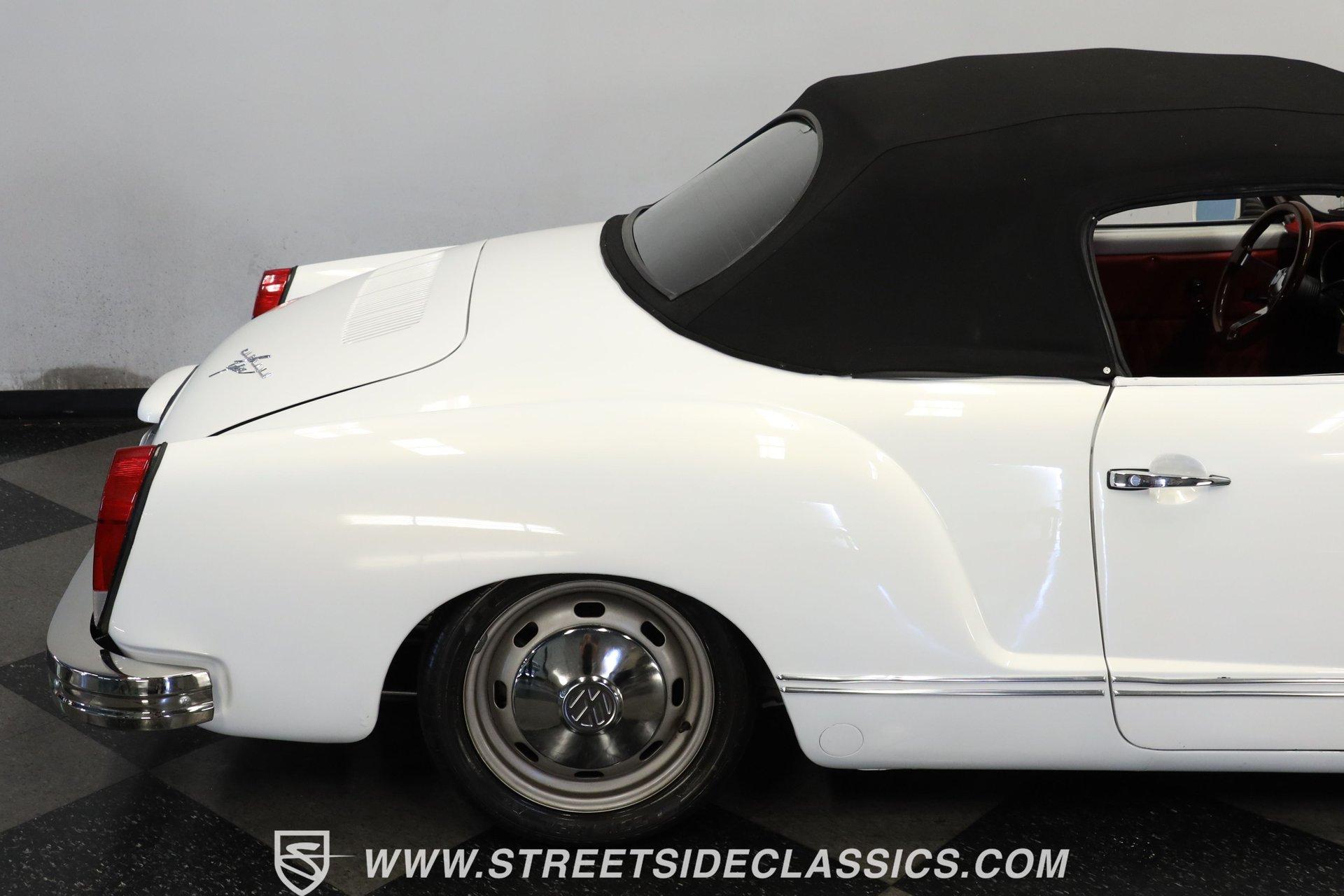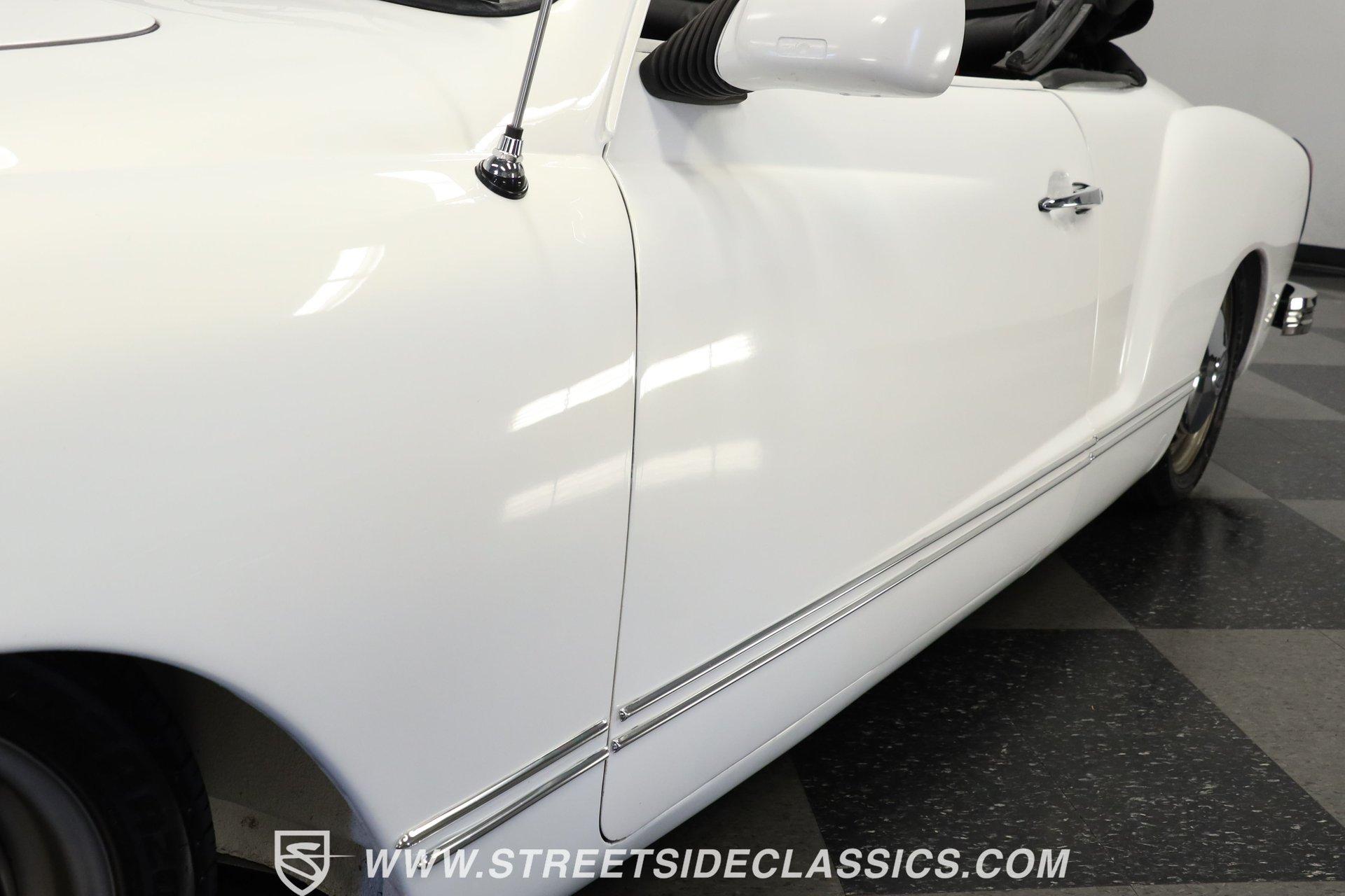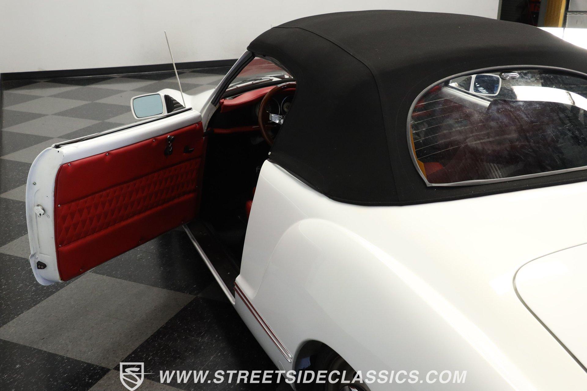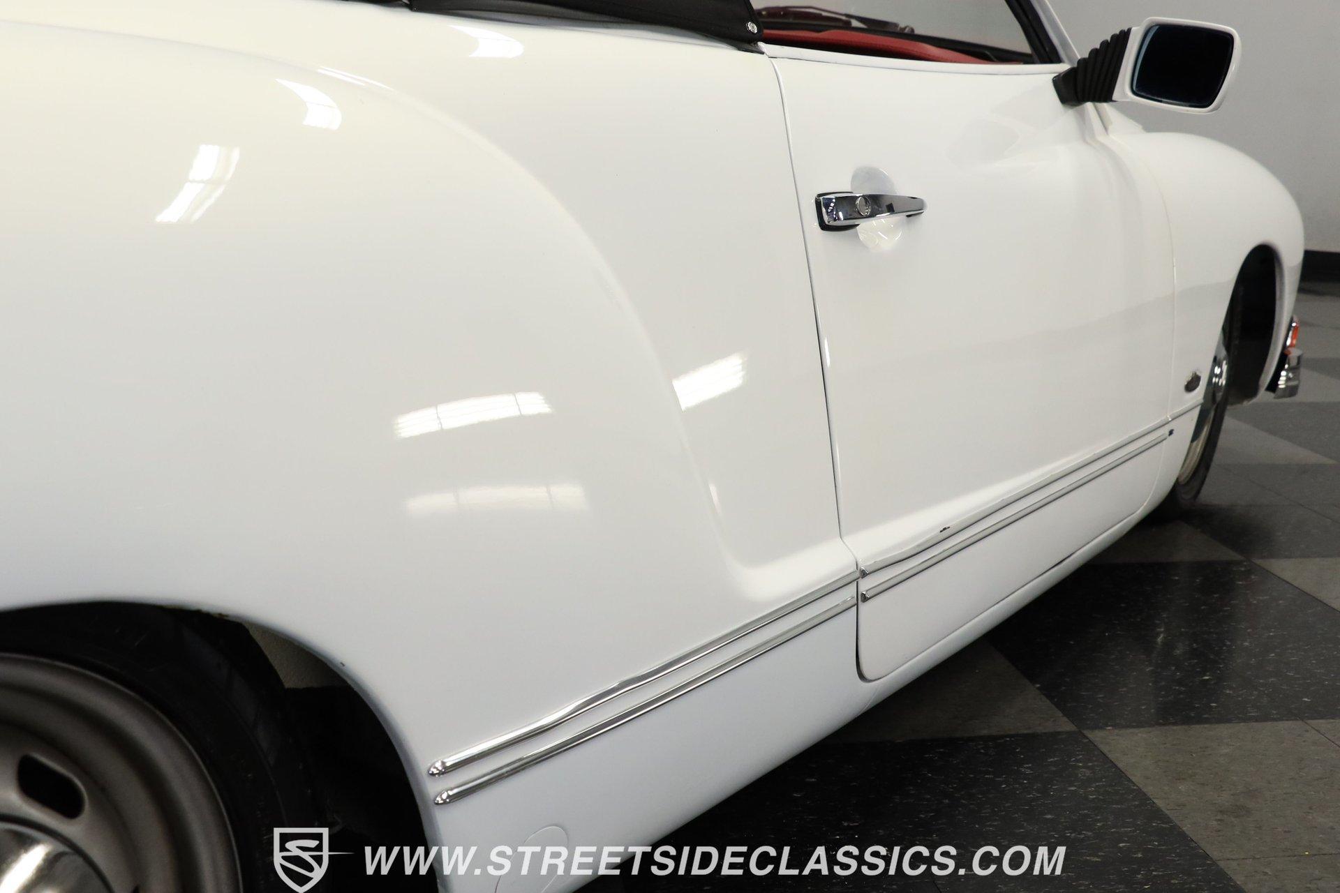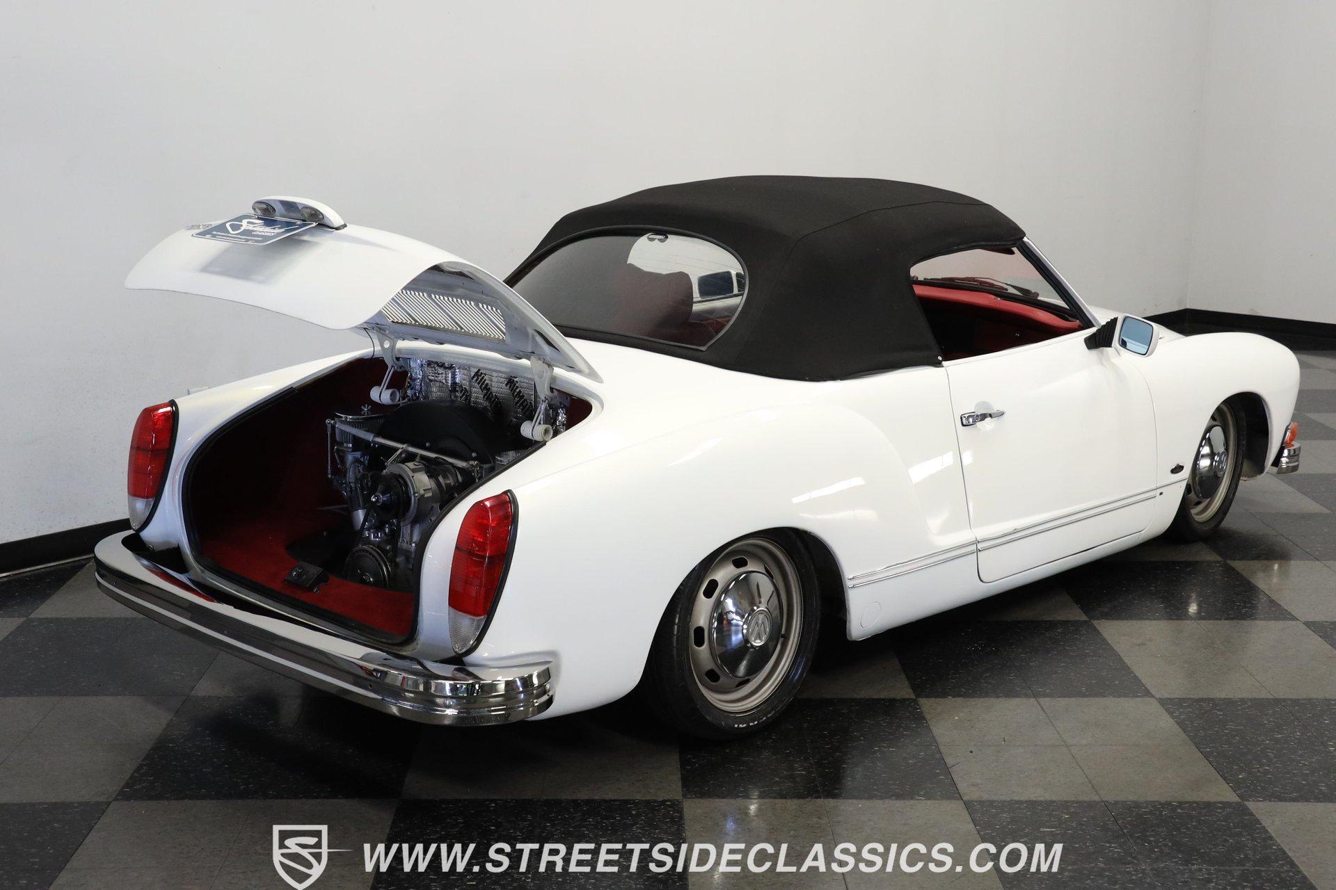 Sculpted by Italian design firm Ghia and hand-built by Karmann coachworks, this 1973 Volkswagen Karmann Ghia Convertible wears pearl white paint with exceptional gloss and shine. The athletic proportions and low stance give it a distinctive road presence. Black cloth convertible top provides open-air enjoyment when folded down. Chrome bumpers both front and rear appear almost new with very minimal wear. The 15-inch rims are fitted with radial tires (2020 date code) and finished with chrome VW hub caps. Upgraded clear headlights add a contemporary touch to the classic design. Vivid red dominates the cabin of this German classic, creating a bold contrast to the pearl white exterior. Aftermarket bucket seats with cross-stitched inserts provide both comfort and style. The dash and door panels continue the red theme for a unified look throughout. The aftermarket steering wheel adds a custom touch while maintaining control over the road. Original-style gauges display vital information clearly and effectively. A floor-mounted shifter with matching red boot allows for precise gear selection through all four speeds. At the rear sits a 1600 CC engine equipped with dual 2-barrel carburetors for increased performance. The 4-speed manual transmission gives the driver full control over power delivery and acceleration. Four-wheel disc brakes – an excellent upgrade from the factory setup – provide superior stopping capability. Manual steering offers direct road feedback for a pure driving experience. The clean engine bay shows careful maintenance and attention to detail, with all components working together for optimal performance on the road. HIGHLIGHTS: 1600 CC Engine 4-Speed Manual Transmission Dual 2-Barrel Carburetors Four-Wheel Disc Brakes Clean Engine Bay Pearl White Paint Black Cloth Convertible Top 15" Rims With Radial Tires Chrome Volkswagen Hub Caps Chrome Front And Rear Bumpers Upgraded Clear Headlights Lowered Stance Red Interior Aftermarket Bucket Seats With Cross-Stitched Inserts Aftermarket Steering Wheel Original-Style Gauges Floor-Mounted Shifter With Red Boot Matching Red Door Panels And Dash European styling with open-air fun, this 1973 Volkswagen Karmann Ghia Convertible delivers both. The distinctive pearl white finish, contrasting red interior, and upgraded mechanicals make it an excellent choice for weekend drives or car shows. Call today! We can assist you with getting an Extended Vehicle Service Plan from Freedom Warranty, which provides comprehensive coverage that can save thousands of dollars on unexpected repairs. Inquire for more details and pricing!