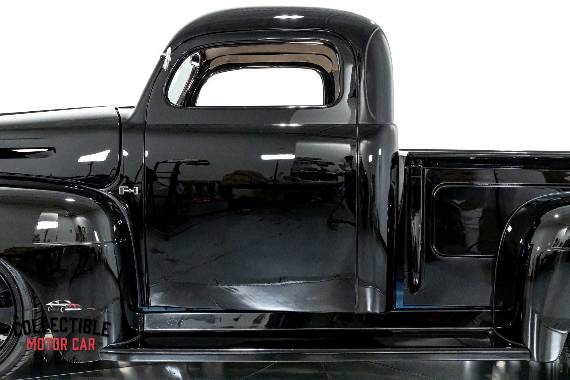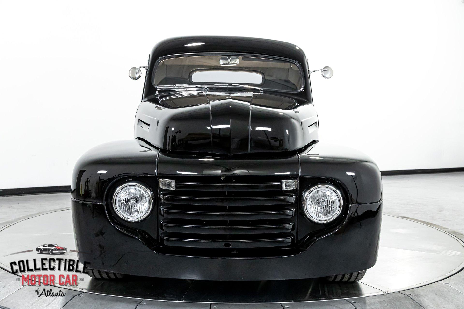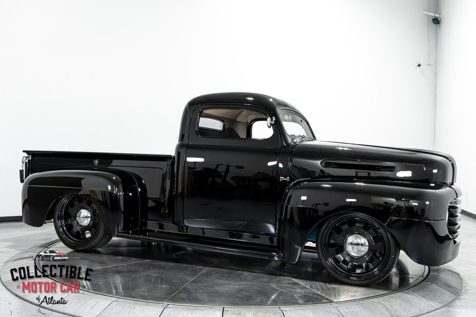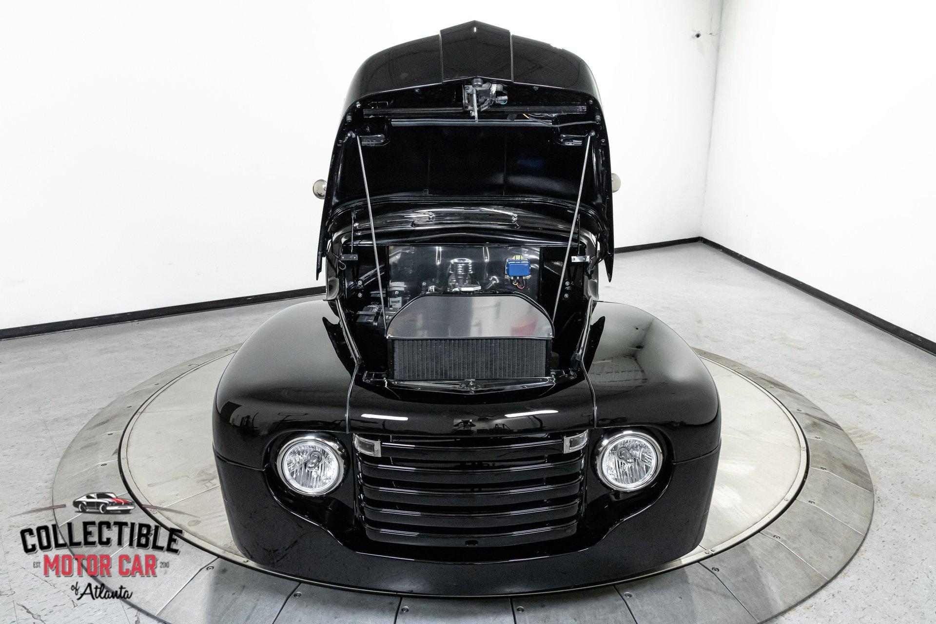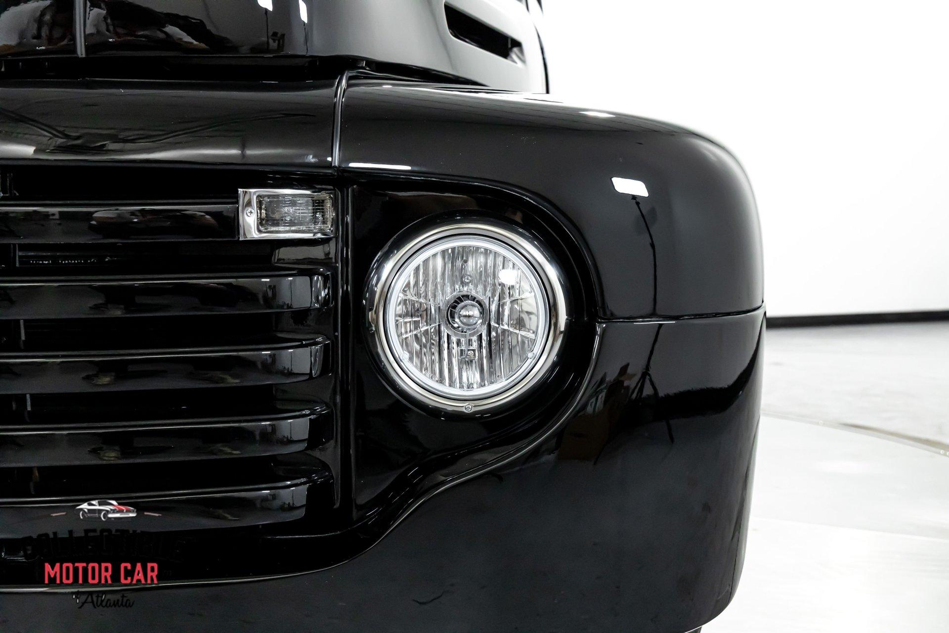 1949 Ford F1 Pickup Restomod SPECIFICATIONS: Engine: Modified Flathead V-8 Transmission: Automatic Exterior Color: Black Interior Color: Black Make: Ford Model: F1 Body Style: Pickup HIGHLIGHTS: Custom-built Flathead V-8 engine for enhanced performance Smooth-shifting automatic transmission Distinctively chopped top Stylish suicide doors for a classic custom appearance Stunning mirrored firewall showcasing the engine bay Custom interior featuring luxurious leather bench seating THE STORY: Introduced in 1948, Ford's F1 lineup quickly became a symbol of reliability and post-war innovation. This extraordinary 1949 Ford F1 Pickup has undergone a meticulous transformation, evolving from a reliable workhorse into a head-turning custom masterpiece. Sporting a chopped roofline and suicide doors, this truck exudes an unmistakably classic hot rod attitude. At the heart of this restomod is a carefully modified Flathead V-8 engine, equipped with a downdraft carburetor and a dual exhaust system for maximum power and an unforgettable exhaust note. The mirrored firewall beautifully frames the engine, highlighted by a chrome-laden bay and striking blue accents that contrast sharply against the truck’s glossy black exterior. The refined exterior maintains classic F1 aesthetics, complemented by modern custom touches. Detroit steel wheels in gloss black set an aggressive stance, perfectly matched by the waterfall grille, F1 badging, and elegantly integrated dual side mirrors. Wraparound bumpers lend a sleek, streamlined look, while the polished, body-colored wood bed with relocated fuel filler showcases the attention to detail and craftsmanship. Inside, the cabin blends vintage charm with contemporary luxury, featuring an upgraded steering wheel, premium tinted glass, and a custom leather bench seat, creating a comfortable and sophisticated driving experience. This 1949 Ford F1 Restomod Pickup offers a captivating combination of historical significance, bold customization, and exceptional craftsmanship, making it a standout vehicle for any classic automotive enthusiast. Phone 770-738-7111 Address 1750 Enterprise Way Suite 109Marietta, GA 30067 Hours of Operation Monday- Friday - 9-5pm Saturday - 9-3pm (Appointment only) Sunday - Closed