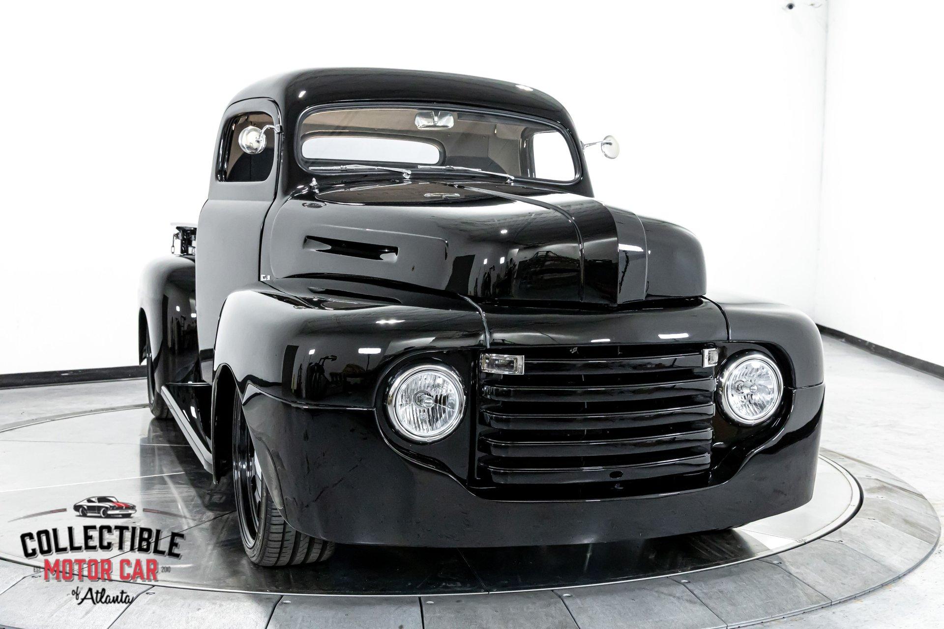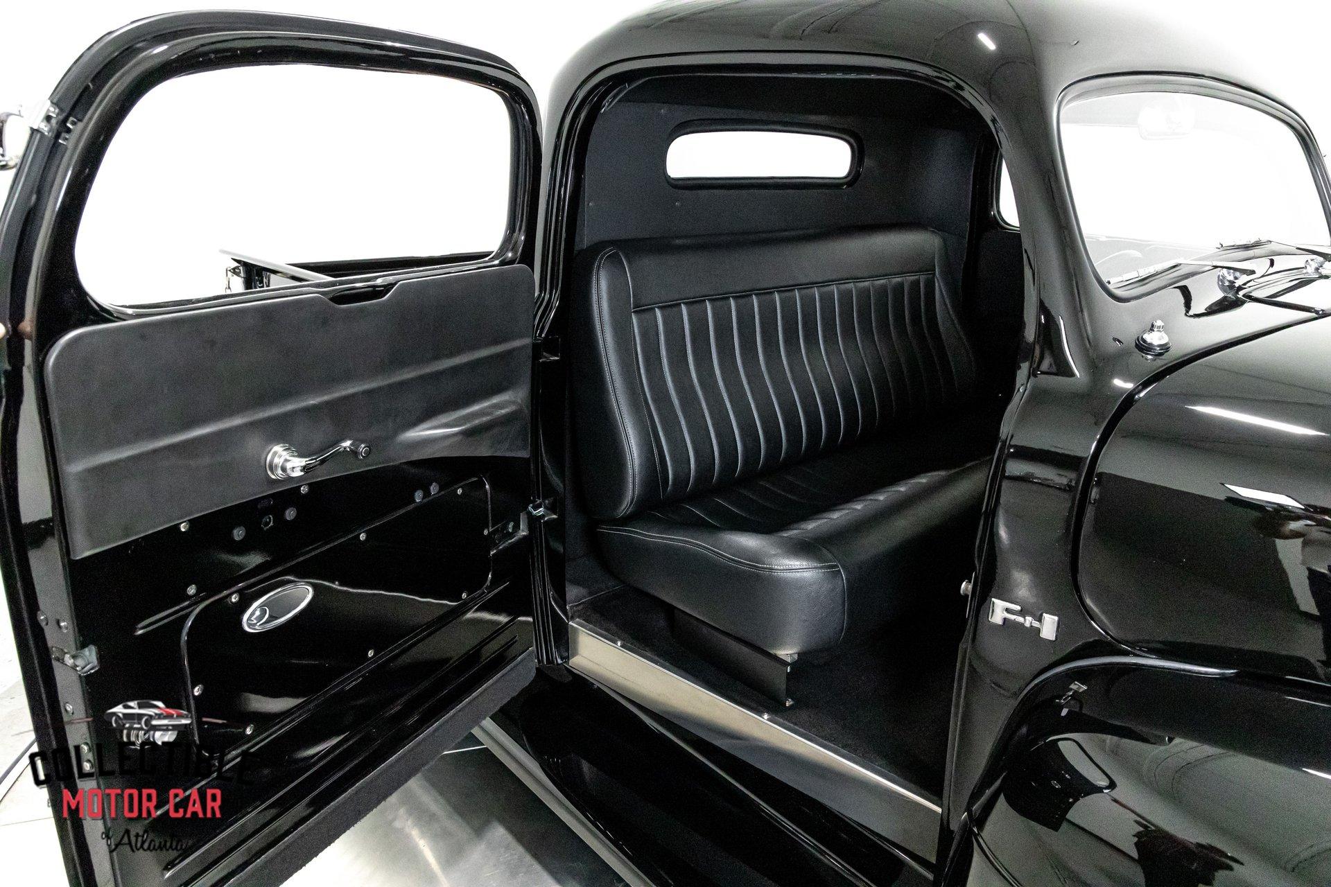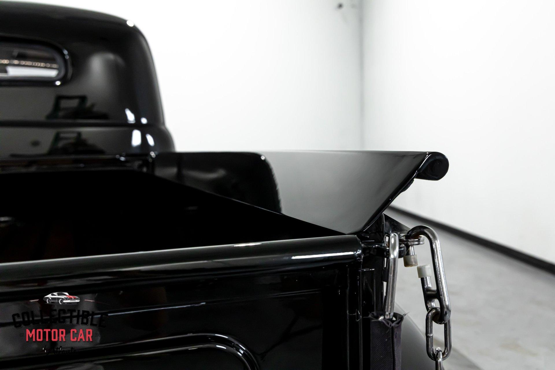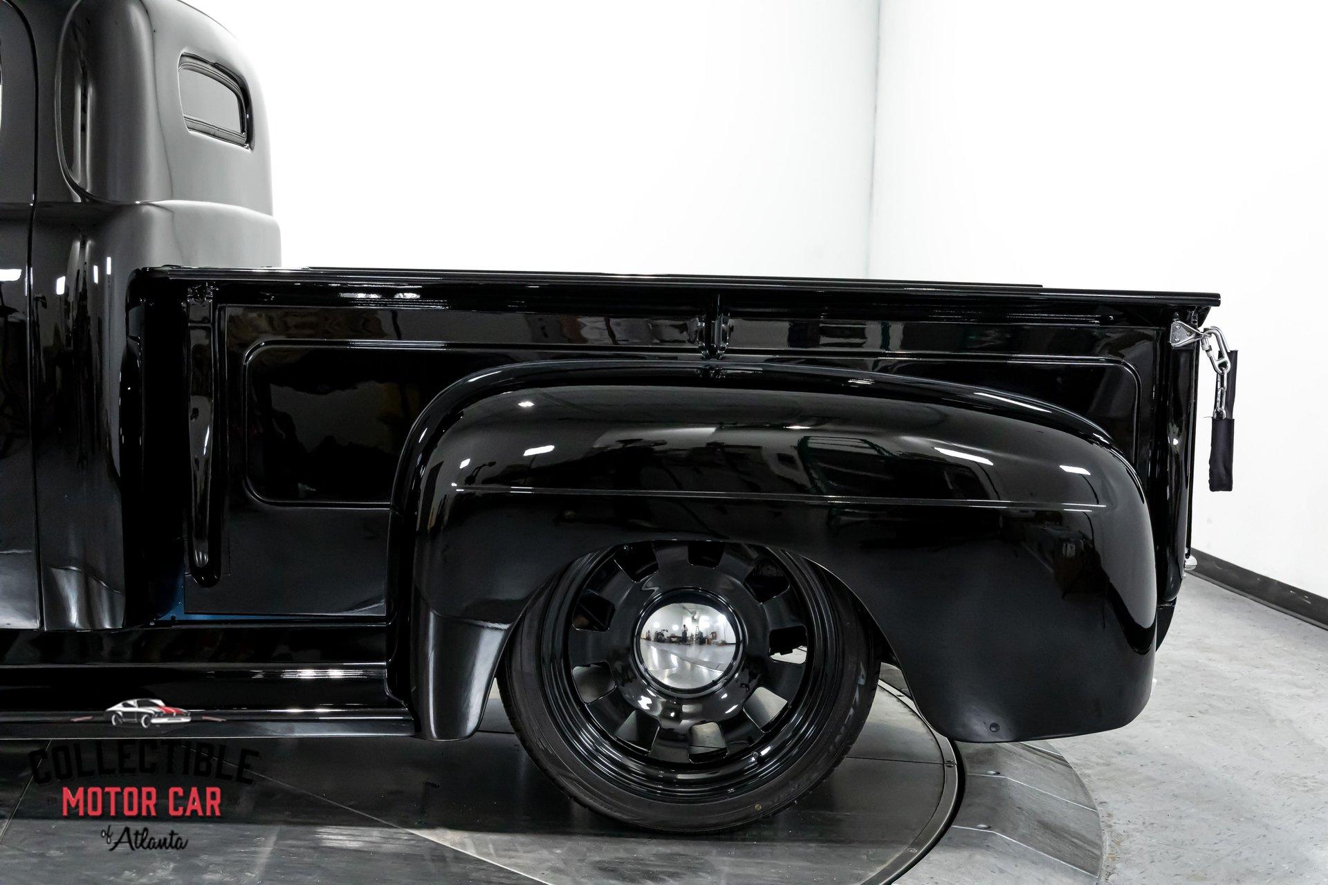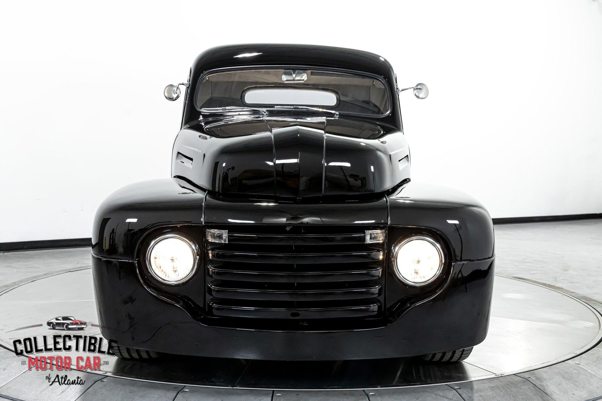 1949 Ford F1 Pickup Restomod SPECIFICATIONS: Engine: Modified Flathead V-8 Transmission: Automatic Exterior Color: Black Interior Color: Black Make: Ford Model: F1 Body Style: Pickup HIGHLIGHTS: Custom-built Flathead V-8 engine for enhanced performance Smooth-shifting automatic transmission Distinctively chopped top Stylish suicide doors for a classic custom appearance Stunning mirrored firewall showcasing the engine bay Custom interior featuring luxurious leather bench seating THE STORY: Introduced in 1948, Ford's F1 lineup quickly became a symbol of reliability and post-war innovation. This extraordinary 1949 Ford F1 Pickup has undergone a meticulous transformation, evolving from a reliable workhorse into a head-turning custom masterpiece. Sporting a chopped roofline and suicide doors, this truck exudes an unmistakably classic hot rod attitude. At the heart of this restomod is a carefully modified Flathead V-8 engine, equipped with a downdraft carburetor and a dual exhaust system for maximum power and an unforgettable exhaust note. The mirrored firewall beautifully frames the engine, highlighted by a chrome-laden bay and striking blue accents that contrast sharply against the truck’s glossy black exterior. The refined exterior maintains classic F1 aesthetics, complemented by modern custom touches. Detroit steel wheels in gloss black set an aggressive stance, perfectly matched by the waterfall grille, F1 badging, and elegantly integrated dual side mirrors. Wraparound bumpers lend a sleek, streamlined look, while the polished, body-colored wood bed with relocated fuel filler showcases the attention to detail and craftsmanship. Inside, the cabin blends vintage charm with contemporary luxury, featuring an upgraded steering wheel, premium tinted glass, and a custom leather bench seat, creating a comfortable and sophisticated driving experience. This 1949 Ford F1 Restomod Pickup offers a captivating combination of historical significance, bold customization, and exceptional craftsmanship, making it a standout vehicle for any classic automotive enthusiast. Phone 770-738-7111 Address 1750 Enterprise Way Suite 109Marietta, GA 30067 Hours of Operation Monday- Friday - 9-5pm Saturday - 9-3pm (Appointment only) Sunday - Closed
