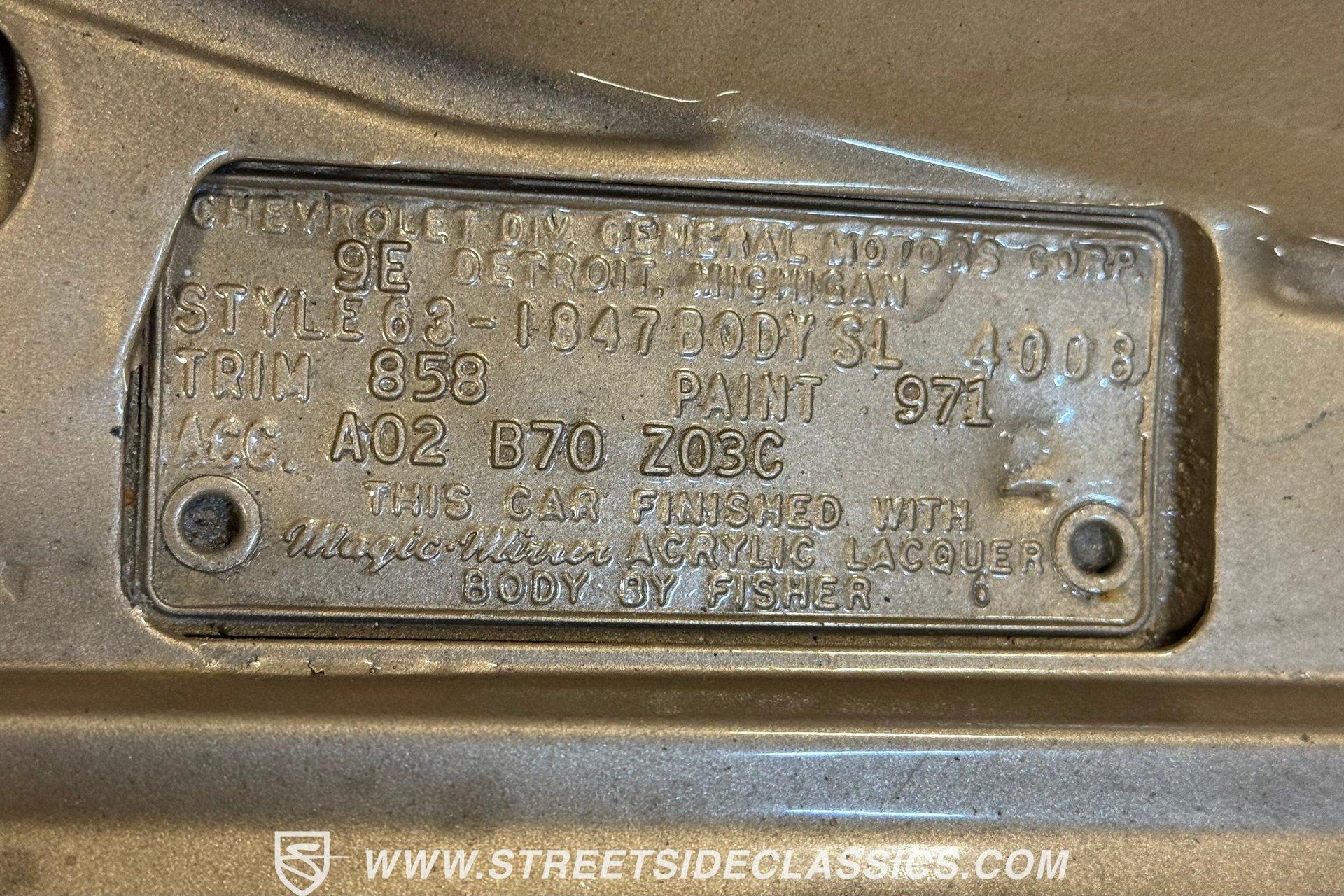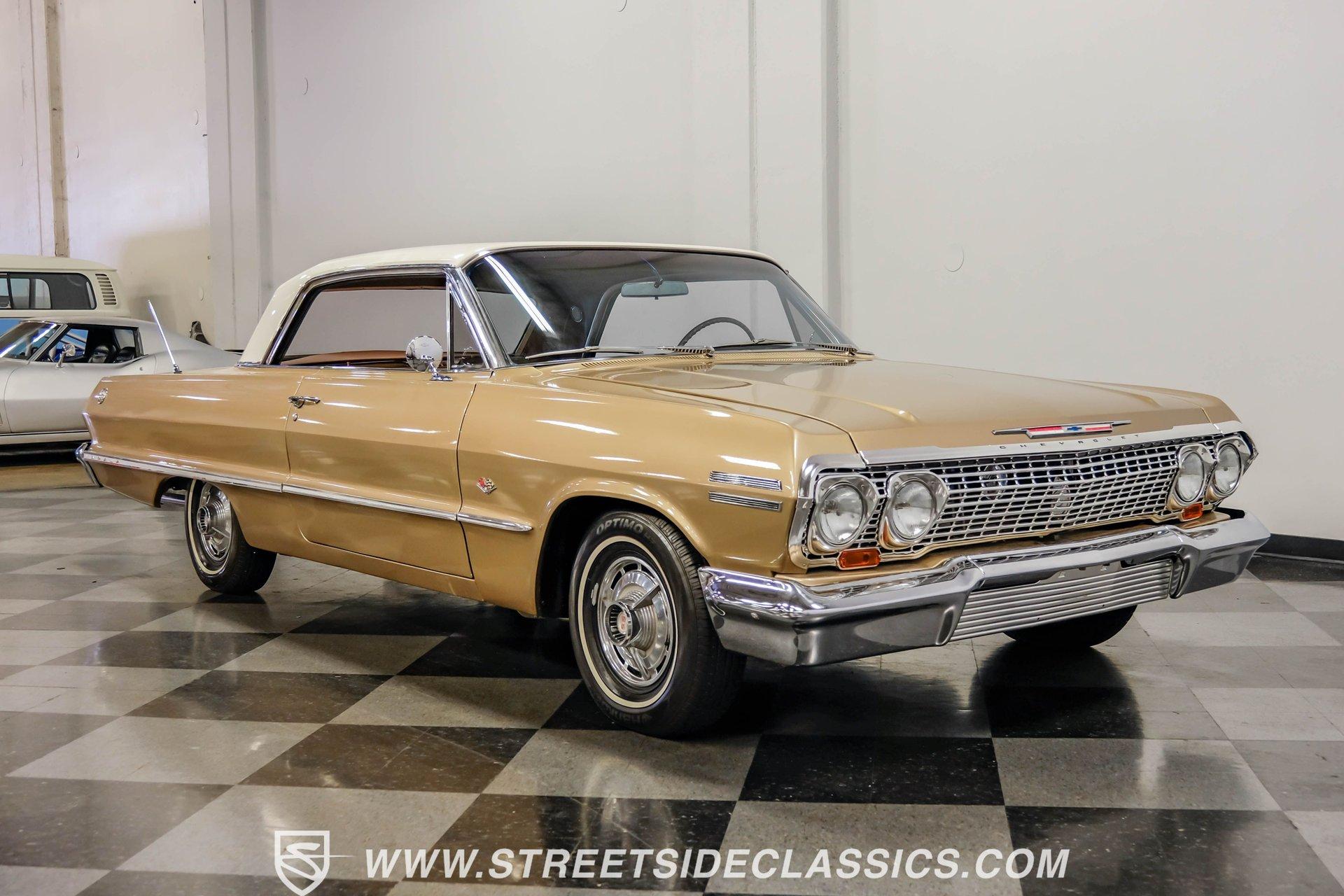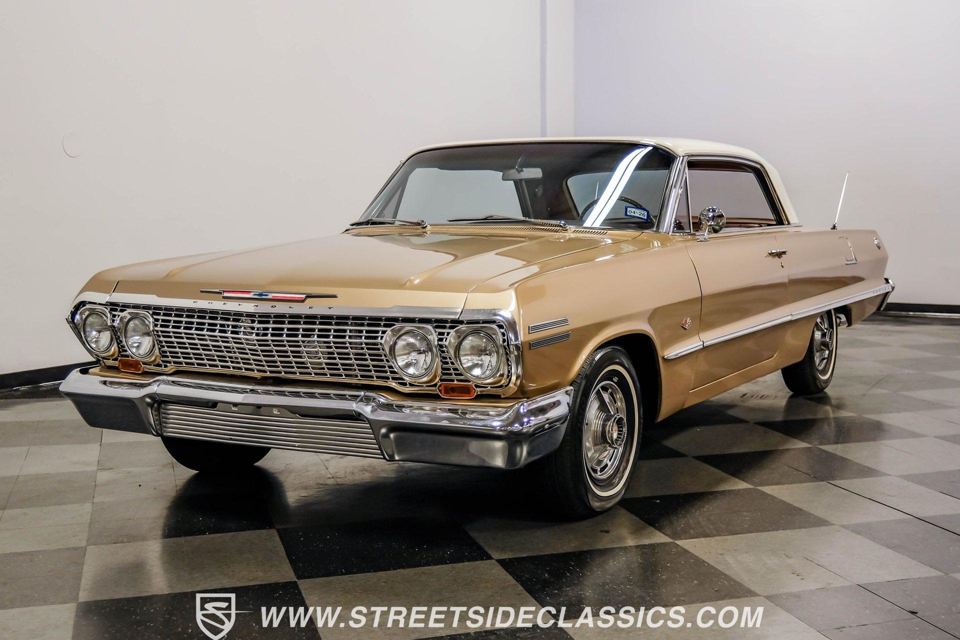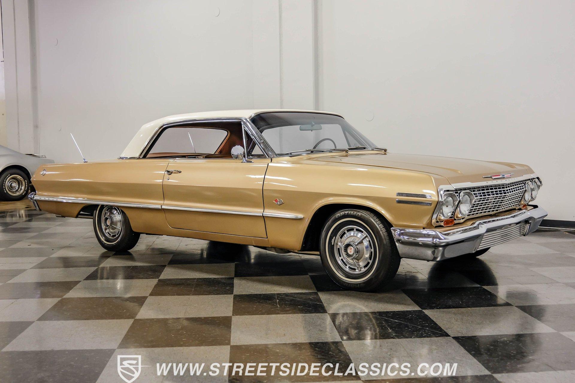 The SS, or "Super Sport," option was available for the first time in Chevrolet's 1961 catalogue. In 1962 it became a separate sub-series within the Impala lineup, in both coupe and convertible body styles. The SS models included special badging and "spinner" wheel covers, side-molding inserts, an engine-turned rear cove molding, and bucket seats with a console-for just $53.80 extra. No wonder so many opted for it. The package also included chassis enhancements and beefed-up springs and shock absorbers. Other features included power steering and brakes, metallic brake linings, a prominent column-mounted tachometer, and thin whitewall tires. This well preserved 1963 Chevrolet Impala SS's exterior is finished beautifully in the factory colors of Saddle Tan with a contrasting Adobe Tan roof which is more of a cream shade. The paint's deep gloss is enhanced by brilliant chrome and brightwork. This classic Chevy presents as originally ordered, with no exterior modifications and with correct SS wheel covers and sporty rear-mounted twin antennas. The original window sticker and dealer invoice are still with the car, showing it was sold new at Roy Smith Chevrolet in Eton, Ohio, on October 13, 1962. The interior features a color coordinating Saddle interior in excellent condition, with correct bucket seats, original clock and AM radio, desirable factory tachometer, console and 4-speed with upgraded Hurst shifter. A welcome upgrade is a modern air conditioning system with air ducts discreetly mounted under the dash. Under the hood is the original matching-numbers 327 V8 paired with a 4-speed manual transmission and power steering. Upgrades include a Brawler 4-barrel carburetor, Edelbrock chrome open-element air cleaner, quality Cool Case aluminum radiator with dual electric fans, black billet hood hinges, and a dual-chamber master cylinder linked to four-wheel disc brakes. A dual exhaust system rumbles back through Magnaflow mufflers and exits with nostalgic chrome exhaust tips. HIGHLIGHTS: Matching-Numbers 327 V8 4-Speed Manual Transmission Upgraded Power 4-Wheel Disc Brakes Original Window Sticker and Dealer Invoice Cool Case Aluminum Radiator Brawler 4-Barrel Carburetor Modern Air Conditioning System Power Steering Magnaflow Mufflers Factory Tachometer Factory Bucket Seats Correct Factory SS Spinner Wheel Covers Factory AM Radio Twin Rear-Mounted Antennas This matching number 327, 4-speed, 1963 Chevrolet Impala SS has been thoughtfully upgraded in just the right places, remaining largely stock in appearance, but much safer and satisfying to drive that it was when new. Call today!