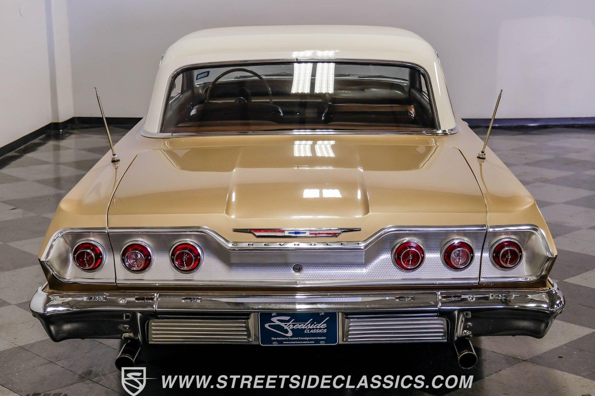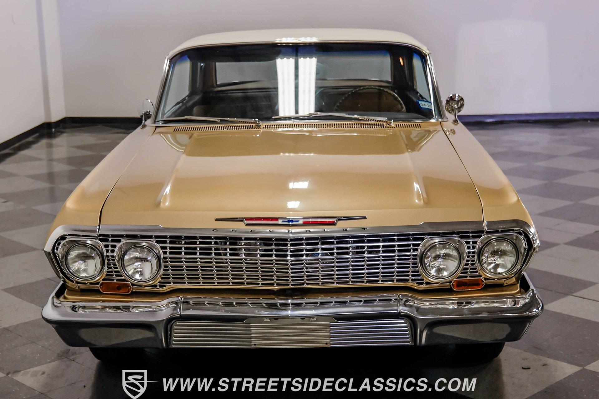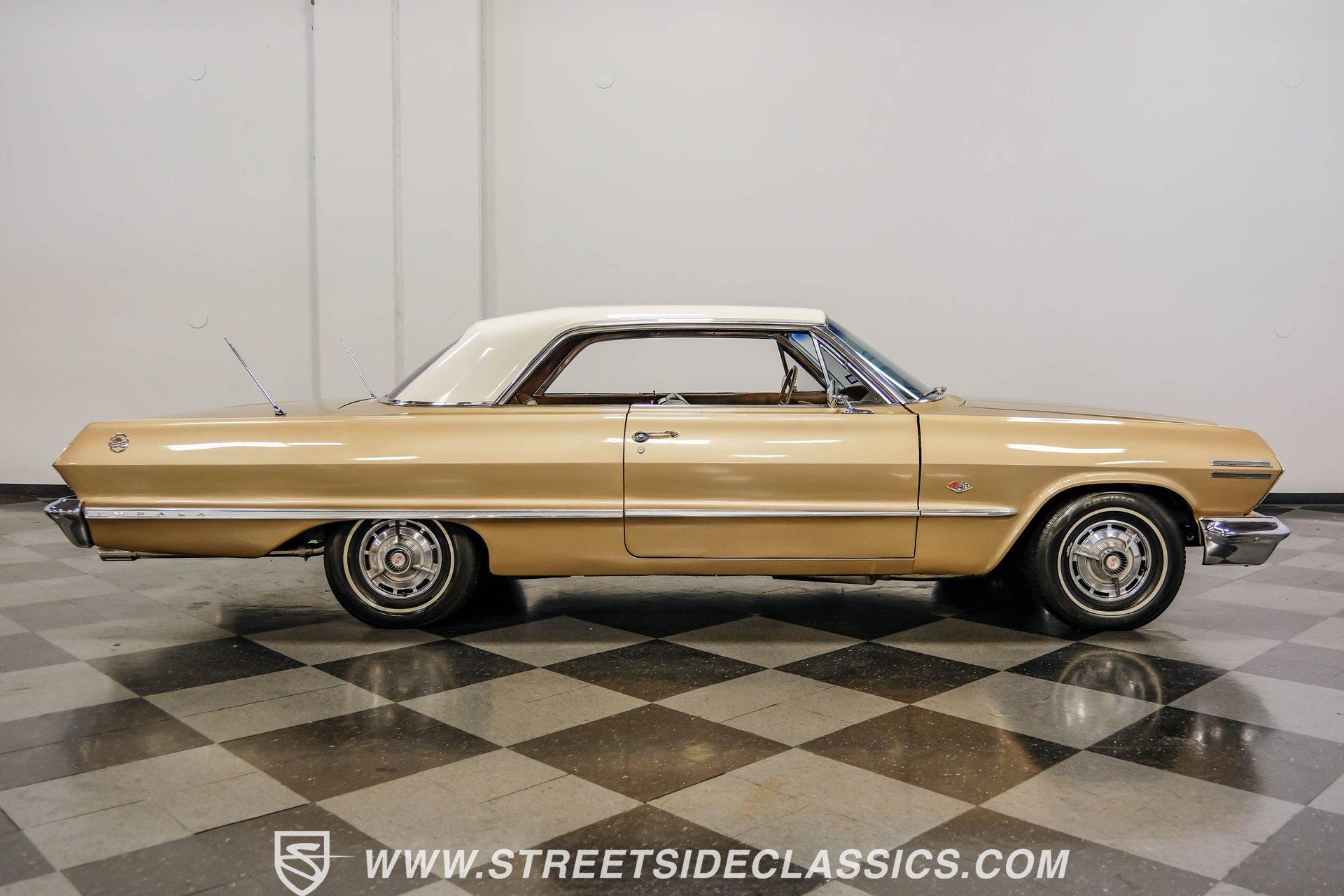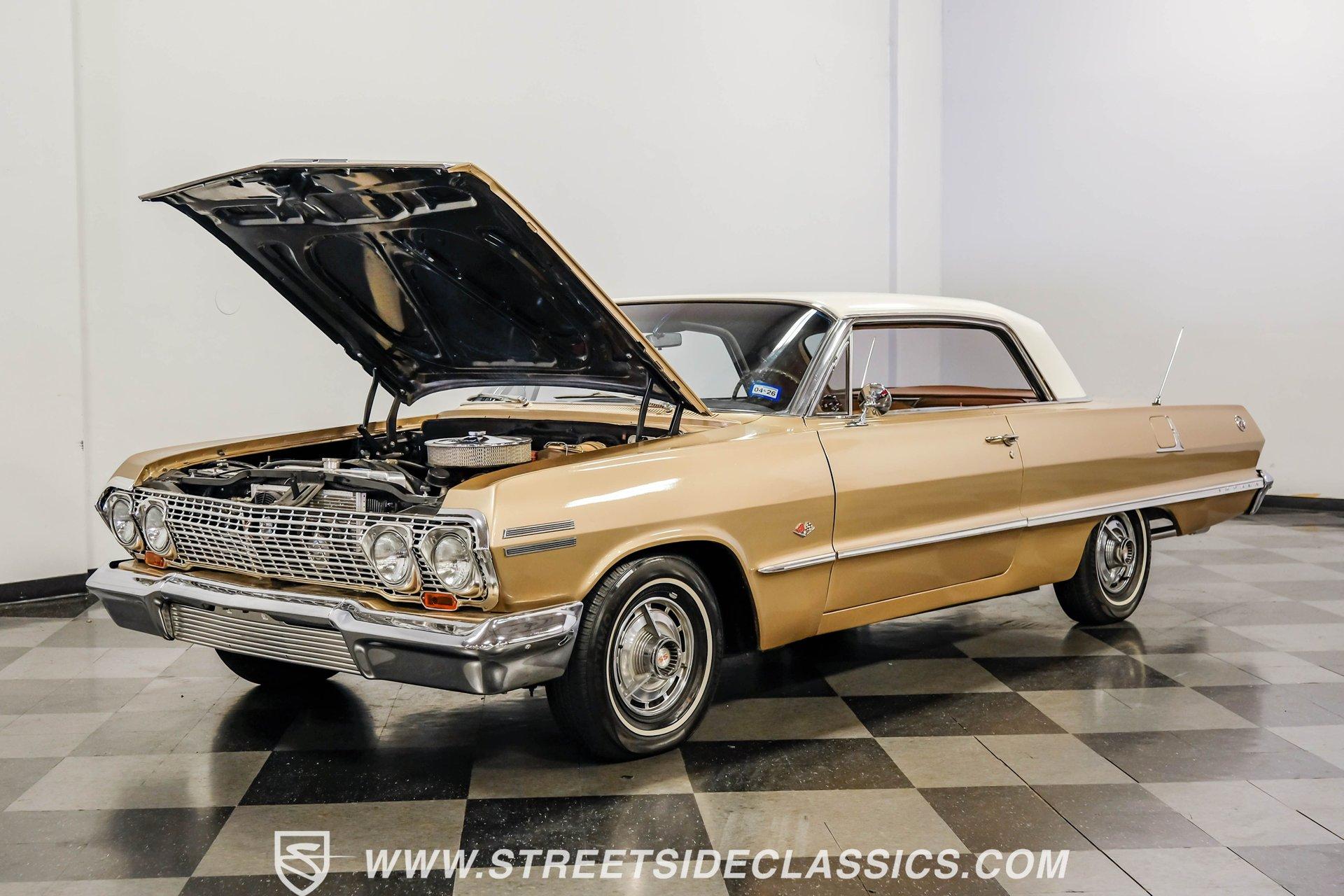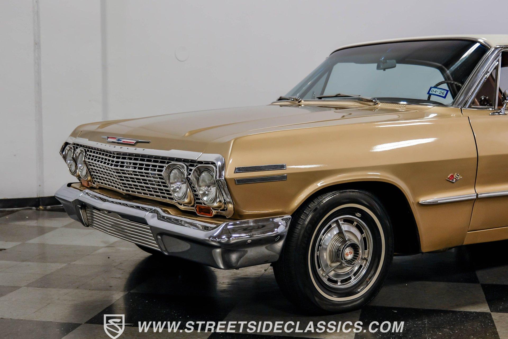 The SS, or "Super Sport," option was available for the first time in Chevrolet's 1961 catalogue. In 1962 it became a separate sub-series within the Impala lineup, in both coupe and convertible body styles. The SS models included special badging and "spinner" wheel covers, side-molding inserts, an engine-turned rear cove molding, and bucket seats with a console-for just $53.80 extra. No wonder so many opted for it. The package also included chassis enhancements and beefed-up springs and shock absorbers. Other features included power steering and brakes, metallic brake linings, a prominent column-mounted tachometer, and thin whitewall tires. This well preserved 1963 Chevrolet Impala SS's exterior is finished beautifully in the factory colors of Saddle Tan with a contrasting Adobe Tan roof which is more of a cream shade. The paint's deep gloss is enhanced by brilliant chrome and brightwork. This classic Chevy presents as originally ordered, with no exterior modifications and with correct SS wheel covers and sporty rear-mounted twin antennas. The original window sticker and dealer invoice are still with the car, showing it was sold new at Roy Smith Chevrolet in Eton, Ohio, on October 13, 1962. The interior features a color coordinating Saddle interior in excellent condition, with correct bucket seats, original clock and AM radio, desirable factory tachometer, console and 4-speed with upgraded Hurst shifter. A welcome upgrade is a modern air conditioning system with air ducts discreetly mounted under the dash. Under the hood is the original matching-numbers 327 V8 paired with a 4-speed manual transmission and power steering. Upgrades include a Brawler 4-barrel carburetor, Edelbrock chrome open-element air cleaner, quality Cool Case aluminum radiator with dual electric fans, black billet hood hinges, and a dual-chamber master cylinder linked to four-wheel disc brakes. A dual exhaust system rumbles back through Magnaflow mufflers and exits with nostalgic chrome exhaust tips. HIGHLIGHTS: Matching-Numbers 327 V8 4-Speed Manual Transmission Upgraded Power 4-Wheel Disc Brakes Original Window Sticker and Dealer Invoice Cool Case Aluminum Radiator Brawler 4-Barrel Carburetor Modern Air Conditioning System Power Steering Magnaflow Mufflers Factory Tachometer Factory Bucket Seats Correct Factory SS Spinner Wheel Covers Factory AM Radio Twin Rear-Mounted Antennas This matching number 327, 4-speed, 1963 Chevrolet Impala SS has been thoughtfully upgraded in just the right places, remaining largely stock in appearance, but much safer and satisfying to drive that it was when new. Call today!