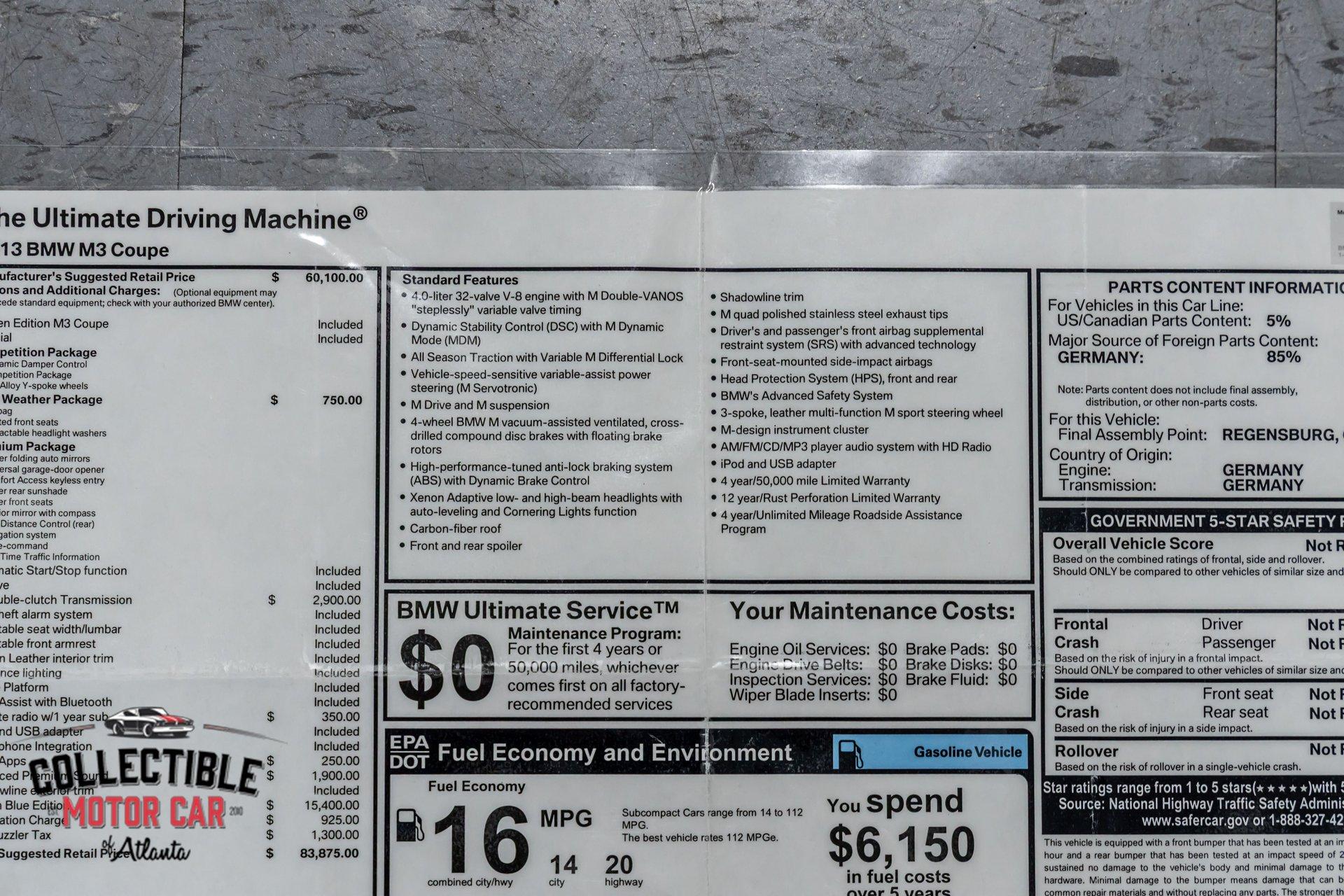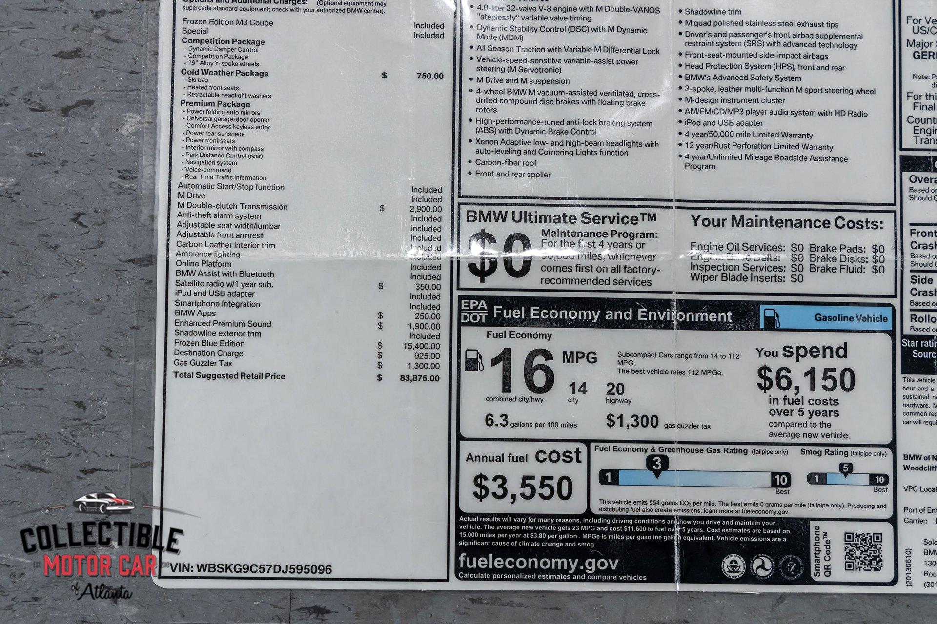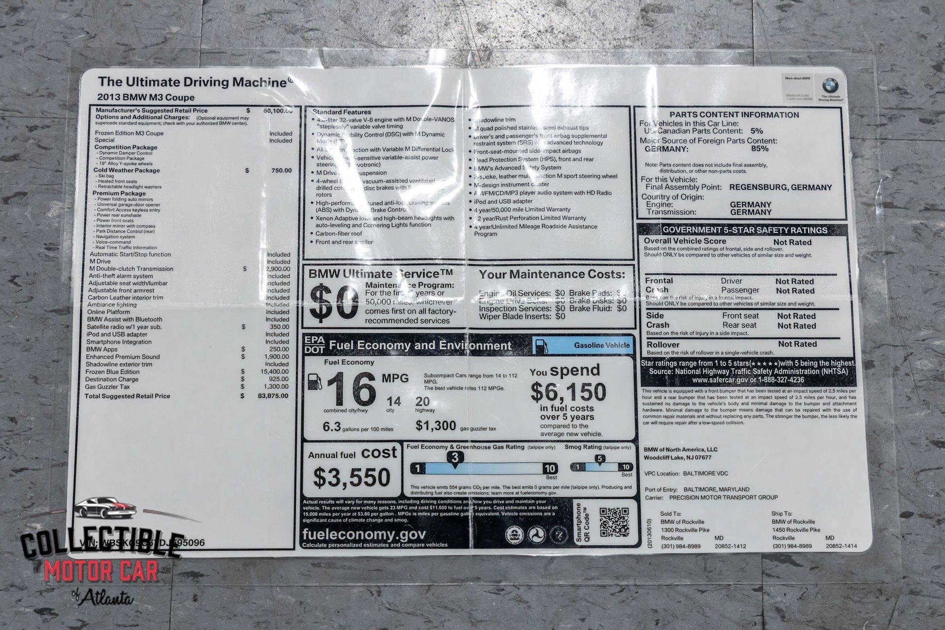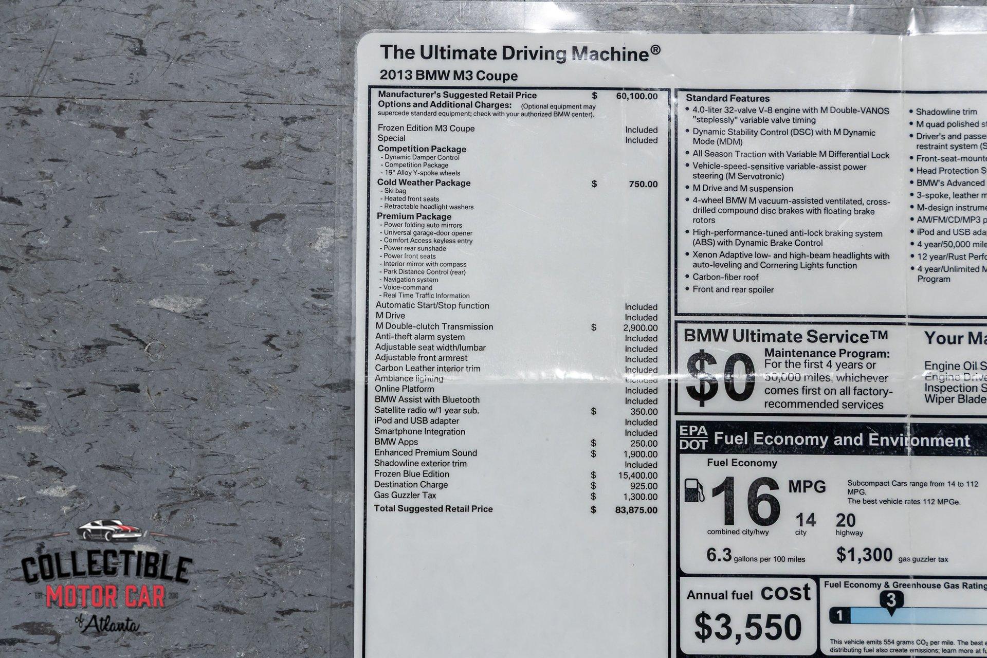 2013 BMW M3 Coupe – Individual Frozen Blue – 15,XXX Miles - (1 of 72 examples) One of the lowest-mileage individual E92 M3s on the market. Finished in BMW Individual Frozen Blue Metallic ($15,400 factory option) over Black Novillo Extended Leather with Individual Blue Stitching. Just 15,000 miles, garage-kept, no stories. Factory Options: Individual Frozen Blue Metallic Paint ($15,400) Competition Package (ZCP): 19” Y-spoke wheels, revised suspension, M Dynamic Mode Premium Package: Comfort Access, power lumbar, power folding mirrors Cold Weather Package: Heated front seats, headlight washers Dual-Clutch Transmission (DCT) Black Novillo Extended Leather Interior w/ Blue Contrast Stitching Factory Lip Spoiler Delete Key Specs: 4.0L S65 V8 – 414 HP / 295 lb-ft torque Individual throttle bodies, Double VANOS 8400 RPM redline 7-speed DCT Rear-wheel drive with factory limited-slip differential Includes BOTH original keys, owner’s manual, and factory WINDOW STICKER. 1 of 72 Frozen Blue in the world. 1 of 150 Frozen paint cars (including blue, white, red, and black). Clean title. No accidents. Stored in climate-controlled garage. ? Phone: 770-738-7111 ? Address: 1750 Enterprise Way, Suite 109, Marietta, GA 30067 ? Hours of Operation: Monday–Friday: 9 AM – 5 PM Saturday: 9 AM – 3 PM (Appointment Only) Sunday: Closed