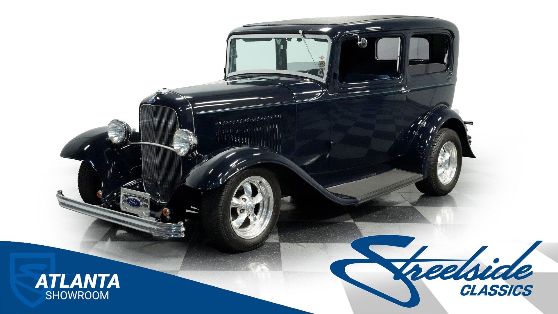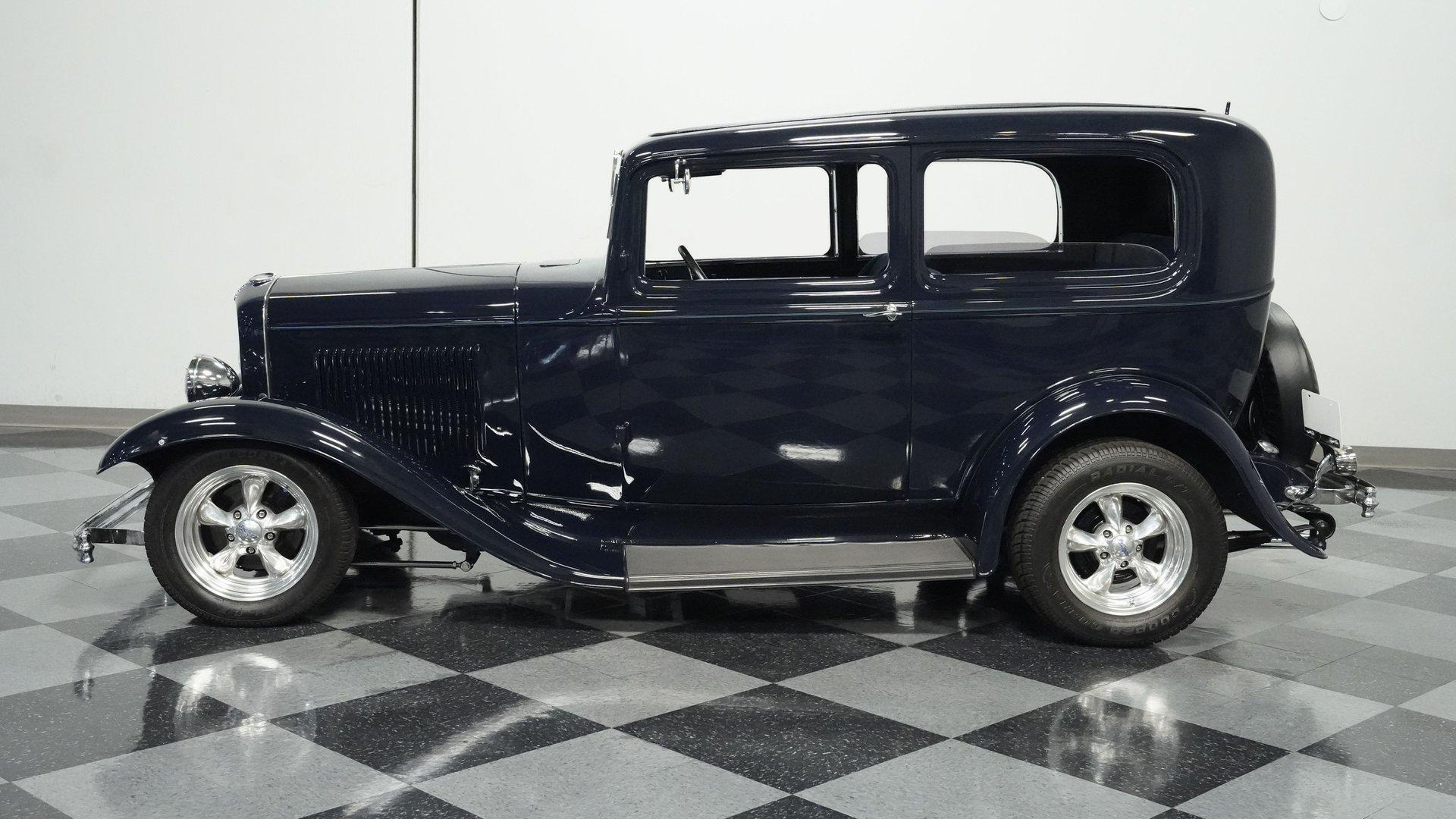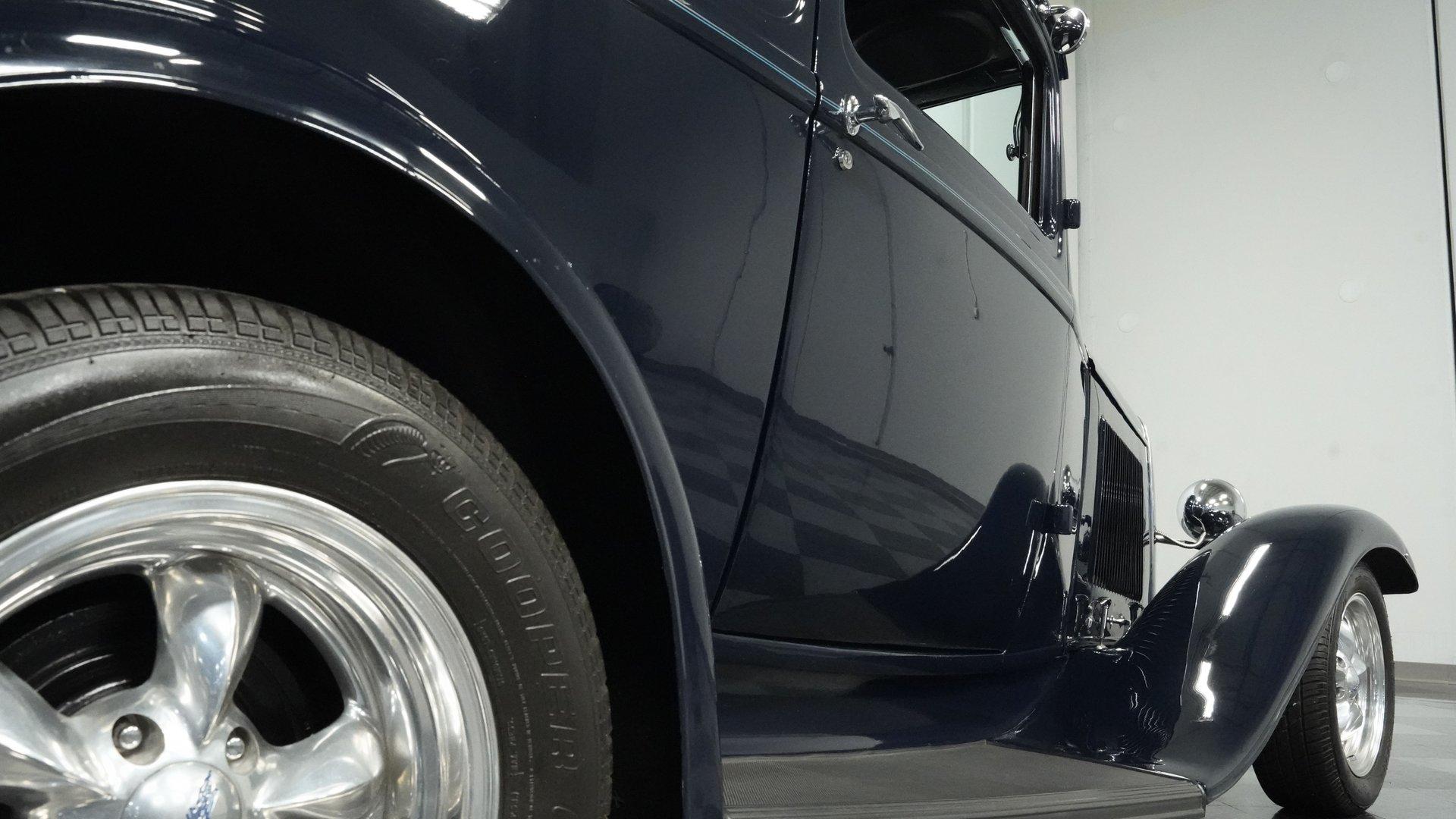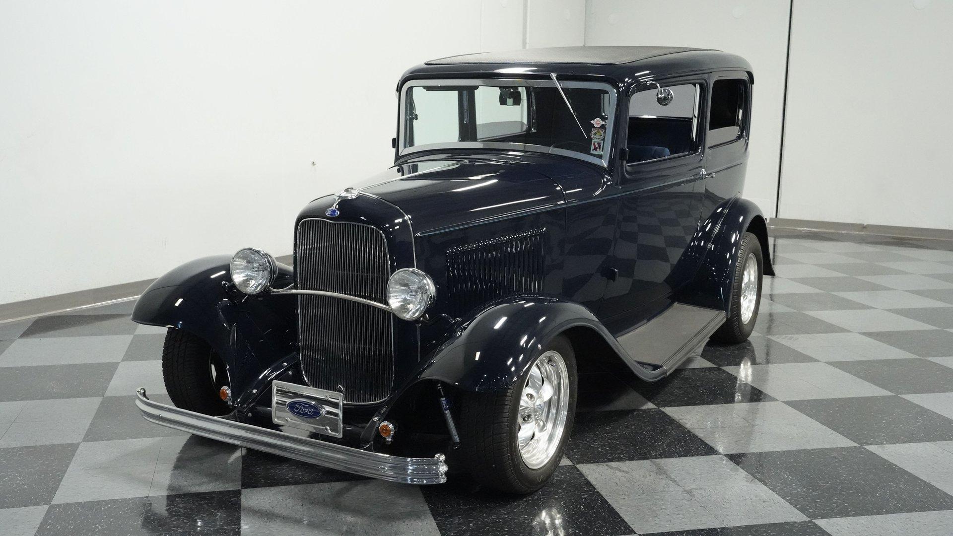 Finished beautifully in a Dark Blue with a mirror gloss shine, this handsome, steel bodied 1932 Ford Tudor Street Rod is a cool street rod full of quality upgrades. Features include a steel body with fiberglass fenders and running boards, hand-painted pinstripes and a classy rear-mounted spare tire with cover. A set of 15-inch polished Boyd Coddington wheels wrapped with Cooper Cobra Radial G/T tires staggered 195/60R15 front and 235/60R15 rear give this classic Ford just the right street rod stance. The well-appointed blue cloth interior is fitted with comfortable bucket seats, custom door panels, seatbelts front and rear, a cold Vintage air conditioning system, power windows, cruise control, tilt steering column, custom steering wheel, and a full set of white-faced VDO gauges housed in an attractive billet aluminum housing mounted in the center of the dash. A cool roof console houses a retro Cobra 25LTD Classic CB radio and an Alpine AM/FM/CD/Bluetooth radio linked to amplifiers and a subwoofer located behind the rear seat providing entertainment when cruising. Under the hood is a healthy 350 cubic inch Chevy engine mated to a TH350 3-speed automatic transmission that sends power back to a 10-bolt rear end. Other mechanical highlights include aluminum heads, "Mutha' Thumpr" COMP cam, polished Edelbrock intake manifold, Edelbrock carburetor, aluminum valve covers, serpentine belt system, triangulated four-link front suspension rods, front disc brakes, HAL QA1 Aluma Matic coil-over shocks front and rear, and Sanderson headers that rumble back through a dual exhaust system with gas pack-style mufflers. HIGHLIGHTS: Steel Body Fiberglass Fenders and Running Boards 350 Chevrolet Engine TH350 Automatic Transmission Front Disc Brakes Aluminum Heads Edelbrock Carburetor Polished Edelbrock Intake Manifold Sanderson Headers Serpentine Belt System QA1 Aluma Matic Shocks Air Conditioning Power Windows Tilt Steering Column VDO Gauges Bucket Seats Front and Rear Seat Belts Boyd Coddington Wheels Alpine Stereo with Amps and Subwoofer Cobra CB Radio This is a high-quality build that is comfortable and fun to drive anywhere. This great looking 1932 Ford Tudor Street Rod will turn heads at your local cruise night or cars and coffee event, but is also a comfortable touring machine as well. Call today!