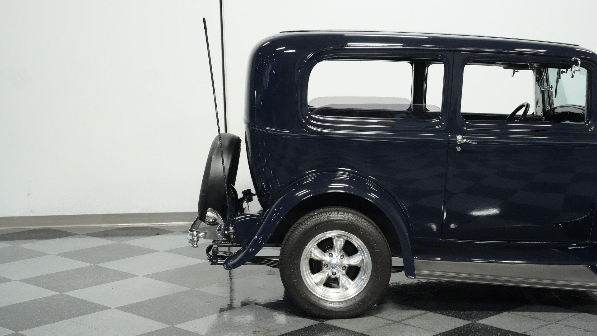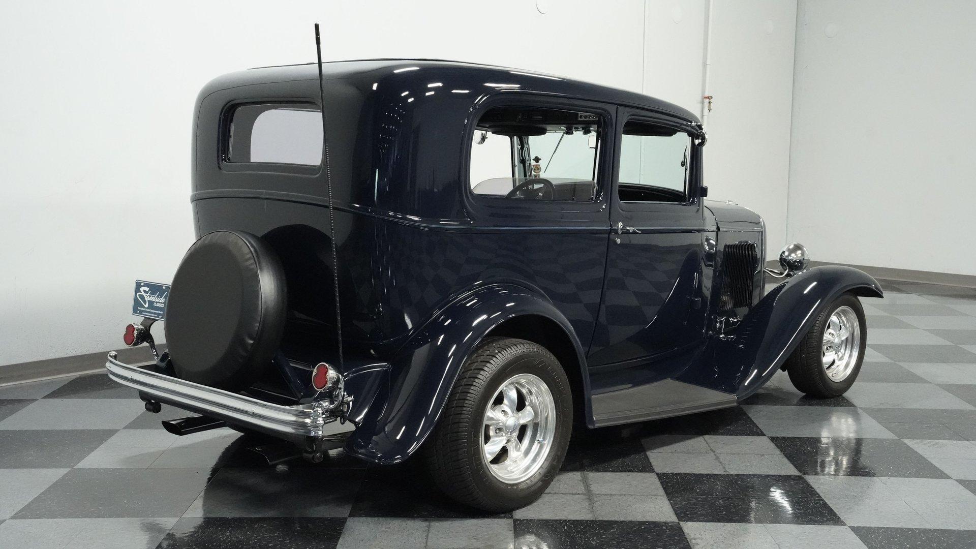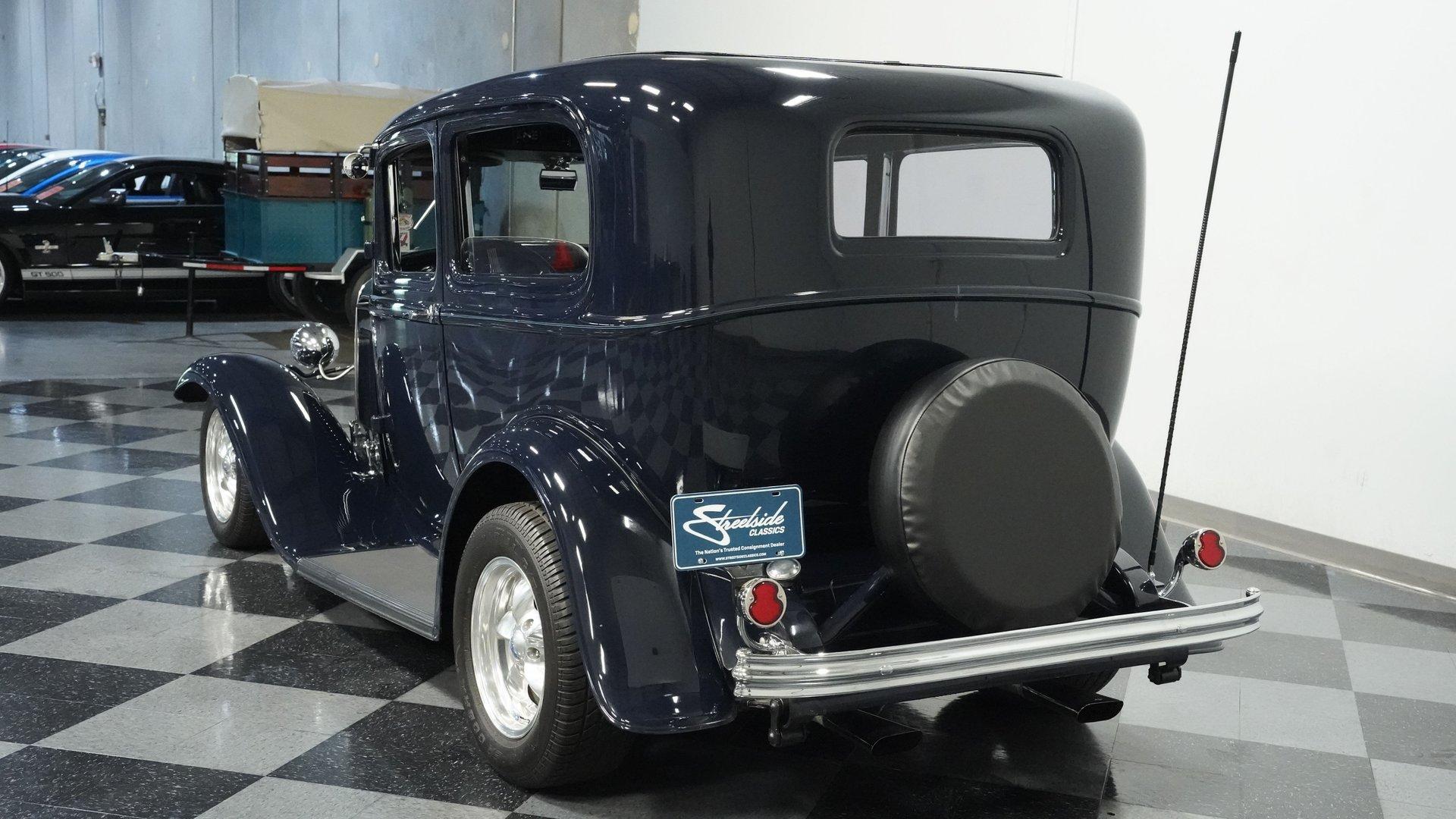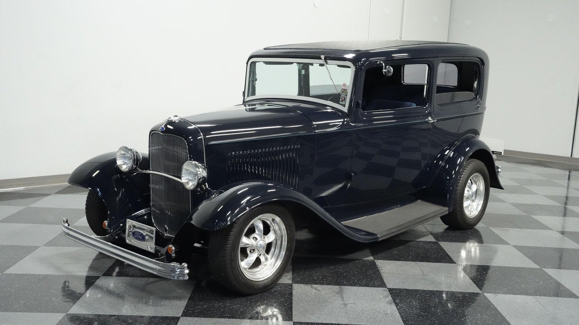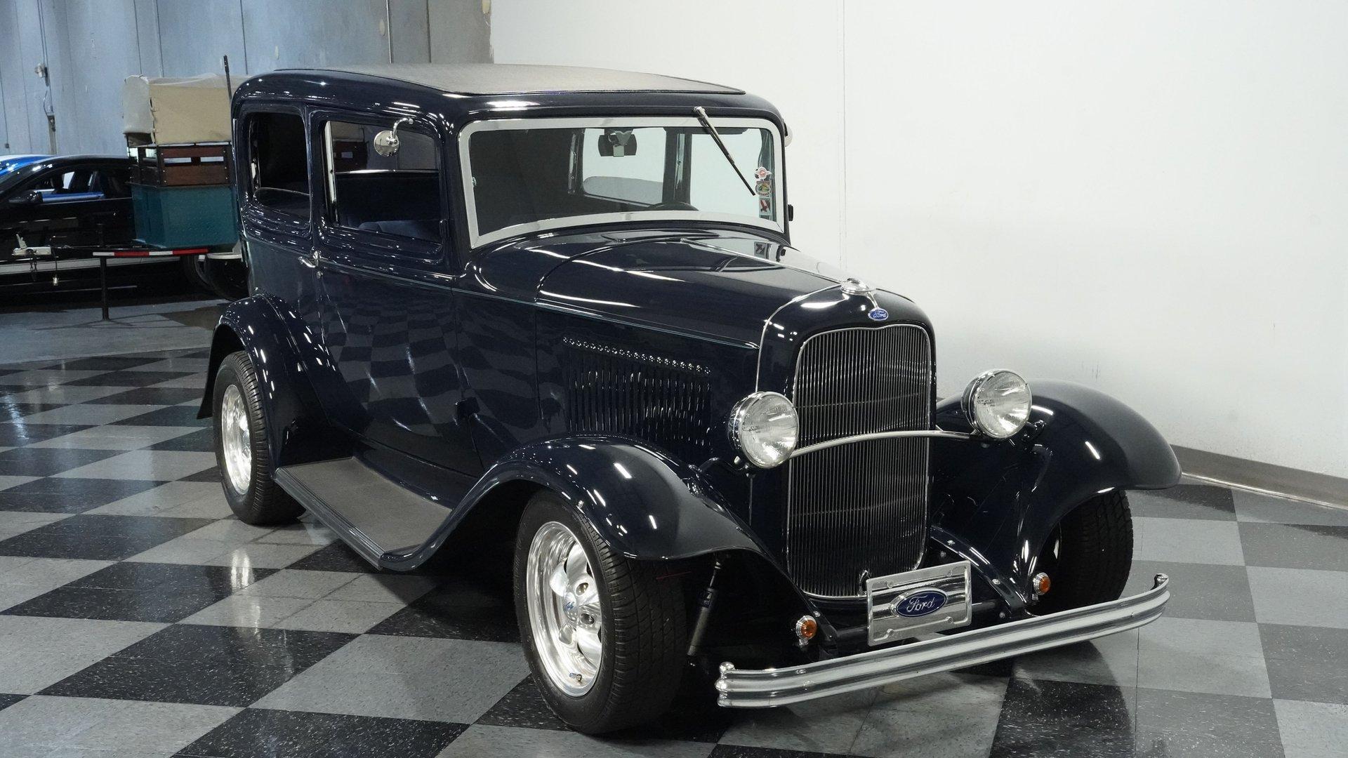 Finished beautifully in a Dark Blue with a mirror gloss shine, this handsome, steel bodied 1932 Ford Tudor Street Rod is a cool street rod full of quality upgrades. Features include a steel body with fiberglass fenders and running boards, hand-painted pinstripes and a classy rear-mounted spare tire with cover. A set of 15-inch polished Boyd Coddington wheels wrapped with Cooper Cobra Radial G/T tires staggered 195/60R15 front and 235/60R15 rear give this classic Ford just the right street rod stance. The well-appointed blue cloth interior is fitted with comfortable bucket seats, custom door panels, seatbelts front and rear, a cold Vintage air conditioning system, power windows, cruise control, tilt steering column, custom steering wheel, and a full set of white-faced VDO gauges housed in an attractive billet aluminum housing mounted in the center of the dash. A cool roof console houses a retro Cobra 25LTD Classic CB radio and an Alpine AM/FM/CD/Bluetooth radio linked to amplifiers and a subwoofer located behind the rear seat providing entertainment when cruising. Under the hood is a healthy 350 cubic inch Chevy engine mated to a TH350 3-speed automatic transmission that sends power back to a 10-bolt rear end. Other mechanical highlights include aluminum heads, "Mutha' Thumpr" COMP cam, polished Edelbrock intake manifold, Edelbrock carburetor, aluminum valve covers, serpentine belt system, triangulated four-link front suspension rods, front disc brakes, HAL QA1 Aluma Matic coil-over shocks front and rear, and Sanderson headers that rumble back through a dual exhaust system with gas pack-style mufflers. HIGHLIGHTS: Steel Body Fiberglass Fenders and Running Boards 350 Chevrolet Engine TH350 Automatic Transmission Front Disc Brakes Aluminum Heads Edelbrock Carburetor Polished Edelbrock Intake Manifold Sanderson Headers Serpentine Belt System QA1 Aluma Matic Shocks Air Conditioning Power Windows Tilt Steering Column VDO Gauges Bucket Seats Front and Rear Seat Belts Boyd Coddington Wheels Alpine Stereo with Amps and Subwoofer Cobra CB Radio This is a high-quality build that is comfortable and fun to drive anywhere. This great looking 1932 Ford Tudor Street Rod will turn heads at your local cruise night or cars and coffee event, but is also a comfortable touring machine as well. Call today!