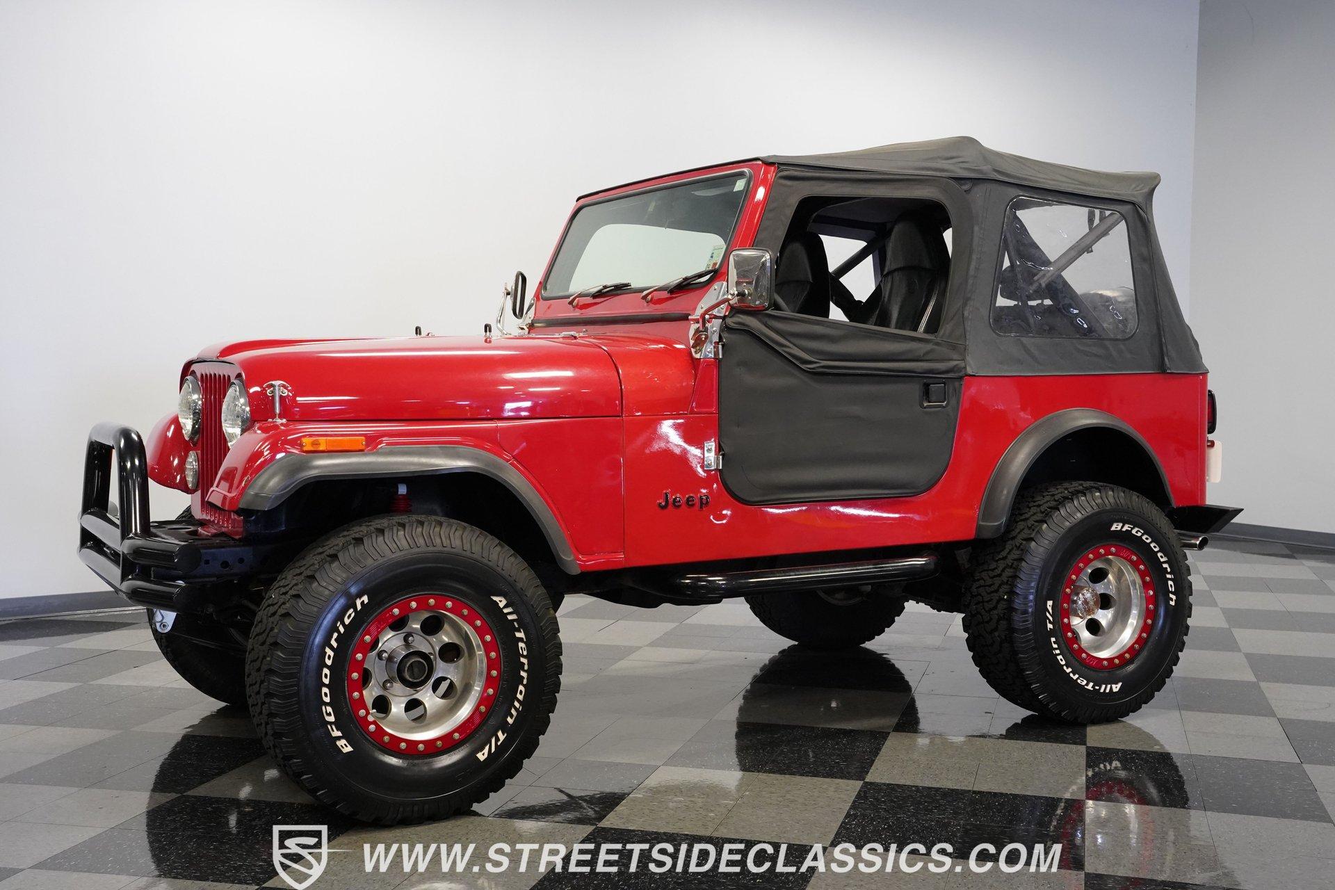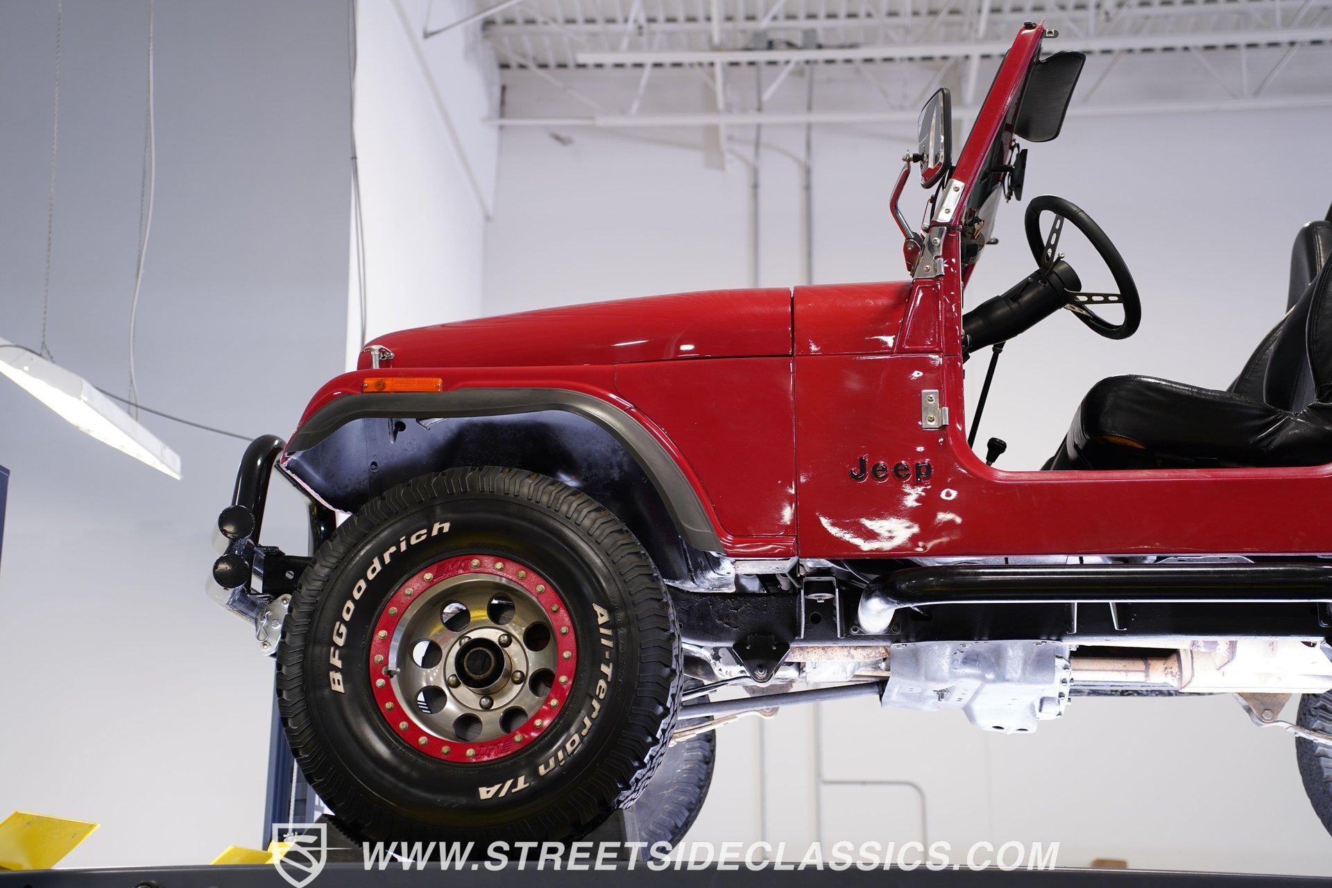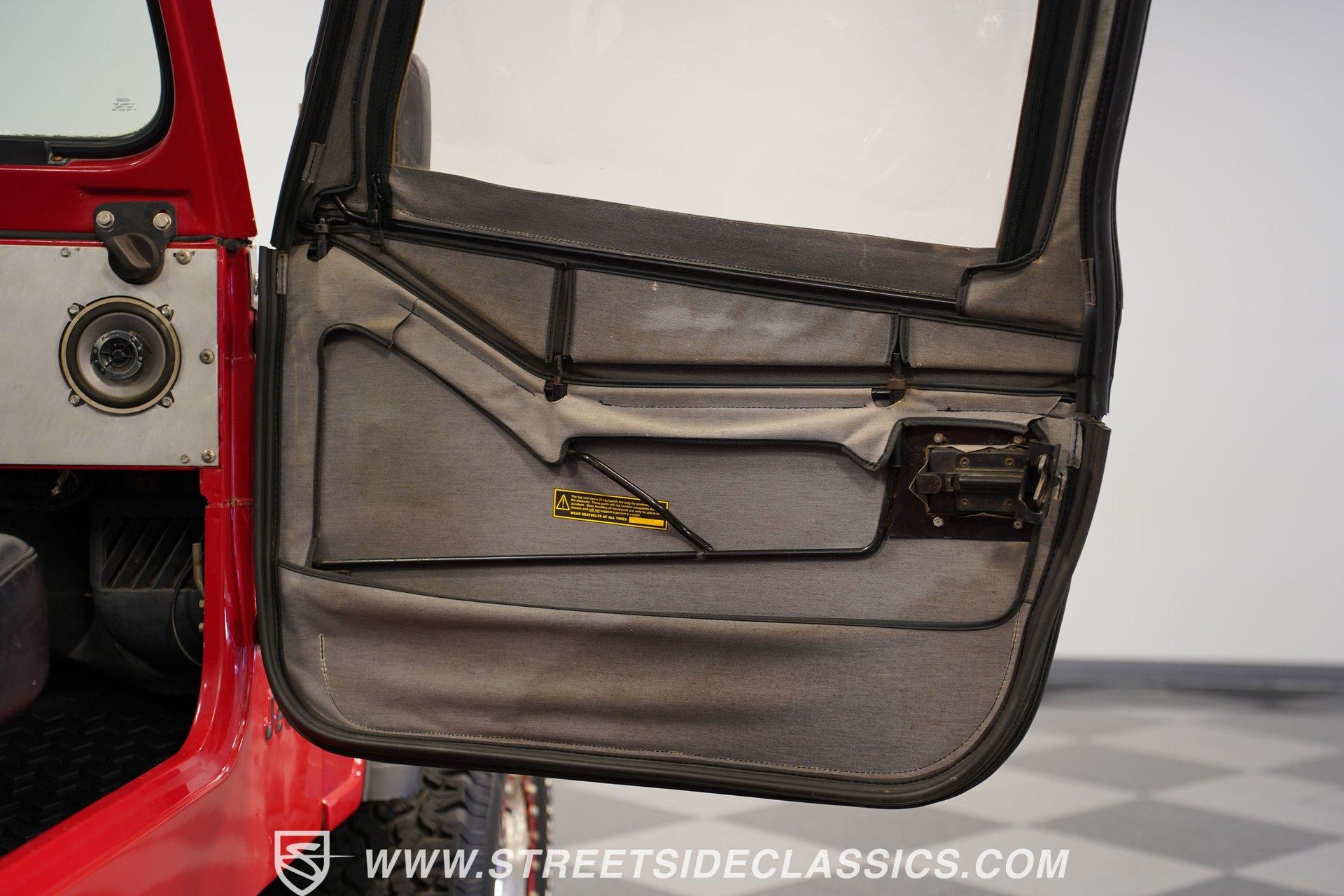 In terms of pure visual recognition, nothing comes close to the iconic Jeep brand. Before the Wrangler came along, the Jeep CJ series was literally a civilian version (CJ stood for Civilian Jeep) of the military variants, which meant it was a more driver- and passenger-friendly version. First introduced in 1945 with the Willys CJ-2A, this 1986 Jeep CJ7 4X4 represents the final year for the hardcore CJ lineup. Decked out in its vibrant red exterior, this CJ7 is equipped with an easy-to-remove vinyl top and doors, a stout double-tube front bumper, and matching tubular side steps. Inside, we find a typical Spartan Jeep interior. An aftermarket center console separates a pair of supportive bucket seats. A three-spoke, power-assisted steering wheel sits atop a tilt column, while push/pull and twist knobs are used for HVAC controls. An upgraded set of AutoMeter gauges, featuring a large 120 mph speedometer and a 7,000 rpm tachometer, sits closest to the driver, while a quartet of auxiliary gauges provides all the pertinent information required to monitor the engine. Two twist knobs are ready to let you fold down the front windshield if the desire hits you. Under the hood, we find a 350 cubic-inch V-8 engine. Fed using throttle-body injection, this small block dispenses with spent gases through a set of Headman headers that feed into a dual exhaust capped off with a pair of FlowMaster mufflers to give this Jeep an impressive and throaty growl. Power is routed through a tried-and-true four-speed manual transmission before heading out to the Dana rear axle that transfers those ponies to the pavement via a set of 15-inch wheels shod in big 33-inch BFG All-Terrain T/A tires. Engage the front axle using the manually-locking front hubs, and all four wheels are ready to tackle any terrain you can throw at them. HIGHLIGHTS: *Final Year CJ *Vinyl Top *Vinyl Doors *Double Tube Front Bumper *Tubular Side Steps *350 CID V8 *TBI *Headman Headers *Dual Exhaust *FlowMasters *Four Speed Manual *Four Wheel Drive *Skyjacker Shocks *33 Inch BFGs *Front Disc Brakes *Power Steering *AutoMeter Gauges *Tilt Column *Aftermarket Center Console This 1986 Jeep CJ7 4X4 rides on a leaf spring suspension at both the front and rear, aided by Skyjacker shocks at all four corners. Unassisted brakes utilize front discs to help rein in speed whenever necessary. If you want to get your hands on the last year of the legendary CJ Jeep lineup, then this is the truck you've been waiting for. Call today!