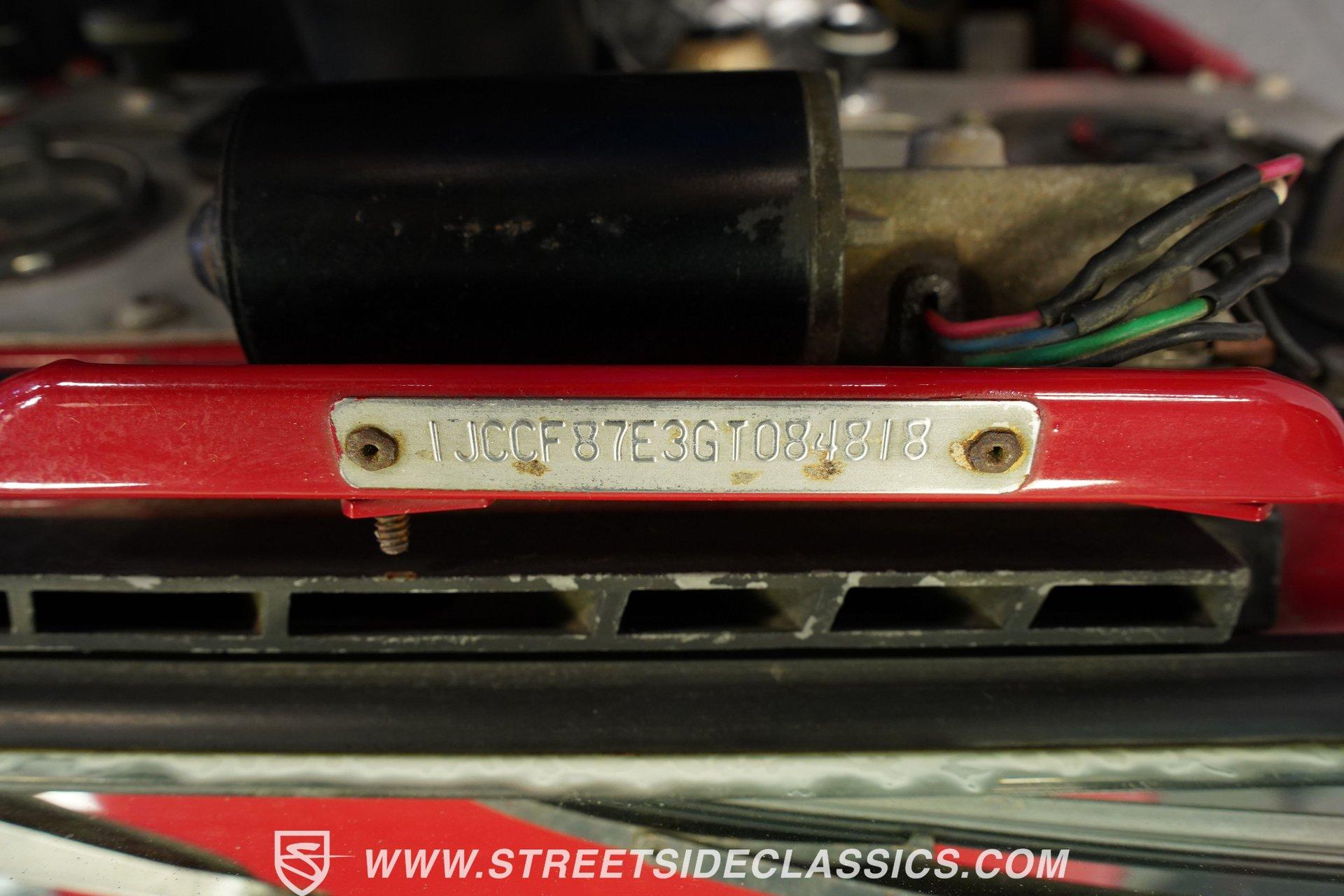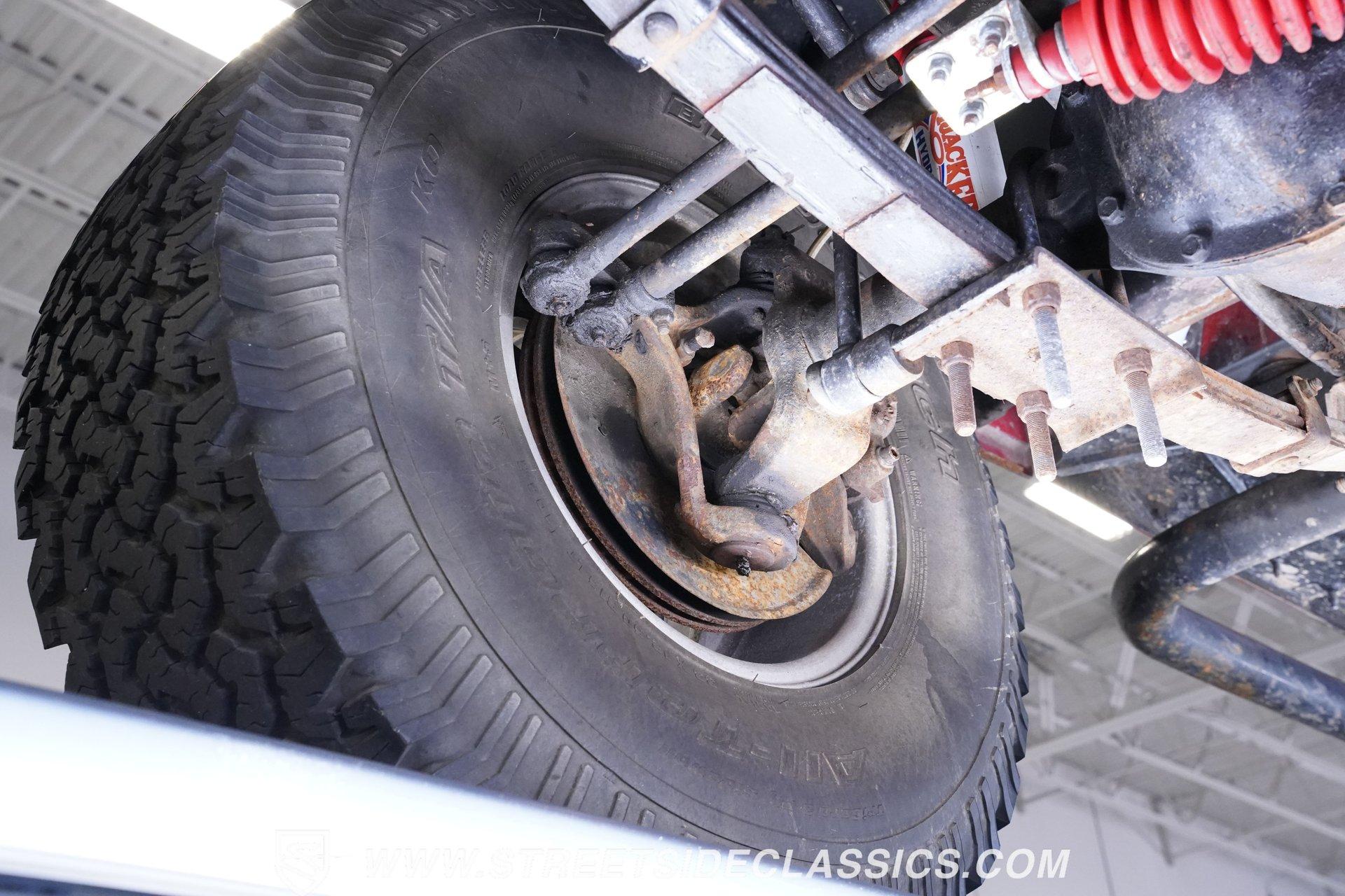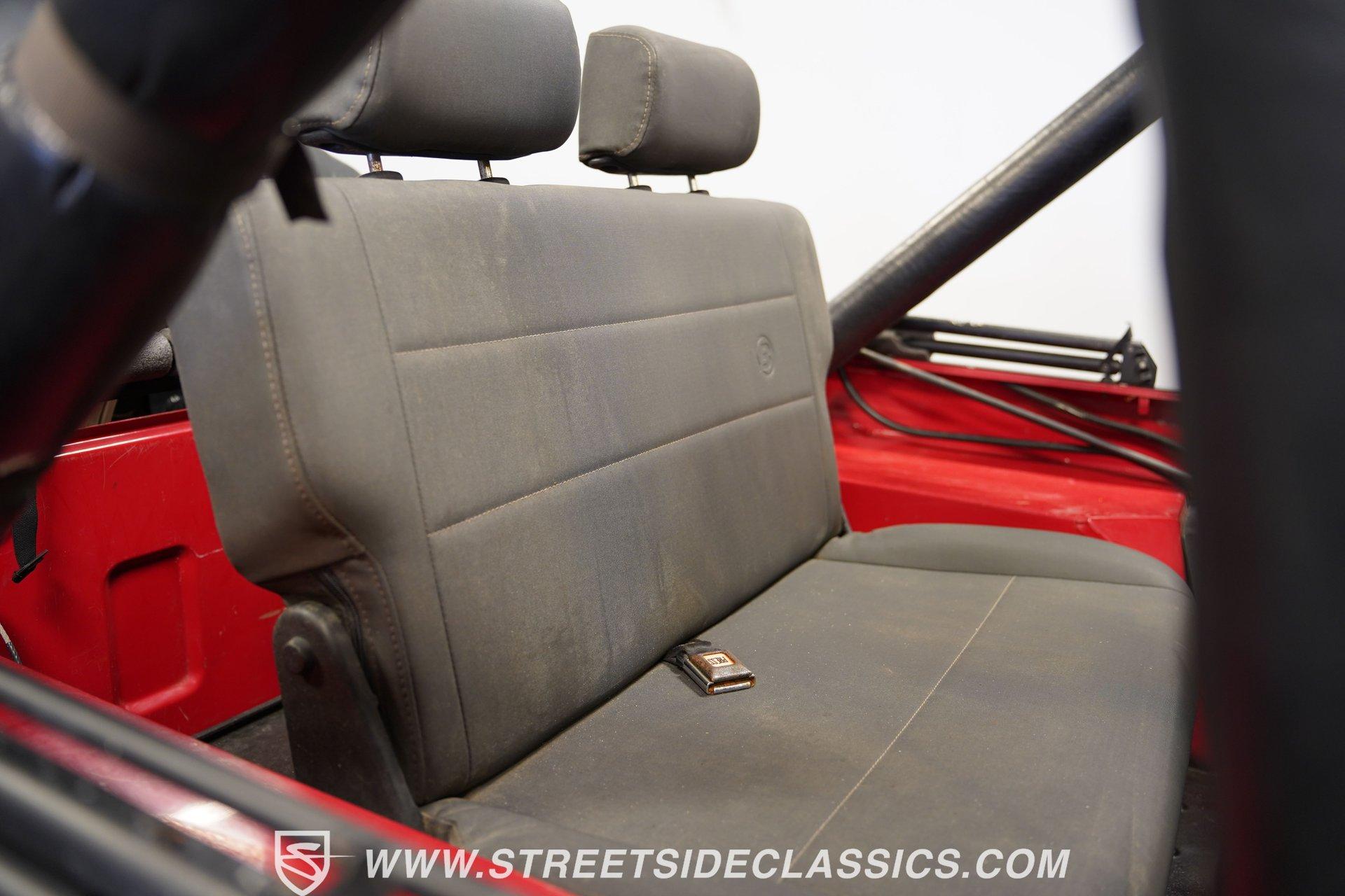 In terms of pure visual recognition, nothing comes close to the iconic Jeep brand. Before the Wrangler came along, the Jeep CJ series was literally a civilian version (CJ stood for Civilian Jeep) of the military variants, which meant it was a more driver- and passenger-friendly version. First introduced in 1945 with the Willys CJ-2A, this 1986 Jeep CJ7 4X4 represents the final year for the hardcore CJ lineup. Decked out in its vibrant red exterior, this CJ7 is equipped with an easy-to-remove vinyl top and doors, a stout double-tube front bumper, and matching tubular side steps. Inside, we find a typical Spartan Jeep interior. An aftermarket center console separates a pair of supportive bucket seats. A three-spoke, power-assisted steering wheel sits atop a tilt column, while push/pull and twist knobs are used for HVAC controls. An upgraded set of AutoMeter gauges, featuring a large 120 mph speedometer and a 7,000 rpm tachometer, sits closest to the driver, while a quartet of auxiliary gauges provides all the pertinent information required to monitor the engine. Two twist knobs are ready to let you fold down the front windshield if the desire hits you. Under the hood, we find a 350 cubic-inch V-8 engine. Fed using throttle-body injection, this small block dispenses with spent gases through a set of Headman headers that feed into a dual exhaust capped off with a pair of FlowMaster mufflers to give this Jeep an impressive and throaty growl. Power is routed through a tried-and-true four-speed manual transmission before heading out to the Dana rear axle that transfers those ponies to the pavement via a set of 15-inch wheels shod in big 33-inch BFG All-Terrain T/A tires. Engage the front axle using the manually-locking front hubs, and all four wheels are ready to tackle any terrain you can throw at them. HIGHLIGHTS: *Final Year CJ *Vinyl Top *Vinyl Doors *Double Tube Front Bumper *Tubular Side Steps *350 CID V8 *TBI *Headman Headers *Dual Exhaust *FlowMasters *Four Speed Manual *Four Wheel Drive *Skyjacker Shocks *33 Inch BFGs *Front Disc Brakes *Power Steering *AutoMeter Gauges *Tilt Column *Aftermarket Center Console This 1986 Jeep CJ7 4X4 rides on a leaf spring suspension at both the front and rear, aided by Skyjacker shocks at all four corners. Unassisted brakes utilize front discs to help rein in speed whenever necessary. If you want to get your hands on the last year of the legendary CJ Jeep lineup, then this is the truck you've been waiting for. Call today!