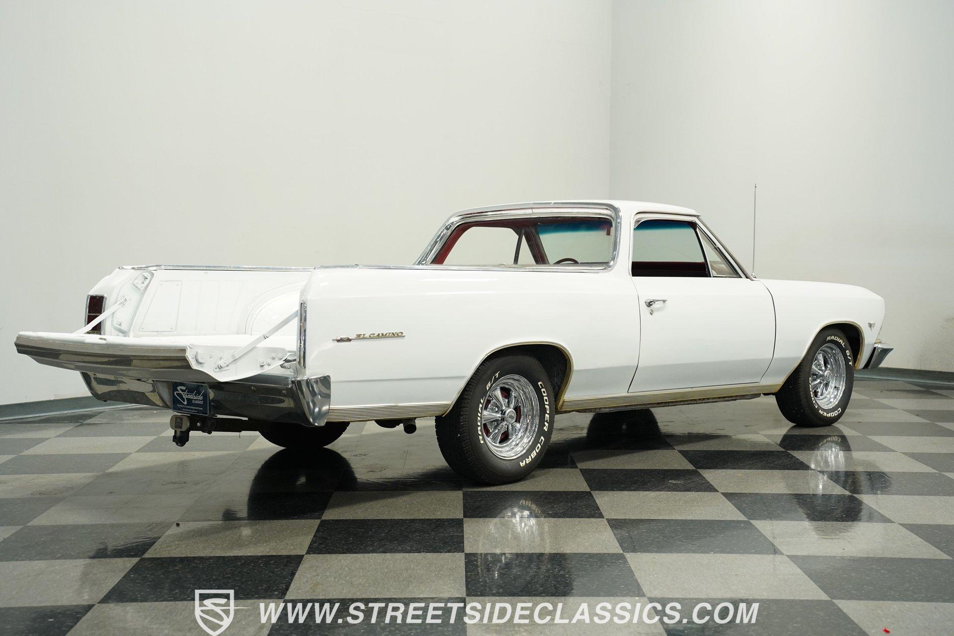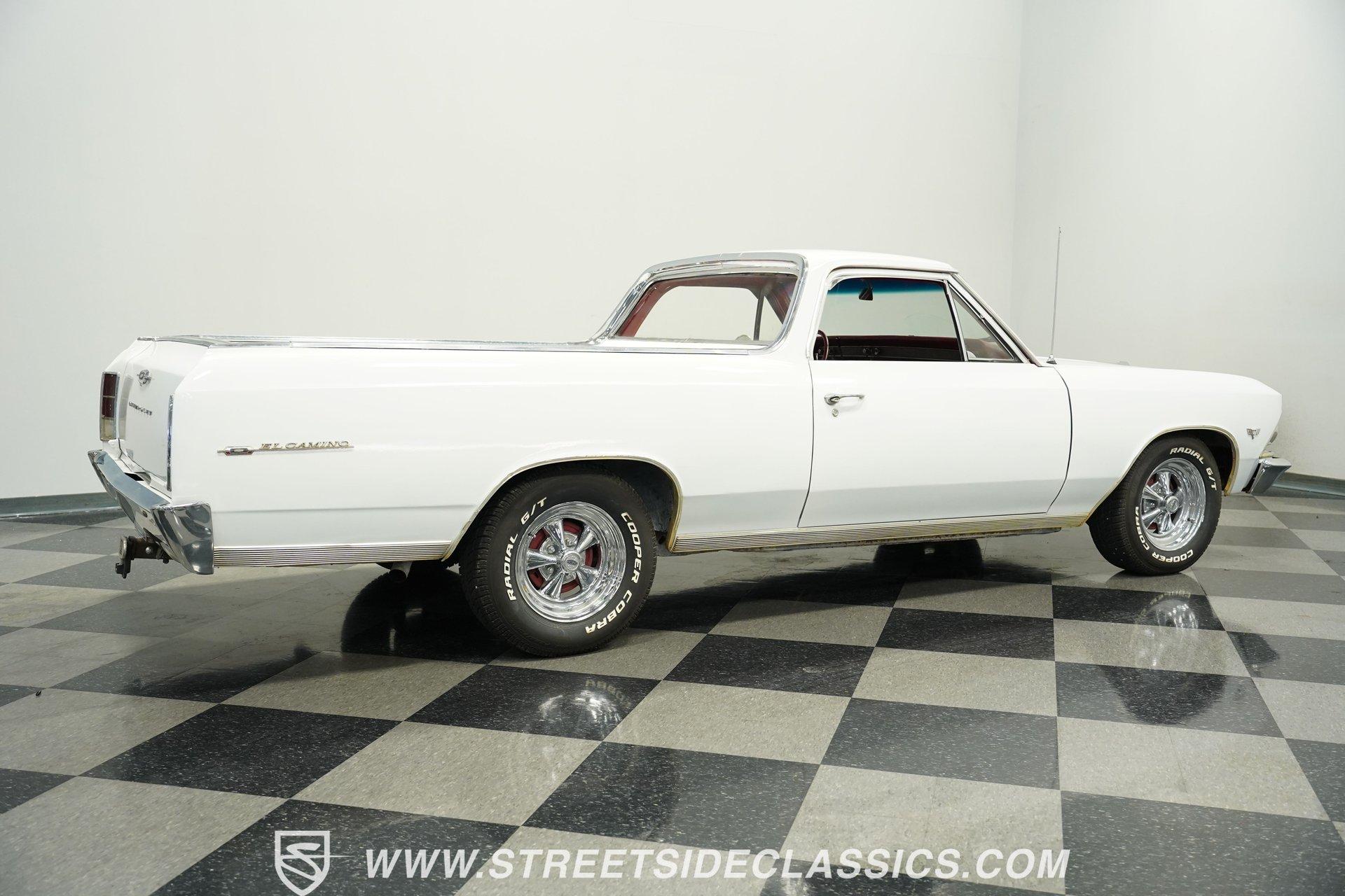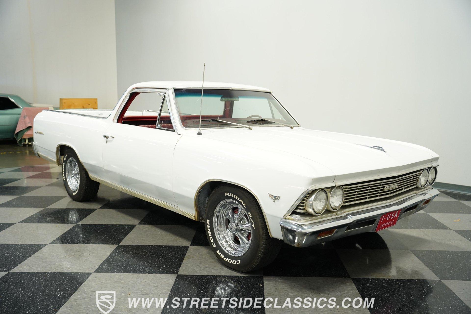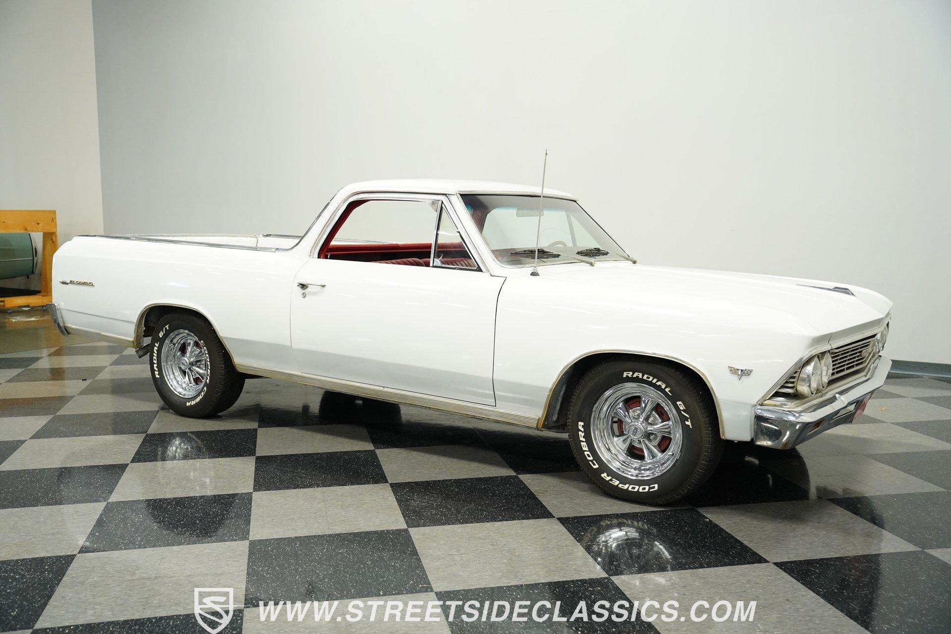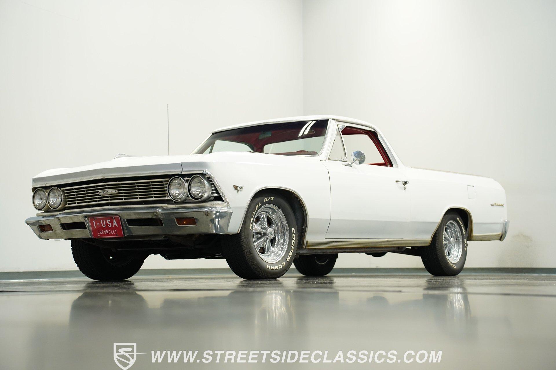 Sleek lines and classic proportions make the 1966 Chevrolet El Camino instantly recognizable in its crisp Ermine White finish. The long body creates an unmistakable profile that has maintained its appeal for decades. Chrome trim accents the front grille and surrounds the windows, providing perfect contrast against the white paint. The 15" Cragar wheels fill out the wheel wells with P215/70R15 front and P225/70R15 rear tires mounted for proper stance. Dual exhaust exits complete the rear view with a performance-minded aesthetic. Red vinyl covers the interior surfaces, creating a bold contrast against the white exterior. A comfortable bench seat provides ample room for driver and passenger while the straightforward dashboard houses essential gauges and controls. The column-mounted shifter controls the Powerglide transmission and an AM radio sits ready to provide road trip entertainment. A recently installed headliner tops off the cabin, giving a fresh look to the upper surfaces while maintaining the factory-correct appearance throughout. Muscle comes from a 283 cubic inch V8 engine connected to a 2-speed Powerglide automatic transmission. The mechanical package includes power steering, coil spring suspension at all four corners, and helper springs added to the rear. An aluminum radiator keeps operating temperatures in check during summer cruising. The dual exhaust system adds a proper V8 soundtrack when accelerating, and the 10-bolt rear axle puts power to the pavement with appropriate strength for the drivetrain. HIGHLIGHTS: 283 V8 Engine 2-Speed Powerglide Automatic Transmission Power Steering Dual Exhaust Coil Spring Suspension With Shocks Helper Springs For Rear Suspension Aluminum Radiator 10-Bolt Rear Axle Ermine White Paint 15" Cragar Wheels P215/70R15 Front, P225/70R15 Rear Tires Chrome Trim Red Interior With Bench Seat New Headliner AM Radio Column Shifter From weekend cruises to daily driving, the 1966 Chevrolet El Camino offers an experience that remains uniquely American. The combination of V8 power, automatic transmission, and classic styling makes for an excellent addition to any garage. Call today!
