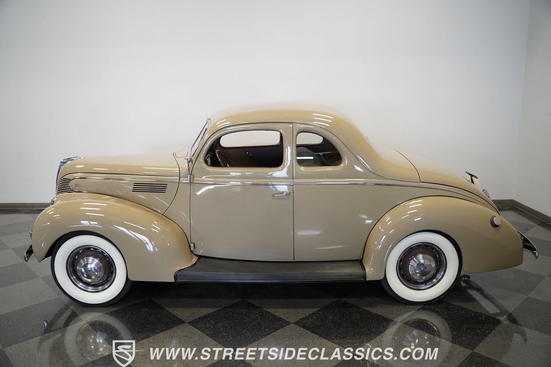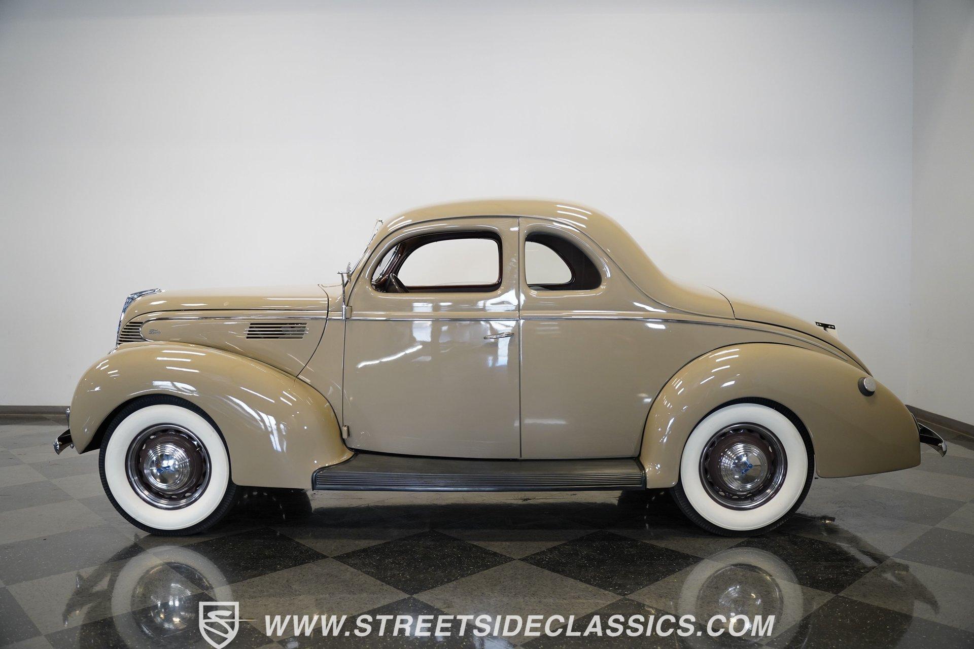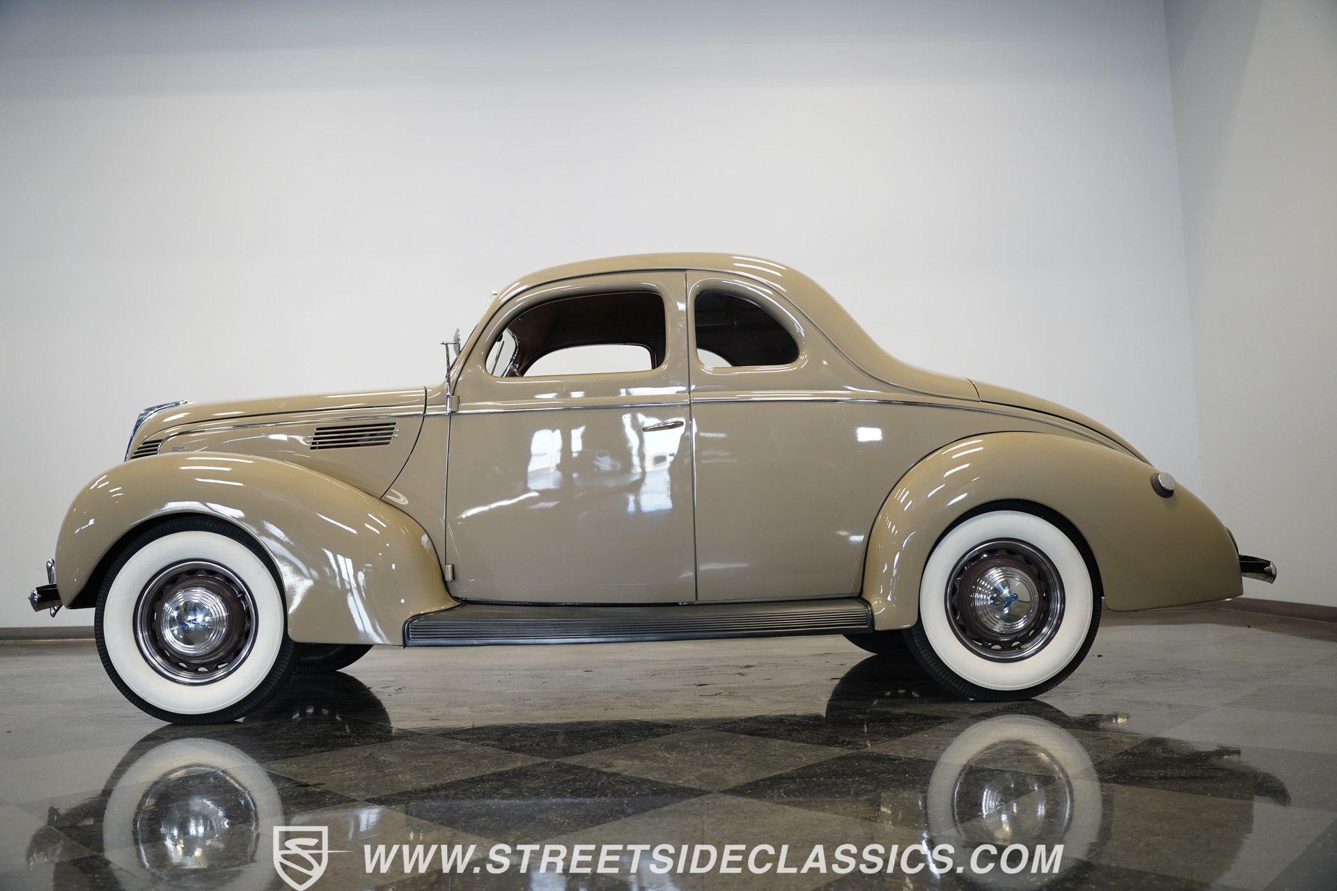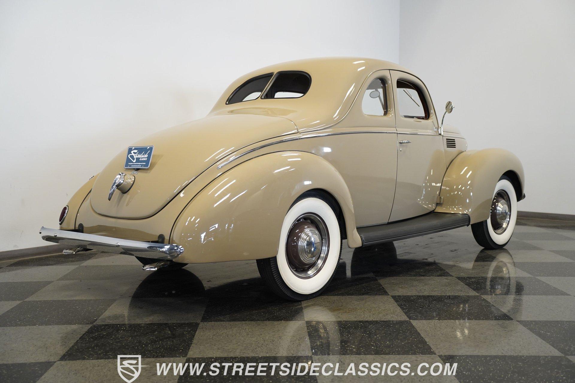 Firestone whitewalls stamped 6.50-16 wrap around steel wheels dressed with beauty rings and center caps, giving this 1939 Ford Coupe a proper period stance. Folkstone Gray sets the tone across a clean, well-proportioned body with a full respray that complements the factory-style trim. Up front, the classic grille pairs with sealed-beam headlights and a bright bumper. The running boards are outfitted with matching rubber, while the rear holds tight with a smooth deck, rounded quarters, and a chrome bumper finishing off the stance. All glass remains clean and clear, completing the look with confidence. Tan cloth sets the mood across a bench seat that spans door to door. The dash combines black accents and woodgrain, with a simple dual-gauge cluster centered behind a larger-diameter steering wheel. Matching tan panels and headliner keep things cohesive, and a full rubber floor mat covers the base. A floor-mounted shifter handles the gears while an AM/FM radio is tucked in up front. Power runs through a 221 flathead V8 topped with a Ford 2-barrel carb on a stock intake. A Toploader 3-speed manual transmission with the 78-7006-2 case handles the shifts. Factory-style transverse leaf springs anchor both ends of the suspension, with an I-beam up front and a semi-floating rear axle out back. Dual exhaust runs through stock-style mufflers. The setup stays true to its roots, with four-wheel manual drum brakes finishing off a mechanical layout built on original Ford geometry. HIGHLIGHTS 221 Flathead V8 3-Speed Manual Transmission (Toploader) Ford 2-Barrel Carburetor Stock Intake Manifold Dual Exhaust With Factory-Style Mufflers Manual Drum Brakes I-Beam Front Suspension With Transverse Leaf Spring Solid Rear Axle With Transverse Leaf Spring Folkstone Gray Paint 16" Steel Wheels With Beauty Rings And Center Caps 6.50-16 Firestone Wide Whitewall Tires Running Board Rubber Trim Chrome Front And Rear Bumpers Factory-Style Grille And Trim Tan Interior With Bench Seat Woodgrain And Black Dash Dual-Gauge Instrument Cluster Floor-Mounted Shifter Larger Diameter Steering Wheel Full Rubber Floor Mat Matching Headliner And Door Panels Timeless lines, flathead power, and period-correct presence make this 1939 Ford Coupe a solid choice for traditional style with factory-inspired mechanicals. Folkstone Gray paint and vintage trim keep it true, inside and out. Call today!