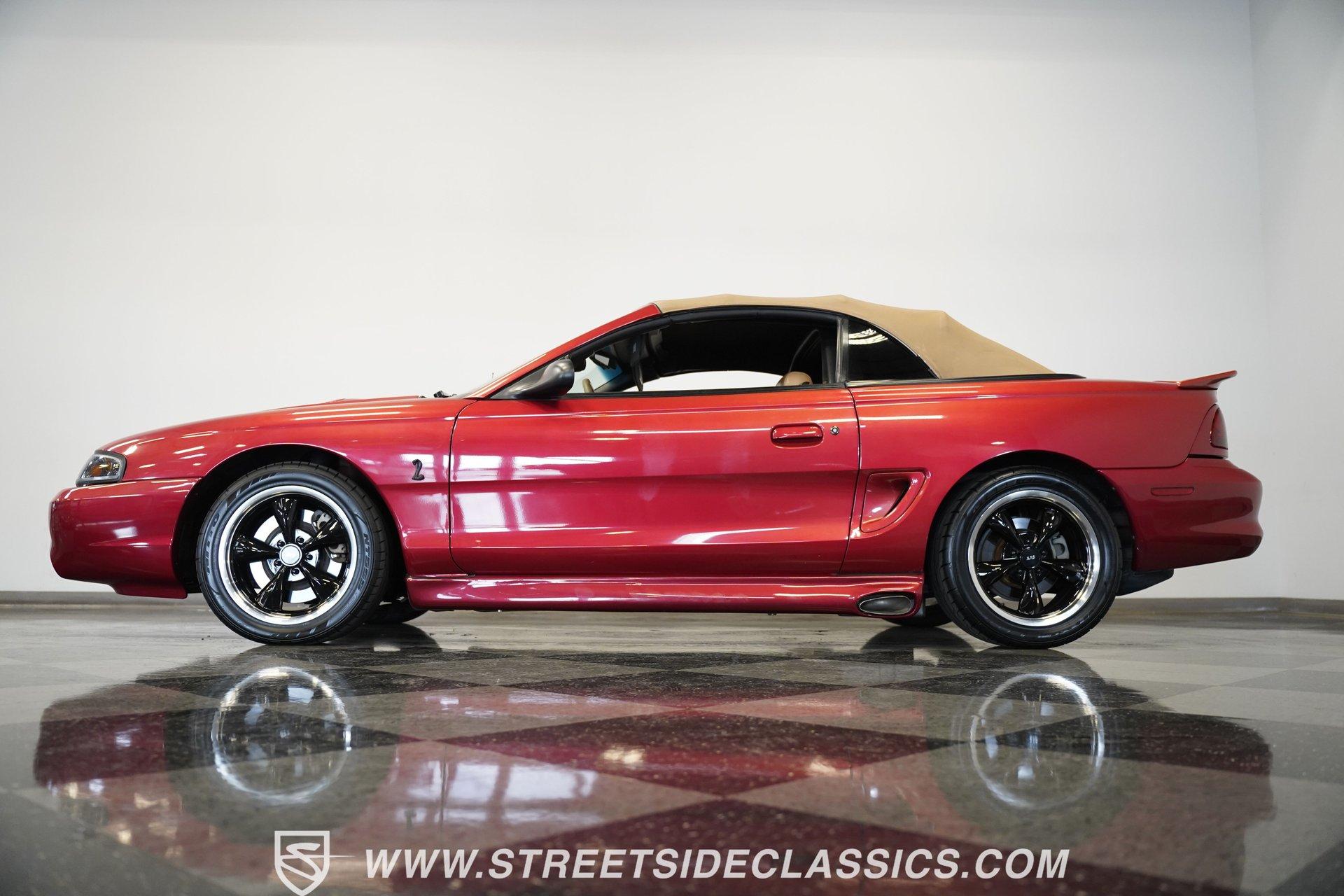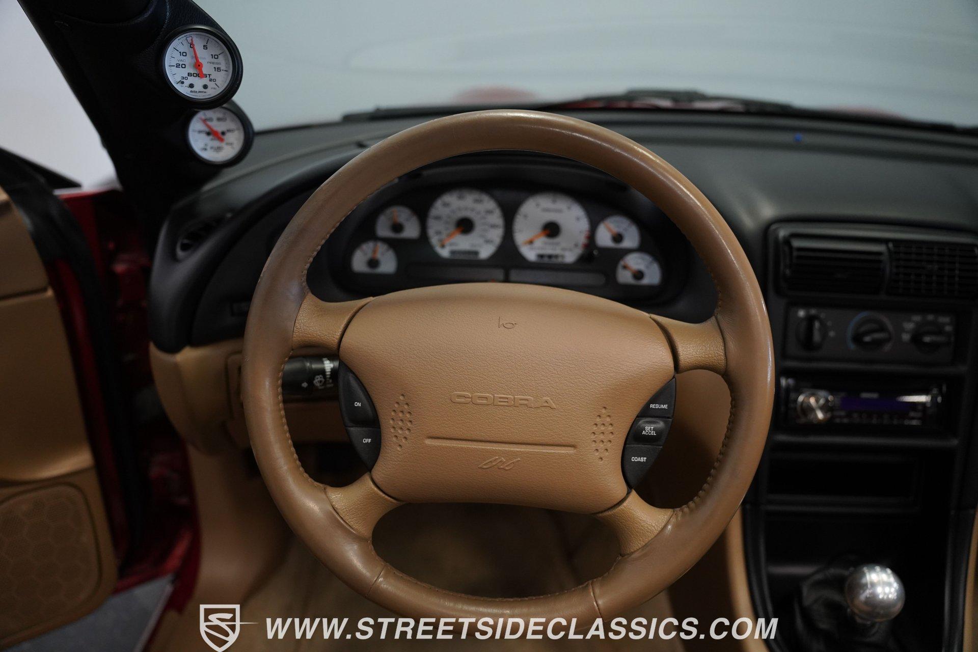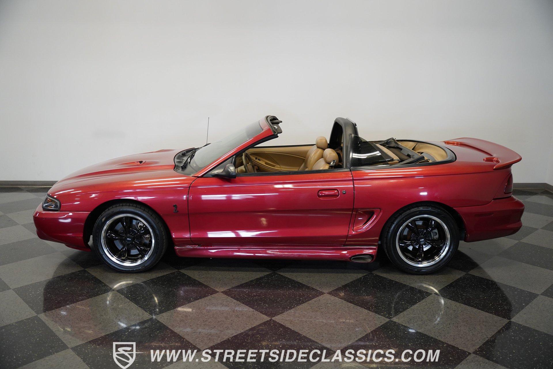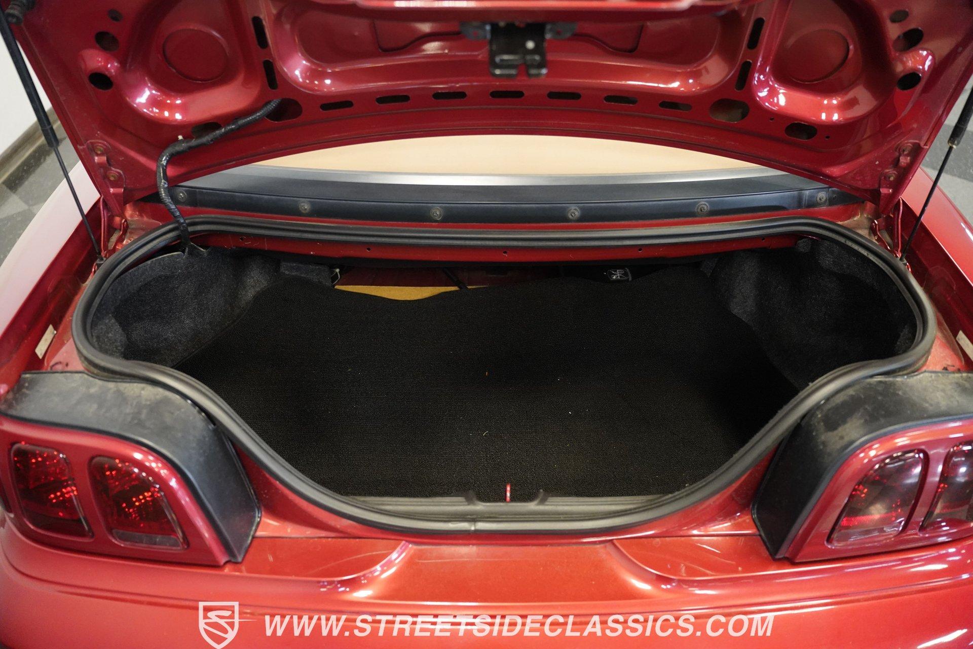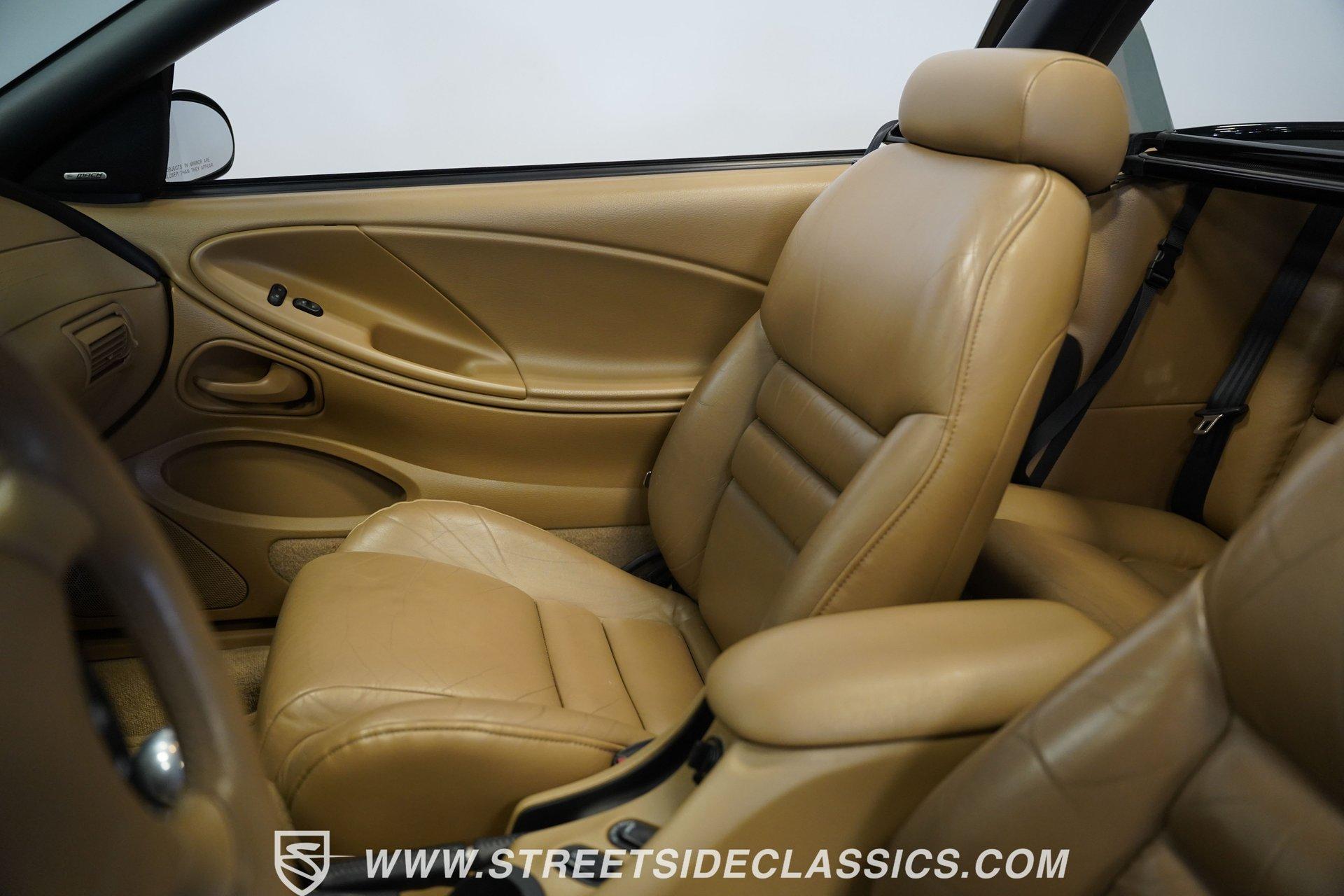 American muscle takes on an open-air attitude with the 1998 Ford Mustang Cobra SVT Supercharged Convertible finished in Laser Red with a tan canvas top. The factory Cobra front and rear bumper covers add distinctive styling while aftermarket side skirts channel airflow to the side-exit exhaust system. Black 5-spoke wheels with machined lips and SVT center caps measure 17 inches, wrapped in 245/45ZR17 front and 285/40ZR17 rear Nitto 555G2 tires with 2023 date codes. An aftermarket spoiler and black-background headlights complete the exterior modifications. Saddle leather covers the factory bucket seats within the performance-oriented interior. White-face SVT gauges provide critical information while Autometer A-pillar gauges display boost and fuel pressure readings. The aftermarket roll bar with pop-up wind screen adds structural rigidity and a two-piece carbon fiber tonneau cover gives a finished look over the rear seating area. A Kenwood single-din audio unit handles entertainment duties while the billet shift knob provides solid control over gear selection. Power windows, locks, mirrors, air conditioning and cruise control add daily driving comfort. Performance upgrades start with the 4.6 DOHC V8 enhanced by a Kenne Bell roots-style supercharger and intake system. MSD plug wires handle the spark while a billet oil catch can provides additional protection. The T45 5-speed manual transmission sends power to the 8.8 rear axle. Lowering springs improve handling dynamics and four-wheel power disc brakes with factory upgraded Cobra front brakes provide stopping capability. The dual exhaust system utilizes aftermarket mufflers for an appropriate performance sound. HIGHLIGHTS: 4.6 DOHC Supercharged V8 Engine Kenne Bell Roots-Style Supercharger And Intake 5-Speed Manual T45 Transmission Four-Wheel Power Disc Brakes Factory Upgraded Cobra Front Brakes Lowering Springs Dual Side-Exit Exhaust With Aftermarket Mufflers MSD Plug Wires Billet Oil Catch Can Paint To Match Alternator And Coolant Pipe Custom Cobra Oil Cap And Dip Stick Laser Red Exterior Paint Tan Canvas Convertible Top 17" Black 5-Spoke Wheels With Machined Lips And SVT Center Caps 245/45ZR17 Front And 285/40ZR17 Rear Nitto 555G2 Tires Aftermarket Spoiler And Side Skirts Factory Cobra Front And Rear Bumper Covers Aftermarket Headlights With Black Background Saddle Leather Interior With Bucket Seats Factory SVT White Face Gauges Autometer White Face A-Pillar Boost/Fuel Pressure Gauges Aftermarket Roll Bar With Pop-Up Wind Screen Two-Piece Carbon Fiber Tonneau Cover Aftermarket Billet Shift Knob Kenwood Stereo Power Windows, Locks And Mirrors Air Conditioning Cruise Control Supercharged and open-air, the 1998 Ford Mustang Cobra SVT Supercharged Convertible offers strong V8 performance, tasteful modifications, and the joys of top-down driving. From its Kenne Bell supercharger to its aggressive stance and leather interior, this Mustang delivers exactly what muscle car fans want. Call today!