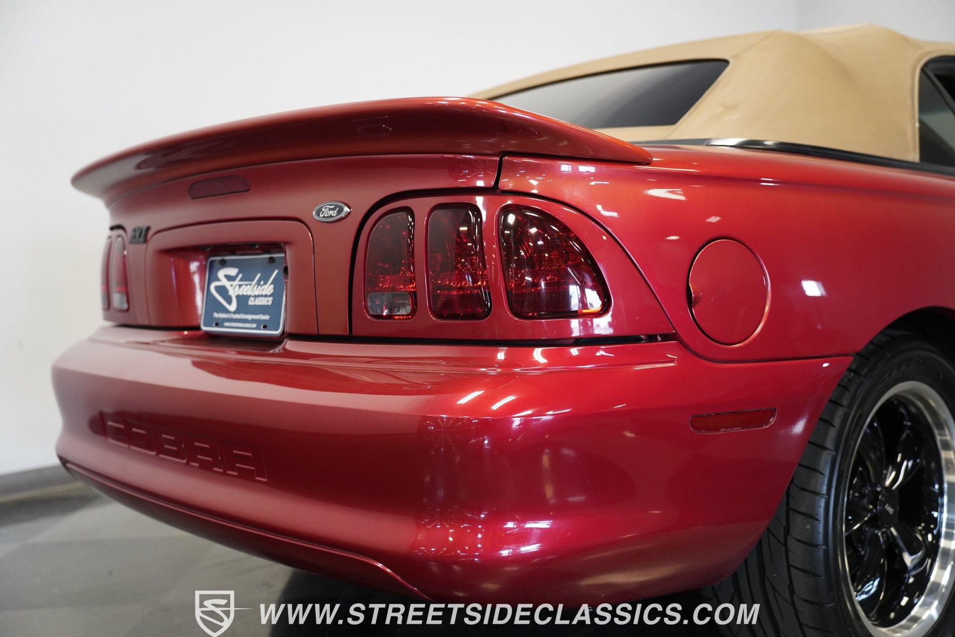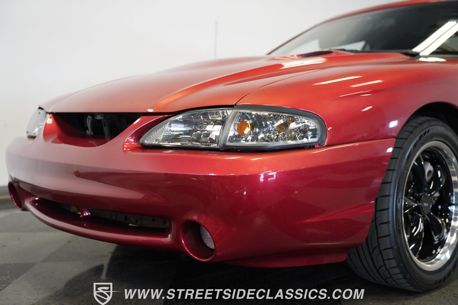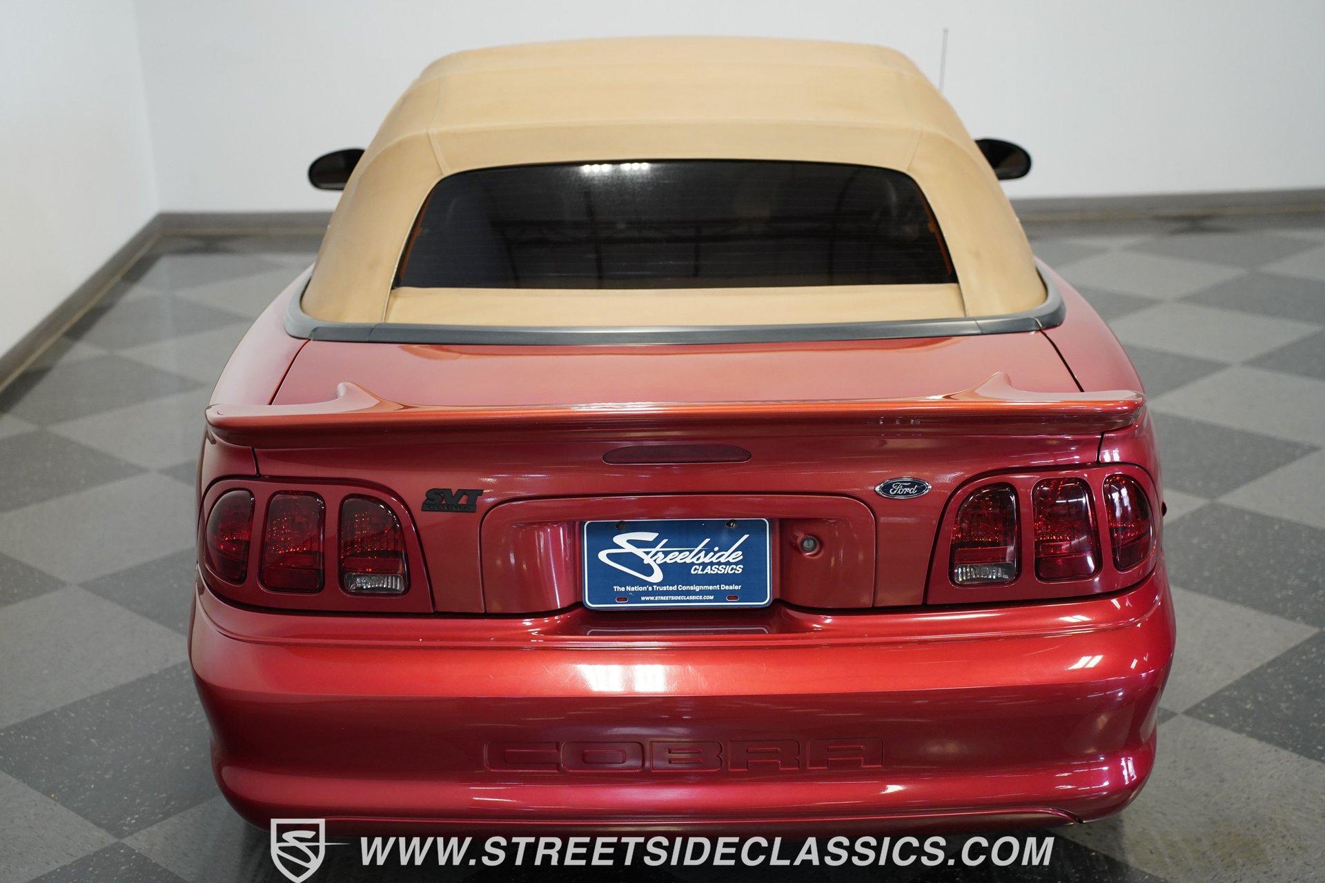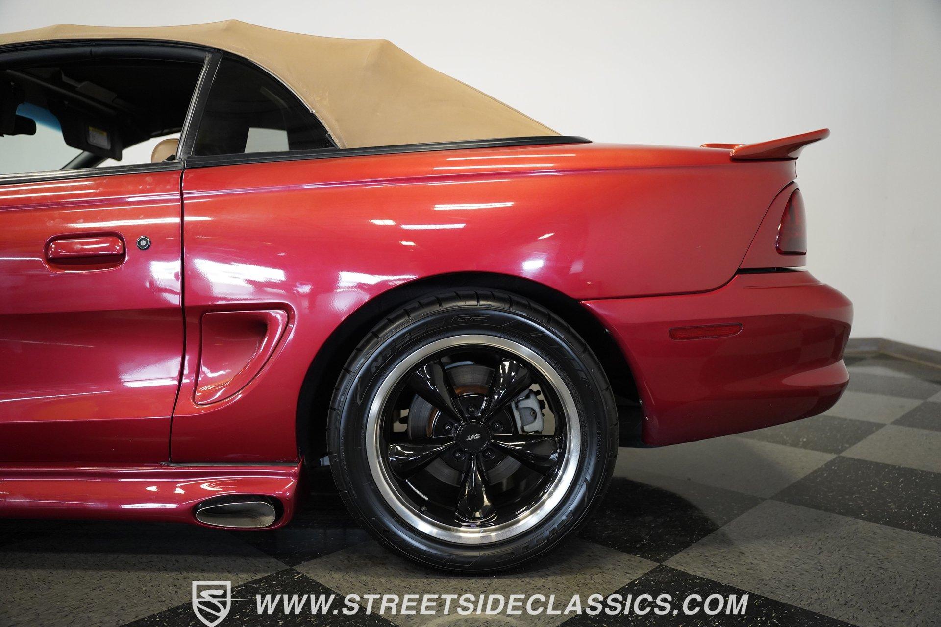 American muscle takes on an open-air attitude with the 1998 Ford Mustang Cobra SVT Supercharged Convertible finished in Laser Red with a tan canvas top. The factory Cobra front and rear bumper covers add distinctive styling while aftermarket side skirts channel airflow to the side-exit exhaust system. Black 5-spoke wheels with machined lips and SVT center caps measure 17 inches, wrapped in 245/45ZR17 front and 285/40ZR17 rear Nitto 555G2 tires with 2023 date codes. An aftermarket spoiler and black-background headlights complete the exterior modifications. Saddle leather covers the factory bucket seats within the performance-oriented interior. White-face SVT gauges provide critical information while Autometer A-pillar gauges display boost and fuel pressure readings. The aftermarket roll bar with pop-up wind screen adds structural rigidity and a two-piece carbon fiber tonneau cover gives a finished look over the rear seating area. A Kenwood single-din audio unit handles entertainment duties while the billet shift knob provides solid control over gear selection. Power windows, locks, mirrors, air conditioning and cruise control add daily driving comfort. Performance upgrades start with the 4.6 DOHC V8 enhanced by a Kenne Bell roots-style supercharger and intake system. MSD plug wires handle the spark while a billet oil catch can provides additional protection. The T45 5-speed manual transmission sends power to the 8.8 rear axle. Lowering springs improve handling dynamics and four-wheel power disc brakes with factory upgraded Cobra front brakes provide stopping capability. The dual exhaust system utilizes aftermarket mufflers for an appropriate performance sound. HIGHLIGHTS: 4.6 DOHC Supercharged V8 Engine Kenne Bell Roots-Style Supercharger And Intake 5-Speed Manual T45 Transmission Four-Wheel Power Disc Brakes Factory Upgraded Cobra Front Brakes Lowering Springs Dual Side-Exit Exhaust With Aftermarket Mufflers MSD Plug Wires Billet Oil Catch Can Paint To Match Alternator And Coolant Pipe Custom Cobra Oil Cap And Dip Stick Laser Red Exterior Paint Tan Canvas Convertible Top 17" Black 5-Spoke Wheels With Machined Lips And SVT Center Caps 245/45ZR17 Front And 285/40ZR17 Rear Nitto 555G2 Tires Aftermarket Spoiler And Side Skirts Factory Cobra Front And Rear Bumper Covers Aftermarket Headlights With Black Background Saddle Leather Interior With Bucket Seats Factory SVT White Face Gauges Autometer White Face A-Pillar Boost/Fuel Pressure Gauges Aftermarket Roll Bar With Pop-Up Wind Screen Two-Piece Carbon Fiber Tonneau Cover Aftermarket Billet Shift Knob Kenwood Stereo Power Windows, Locks And Mirrors Air Conditioning Cruise Control Supercharged and open-air, the 1998 Ford Mustang Cobra SVT Supercharged Convertible offers strong V8 performance, tasteful modifications, and the joys of top-down driving. From its Kenne Bell supercharger to its aggressive stance and leather interior, this Mustang delivers exactly what muscle car fans want. Call today!