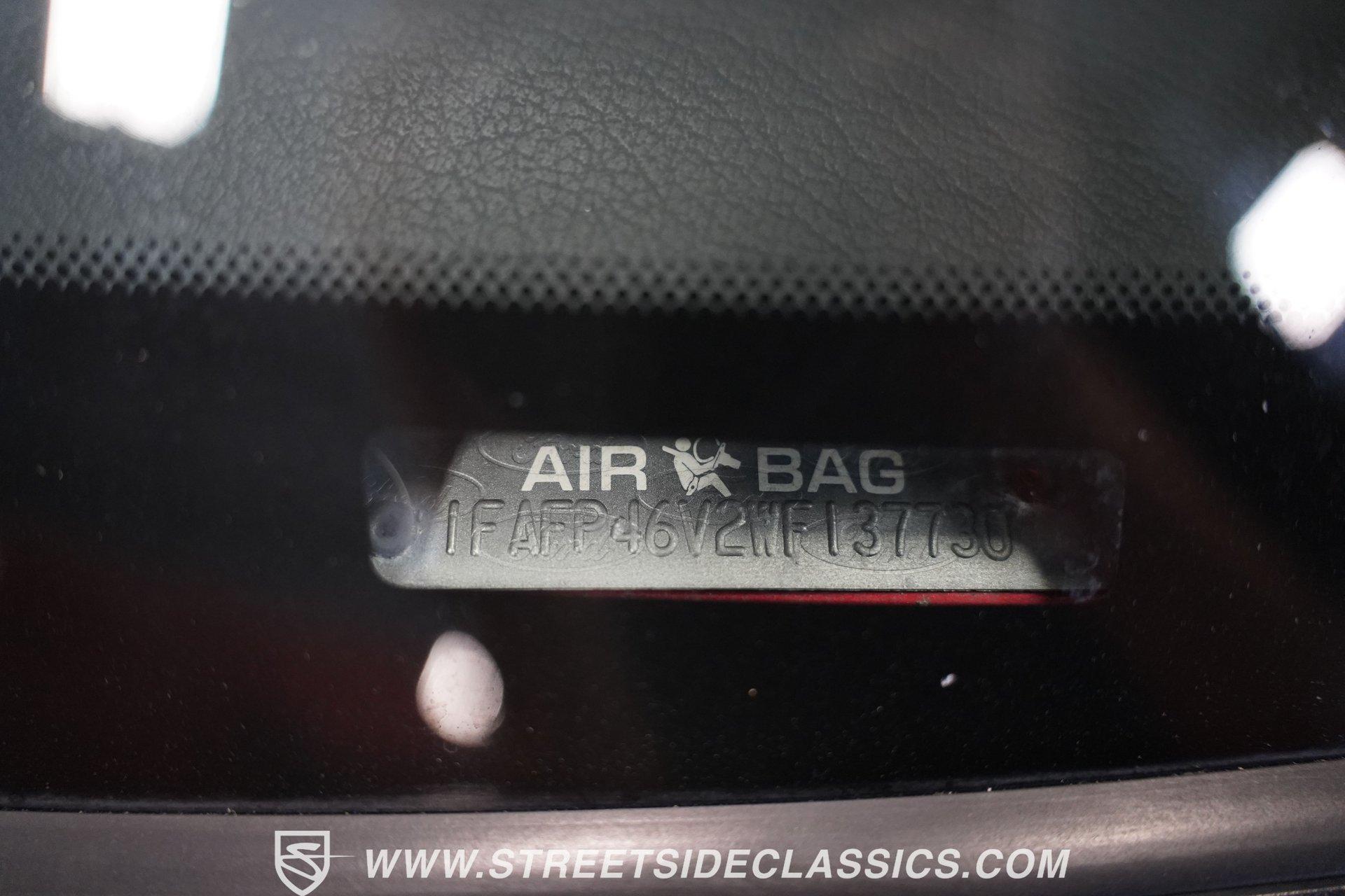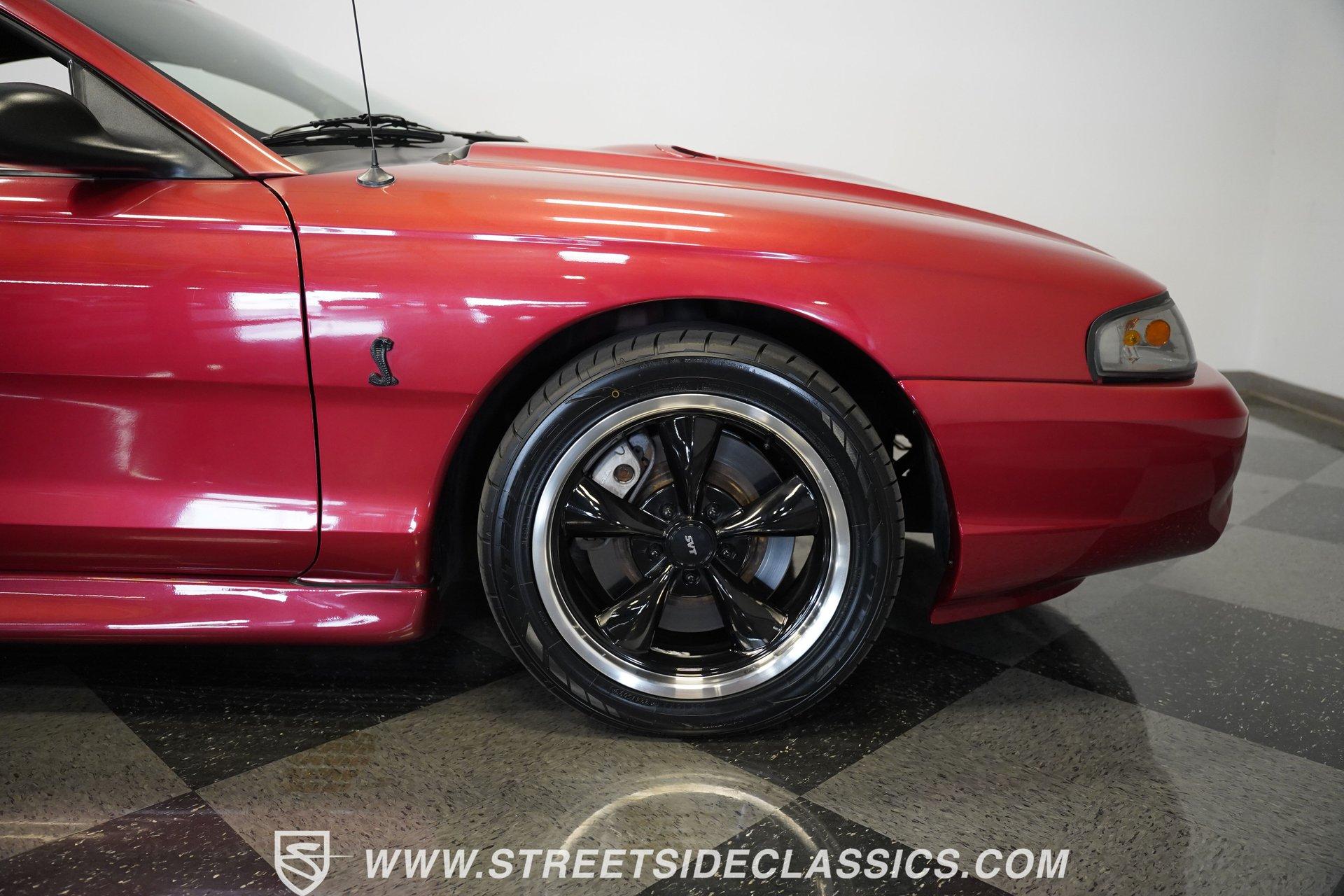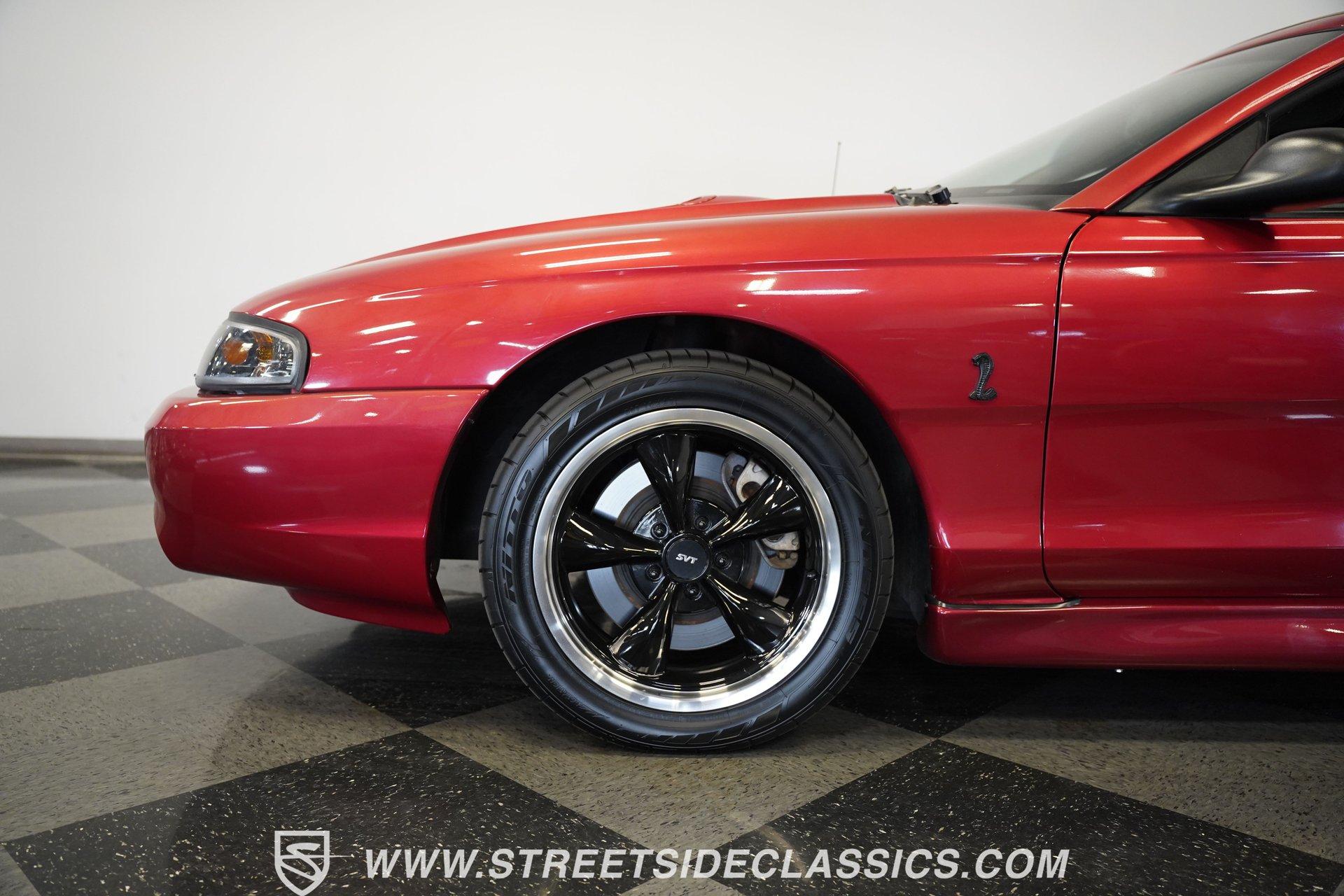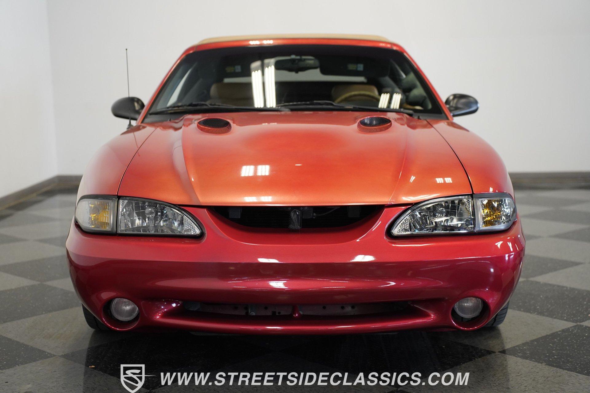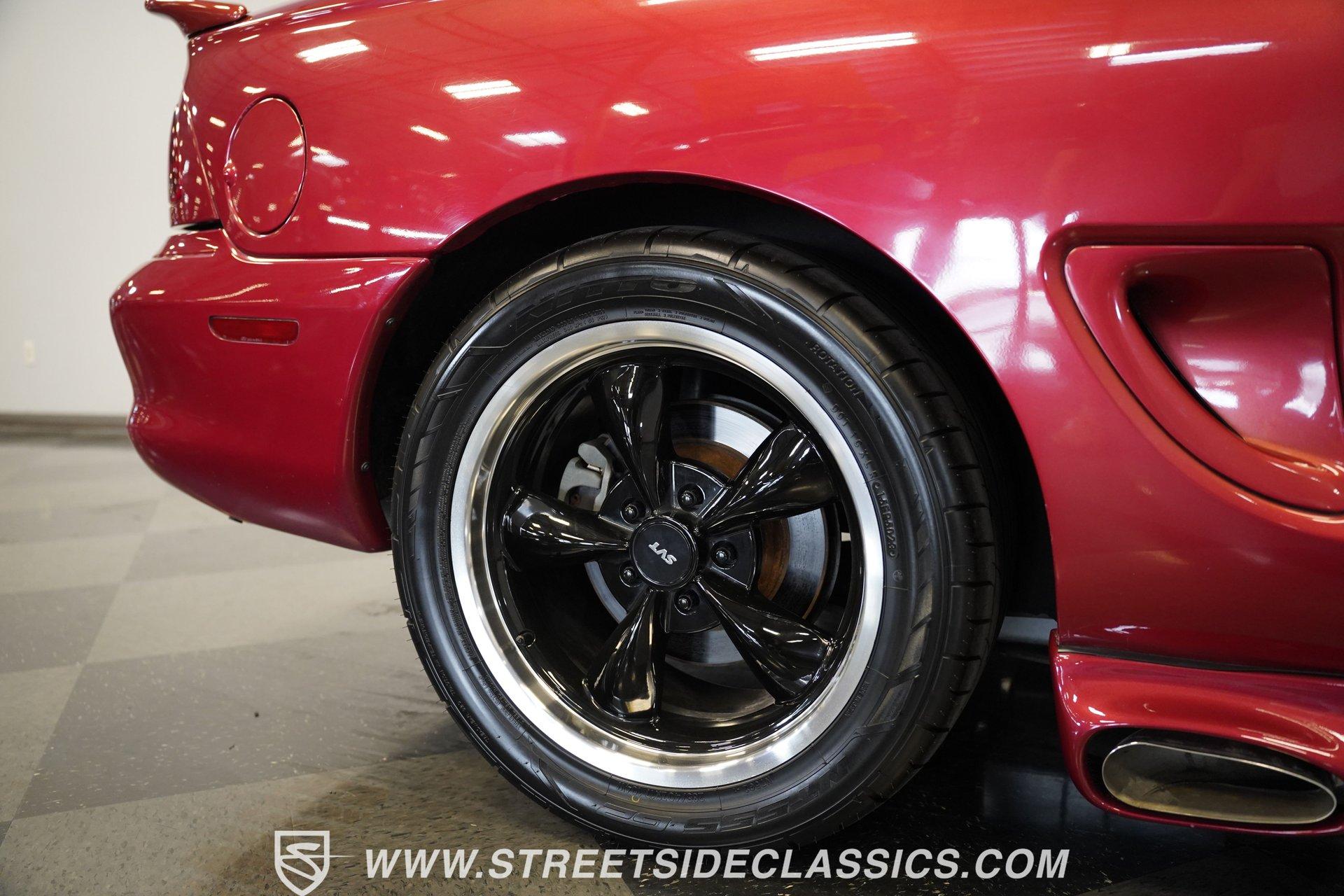 American muscle takes on an open-air attitude with the 1998 Ford Mustang Cobra SVT Supercharged Convertible finished in Laser Red with a tan canvas top. The factory Cobra front and rear bumper covers add distinctive styling while aftermarket side skirts channel airflow to the side-exit exhaust system. Black 5-spoke wheels with machined lips and SVT center caps measure 17 inches, wrapped in 245/45ZR17 front and 285/40ZR17 rear Nitto 555G2 tires with 2023 date codes. An aftermarket spoiler and black-background headlights complete the exterior modifications. Saddle leather covers the factory bucket seats within the performance-oriented interior. White-face SVT gauges provide critical information while Autometer A-pillar gauges display boost and fuel pressure readings. The aftermarket roll bar with pop-up wind screen adds structural rigidity and a two-piece carbon fiber tonneau cover gives a finished look over the rear seating area. A Kenwood single-din audio unit handles entertainment duties while the billet shift knob provides solid control over gear selection. Power windows, locks, mirrors, air conditioning and cruise control add daily driving comfort. Performance upgrades start with the 4.6 DOHC V8 enhanced by a Kenne Bell roots-style supercharger and intake system. MSD plug wires handle the spark while a billet oil catch can provides additional protection. The T45 5-speed manual transmission sends power to the 8.8 rear axle. Lowering springs improve handling dynamics and four-wheel power disc brakes with factory upgraded Cobra front brakes provide stopping capability. The dual exhaust system utilizes aftermarket mufflers for an appropriate performance sound. HIGHLIGHTS: 4.6 DOHC Supercharged V8 Engine Kenne Bell Roots-Style Supercharger And Intake 5-Speed Manual T45 Transmission Four-Wheel Power Disc Brakes Factory Upgraded Cobra Front Brakes Lowering Springs Dual Side-Exit Exhaust With Aftermarket Mufflers MSD Plug Wires Billet Oil Catch Can Paint To Match Alternator And Coolant Pipe Custom Cobra Oil Cap And Dip Stick Laser Red Exterior Paint Tan Canvas Convertible Top 17" Black 5-Spoke Wheels With Machined Lips And SVT Center Caps 245/45ZR17 Front And 285/40ZR17 Rear Nitto 555G2 Tires Aftermarket Spoiler And Side Skirts Factory Cobra Front And Rear Bumper Covers Aftermarket Headlights With Black Background Saddle Leather Interior With Bucket Seats Factory SVT White Face Gauges Autometer White Face A-Pillar Boost/Fuel Pressure Gauges Aftermarket Roll Bar With Pop-Up Wind Screen Two-Piece Carbon Fiber Tonneau Cover Aftermarket Billet Shift Knob Kenwood Stereo Power Windows, Locks And Mirrors Air Conditioning Cruise Control Supercharged and open-air, the 1998 Ford Mustang Cobra SVT Supercharged Convertible offers strong V8 performance, tasteful modifications, and the joys of top-down driving. From its Kenne Bell supercharger to its aggressive stance and leather interior, this Mustang delivers exactly what muscle car fans want. Call today!