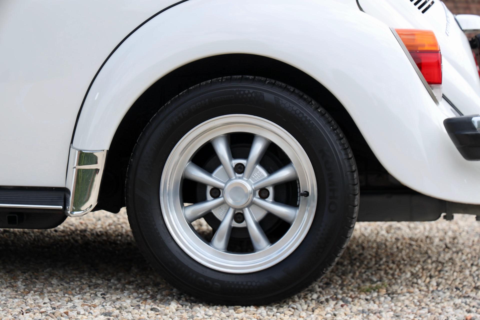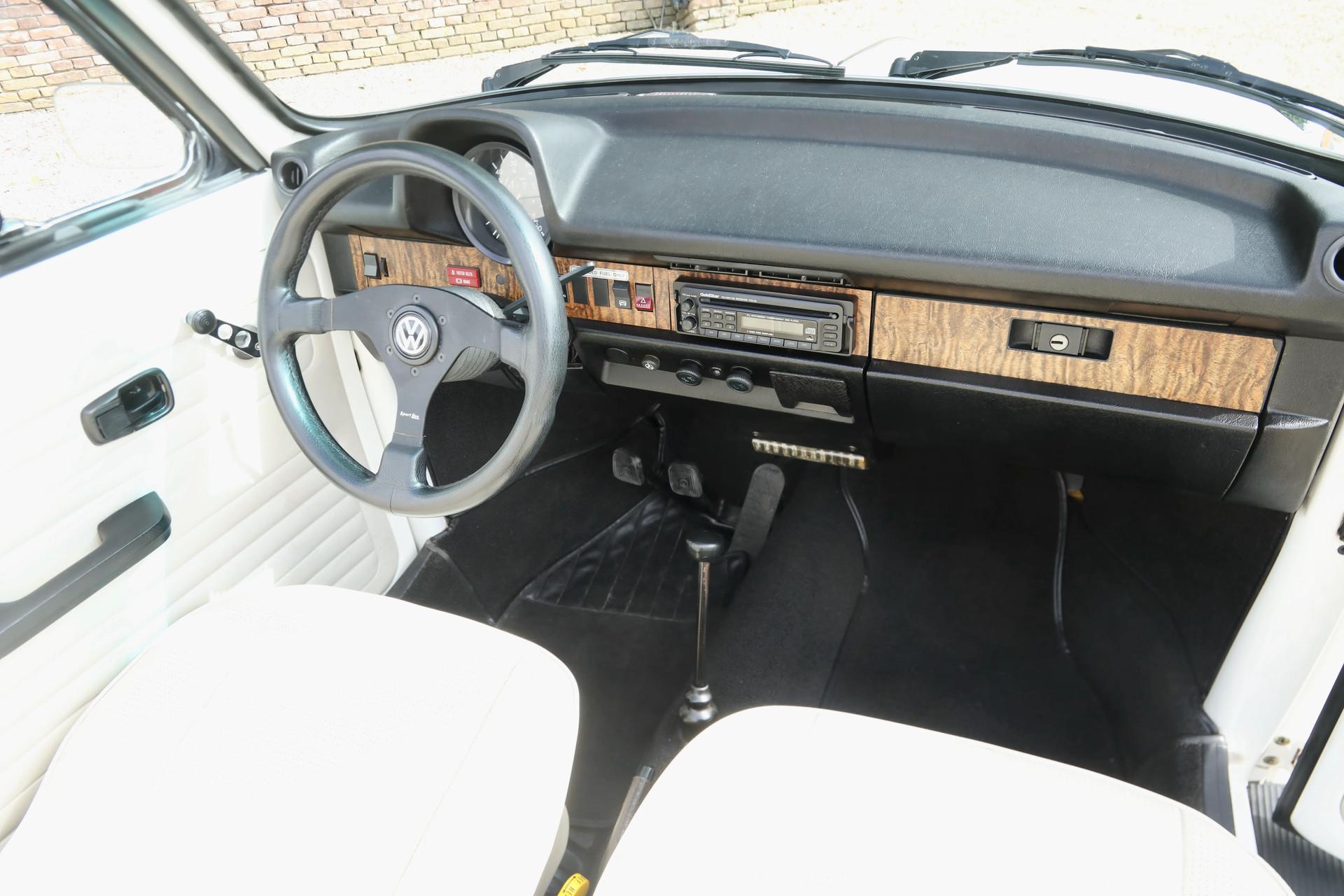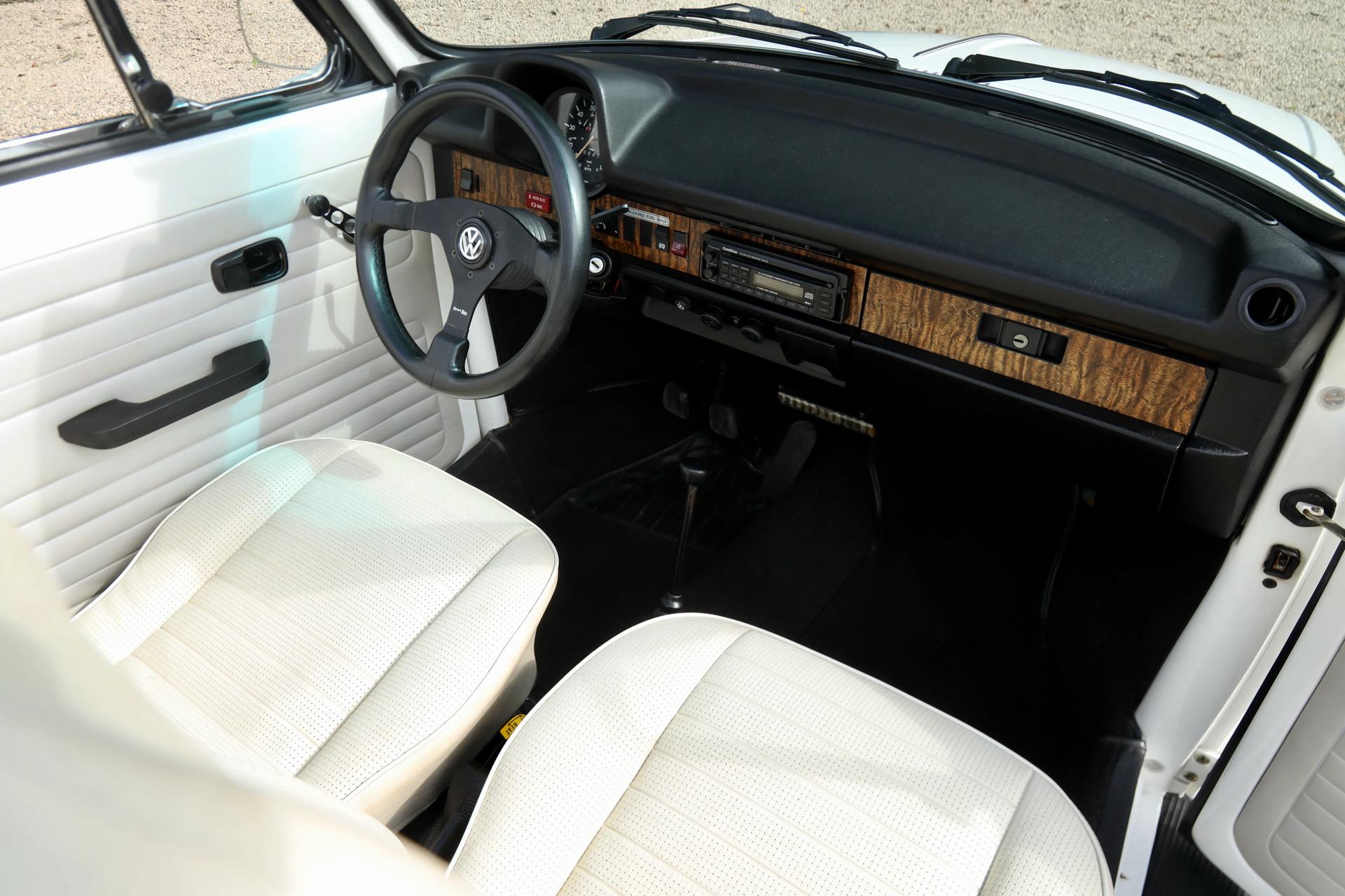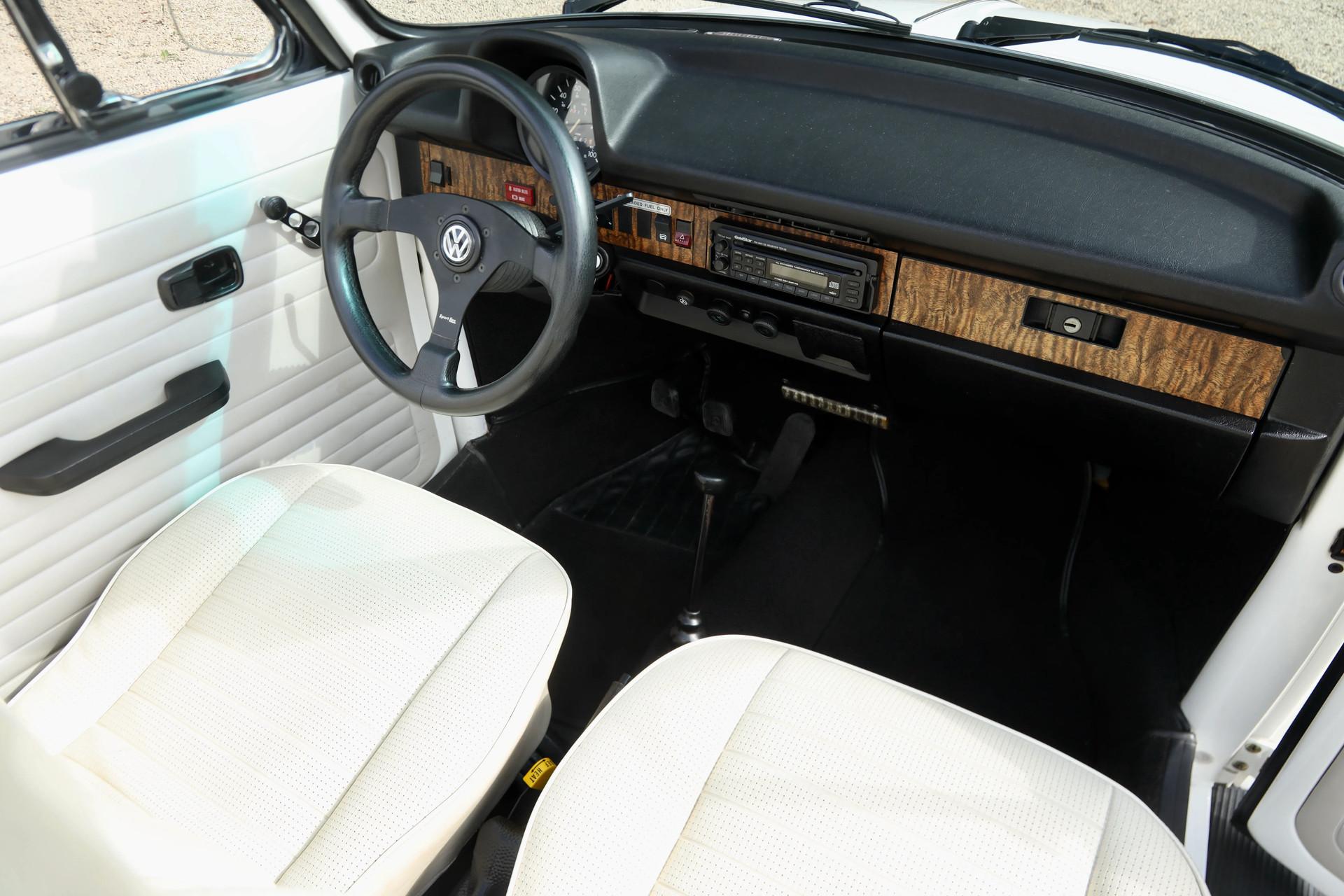 The bodywork is really neat. A bare-metal respray in the 1990s was carried out with precision, and the Alpine White paint still shines beautifully. This is a body that has not been welded and in very clean condition. The panel fit is crisp, the seams even, and the Empi GT-8 wheels add just the right touch of flair to this Champagne Edition.